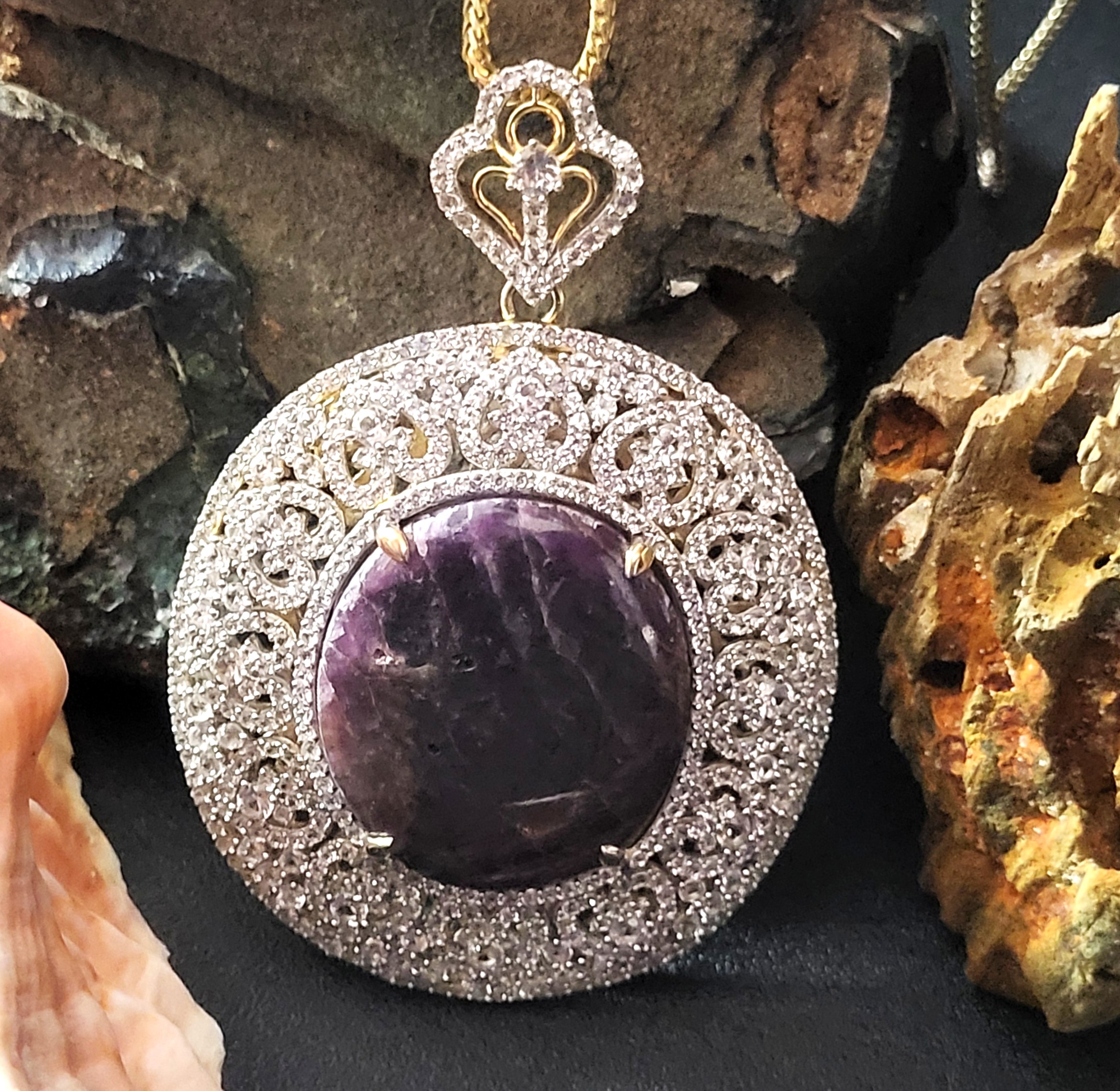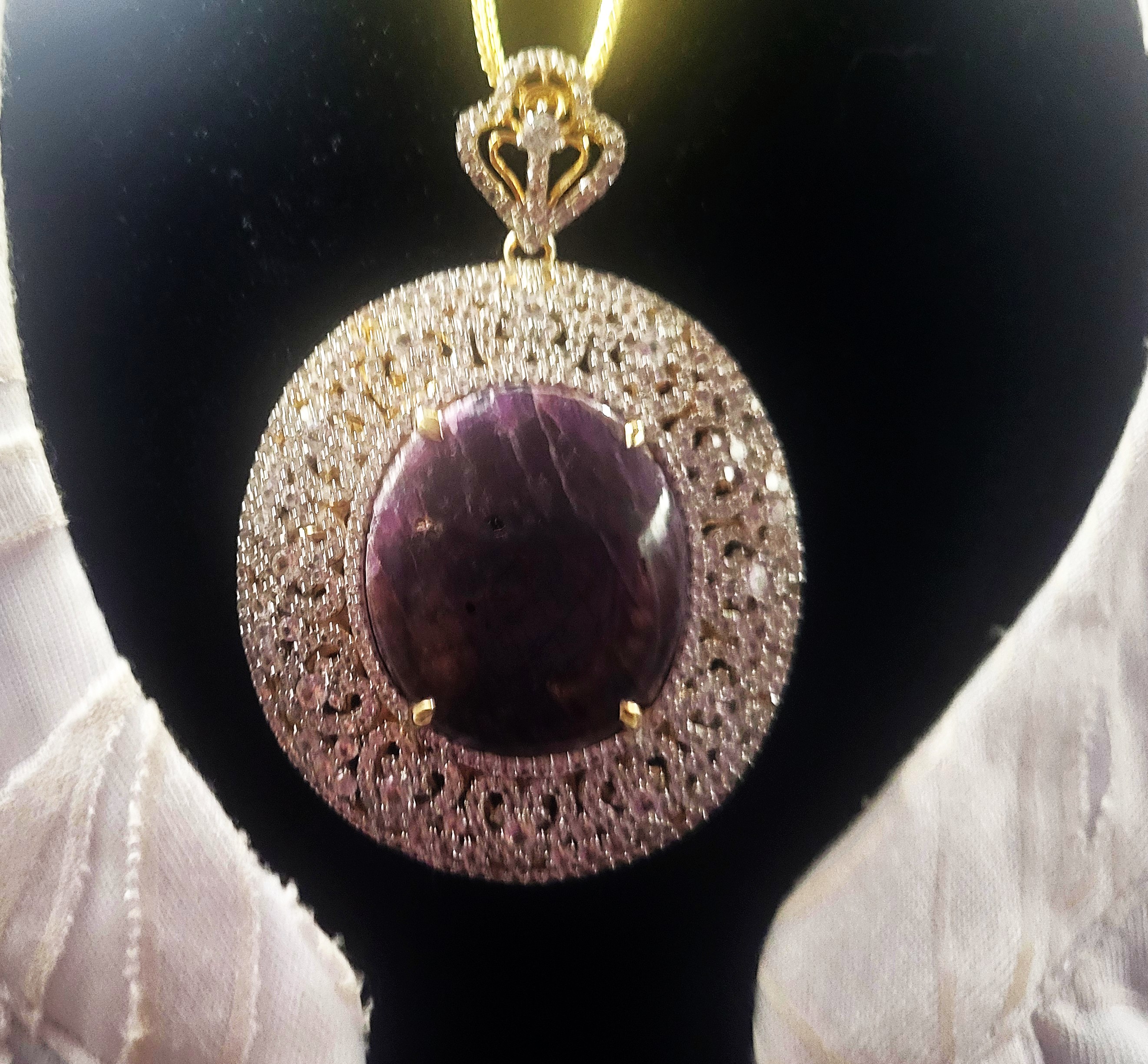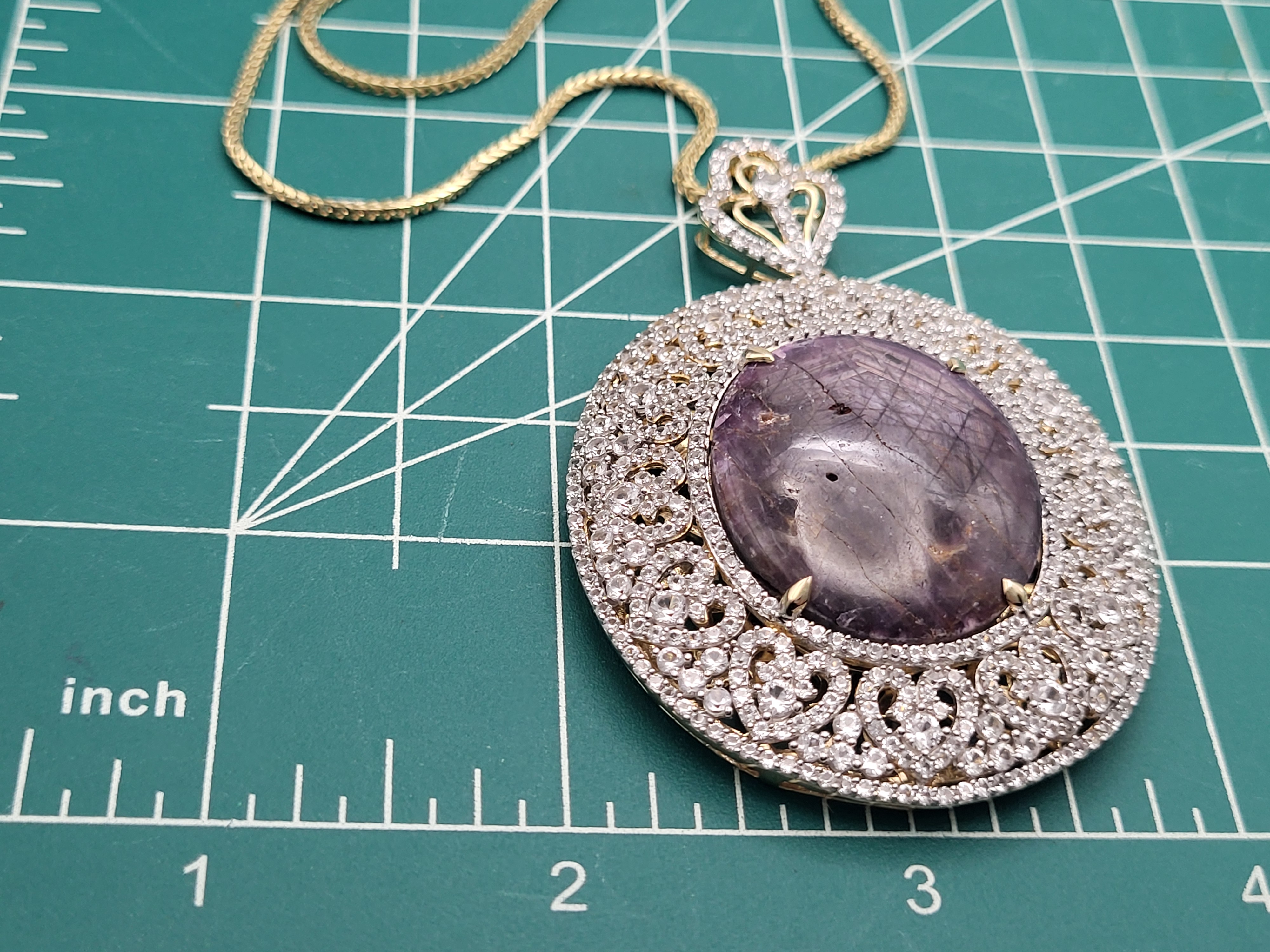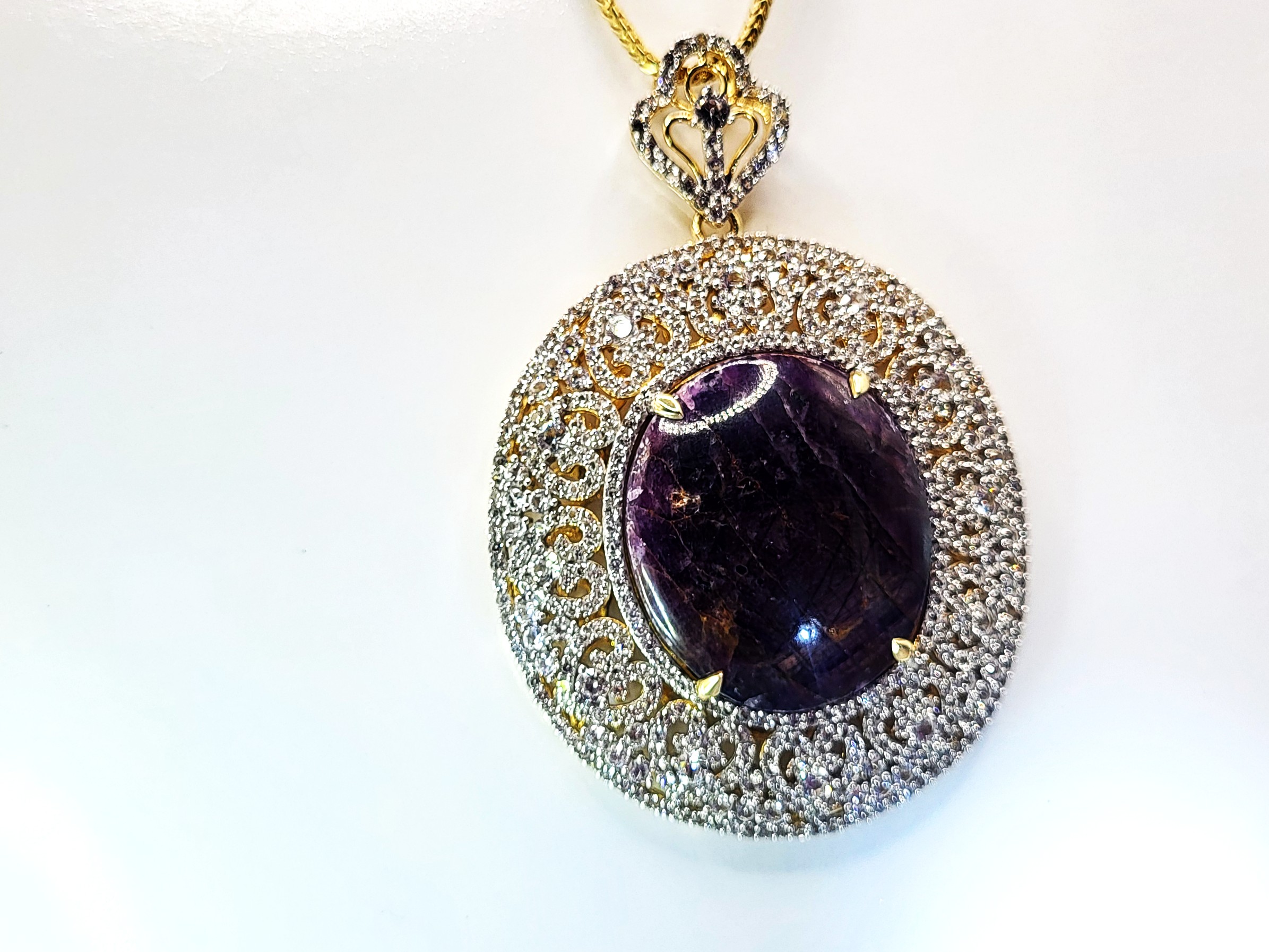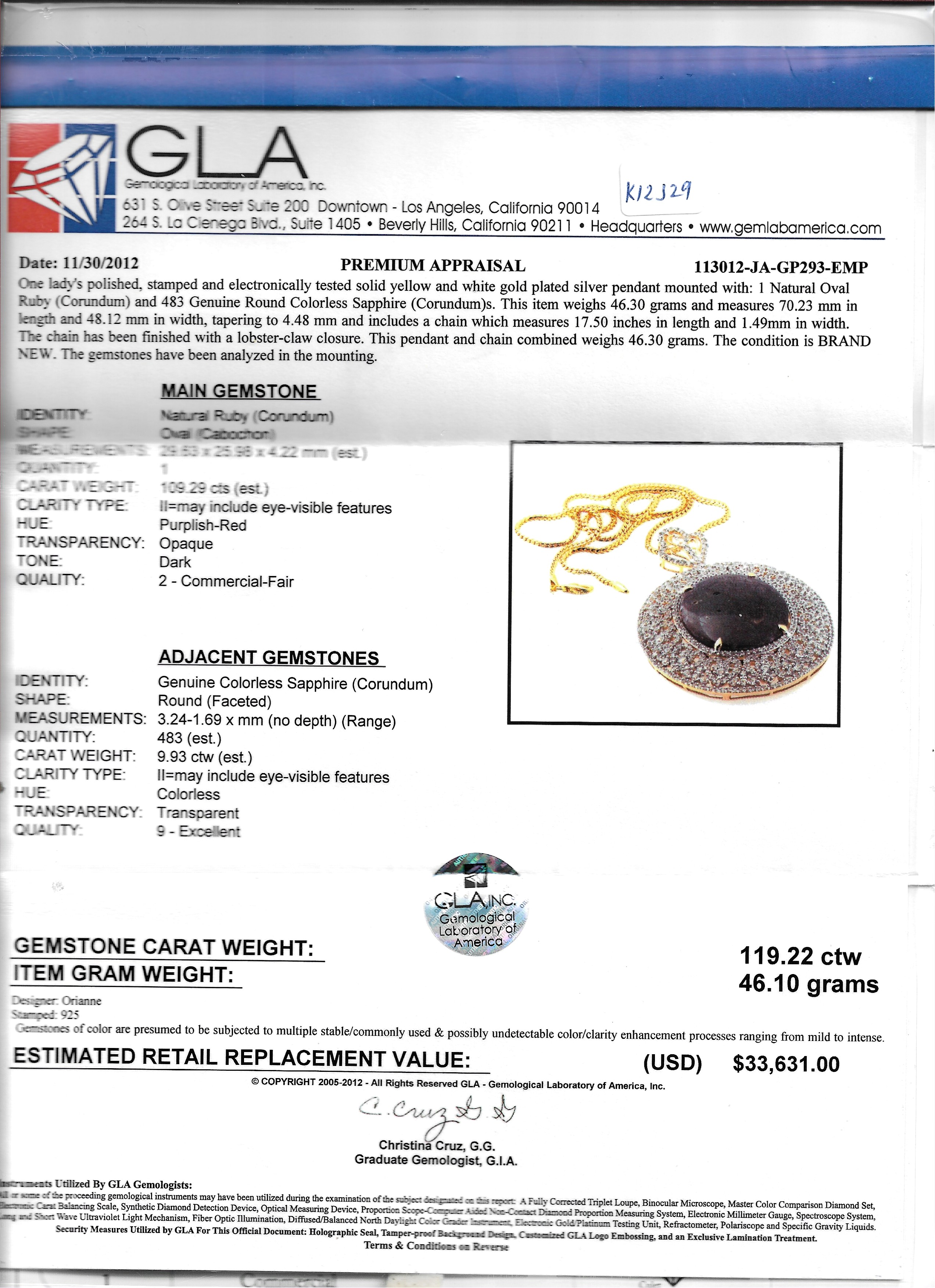 This bold necklace is set in vermeil (14K yellow gold over sterling silver). The featured colored gemstone is an approximate 109 carat oval, cabochon, natural purplish-red ruby. It is set with claw prongs inside a frame of glittering clear, white sapphires and a finial-like bail. The pendant has an incredibly beautiful back gallery and it hangs from an 18" vermeil box chain with a lobster clasp. The pendant is approximately 1.75"w x 2"l with an additional 1/2" for the bail.