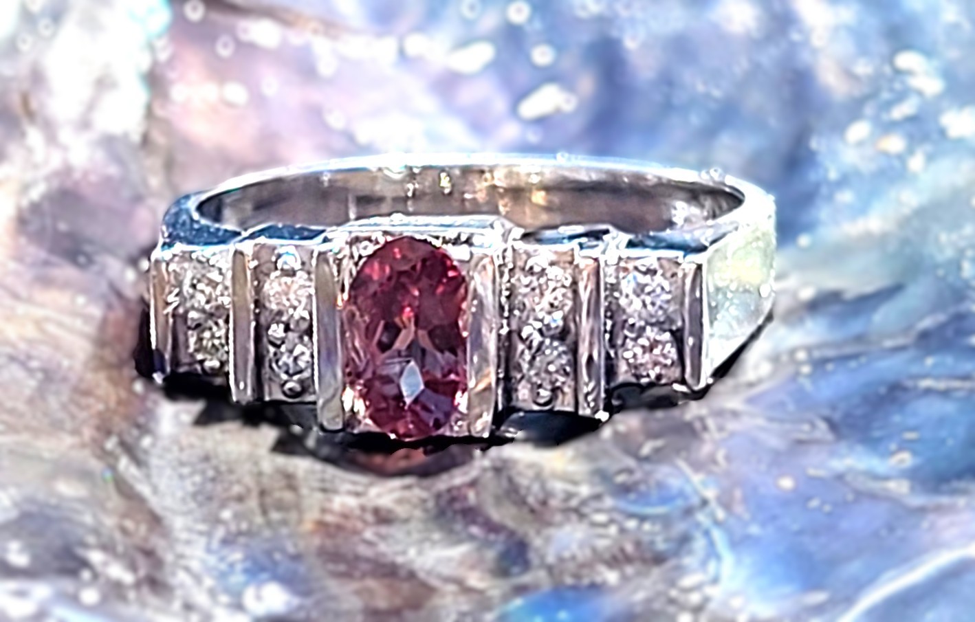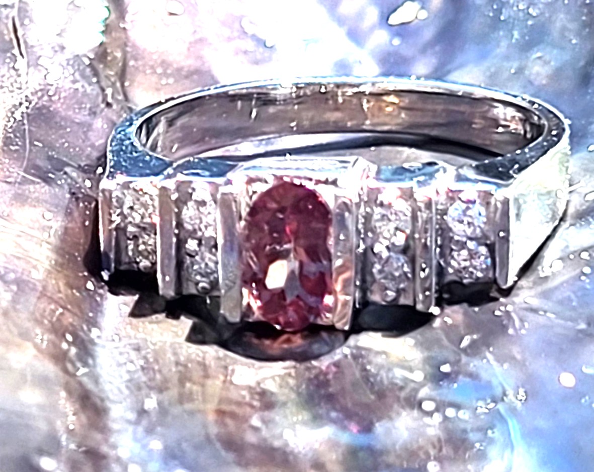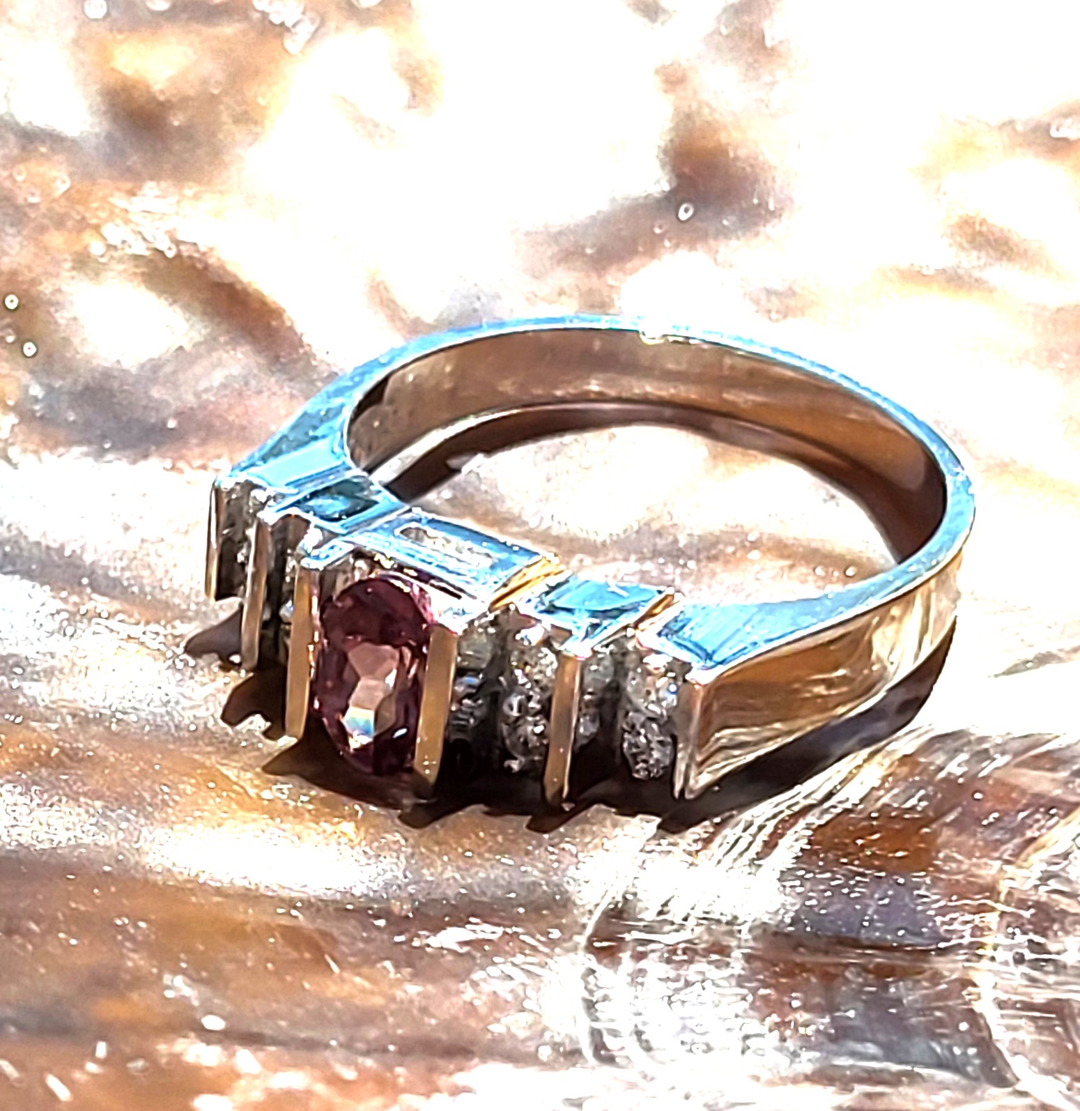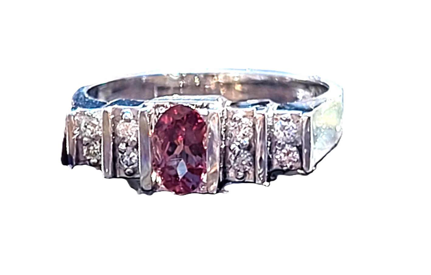 This is a 14 karat white gold ring that features an approximate .55 carat oval-cut, tension-set, natural and genuine COLOR-CHANGING garnet with approximately .16 carats total weight of round, brilliant-cut, H, SI2-I1 clarity diamonds on the stepped shoulders that taper to an approximate 2.5mm shank. This ring is US size 7 and can be sized for an additional charge. This item is eligible for appraisal at a discounted rate, from an independent appraiser (with qualifying credentials from GIA) with no affiliation to Bidfair Fine Jewelry. Please contact Bidfair Fine Jewelry for more information on appraisals and sizing.  Admin: G11241/6irt