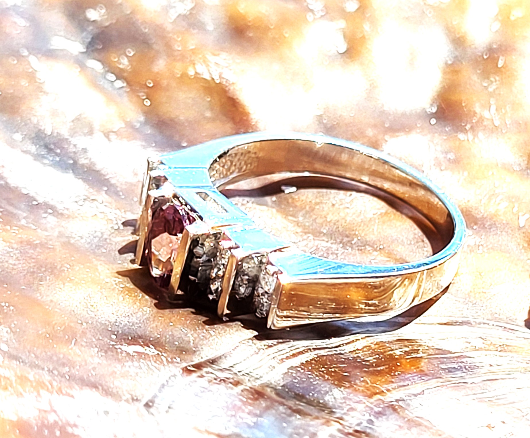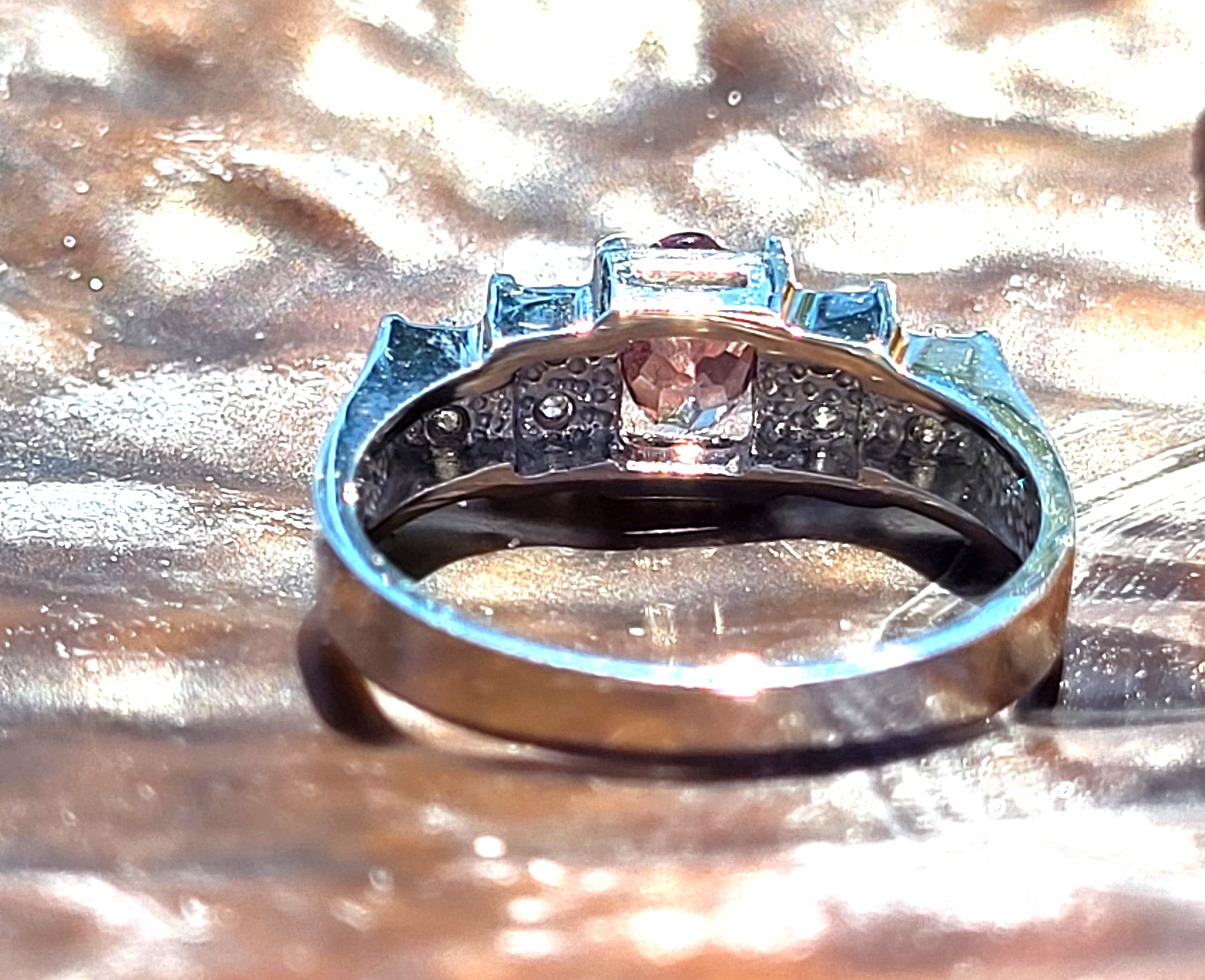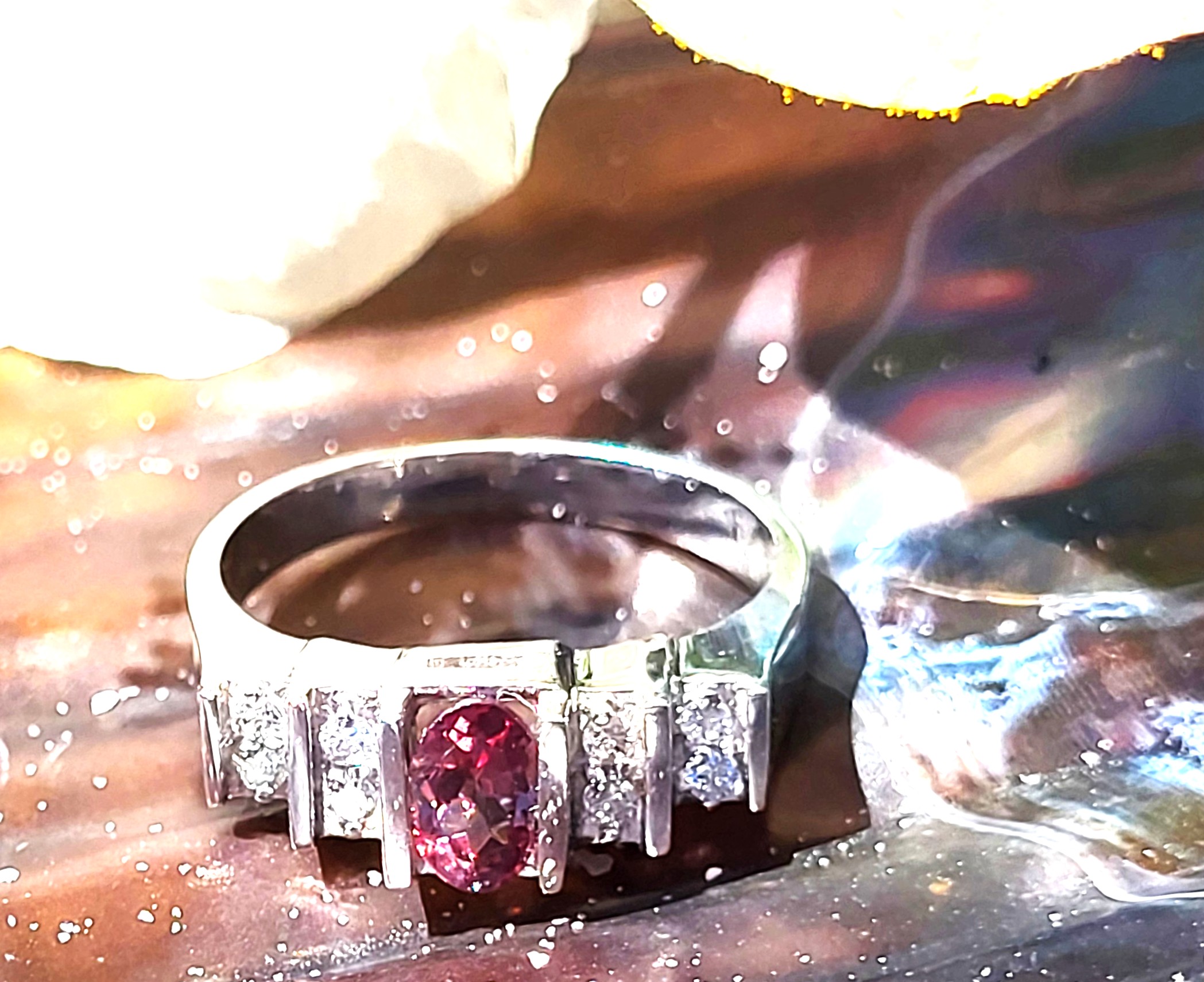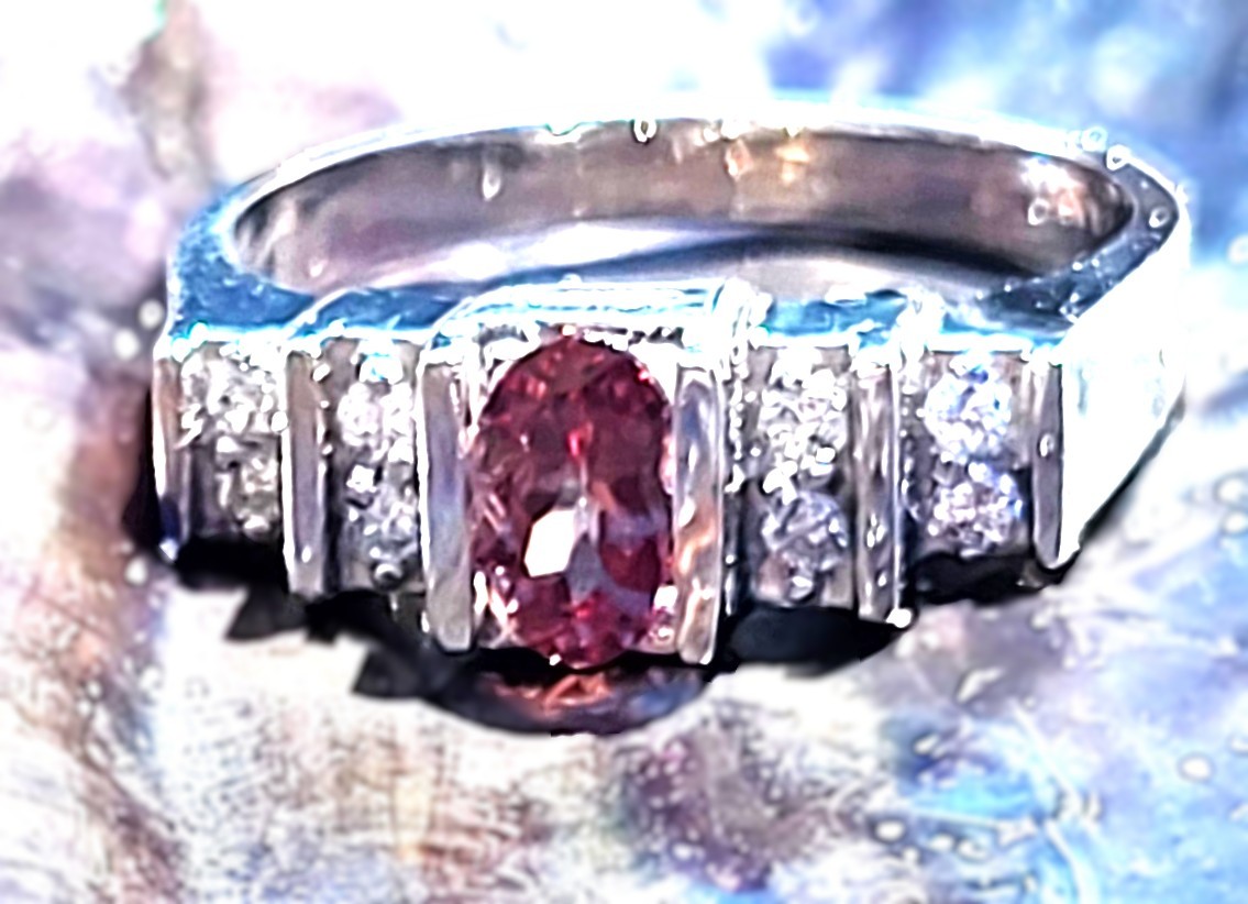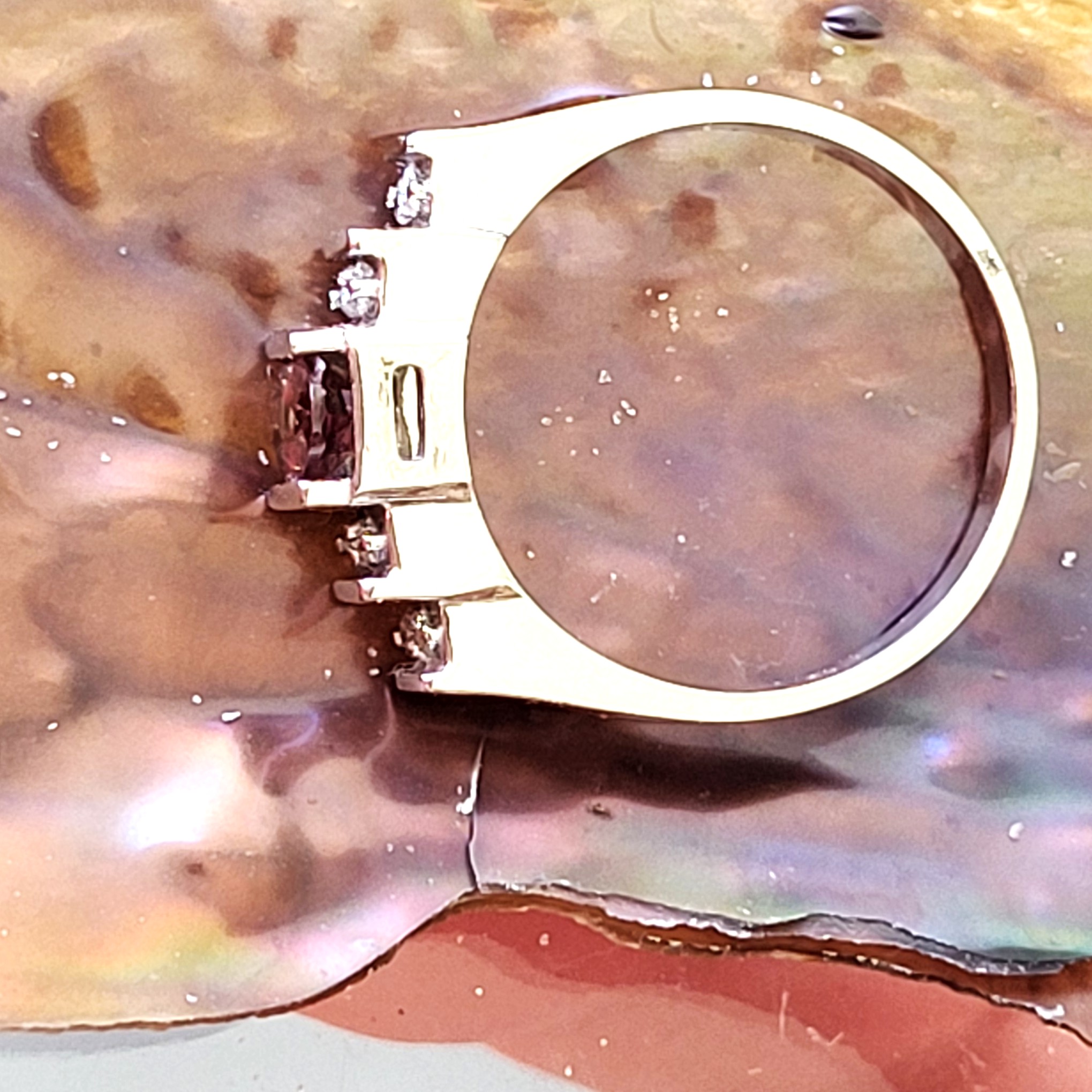 This is a 14 karat white gold ring that features an approximate .55 carat oval-cut, tension-set, natural and genuine COLOR-CHANGING garnet with approximately .16 carats total weight of round, brilliant-cut, H, SI2-I1 clarity diamonds on the stepped shoulders that taper to an approximate 2.5mm shank. This ring is US size 7 and can be sized for an additional charge. This item is eligible for appraisal at a discounted rate, from an independent appraiser (with qualifying credentials from GIA) with no affiliation to Bidfair Fine Jewelry. Please contact Bidfair Fine Jewelry for more information on appraisals and sizing.  Admin: G11241/6irt