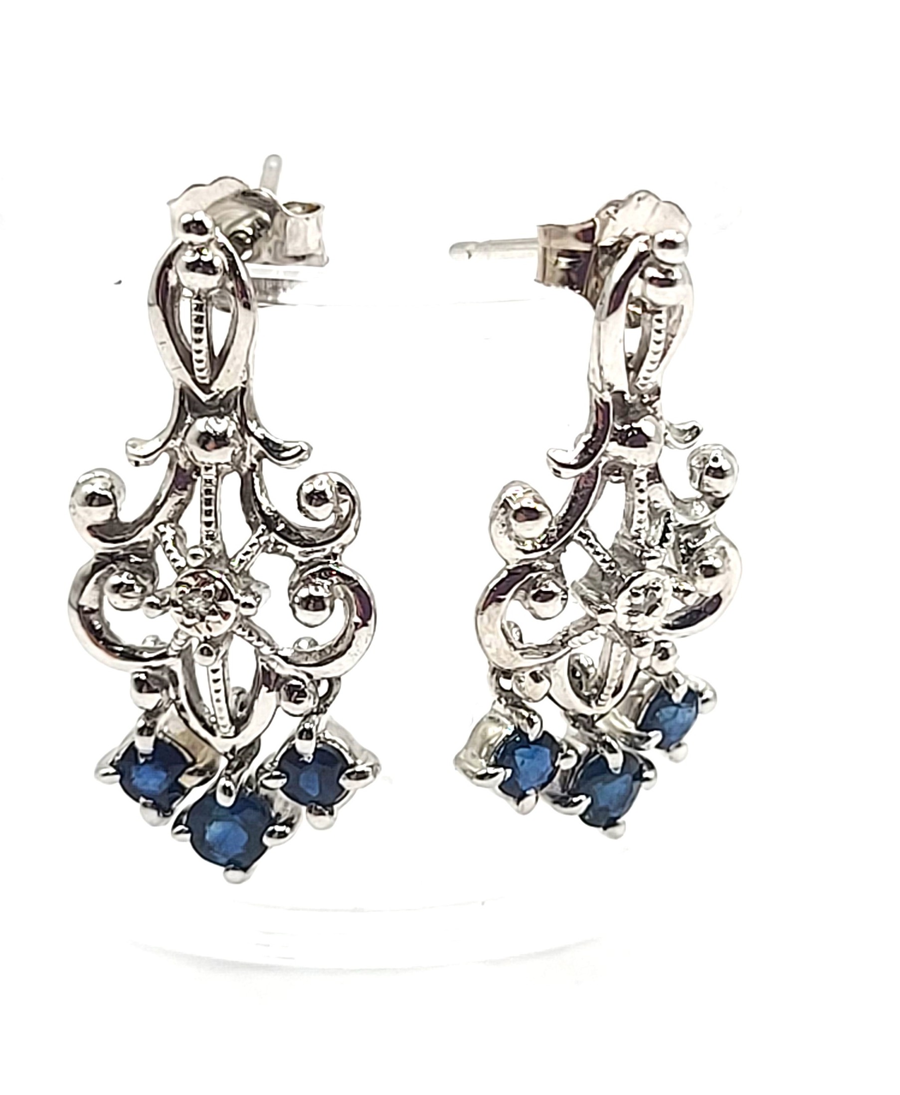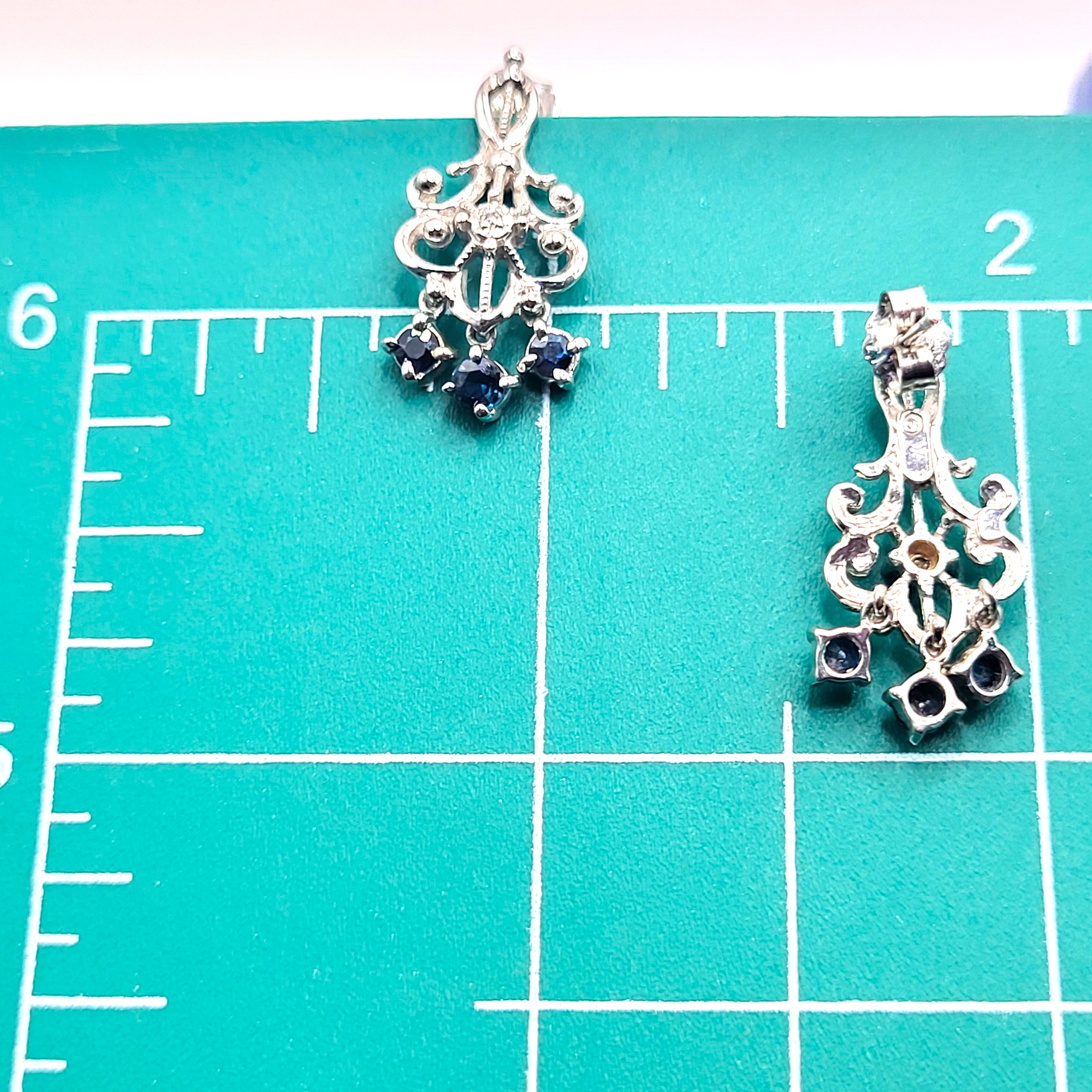 This pair of 14 karat white gold chandelier earrings dangle long enough to be flirty, but are short enough for more serious activities, like business meetings or parent-teacher day! They are adorned with .50 carats total weight of round, faceted genuine blue sapphires and accented with .01 carats total weight of round, faceted diamonds. They are approximately 7/8" long, 3/8" wide and attach to the earlobe with posts and friction backs. Admin: G11241/38lrt