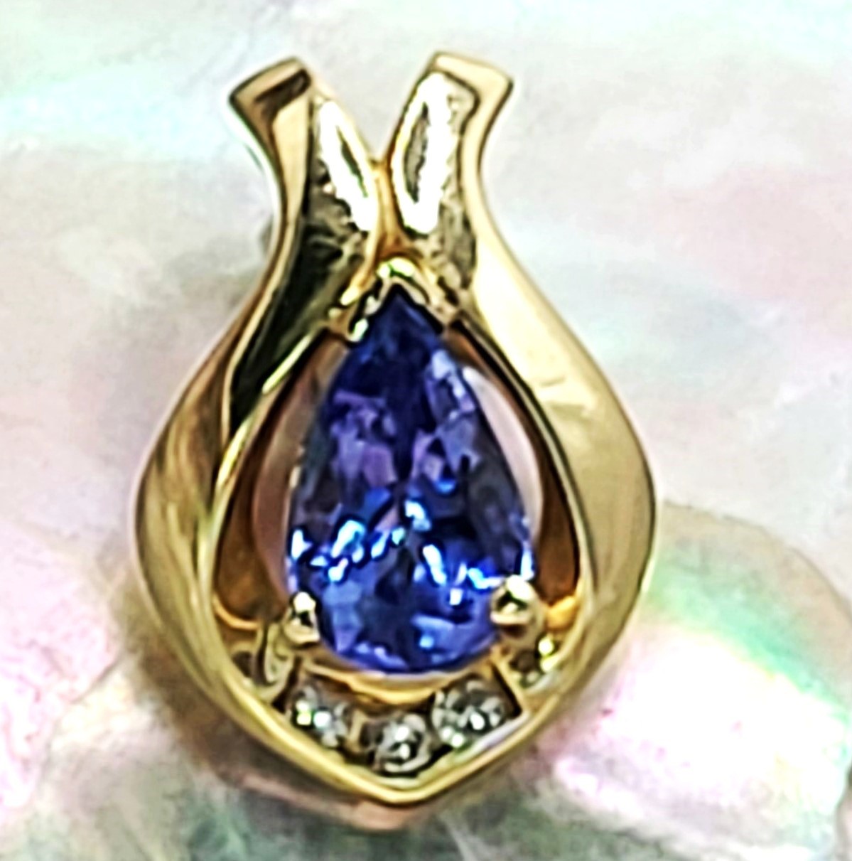 This is a 14 karat yellow gold pendant that features a 1.12 carat pear-cut, prong-set, rich bluish purple, genuine tanzanite. Channel-set at the bottom of the curvy yellow gold frame are .05 carats of round, brilliant-cut, H, SI2 clarity accent diamonds. The pendant is approximately 5/8" diameter and has a built-in bail that can accommodate an approximate 3.75mm wide chain. Admin: G11241/15grt
