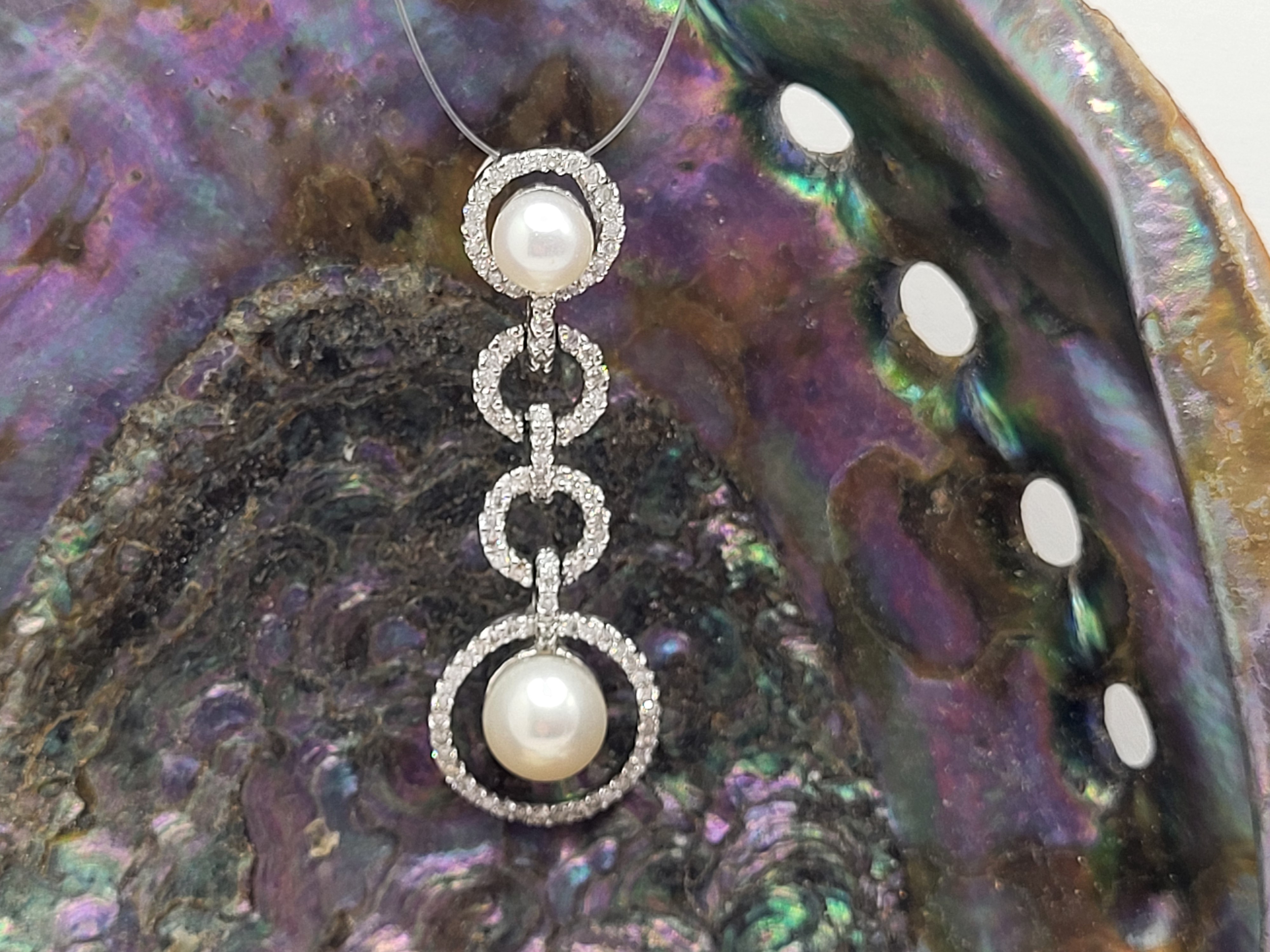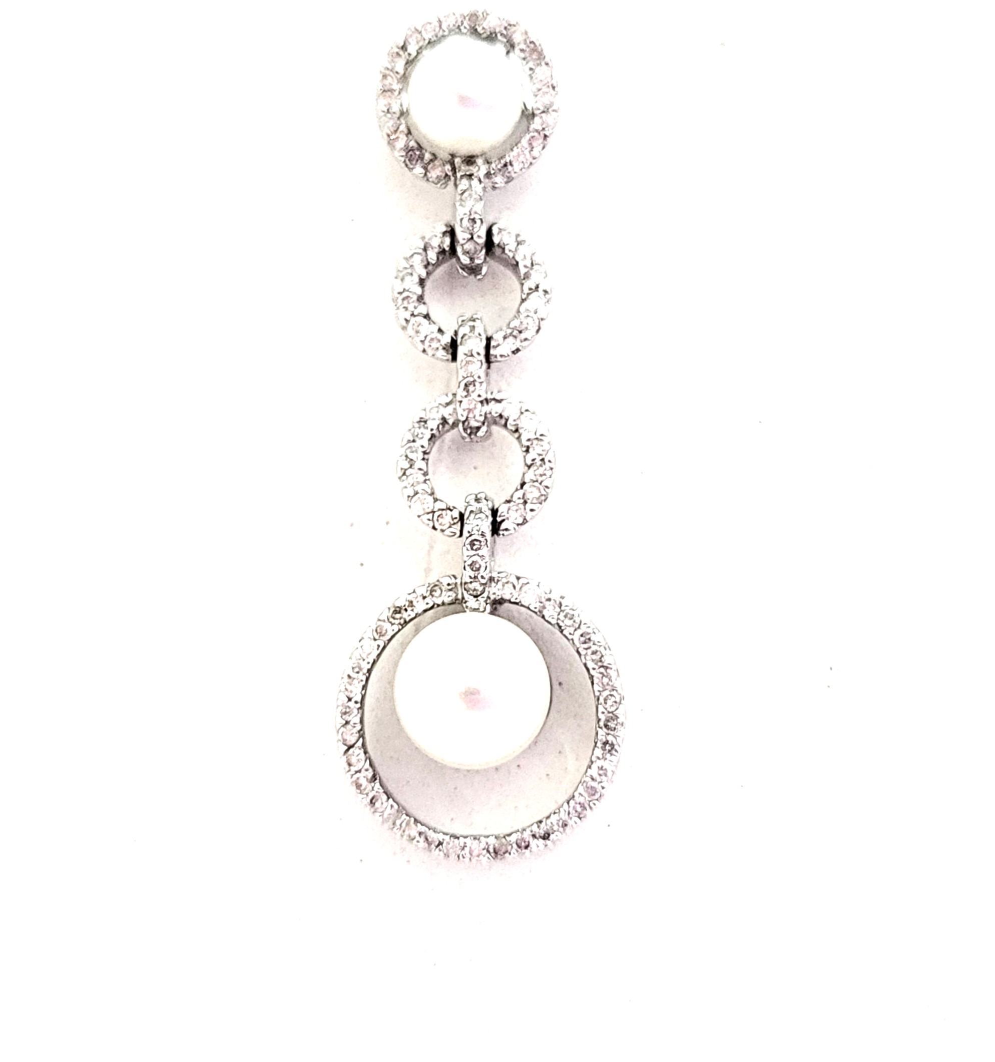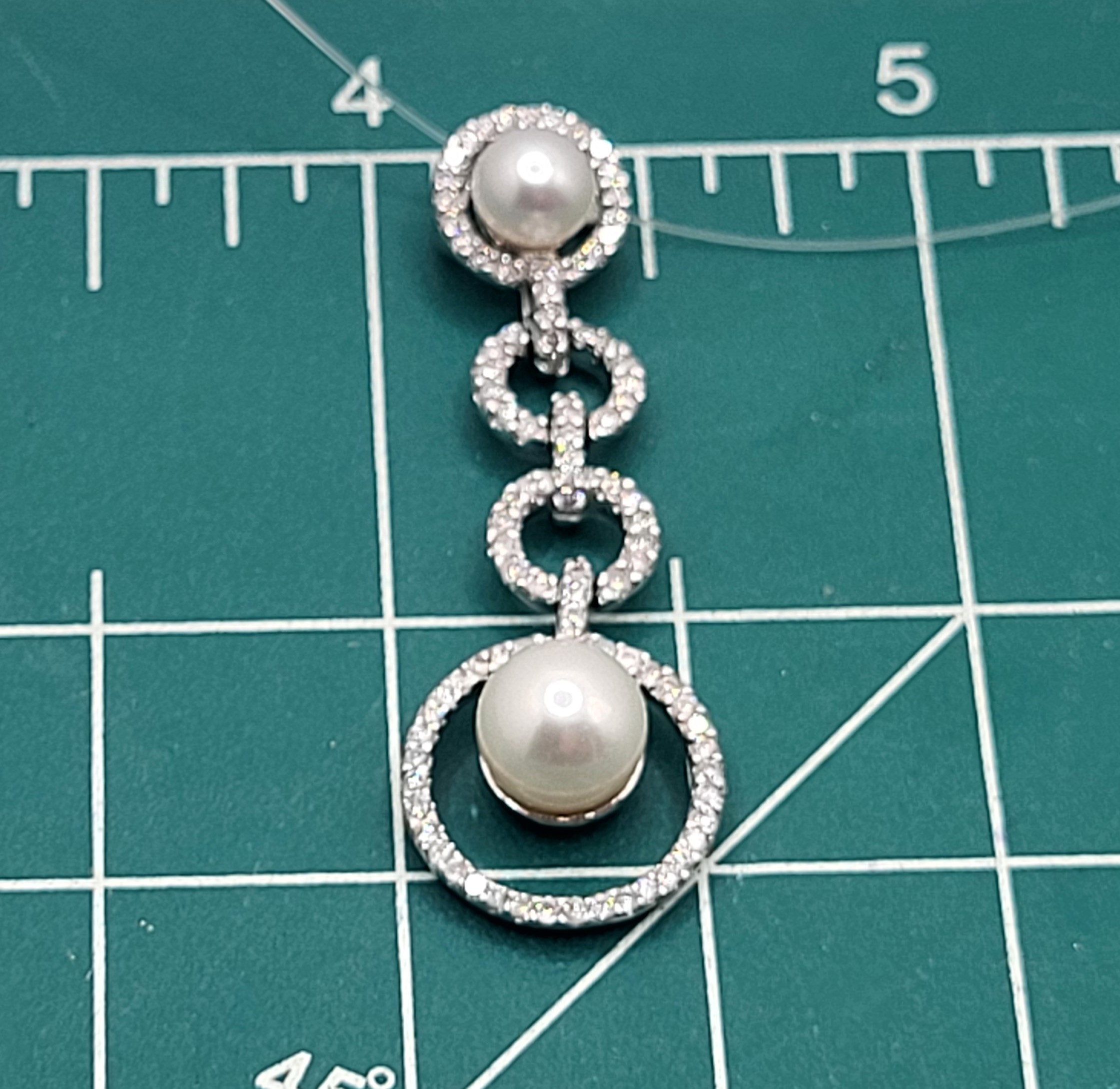 This is a 14 karat white gold pendant showcasing 2 silky cultured pearls, both having beautiful silvery and rosy sheens, and measuring 5-7mm. The pearls are secured with posts and cups and placed in the top and bottom of four circles that contain .43 carats total weight of round, brilliant-cut, H-I color, SI2-I1 clarity diamonds. The pendant is approximately 1.75" long and has two (2) hidden bails to create a slide-style pendant. This item is eligible for appraisal at a discounted rate, from an independent appraiser (with qualifying credentials from GIA) with no affiliation to Bidfair Fine Jewelry. Please contact Bidfair Fine Jewelry for more information on appraisals and sizing. Admin: G11241/43ngt