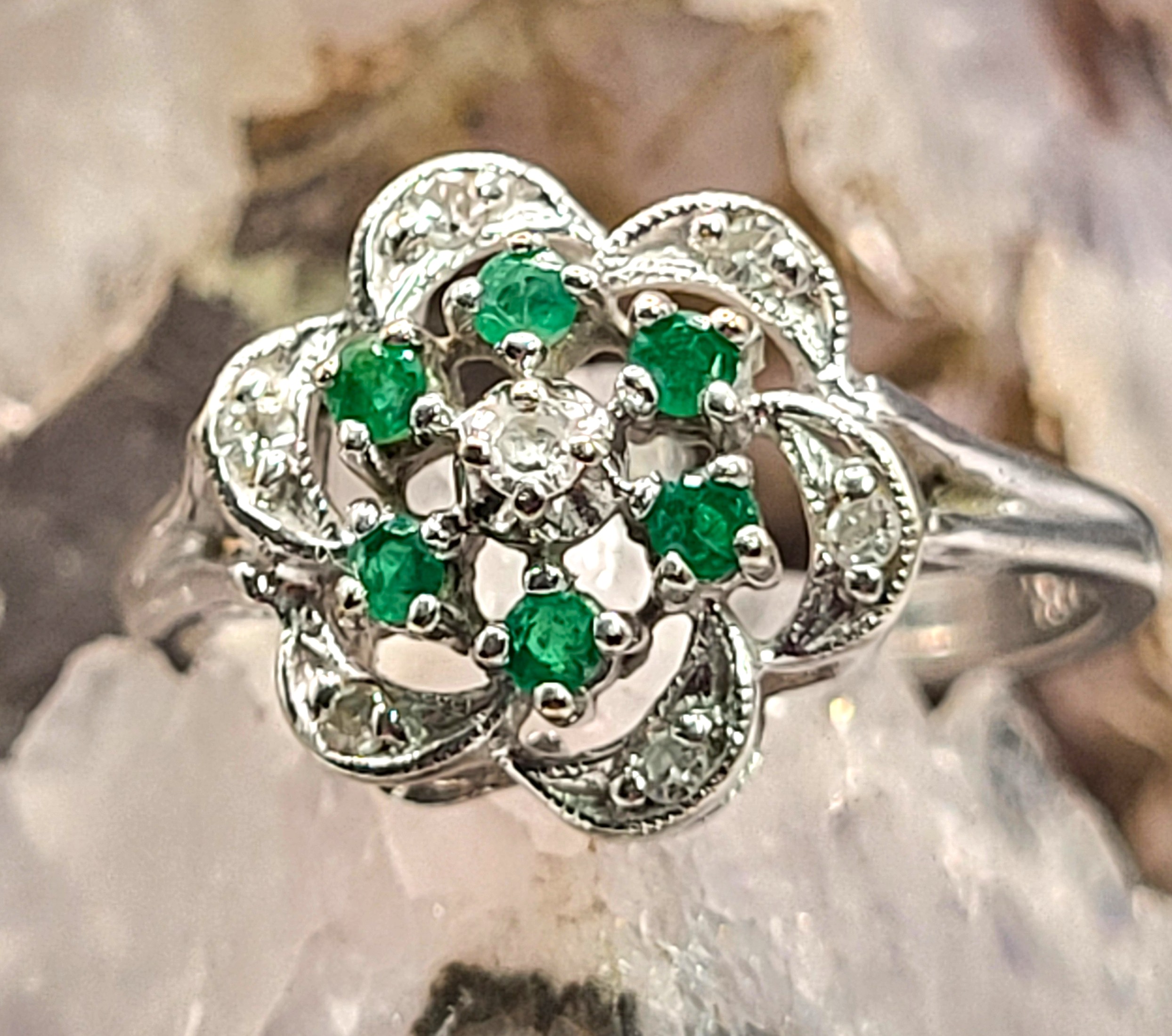 This vintage 10 karat white gold ring features a pinwheel circle of genuine emeralds around a prong-set center diamond, with additional diamonds in the woven, ribbon-like halo. The split shoulders of the ring taper to an approximate 2.25mm durable shank. This ring is US size 5 and can be sized for an additional charge. Please contact Bidfair Fine Jewelry for sizing details. The ring is circa 1980, but the beauty and style are timeless!