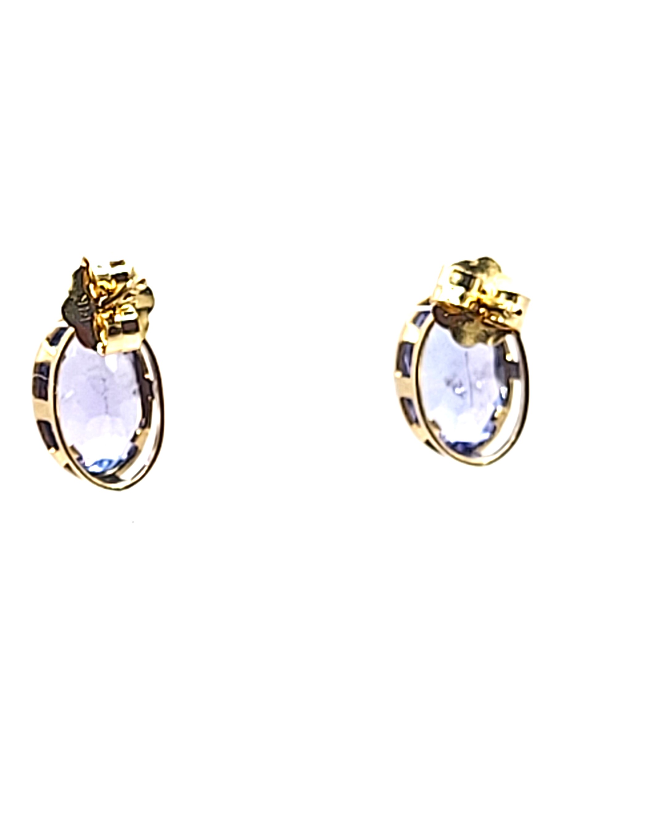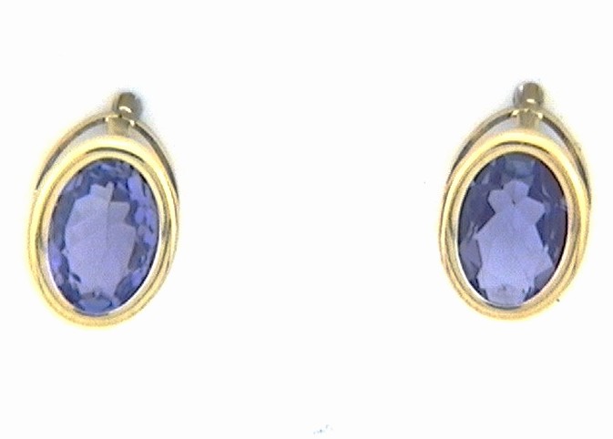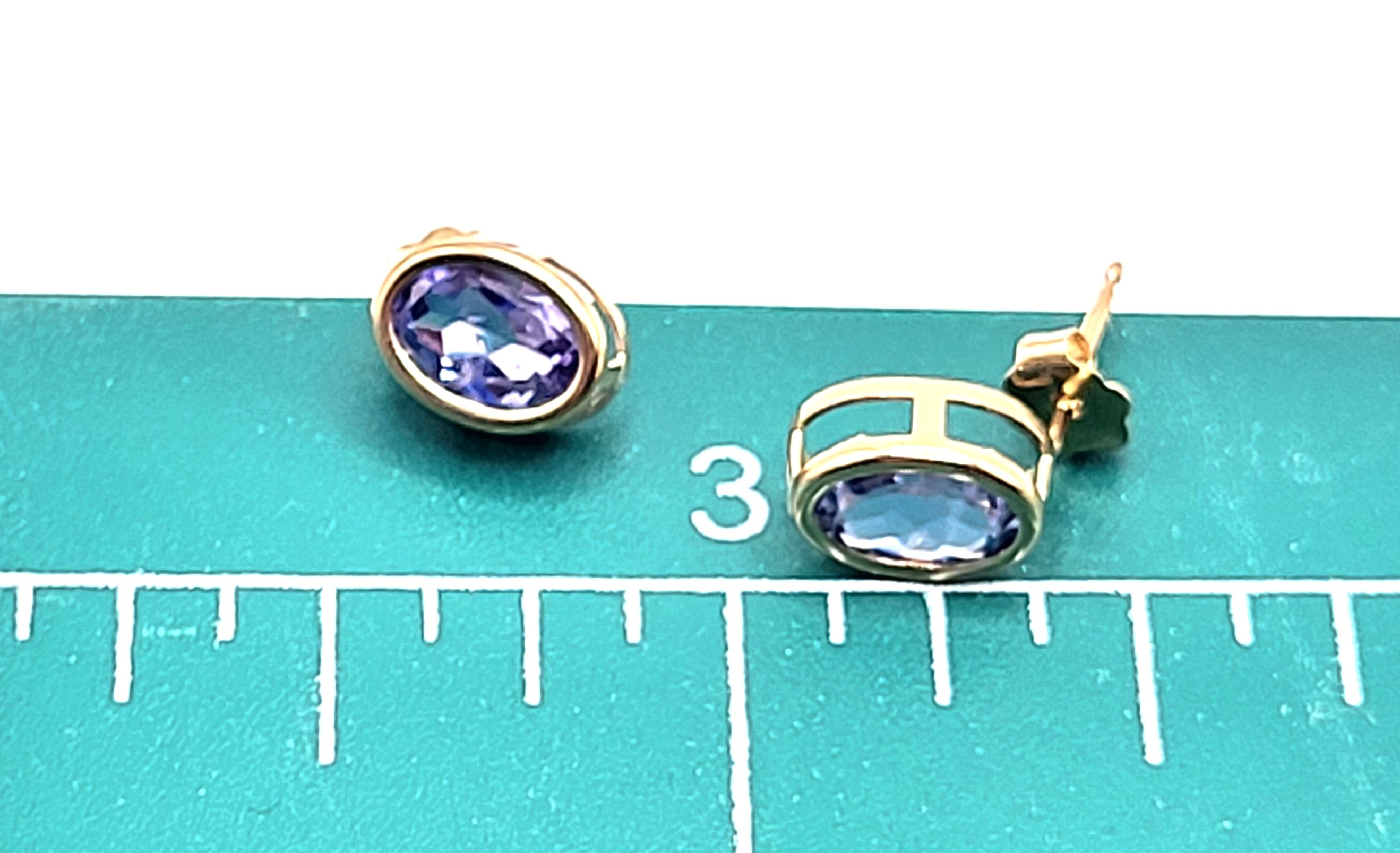This is a pair of 14 karat yellow gold earrings that feature 1.60 carats total weight of oval-cut, bezel-set, genuine tanzanites. The tanzanites are approximately 6x4mm. The earrings attach to the earlobe with posts and friction backs.  Admin: G11241/30ltt