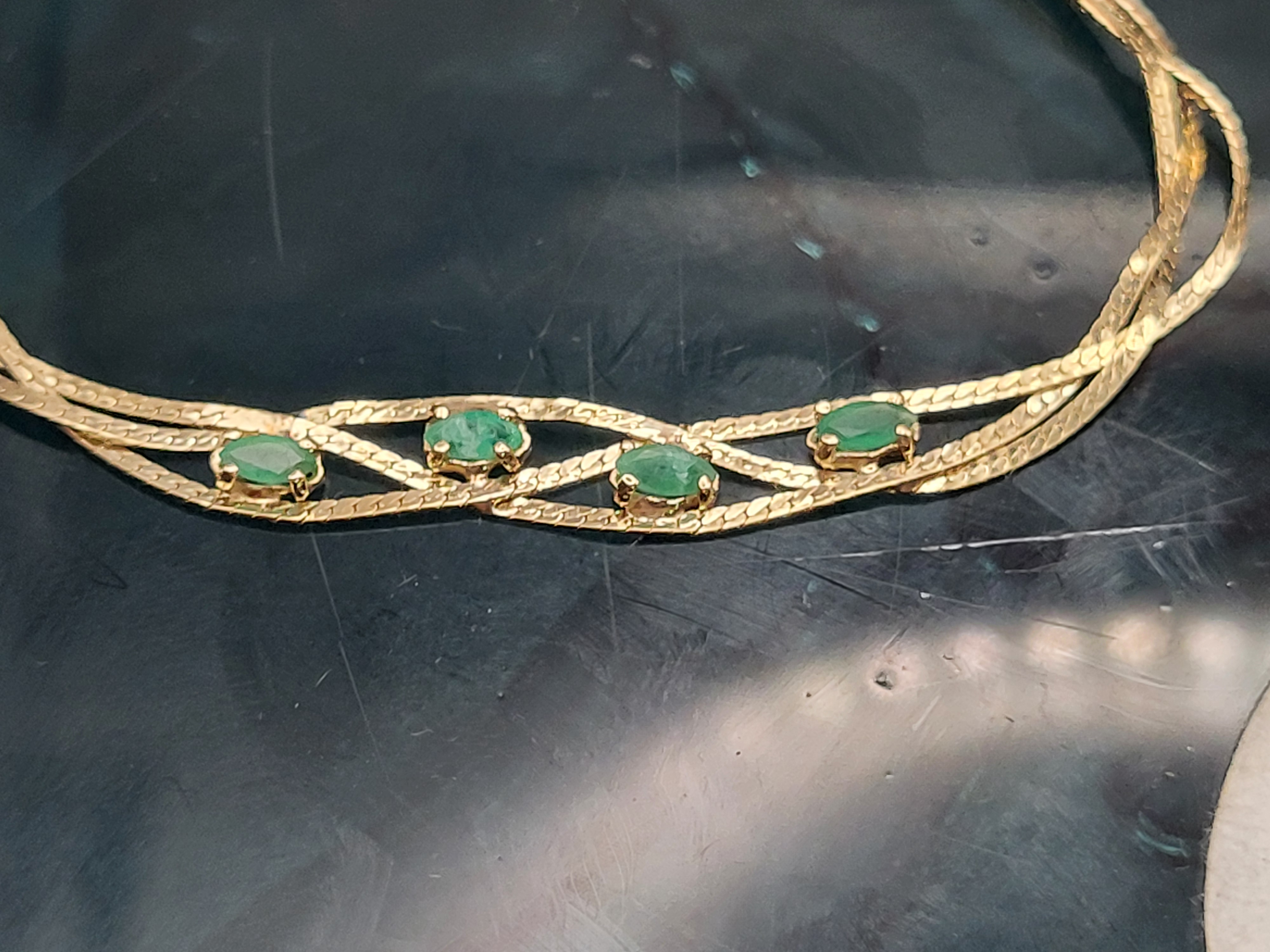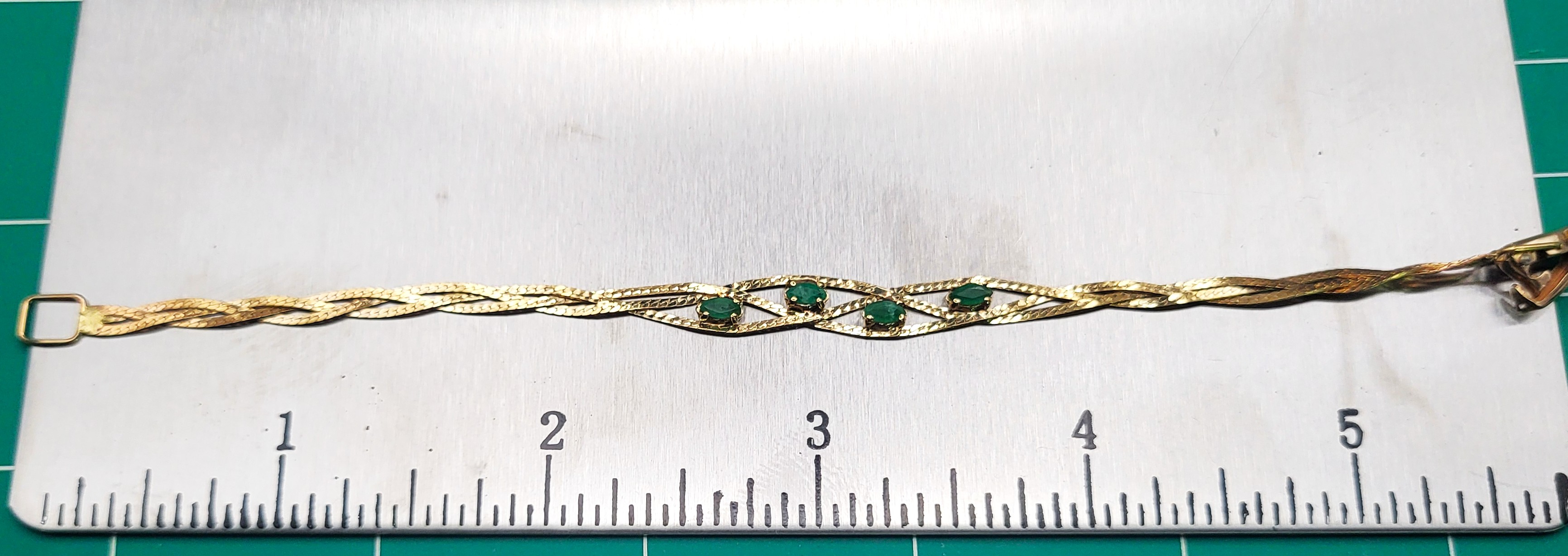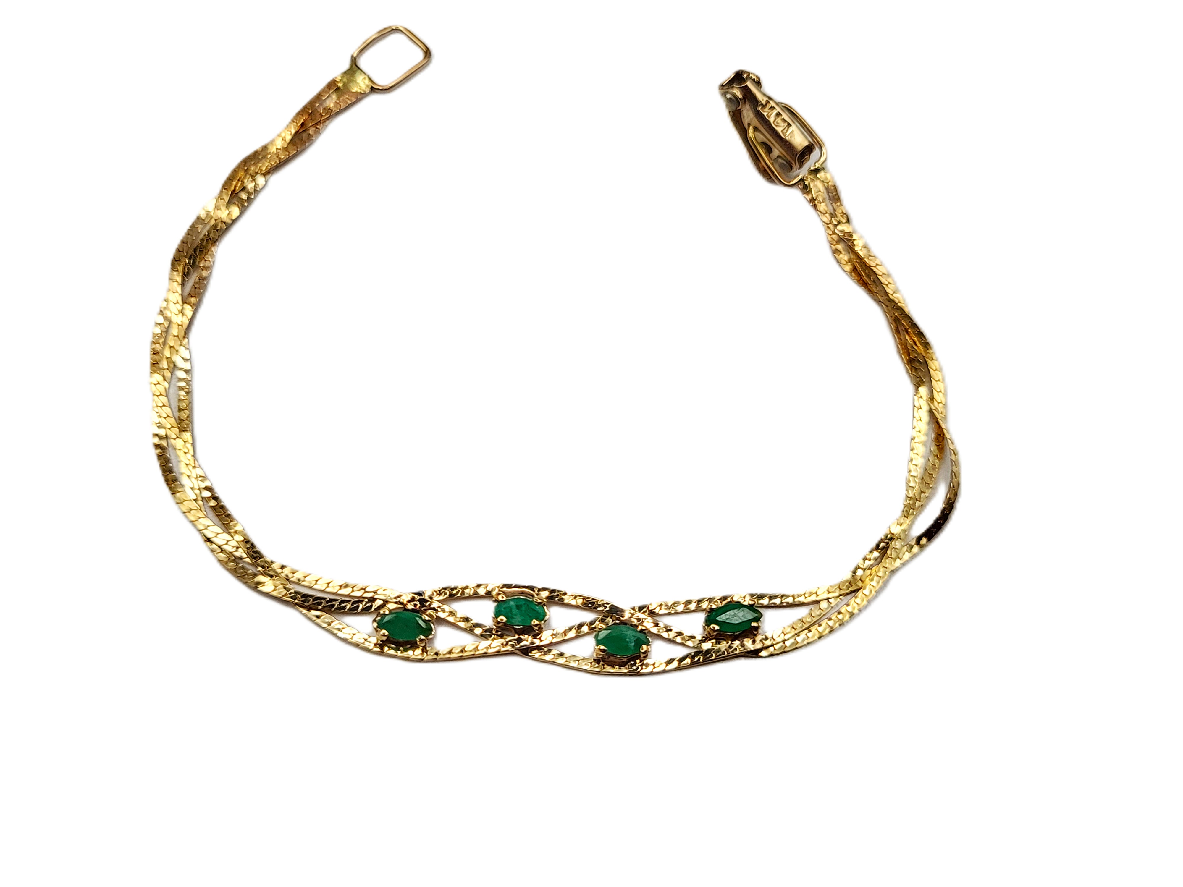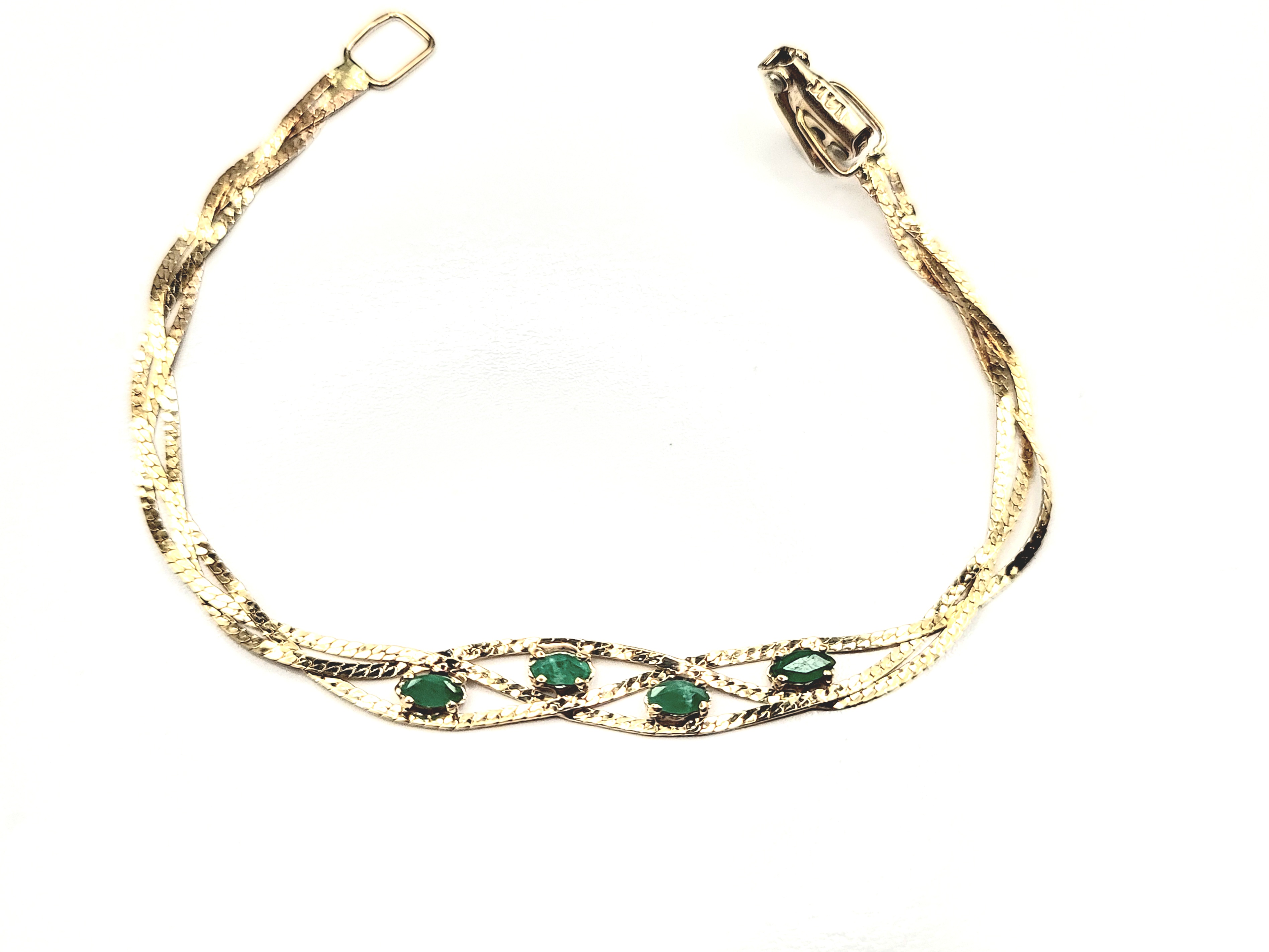 This 14 karat yellow gold bracelet features four, marquise-cut, prong-set, natural emeralds, totalling approximately .50 carats. The bracelet is 6" long and has what appears to be an after-market clasp. The emeralds are centered between three parts of braided herringbone chain. ( According to the estate manager, the original owner had the replacement clasp installed to prevent the turning and twisting that causes breaks. (With this after-market clasp, extra rings could be added on to make the bracelet longer, if desired)).