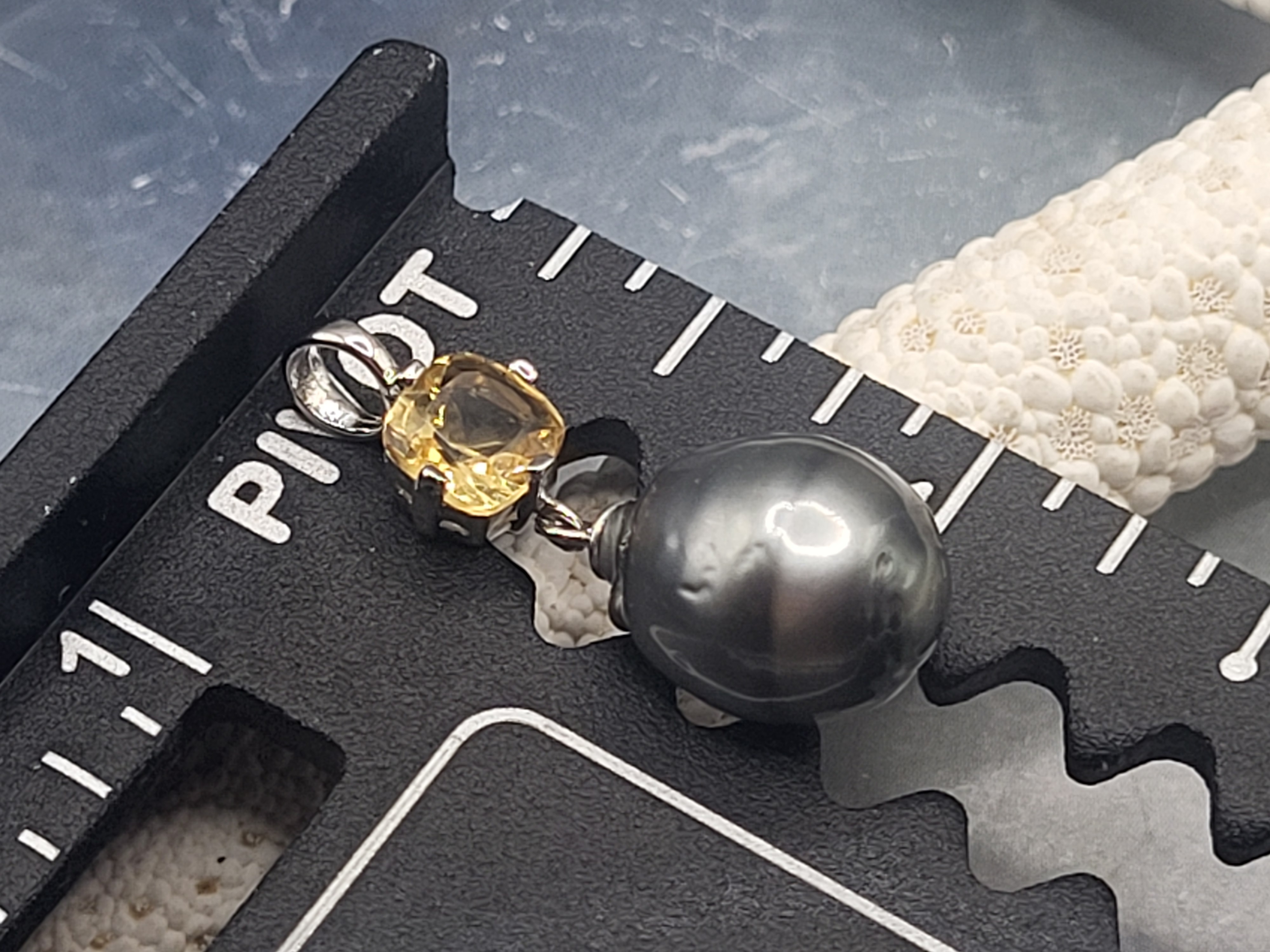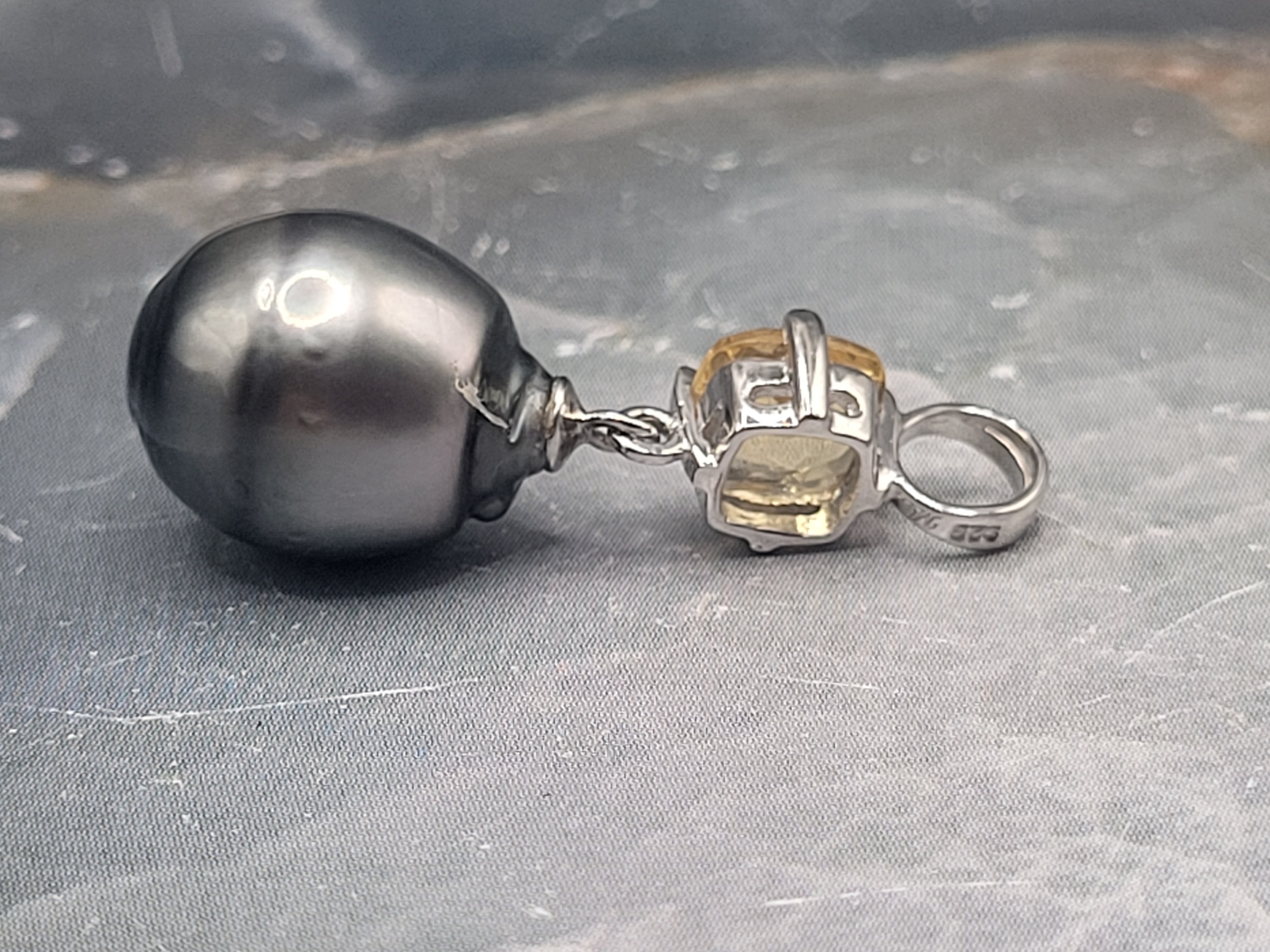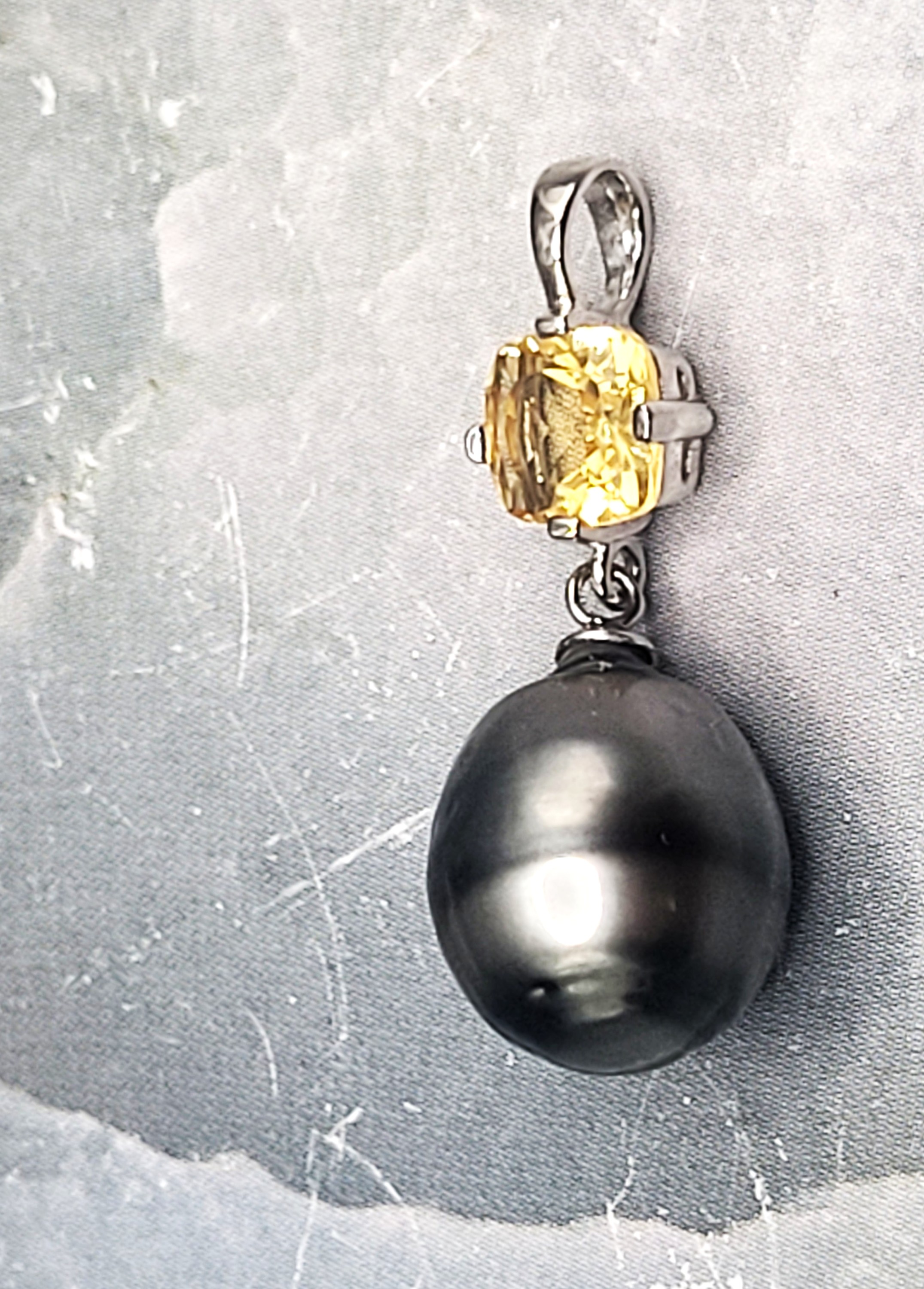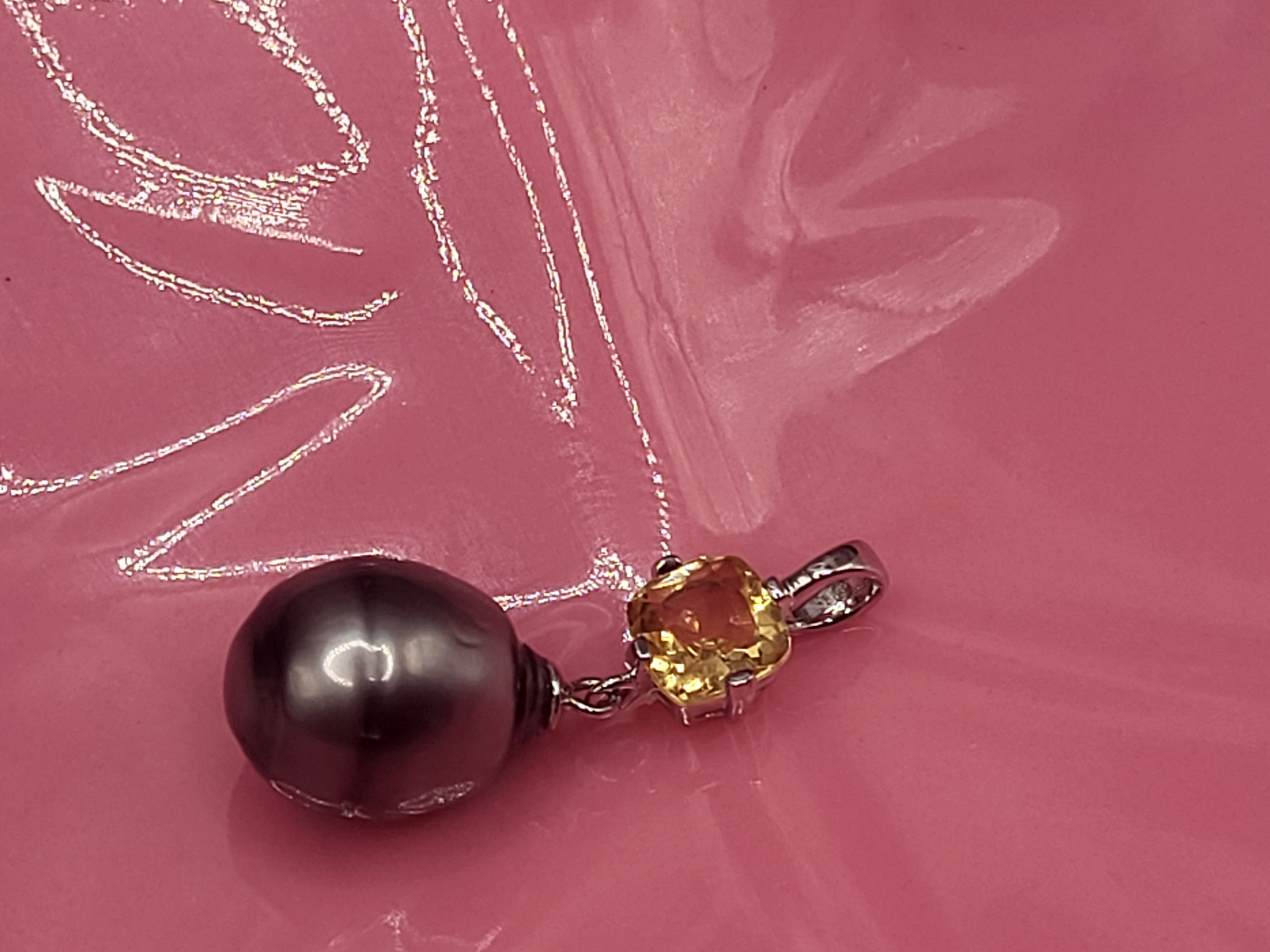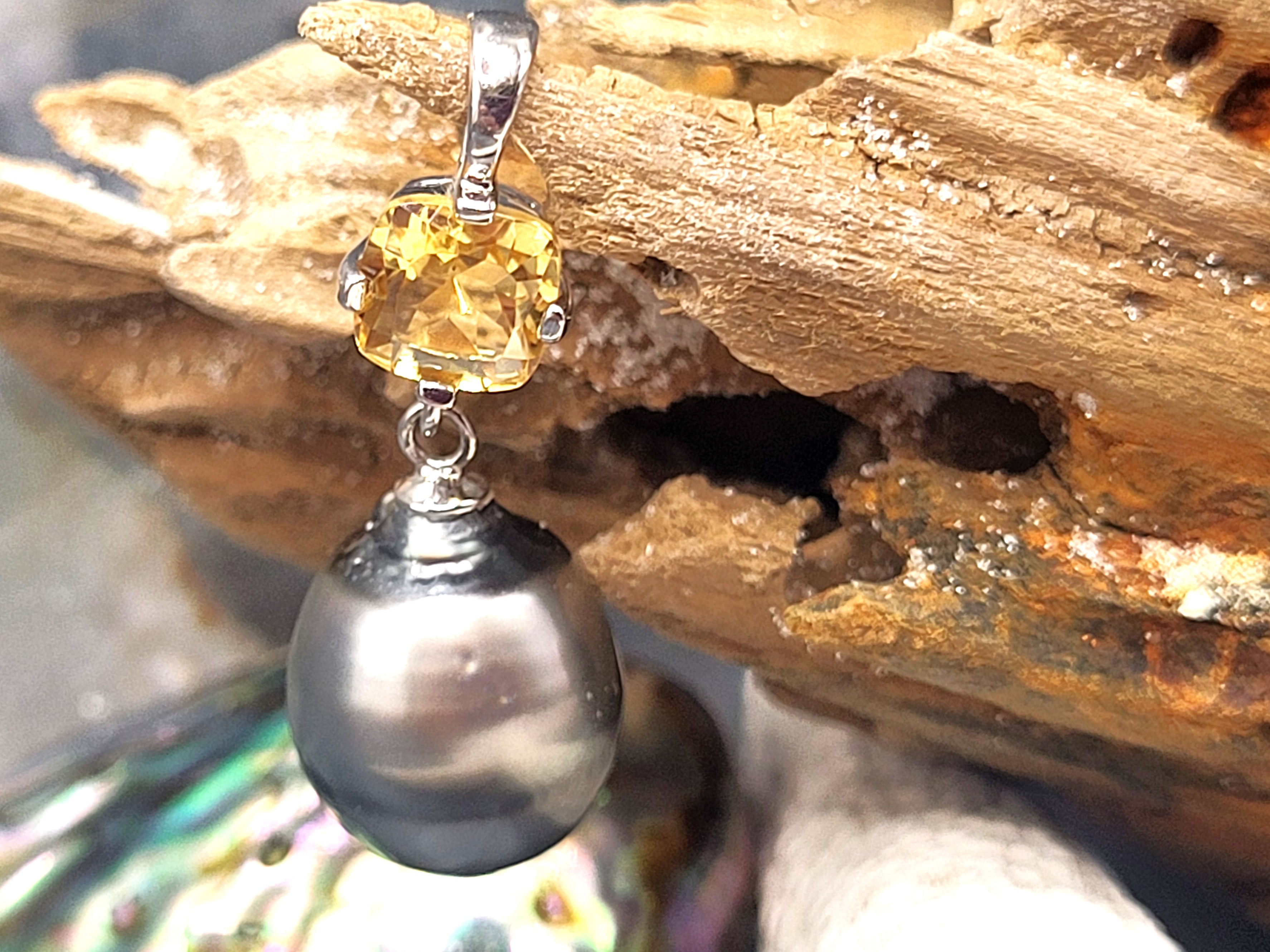 This STERLING SILVER pendant features a stunning dark, Silver- gray, genuine Tahitian, cultured ringed pearl with an exquisite mirror-like surface and measures 12 x 11mm. It dangles beneath an approximate .75 carat cushion-cut, genuine faceted citrine. This pendant has a solid bail that can accommodate up to an approximate 3.5 mm chain.