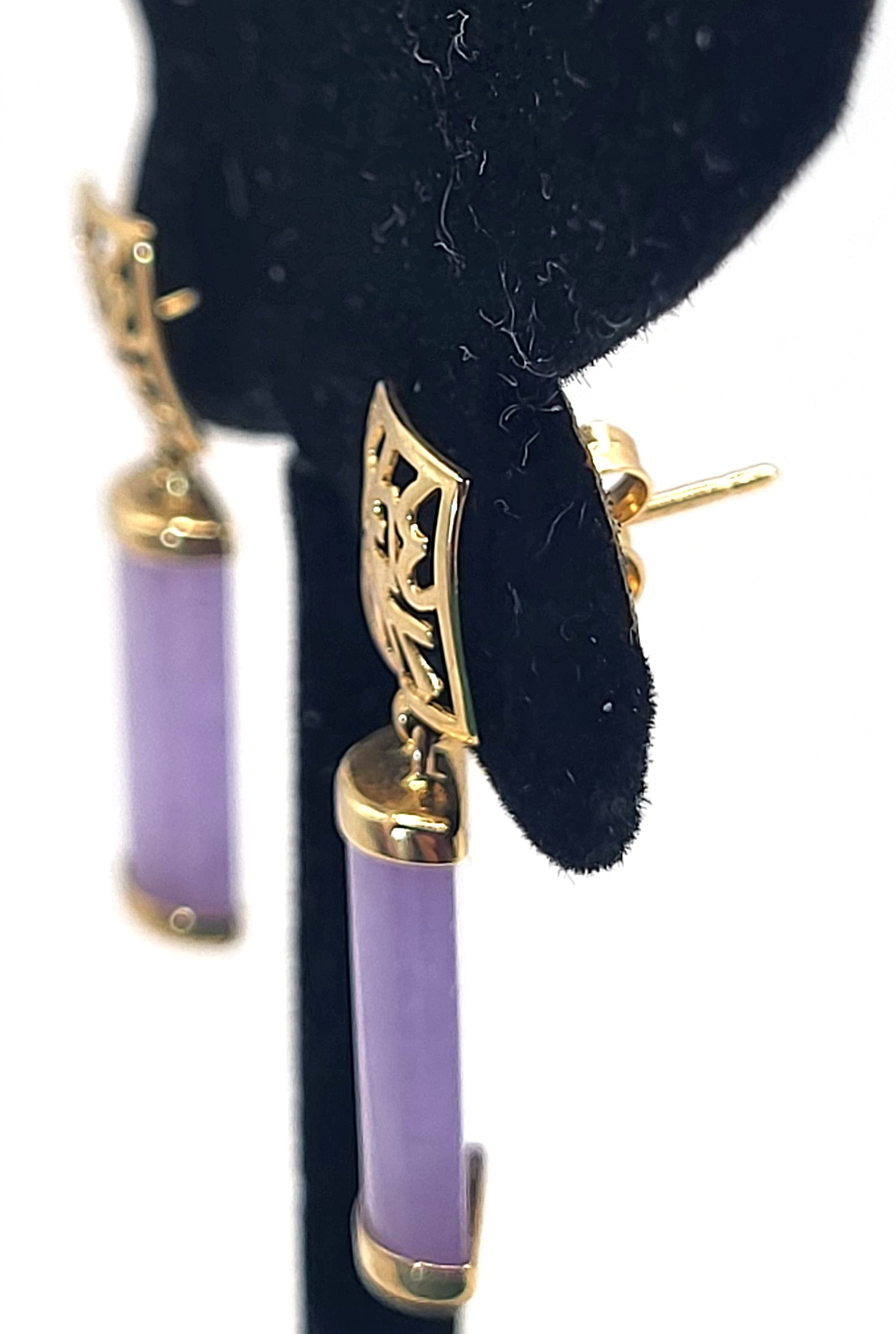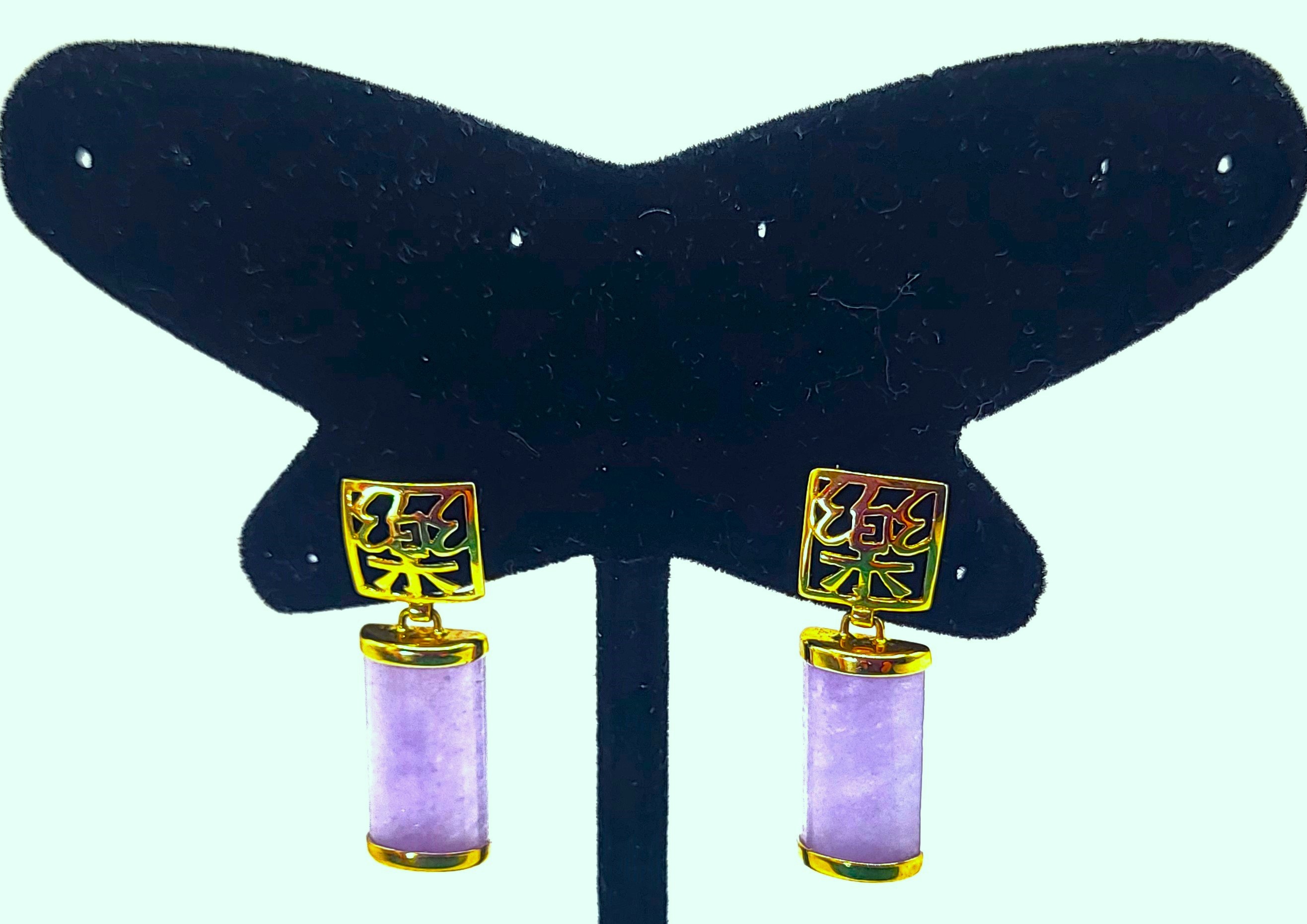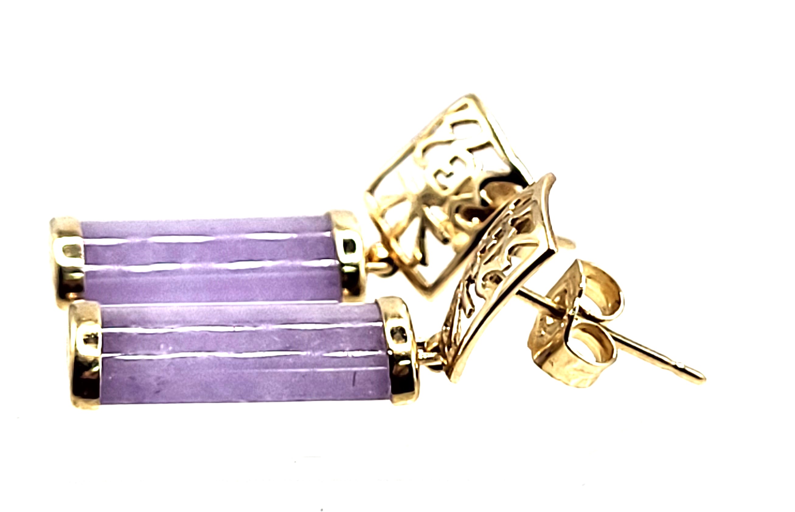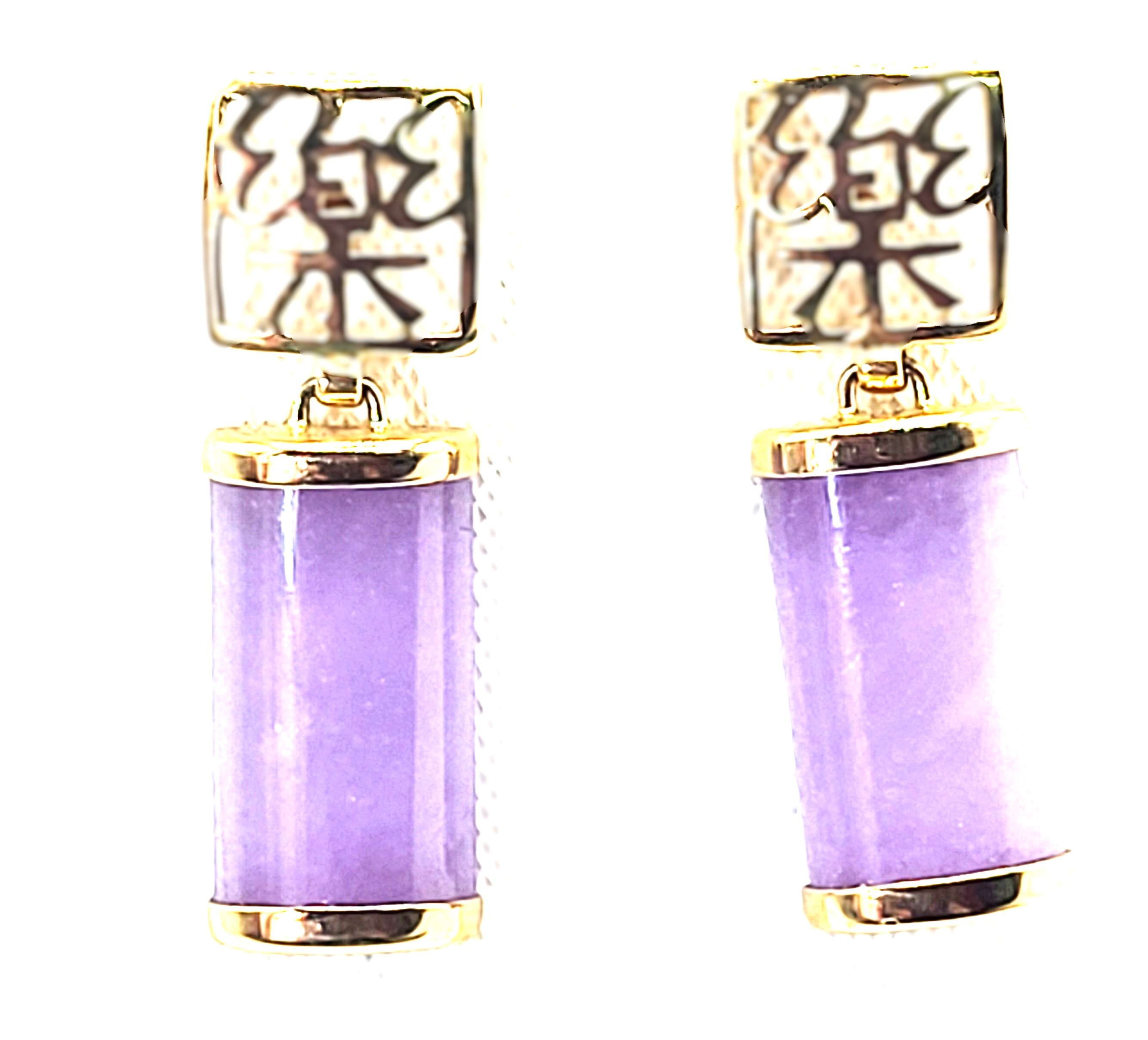 Lavender Jadeite bars hang from 14 karat yellow gold earrings with Asian script inside square-shaped ear buttons. The jadeite measure approximately 5/8" x 5/16" and have caps on each end. The earrings attach to the earlobe with posts and friction backs and hang approximately 1". Admin: 33110/22ag
