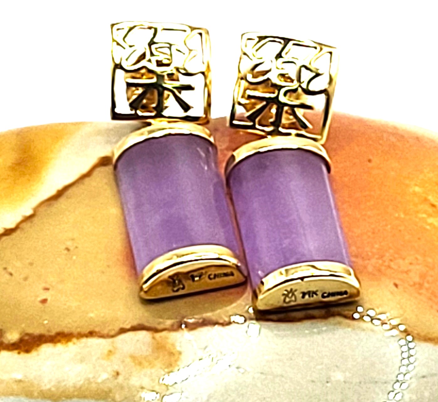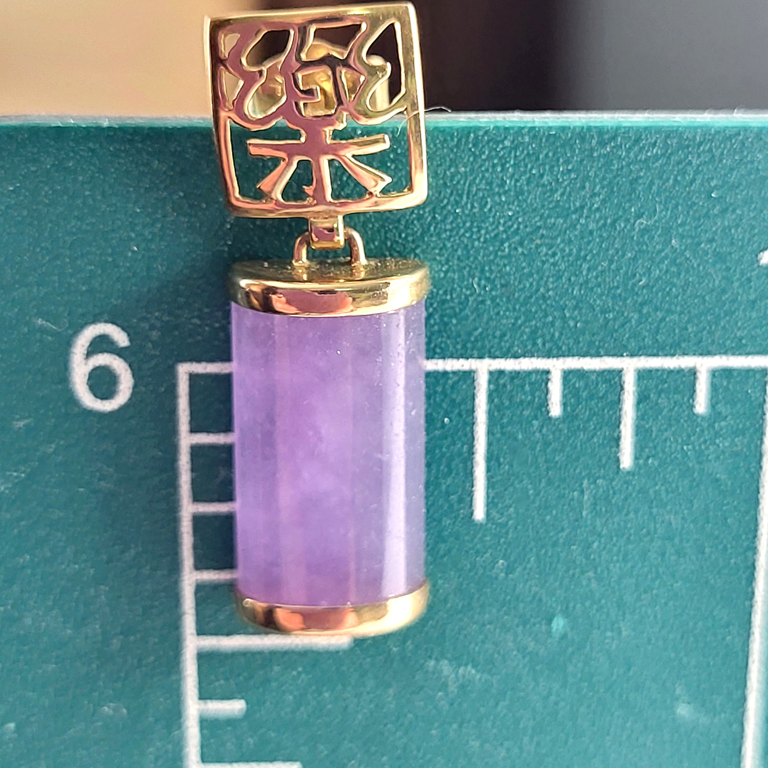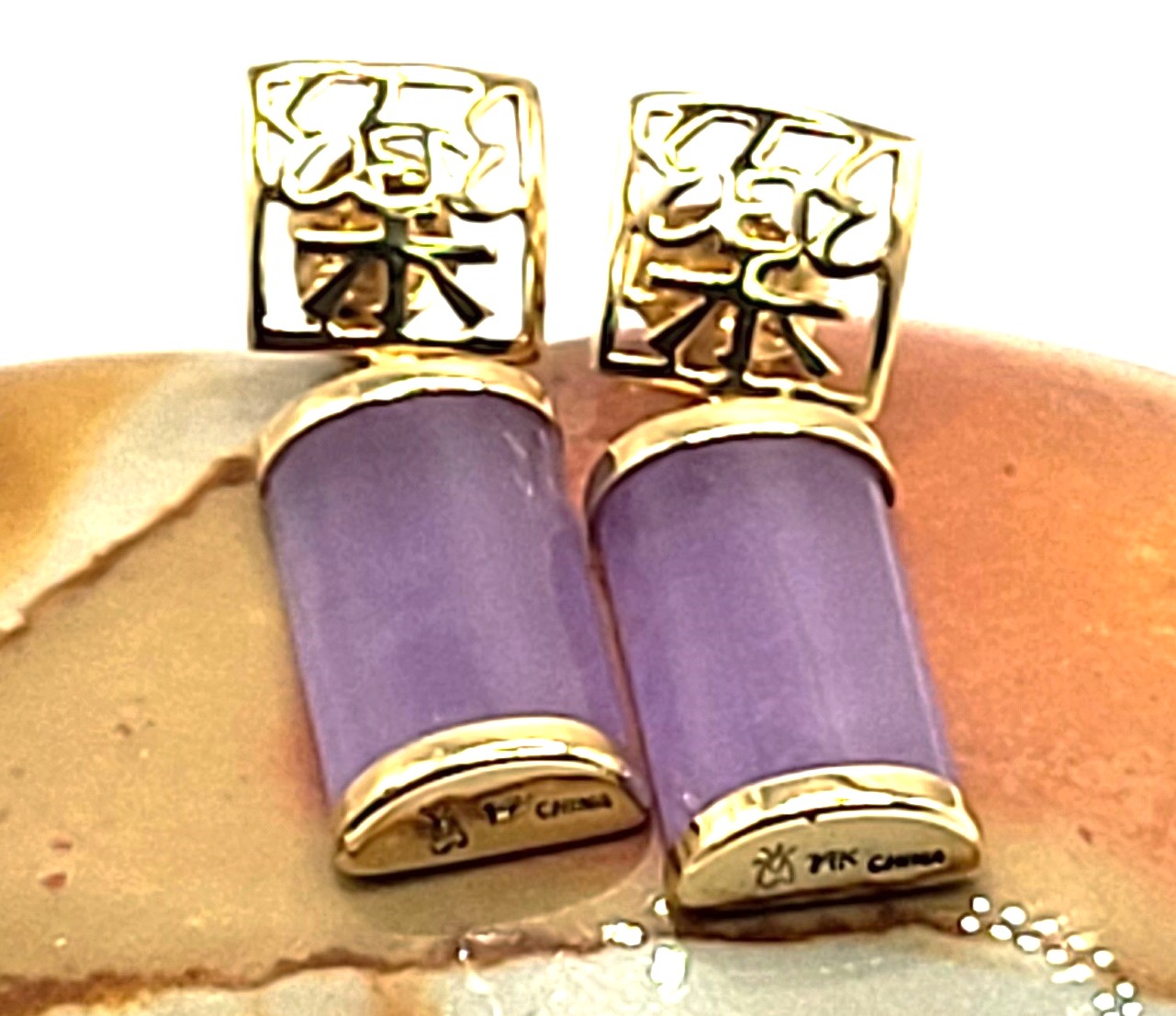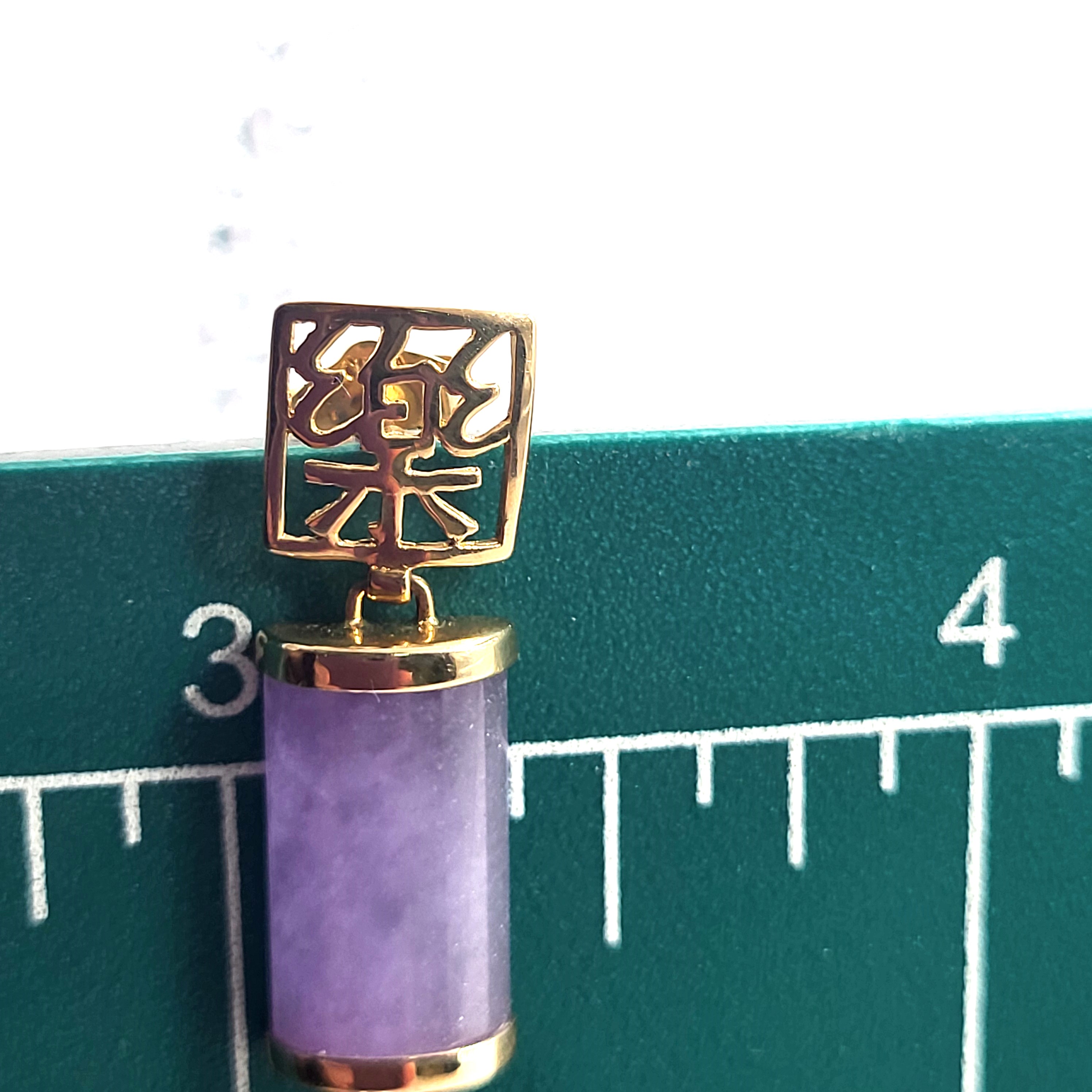 Lavender Jadeite bars hang from 14 karat yellow gold earrings with Asian script inside square-shaped ear buttons. The jadeite measure approximately 5/8" x 5/16" and have caps on each end. The earrings attach to the earlobe with posts and friction backs and hang approximately 1". Admin: 33110/22ag