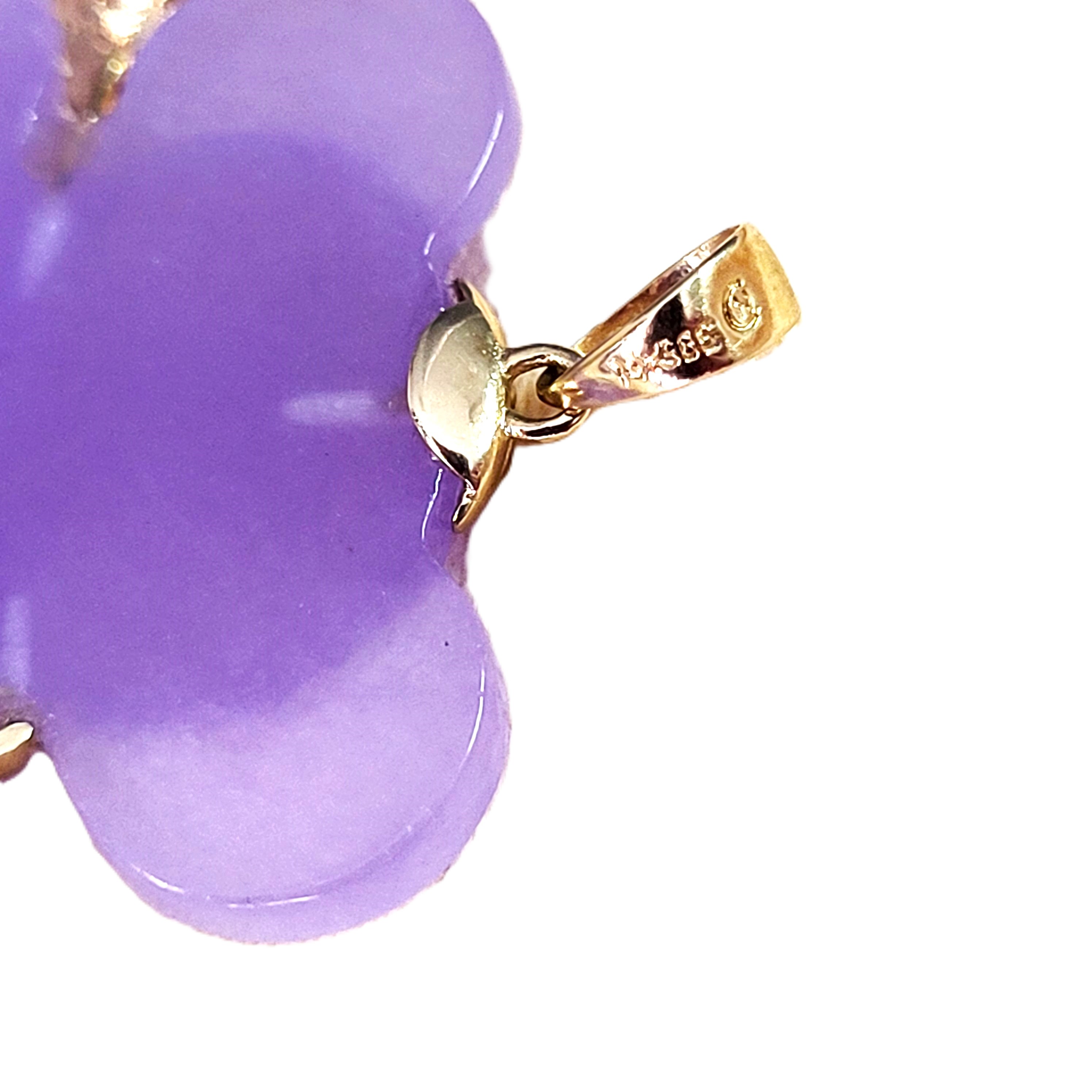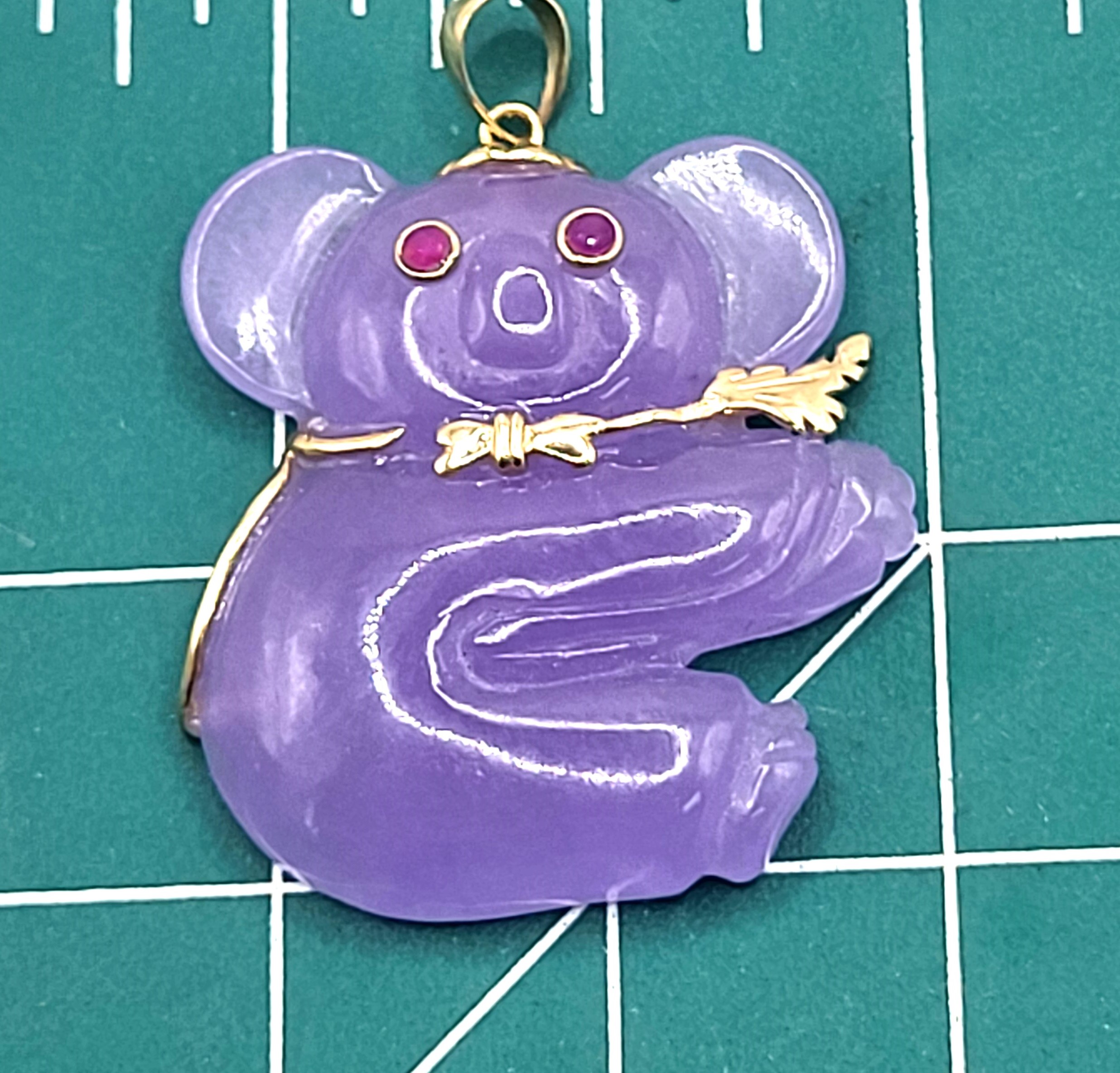 You will love this 14 karat yellow gold pendant with a Koala bear, carved from Lavender Jadeite with approximately .10 carats total weight of round, faceted, genuine rubies for the eyes. The pendant is approximately1.25" x 1.25" and the bail can accommodate an approximate 3.5mm chain.