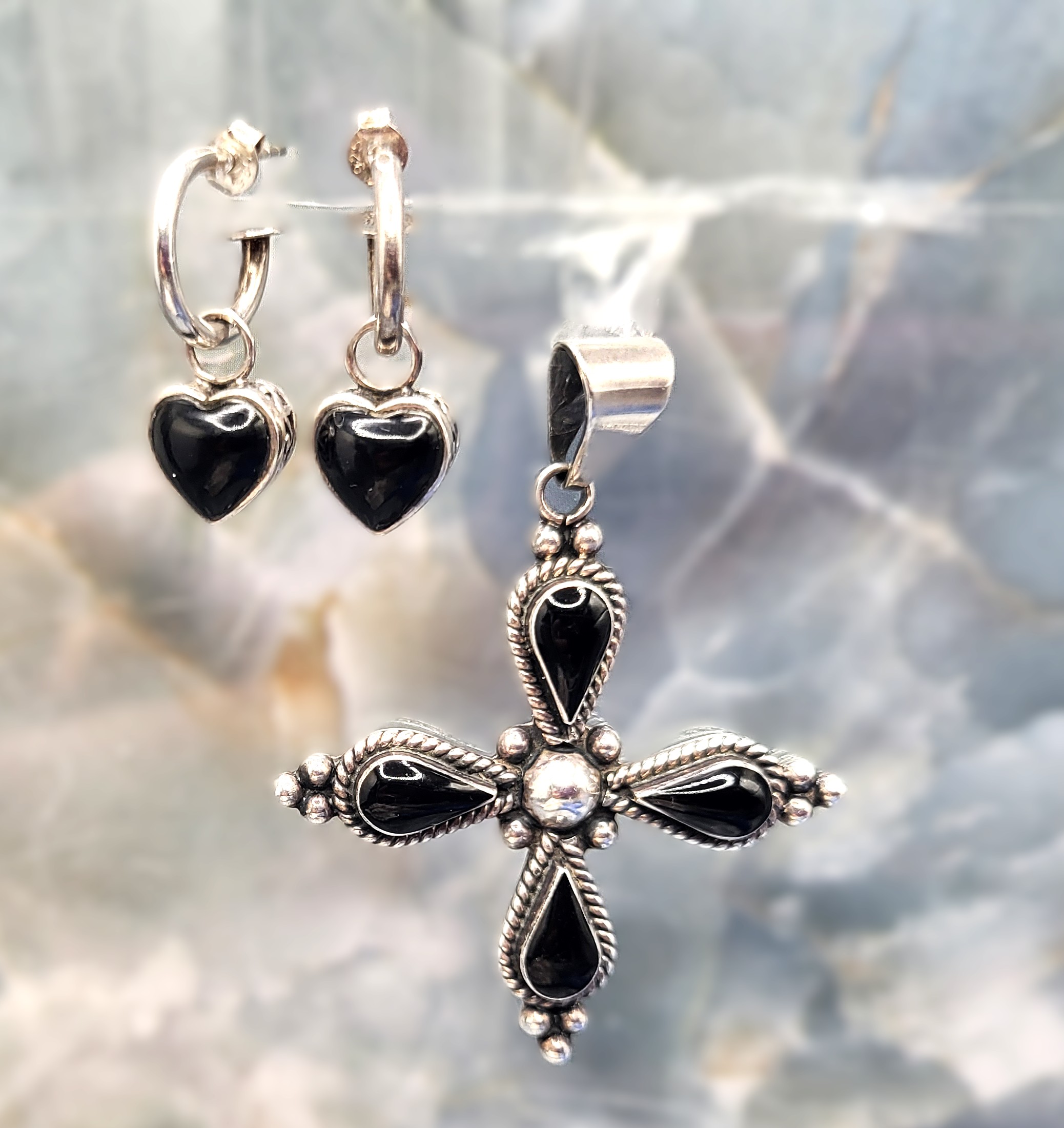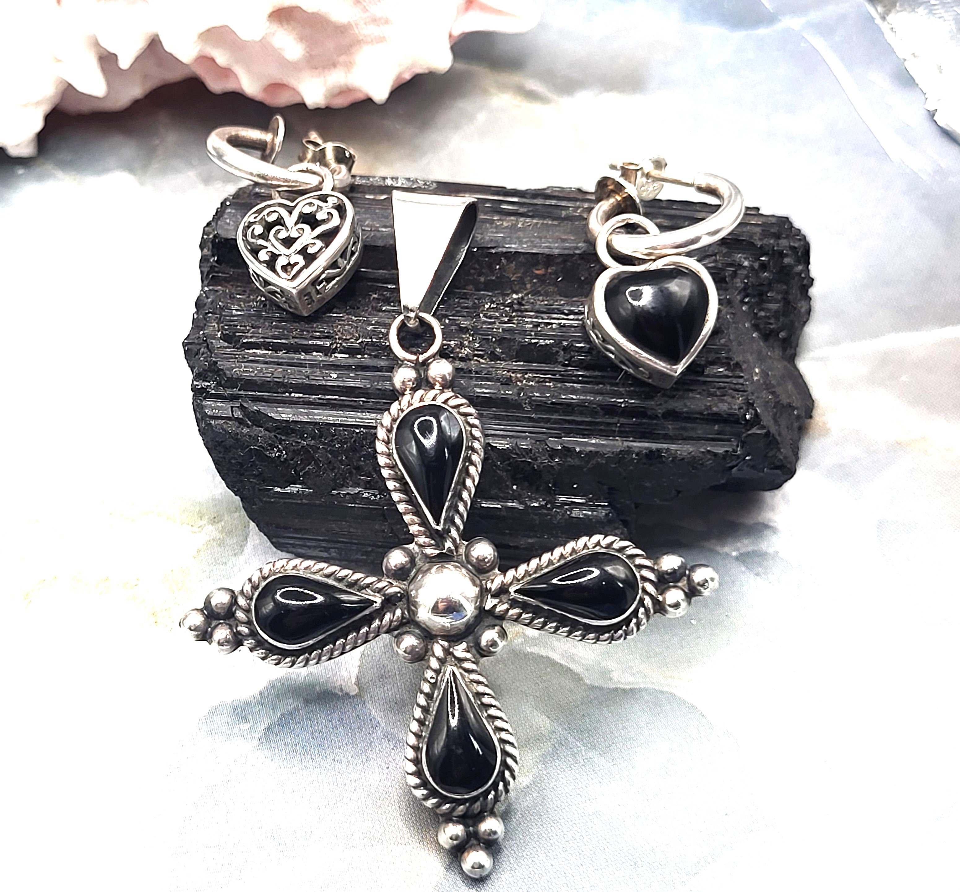 Signed HOB for House of Bangles, Mexico, sterling silver cross pendant features four polished, teardrop-shaped black onyx with sterling silver bead accents and a solid back gallery. A solid bail that is attached to a jump ring can accommodate up to an approximate 5.25mm chain. The bonus earrings are REVERSIBLE! They are sterling silver half hoops, marked SE Thaniland, with heart-shaped, polished black onyx in the front and beautiful scrollwork on the back with reticulated galleries in between. The earrings attach to the earlobes with posts and butterfly backs and have a flat stop plate to prevent the heart from sliding off. .Admin: K33/