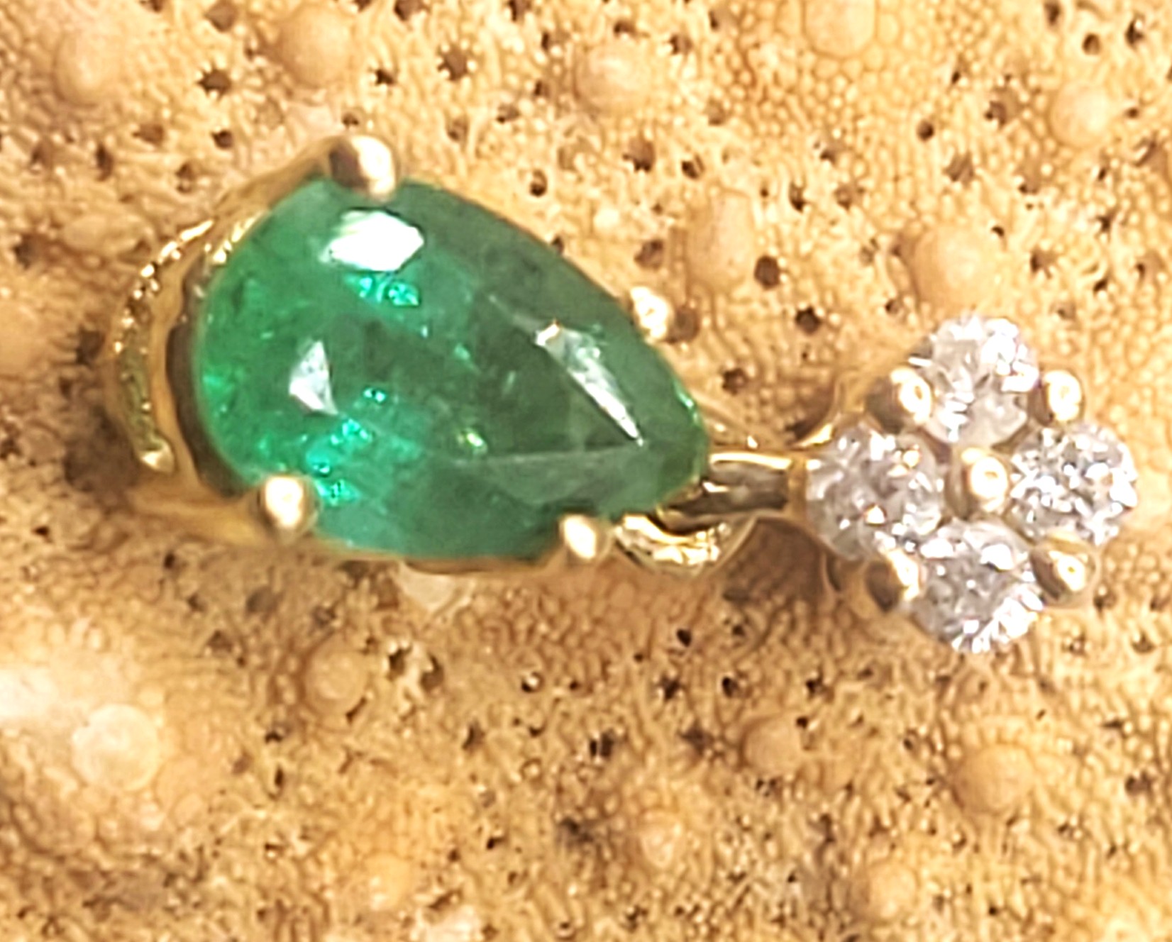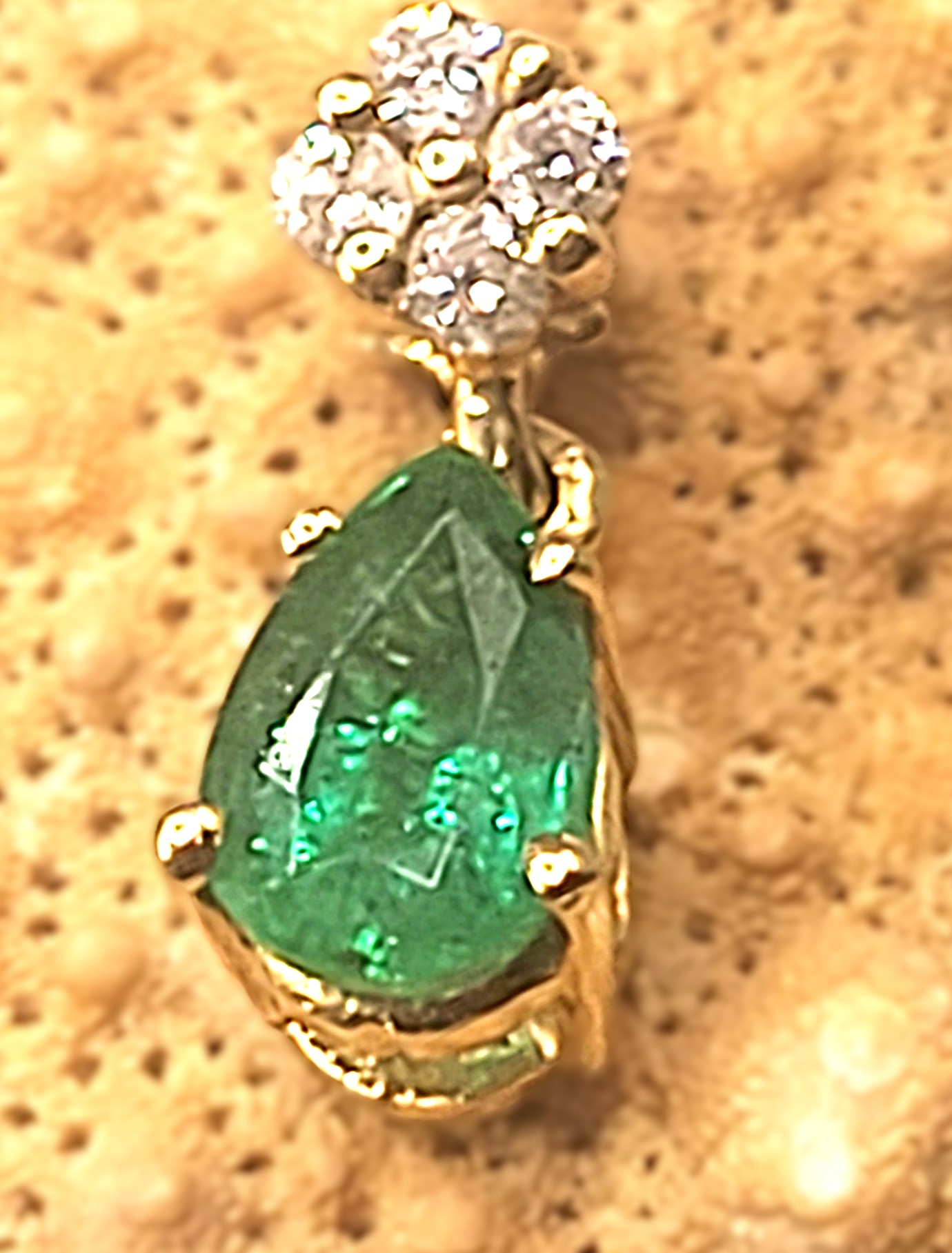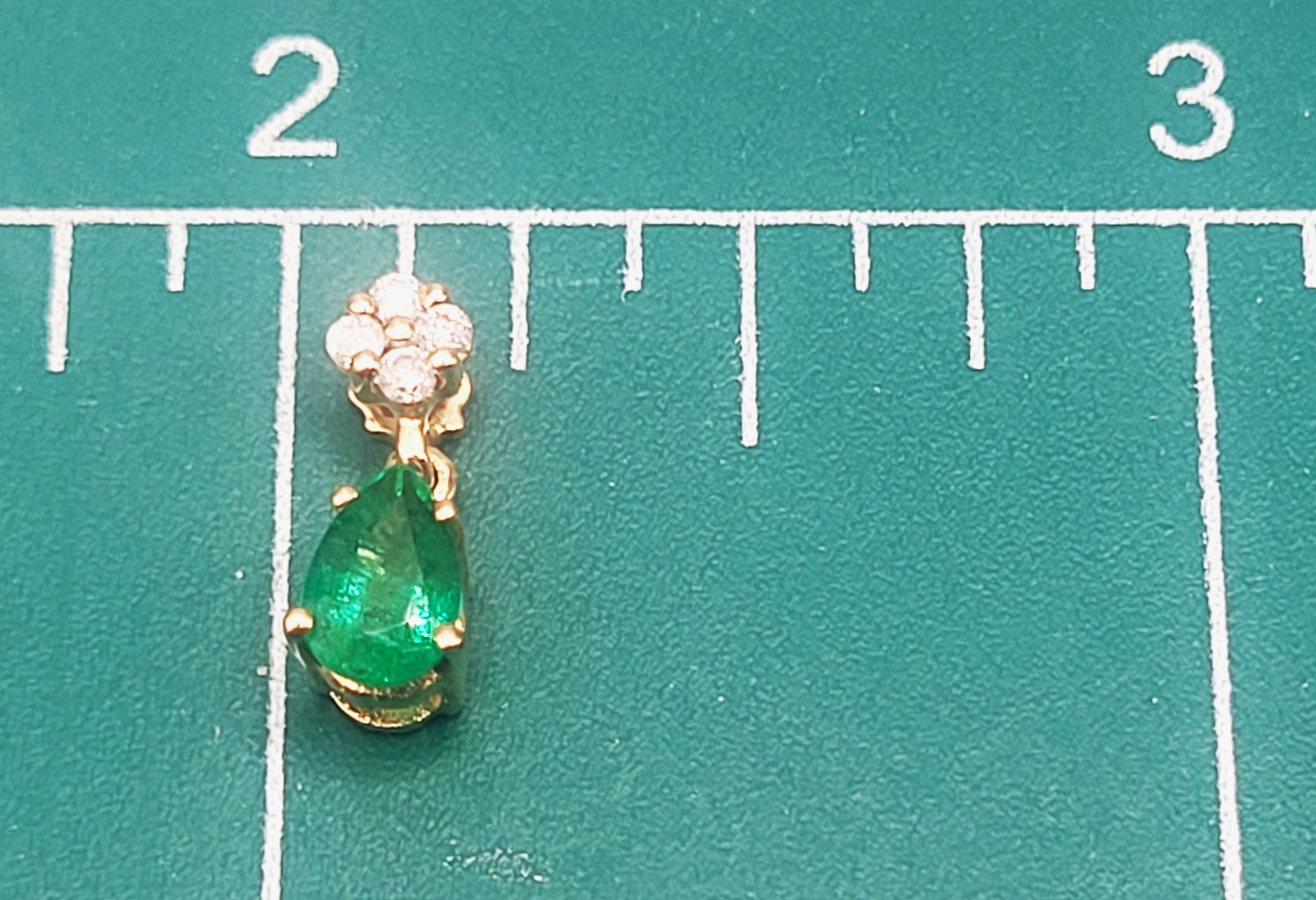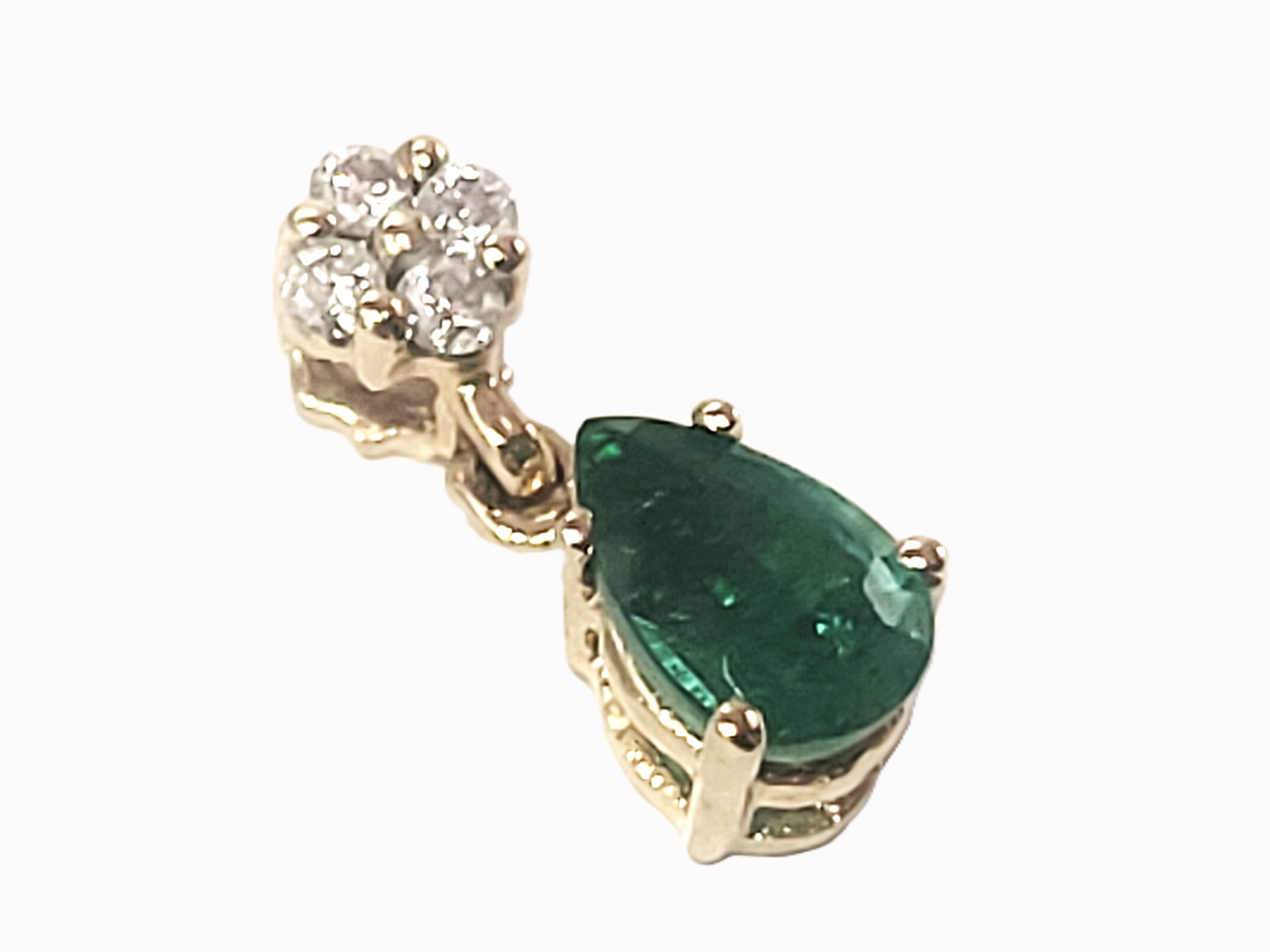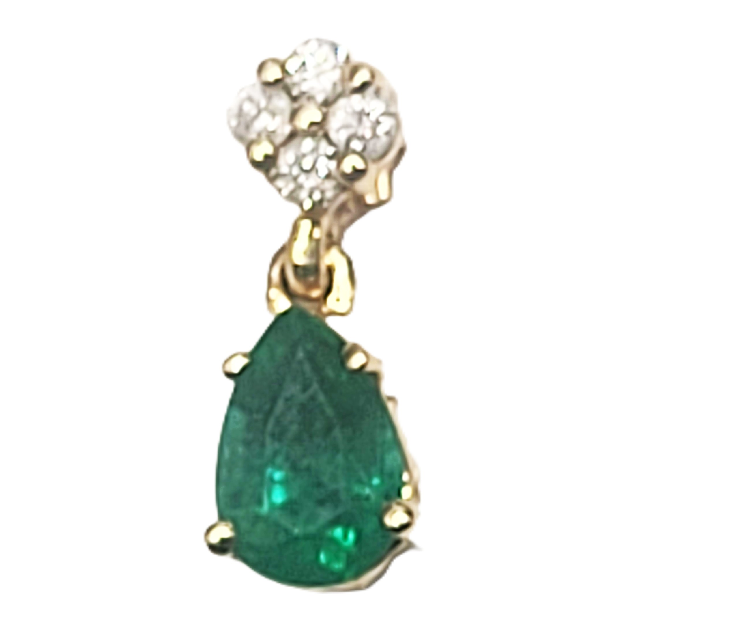This is a 14 karat yellow gold pendant that features an approximate .35 pear-cut , prong-set emerald that dangles below approximately .05 carats total weight of round, brilliant-cut, H-I color, SI2-I1 clarity diamonds. This pendant is approximately 1/2" long and has a hidden bail that can accommodate an approximate 2.5mm chain. Admin:33109/3ng