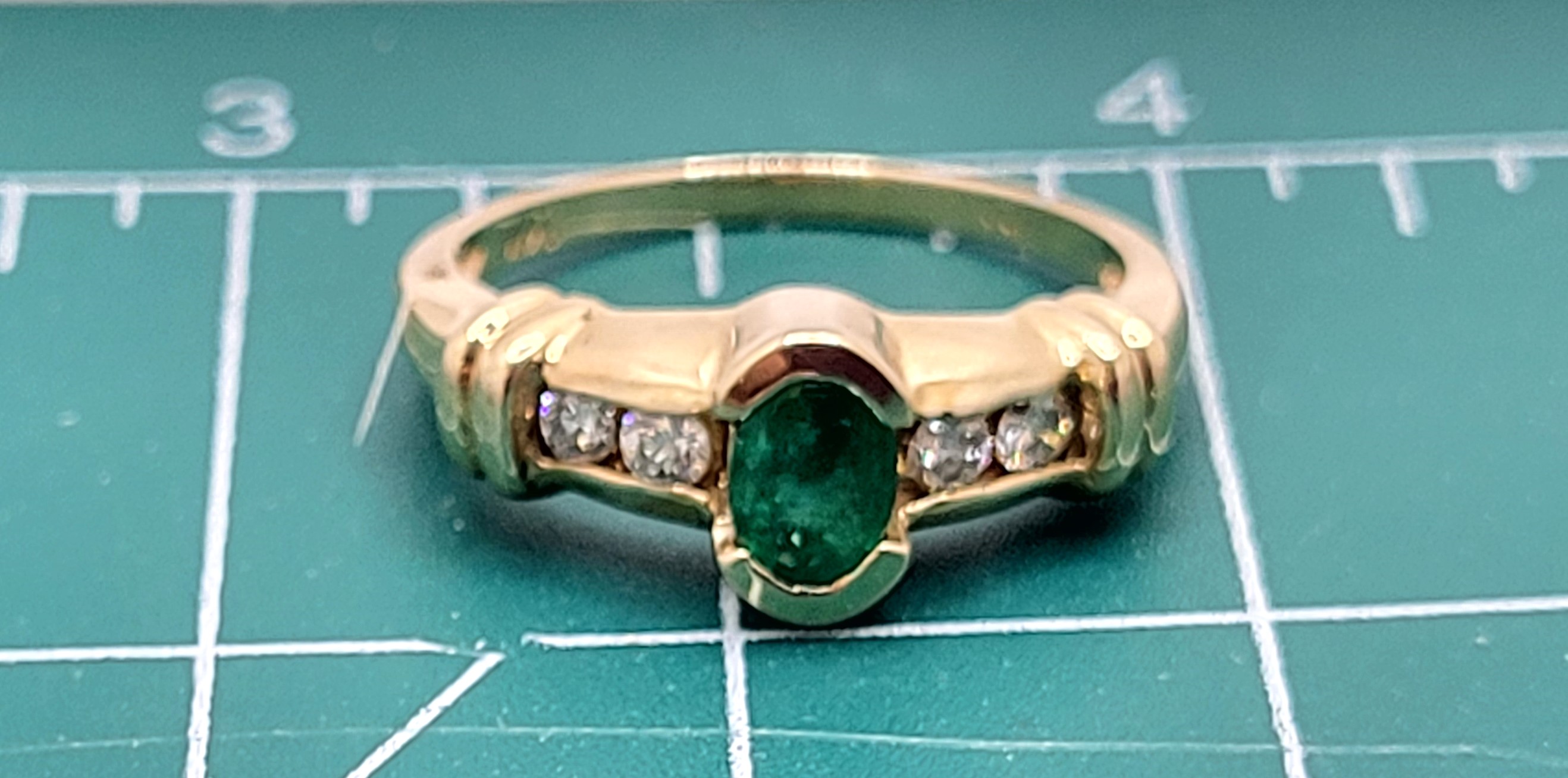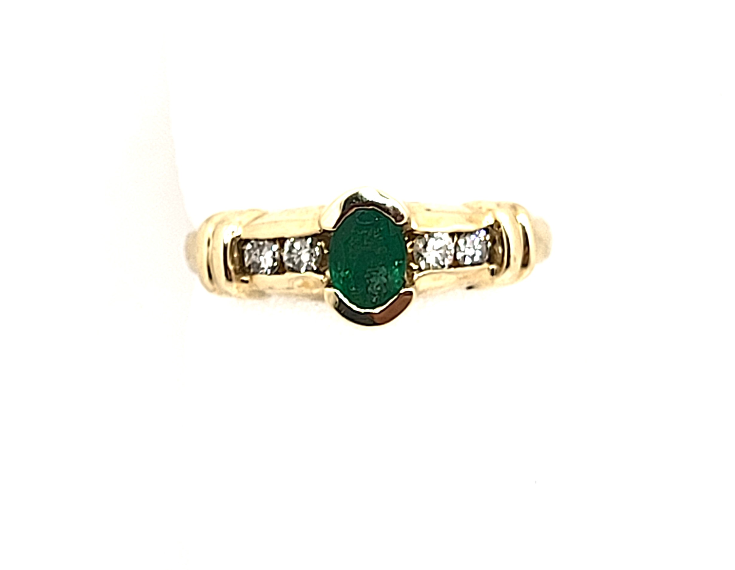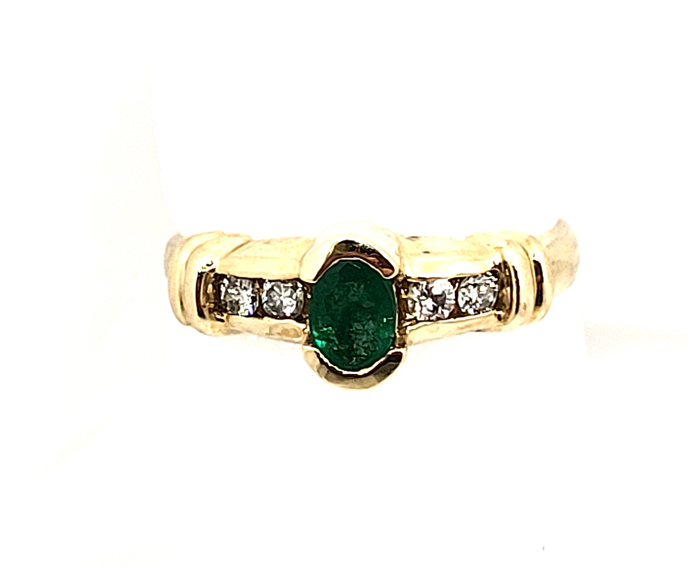This is a 14 karat yellow gold ring that features a .50 carat, oval-cut, semi-bezel set, genuine emerald and .19 carats of round, brilliant-cut, H, SI2, channel-set diamonds along the shoulders. The protection provided by the bezel and the channels, combined with the trendy ribbed shoulders, makes this ring ideal for everyday wear. This ring is US size 7. See below for details on sizing and other information. Admin: G11241/4ngt