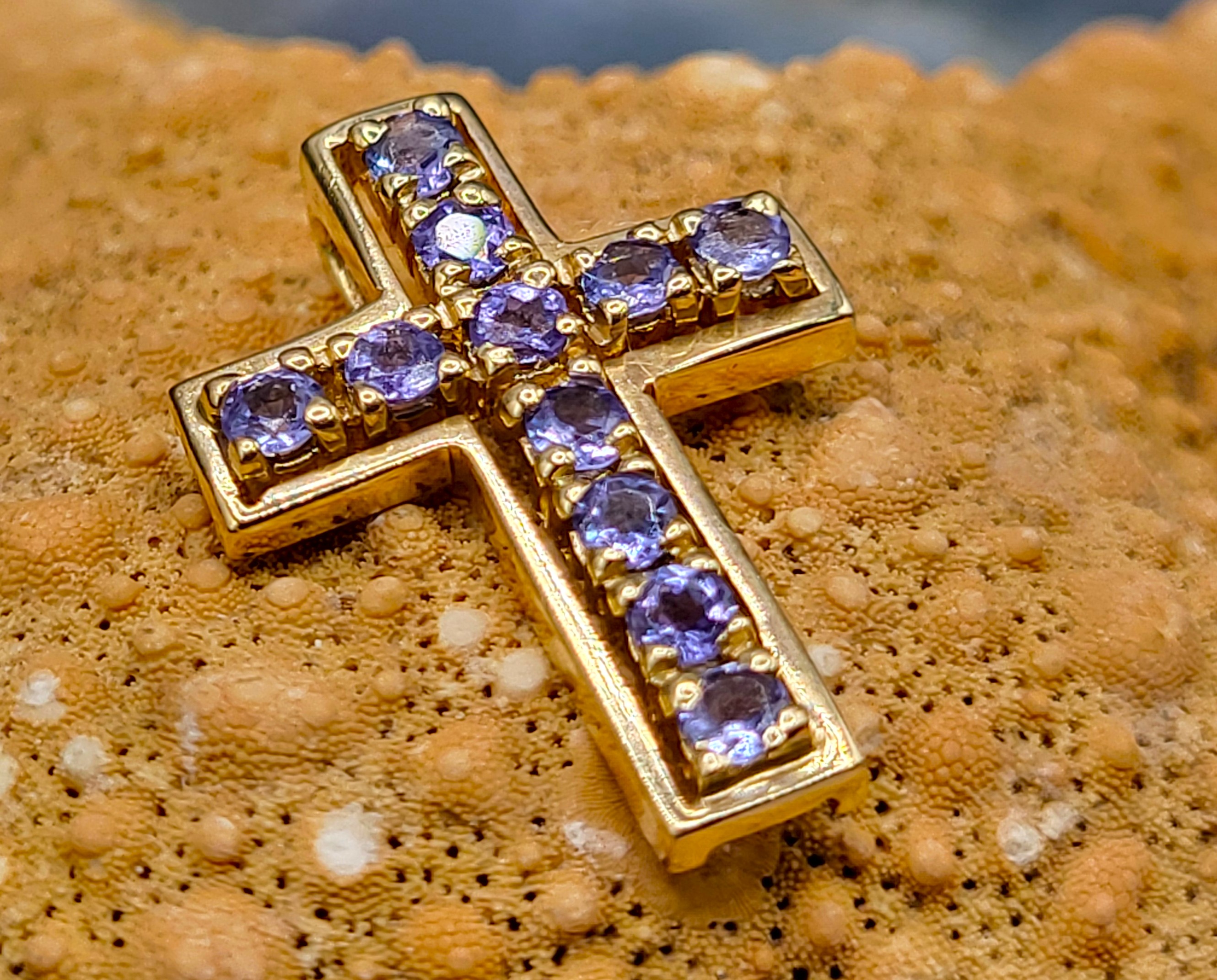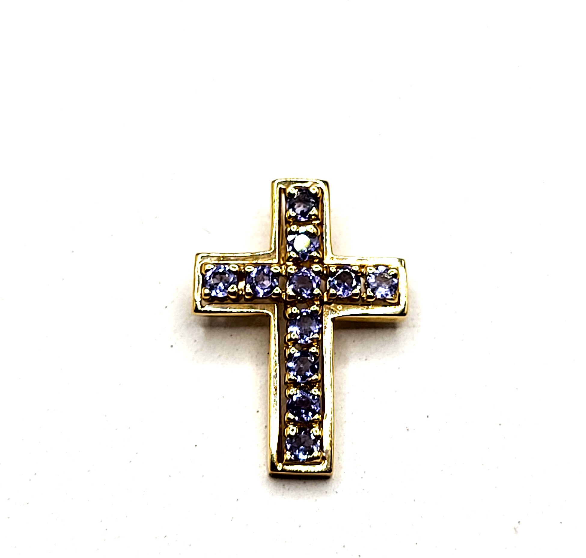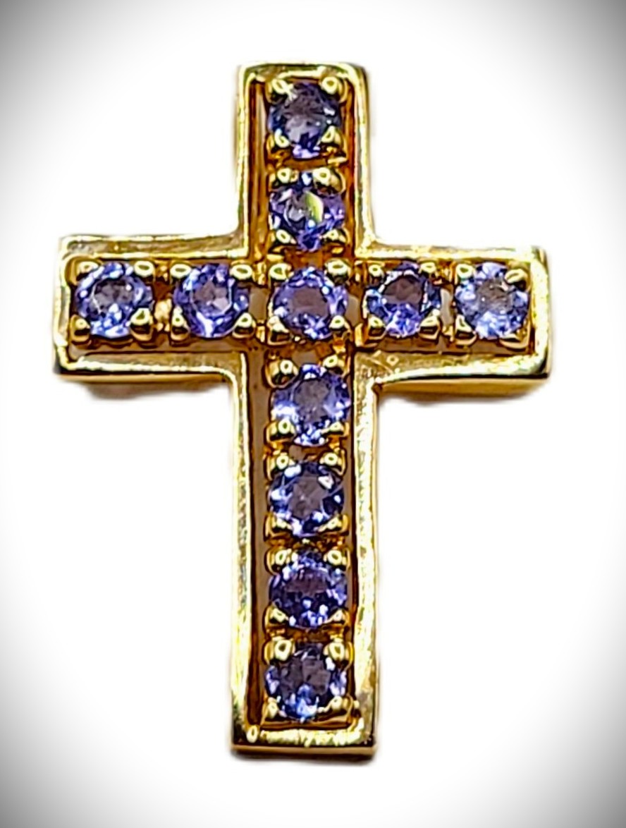 This 14 karat yellow gold pendant features .64 carats total weight of round, faceted, genuine purple tanzanite. The cross is approximately 7/8" long, 3/16" wide, and 1.75mm thick with a hidden rabbit ear bail to create a slide style pendant. The bail can accommodate up to an approximate 3mm thick chain. This is a brand new item approved by the manufacturer for sale to the public, by auction. It is in excellent condition, but may have fine scratches from shipping or storage. Admin: G11241/20btt