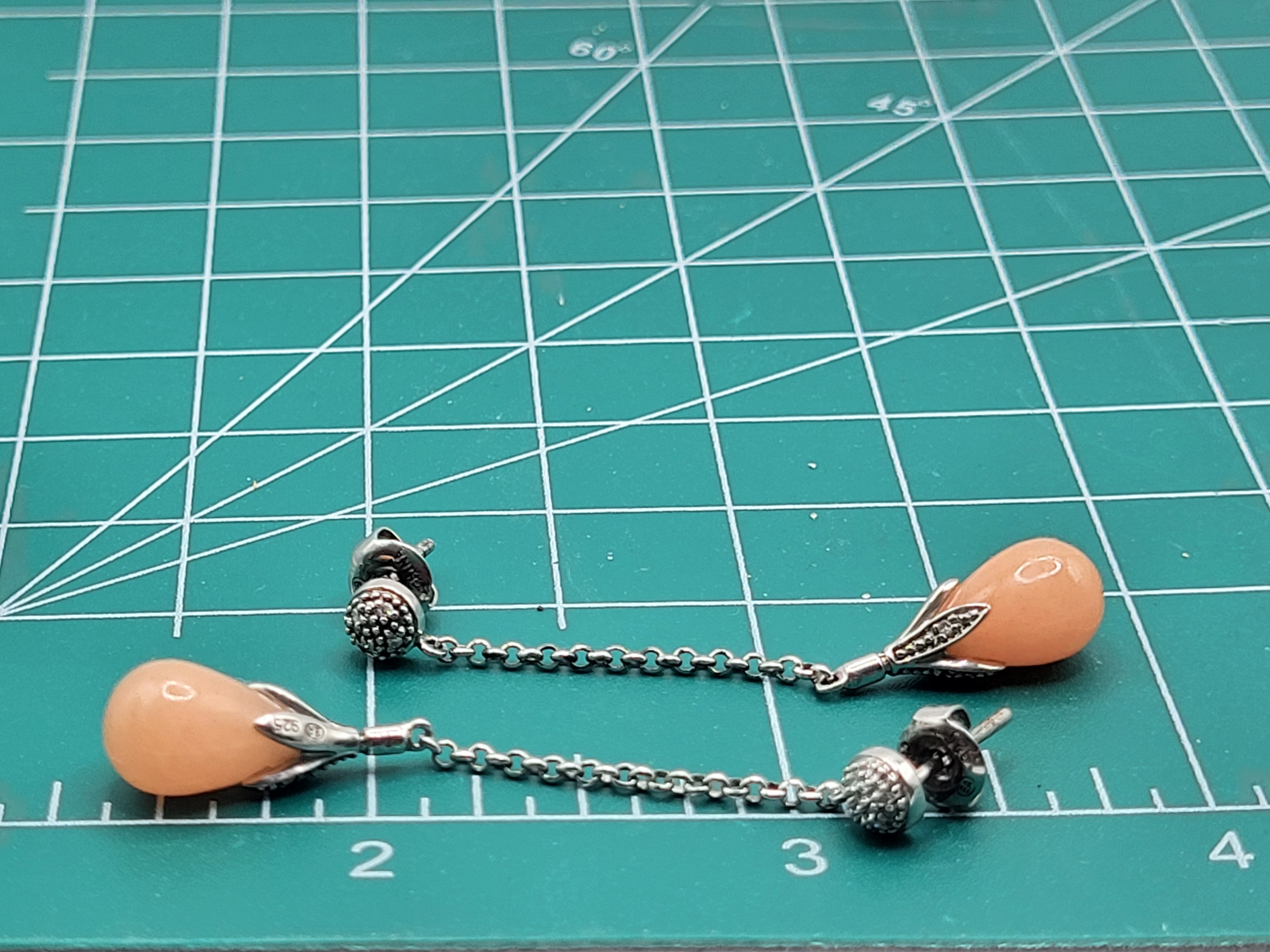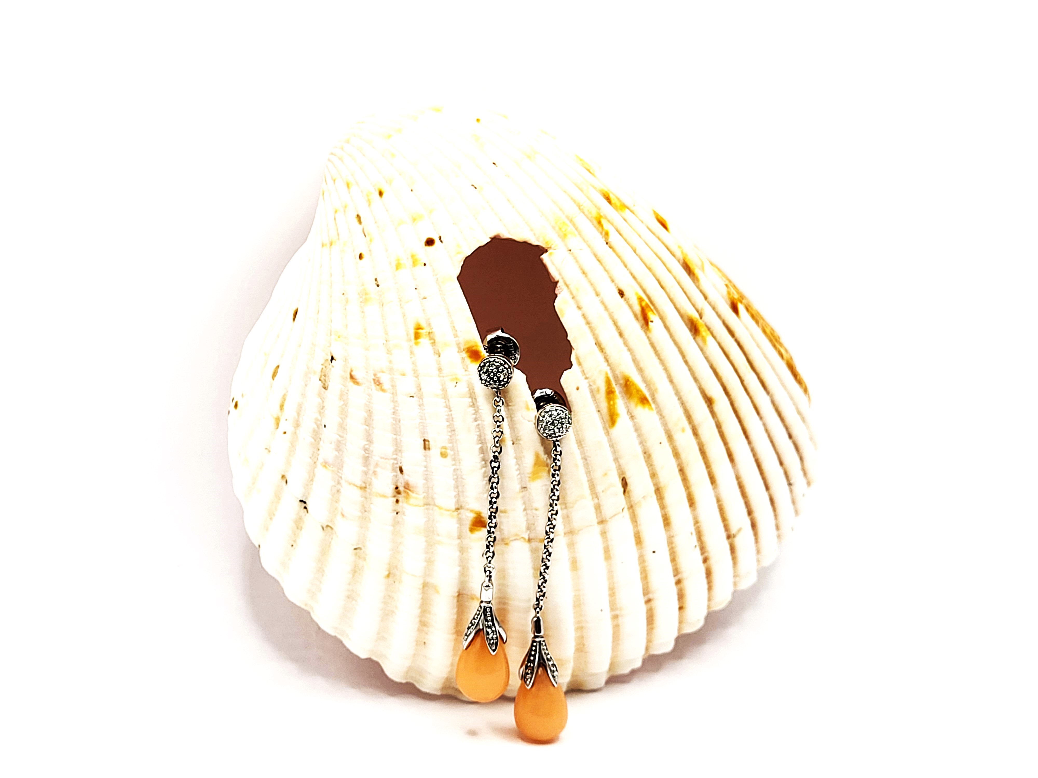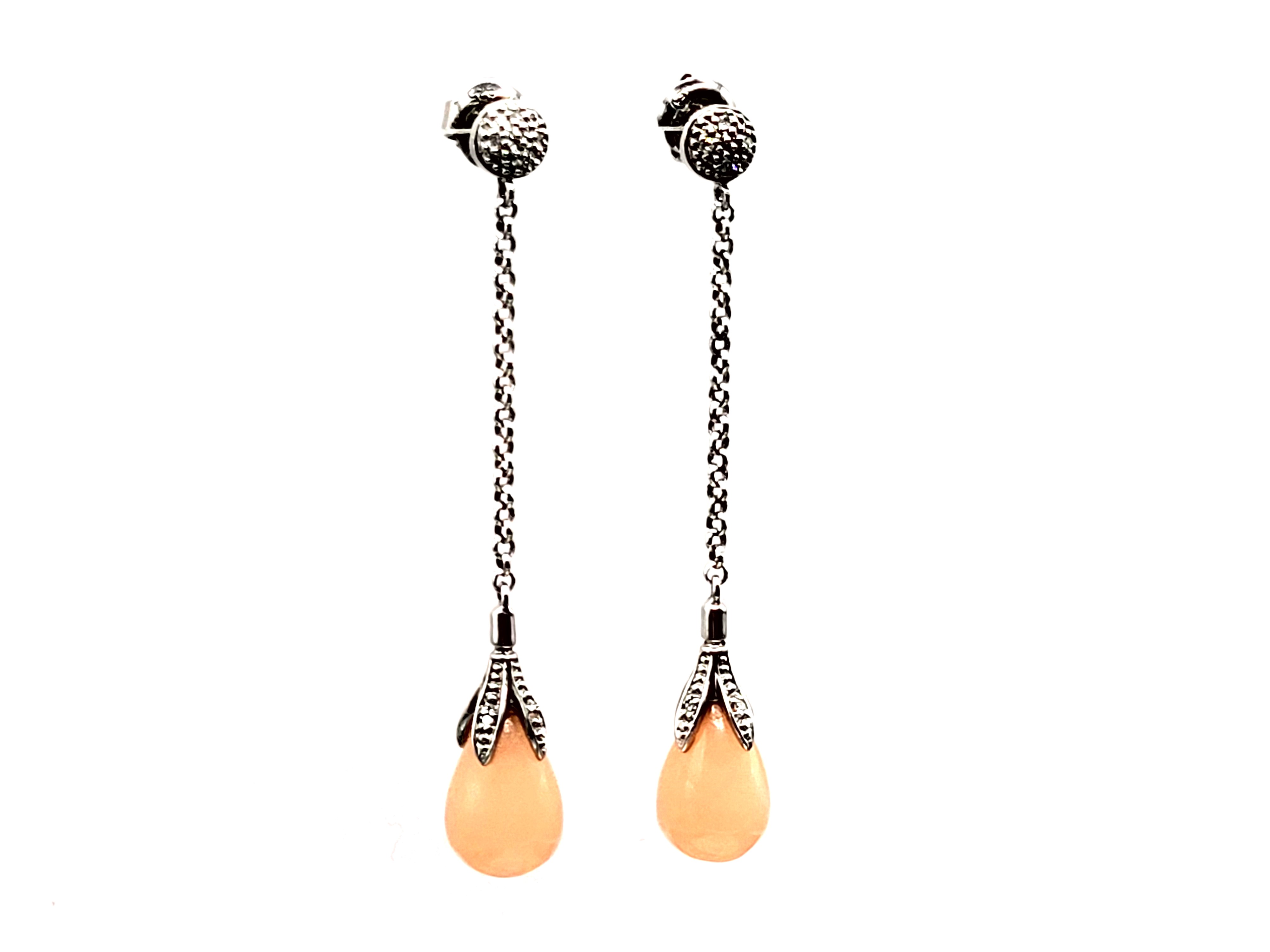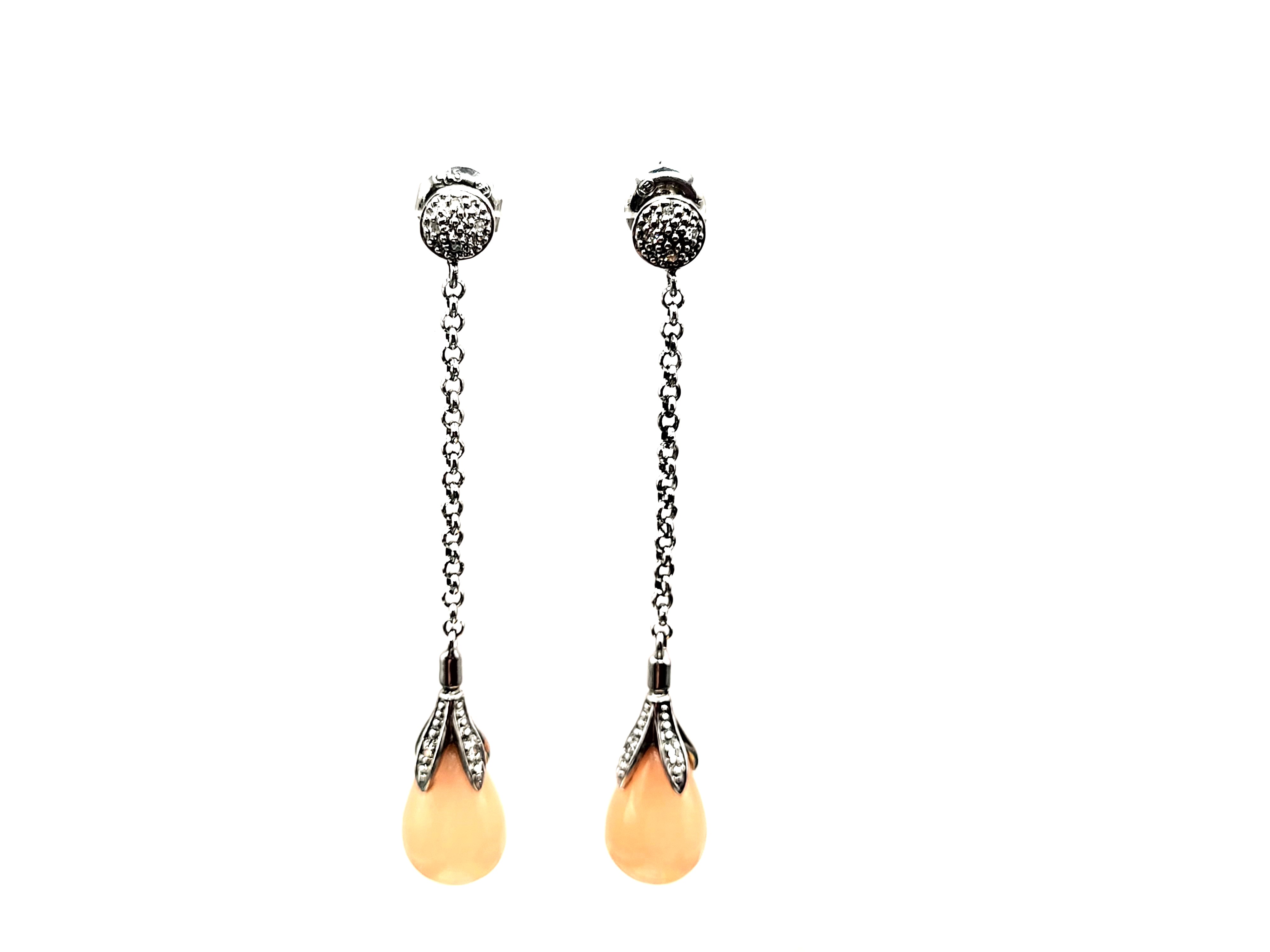 This pair of sterling silver earrings features a lustrous set of polished, peach jadeite stones and accent diamonds. The jadeite drops measure approximately 8mm x 12mm. A fine sterling silver rolo link chain connects the peach jadeite and floral cap to a diamond accented small button on the earlobe. The earrings dangle approximately 2" and attach with posts and friction backs. Admin: 33122/4g