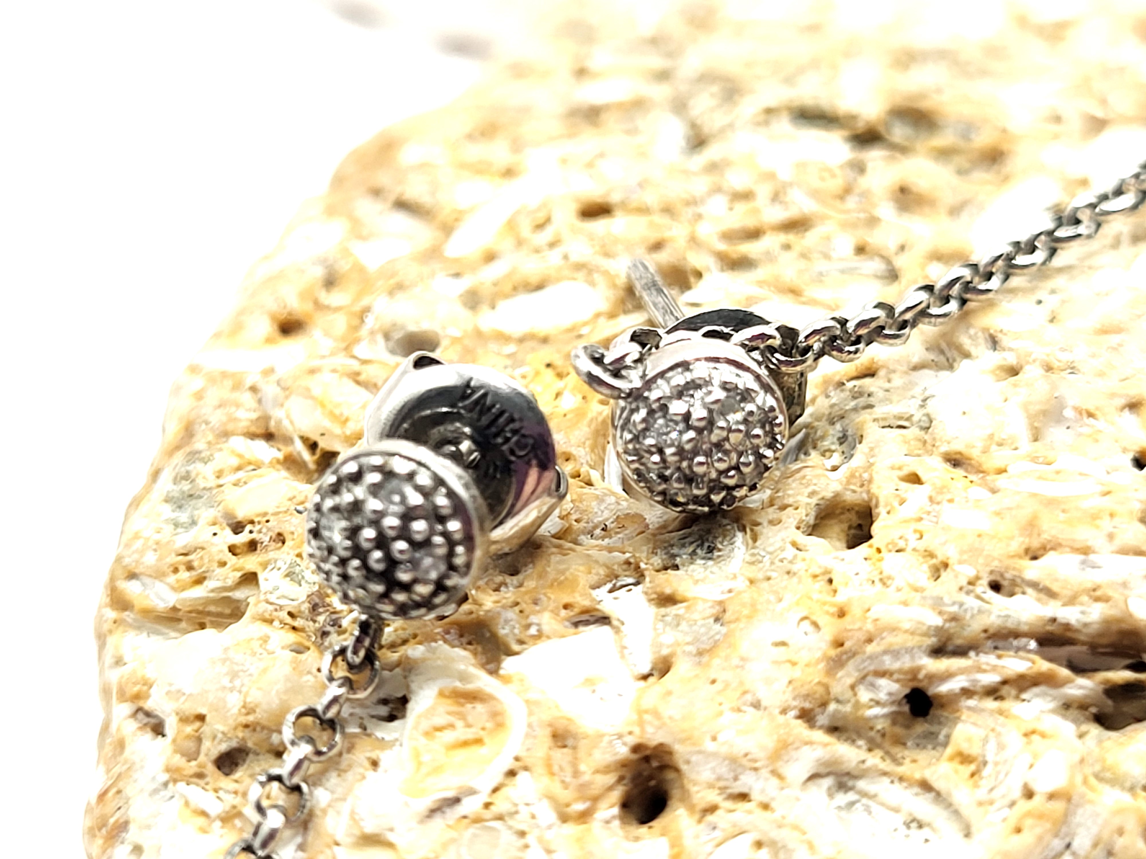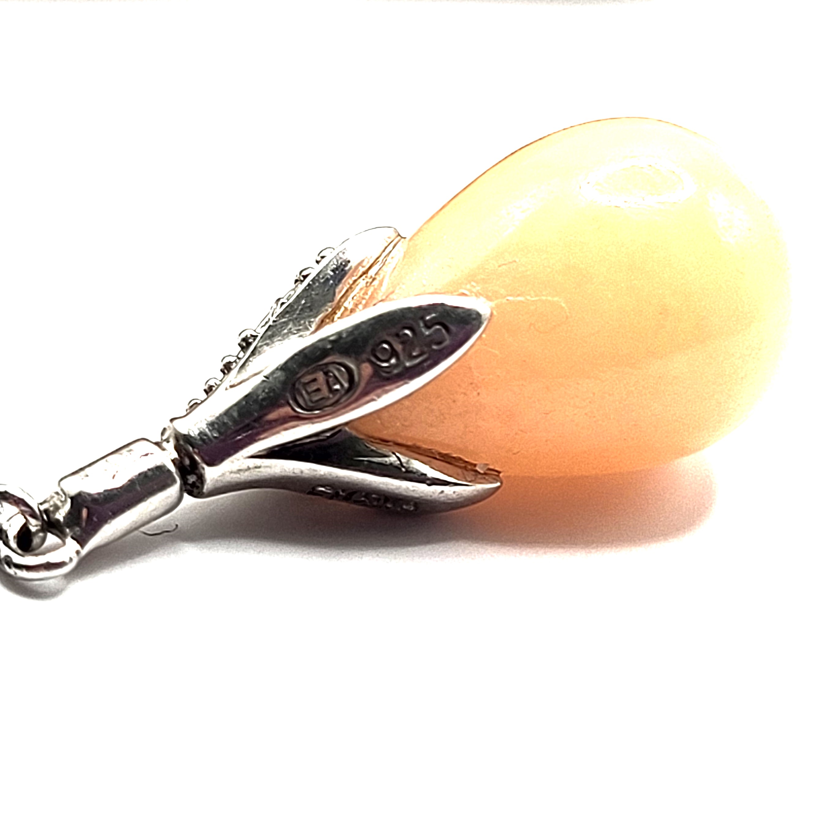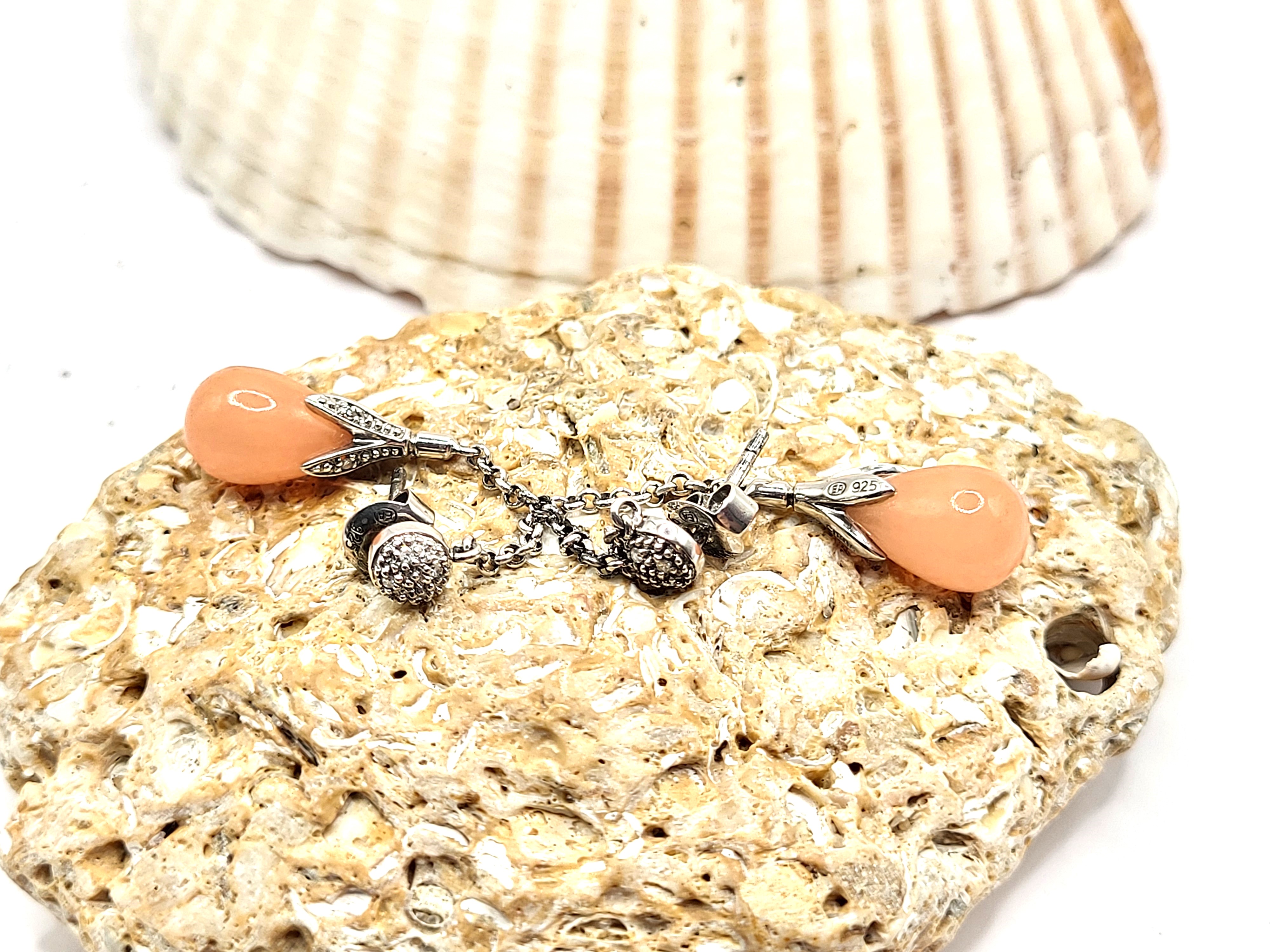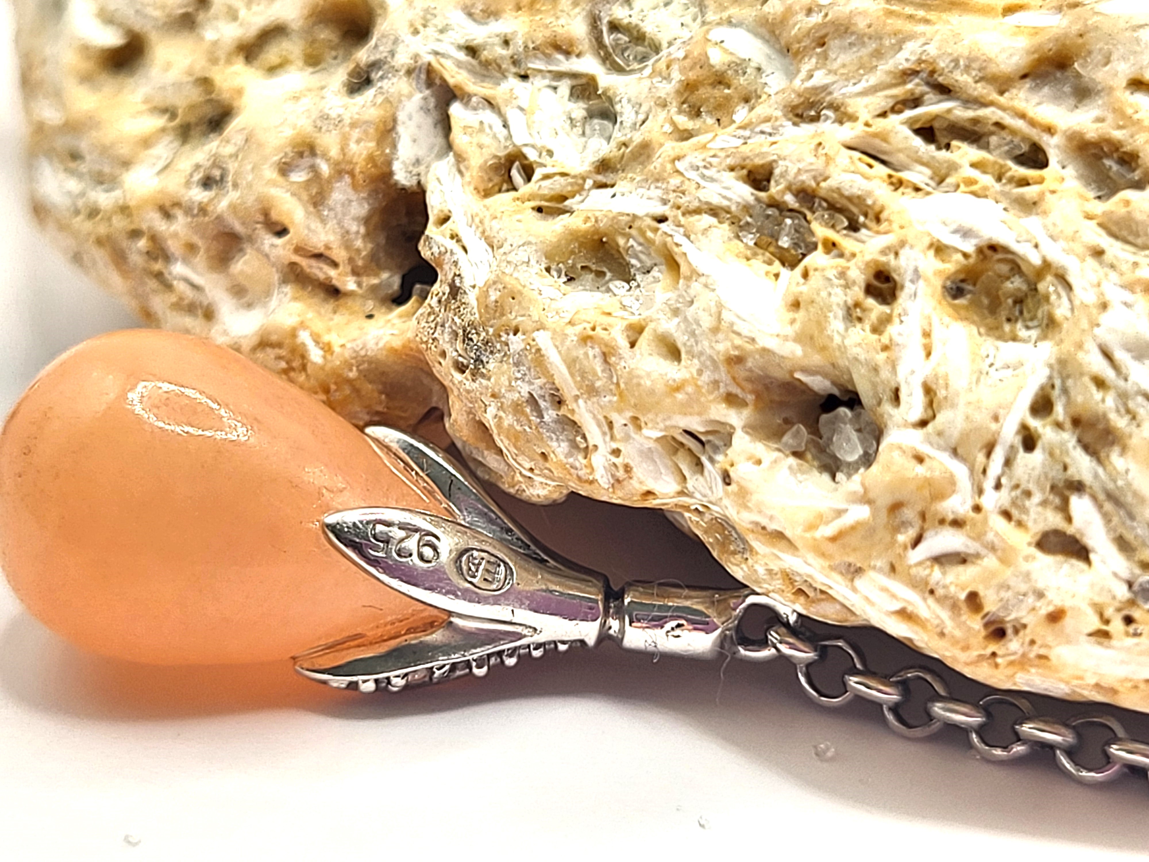 This pair of sterling silver earrings features a lustrous set of polished, peach jadeite stones and accent diamonds. The jadeite drops measure approximately 8mm x 12mm. A fine sterling silver rolo link chain connects the peach jadeite and floral cap to a diamond accented small button on the earlobe. The earrings dangle approximately 2" and attach with posts and friction backs. Admin: 33122/4g