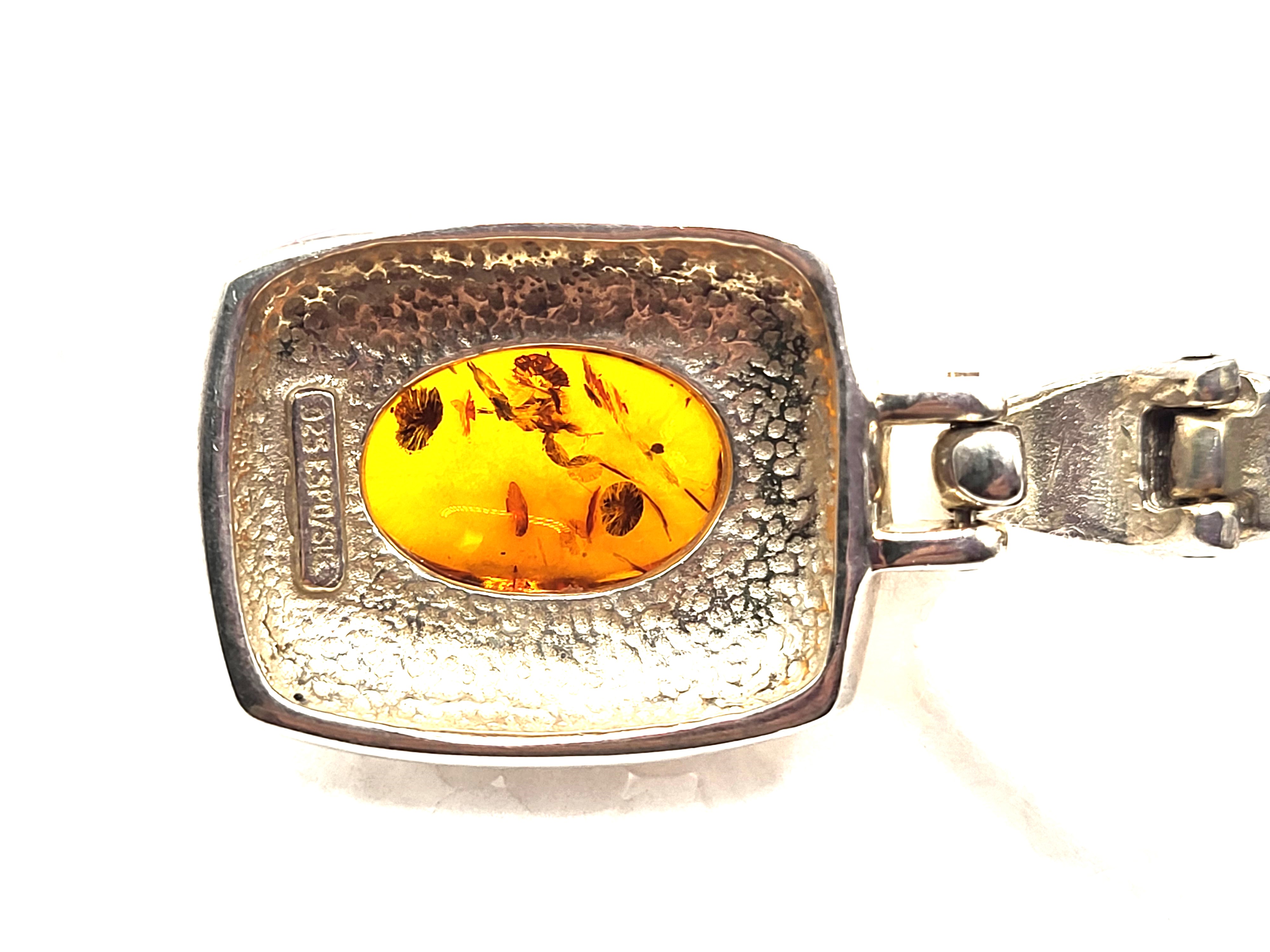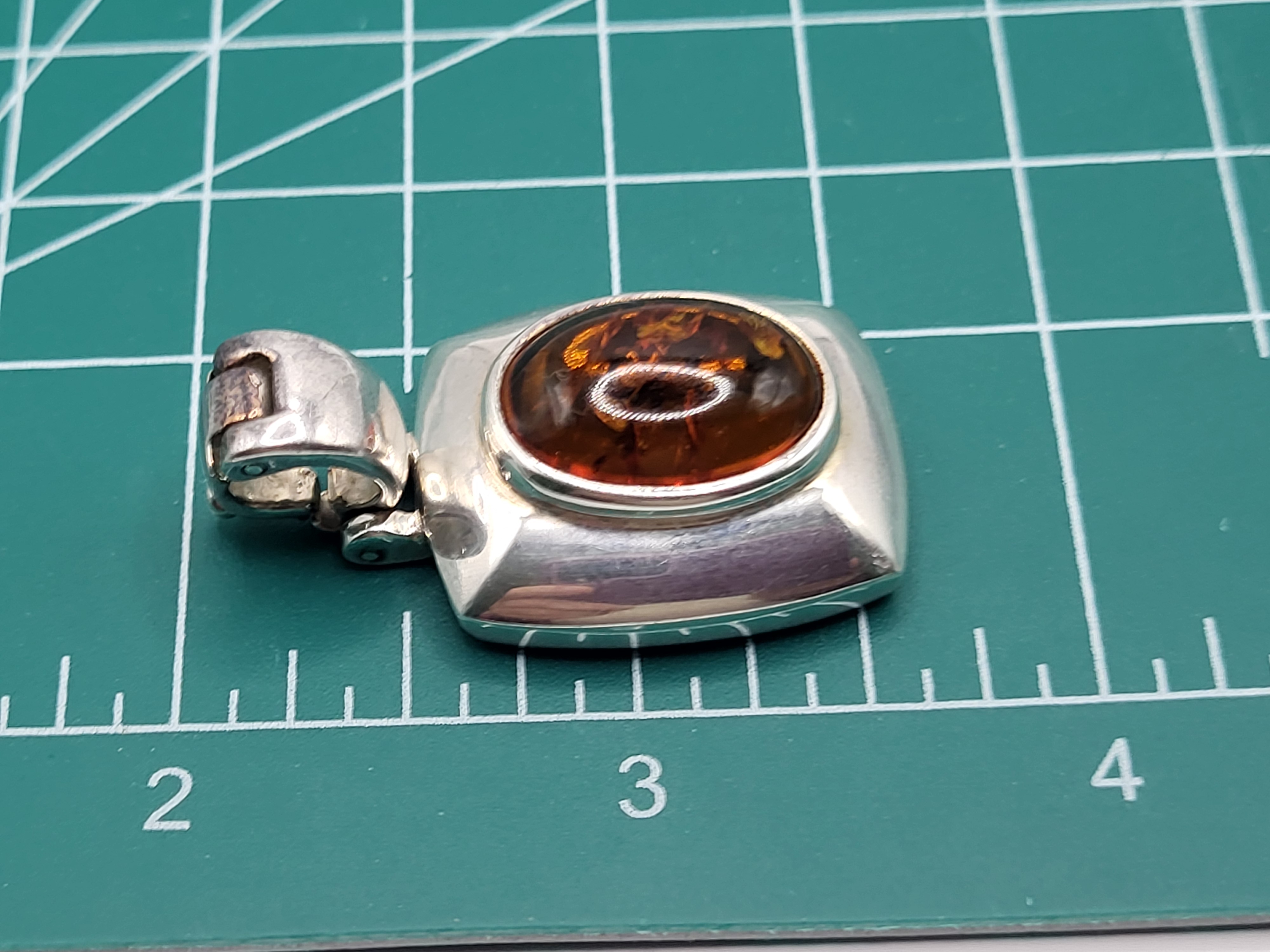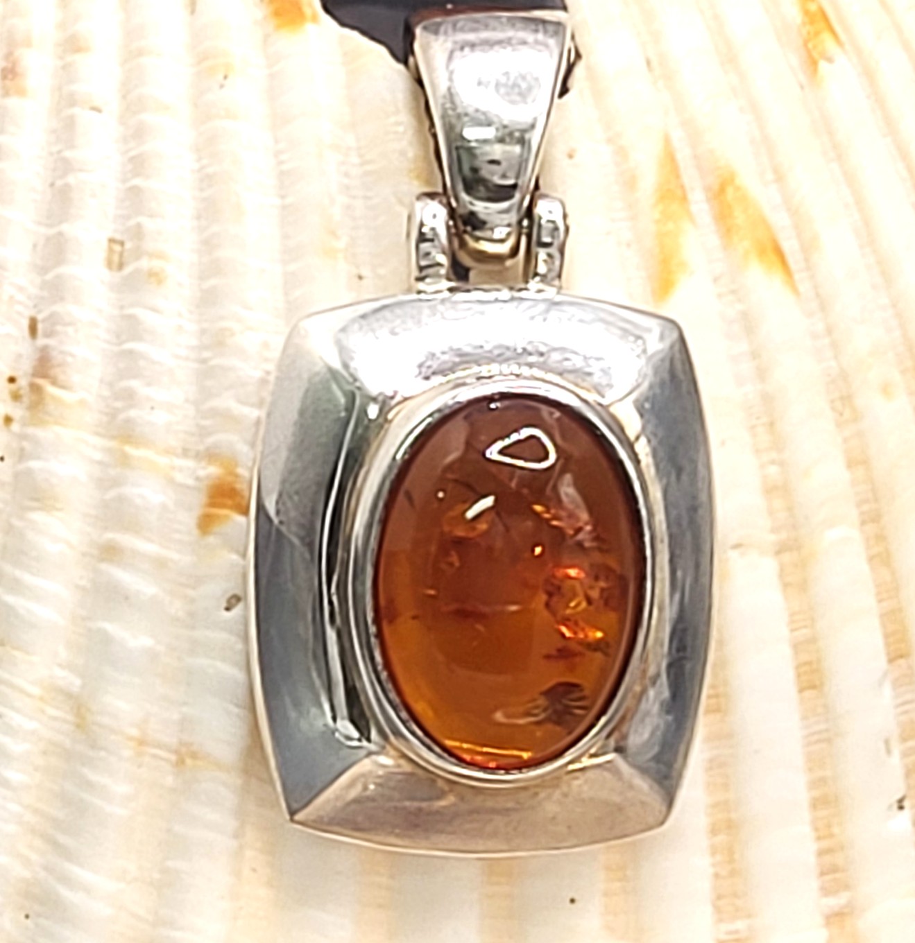 This sterling silver pendant features an approximate 18mm x 12mm, oval, cabochon, polished, bezel-set Amber with a wide, cushion-shaped, polished, sterling silver frame. The hinged bail can accommodate an approximate 6.5mm thick chain, and it opens to accommodate a pearl or bead strand style necklace. The pendant measures approximately 1.25" long x 1" wide. *Authenticity tests on the amber are listed below. Admin: K26237/hh