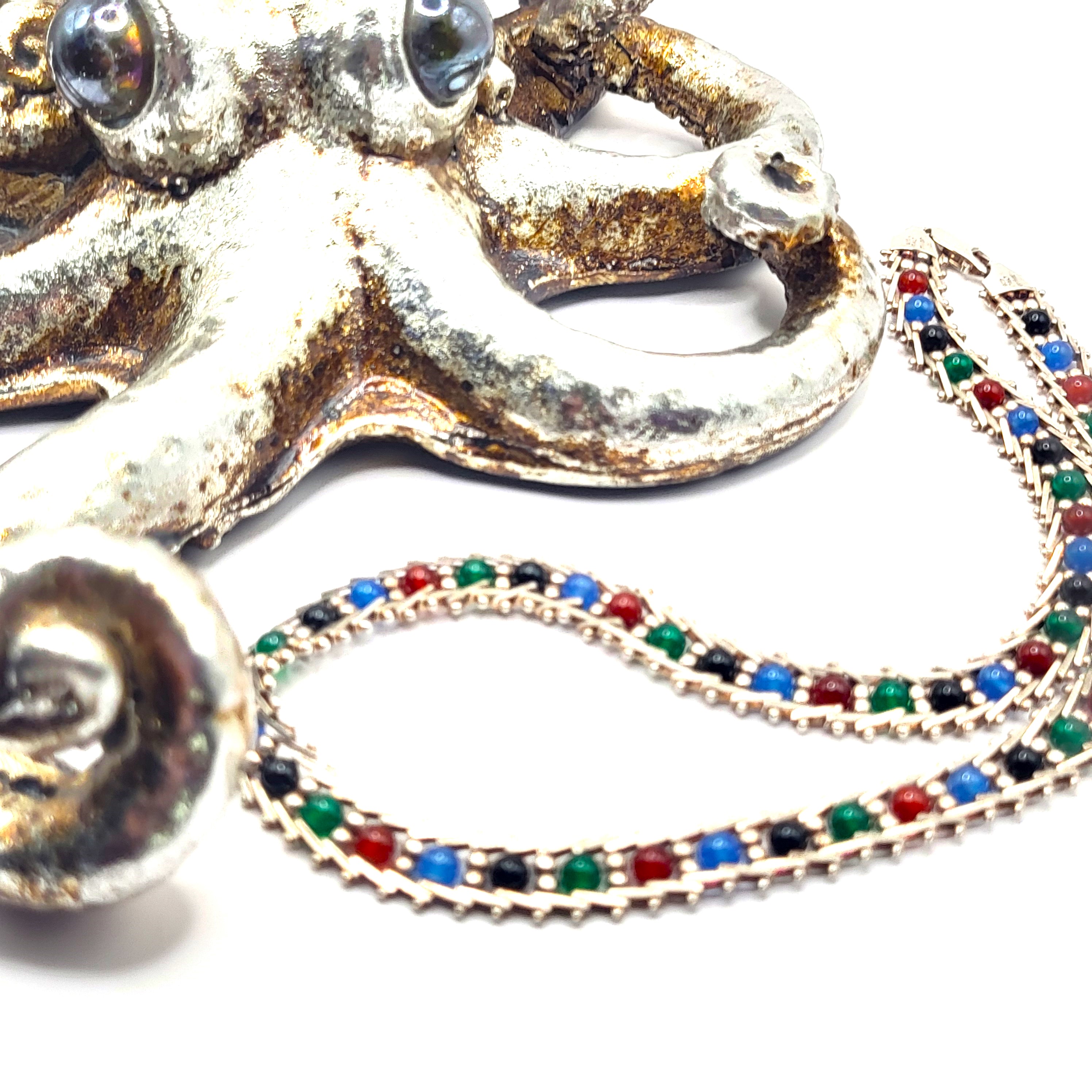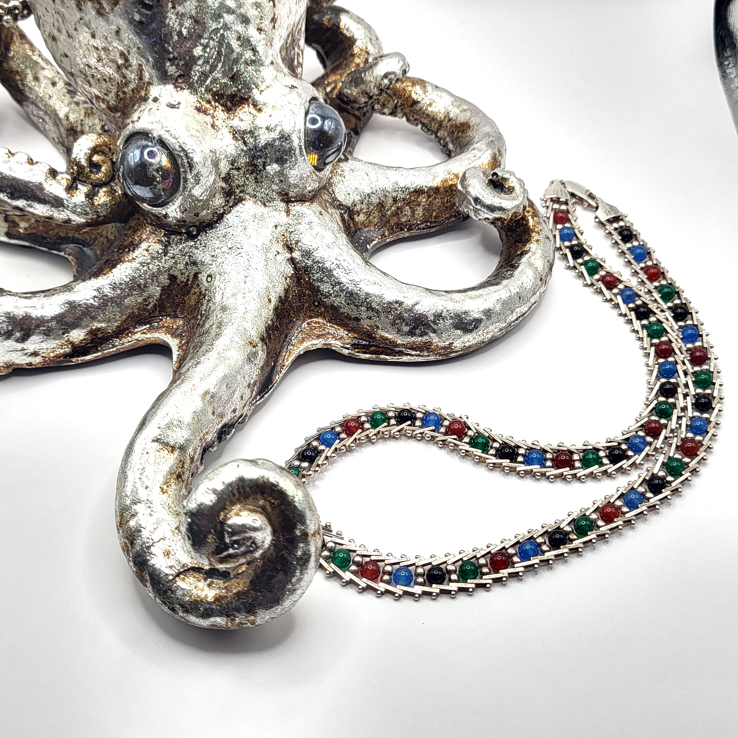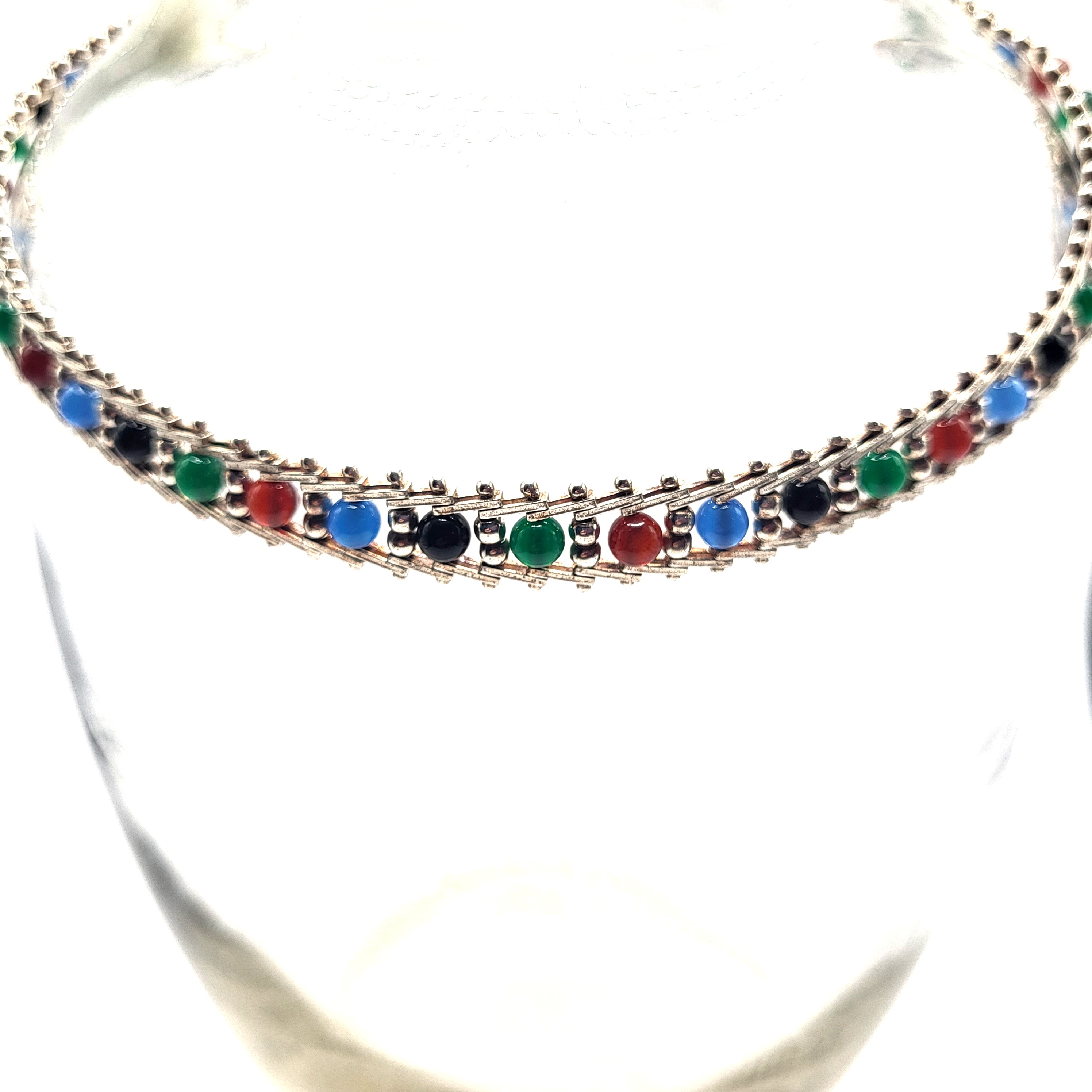This beautiful necklace by Milor, a well-known Italian jewelry company, is made of Italian sterling silver and displays an array of color in onyx: black, red, green, and blue. The onyx beads are approximately 4.25mm and the center of each riveted link, separated by 2.5mm beads. The necklace is approximately 17" long and 9.75mm wide, with a lobster clasp. The Milor hallmark is on one of the end caps. Admin: 33120/24lr