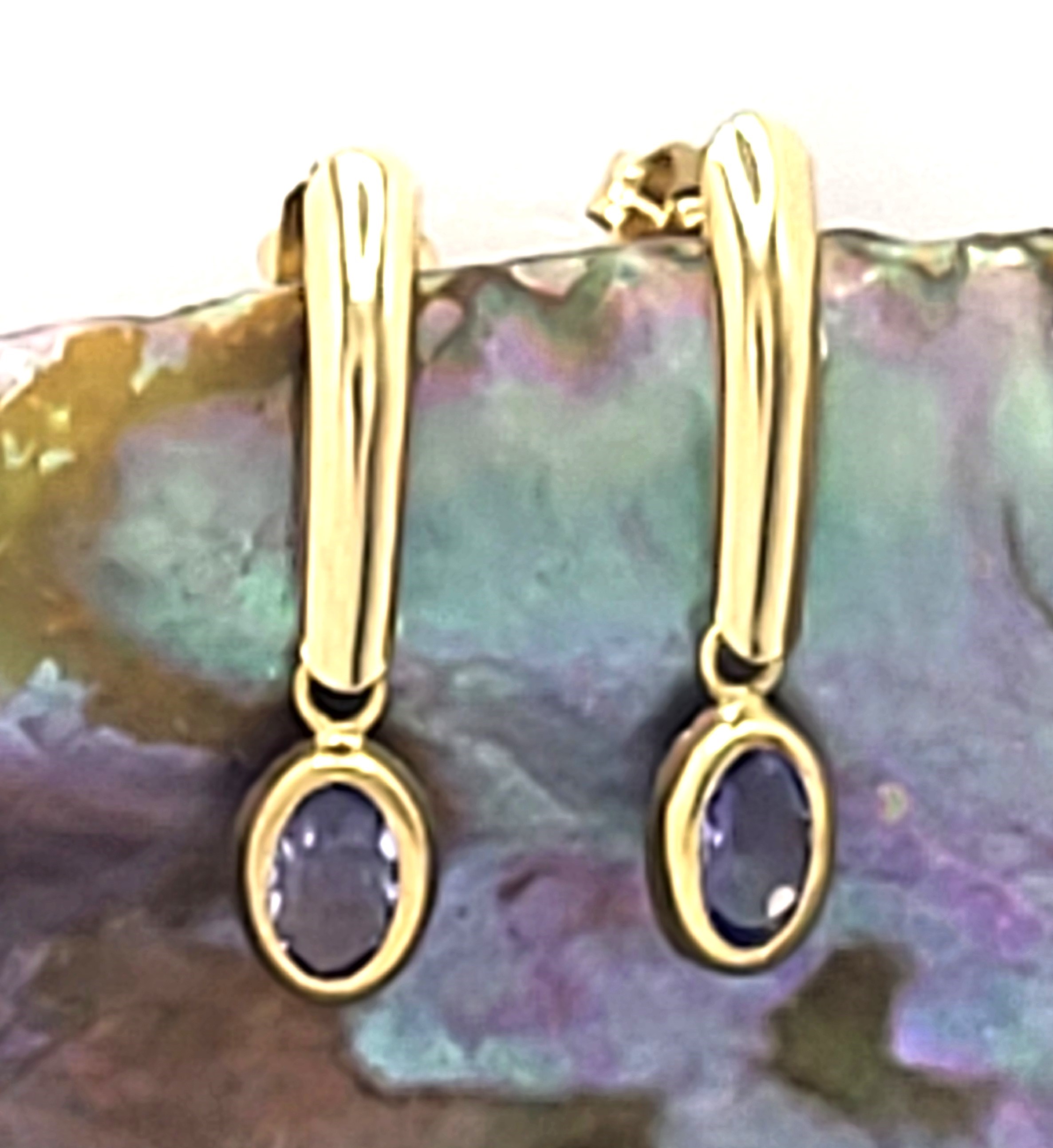 This is a pair of 14 karat yellow gold earrings that feature .90 carats total weight of oval-cut, bezel-set, genuine tanzanite and hang approximately 3/4". The earrings attach to the earlobe with posts and friction backs.  Admin: G11241/32blt