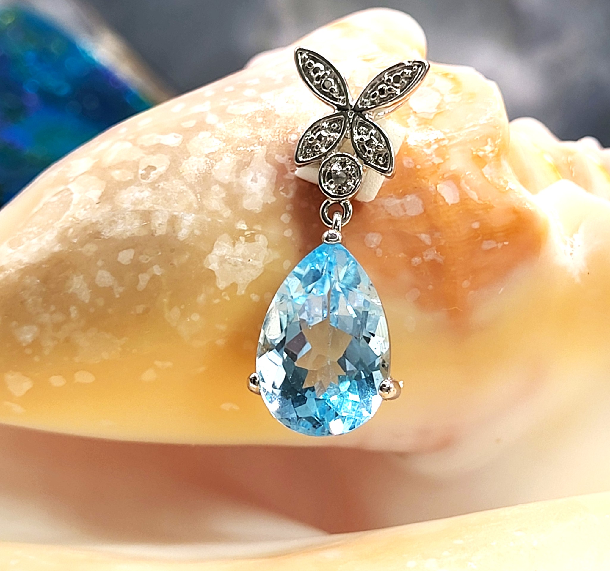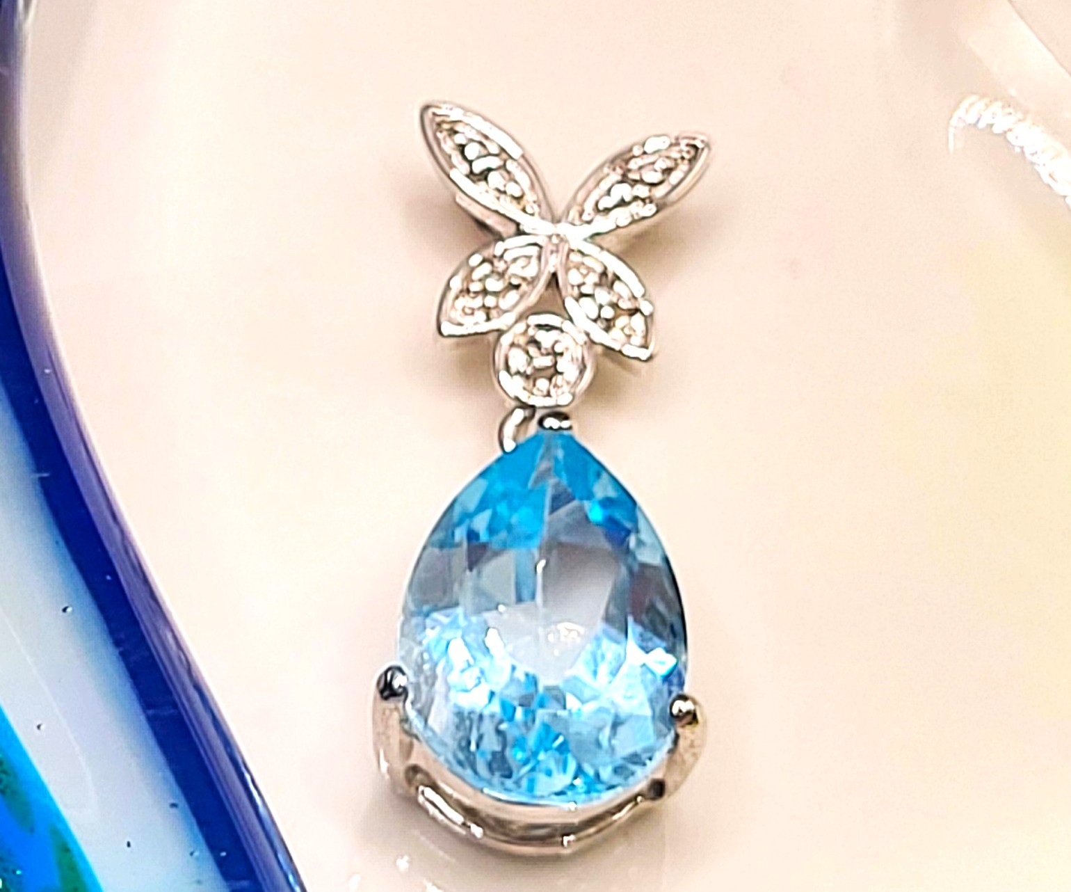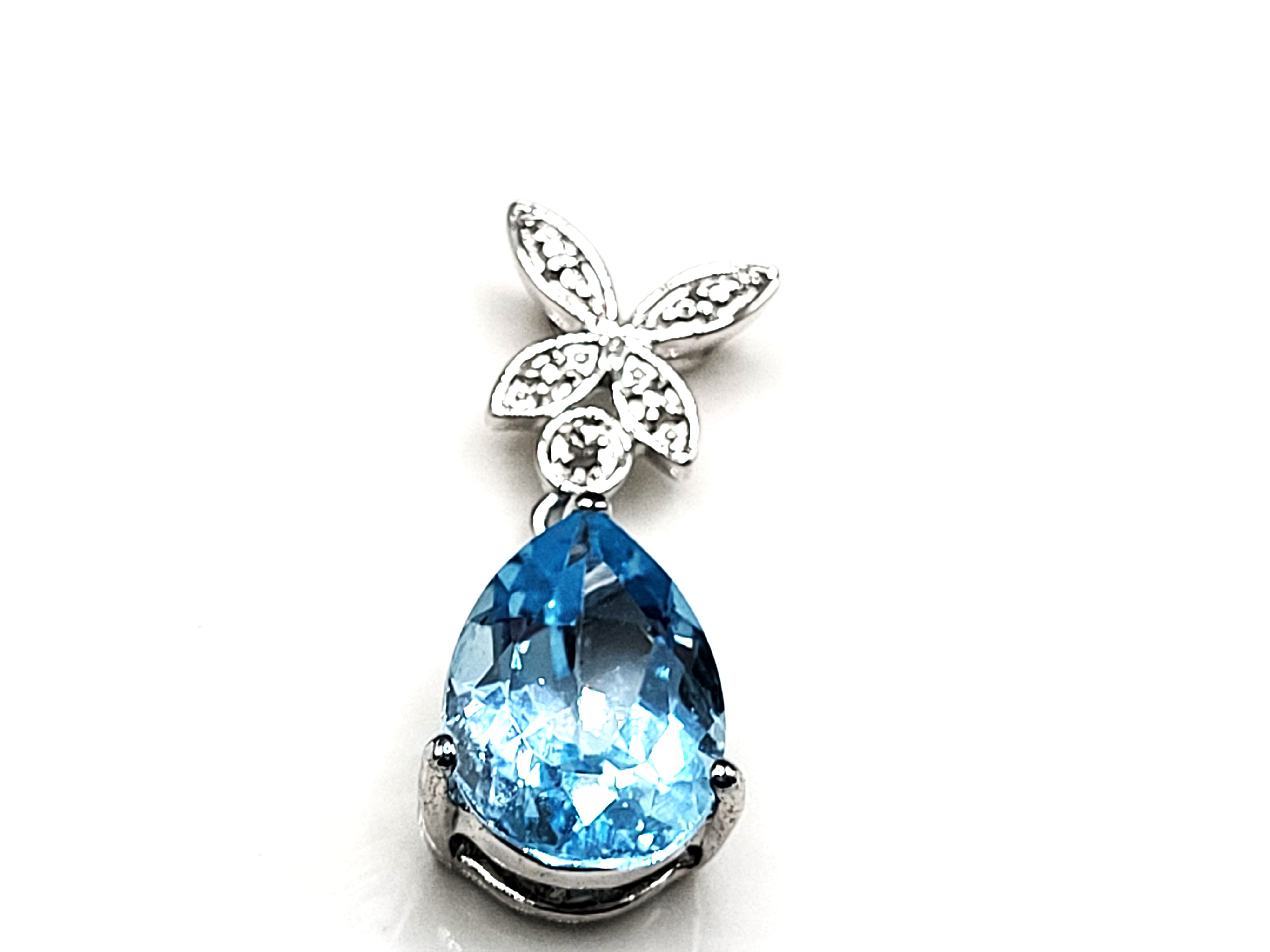This STERLING SILVER pendant features an approximate 7.00 carat pear-cut, genuine prong-set blue topaz with a color between Sky Blue and Swiss Blue. This teardrop-shaped blue topaz dangles by jump rings from beneath the butterfly bail and has a small, polished accent diamond. The hidden bail (behind the butterfly) can accommodate an approximate 2.5mm chain. This pendant bears the hallmark "DBJ", possibly for Jasco Designs Inc, New York, since around 1990.