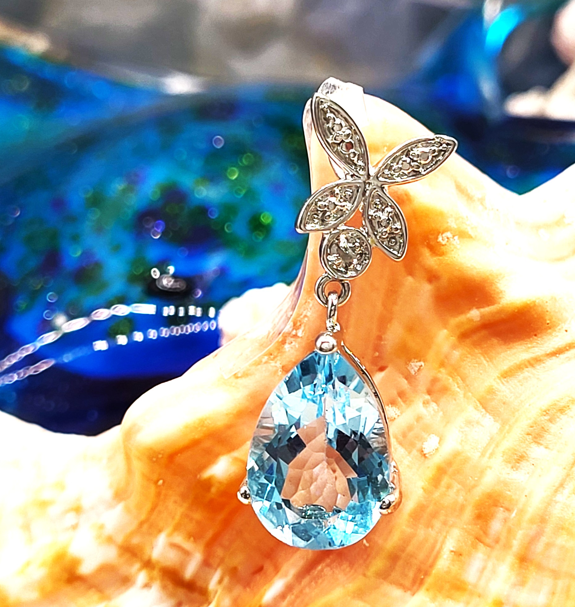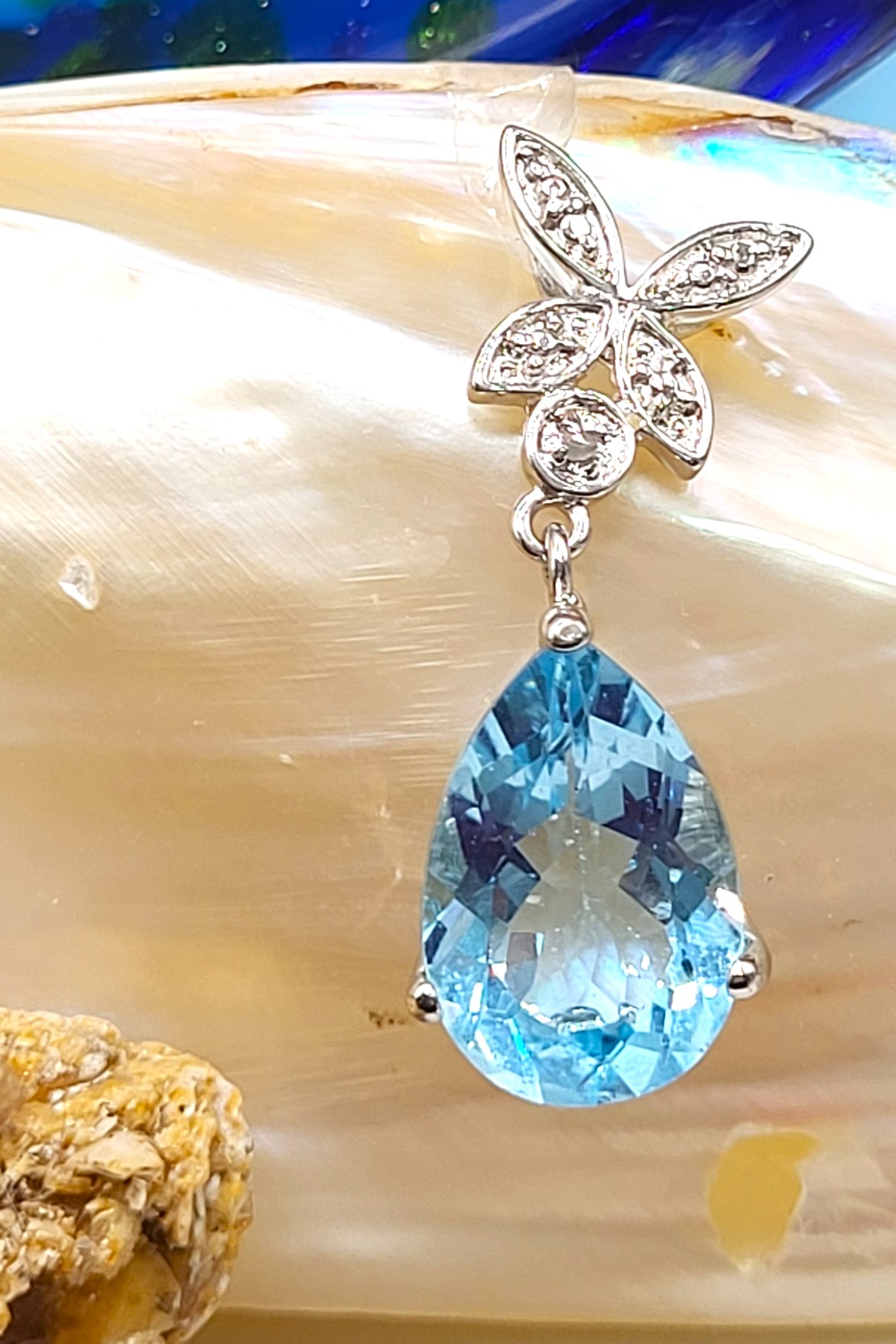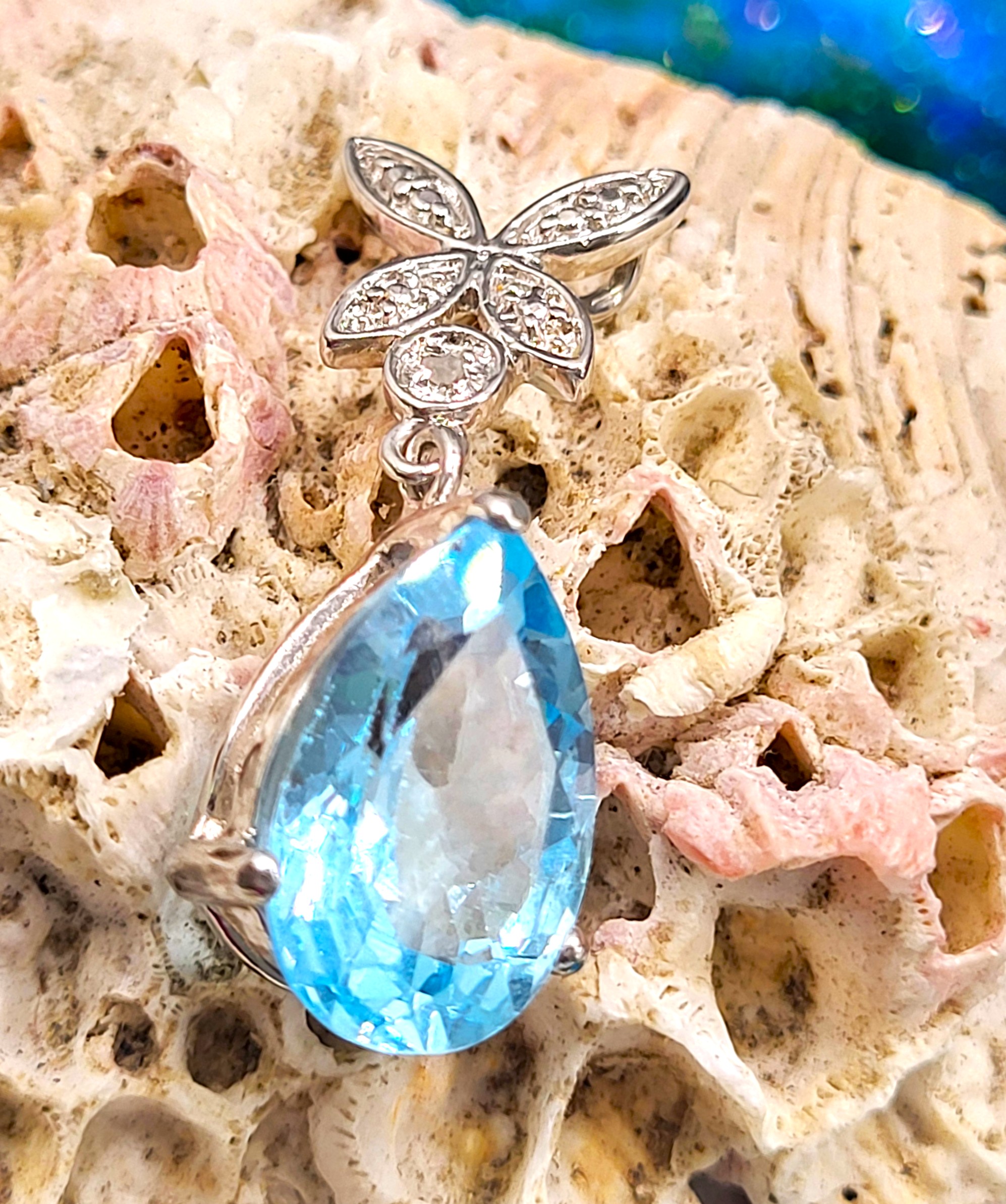 This STERLING SILVER pendant features an approximate 7.00 carat pear-cut, genuine prong-set blue topaz with a color between Sky Blue and Swiss Blue. This teardrop-shaped blue topaz dangles by jump rings from beneath the butterfly bail and has a small, polished accent diamond. The hidden bail (behind the butterfly) can accommodate an approximate 2.5mm chain. This pendant bears the hallmark "DBJ", possibly for Jasco Designs Inc, New York, since around 1990.