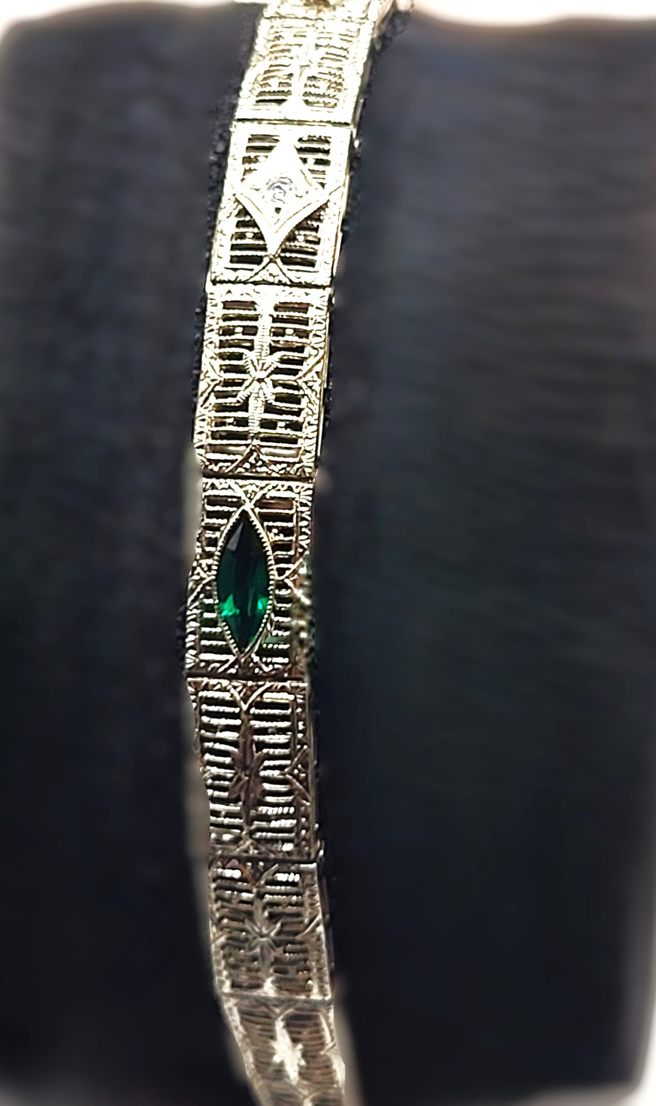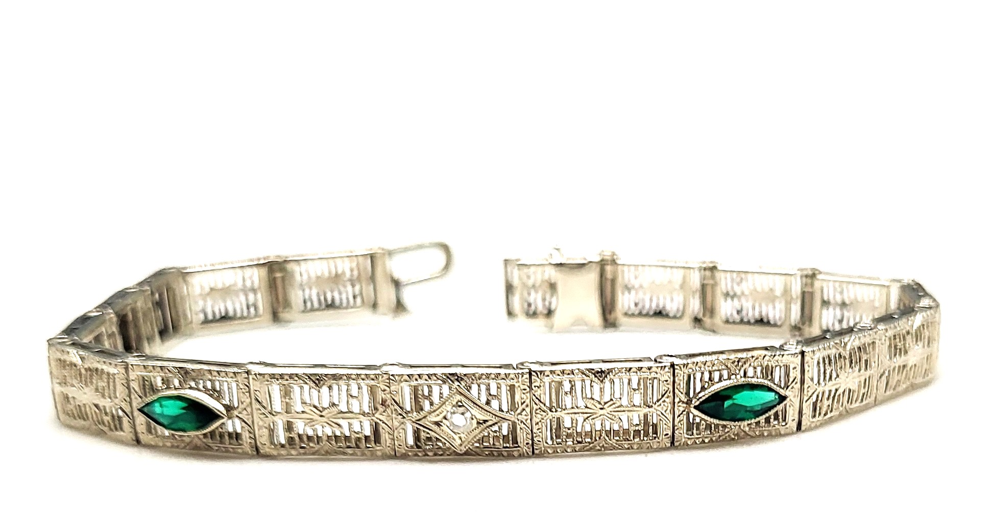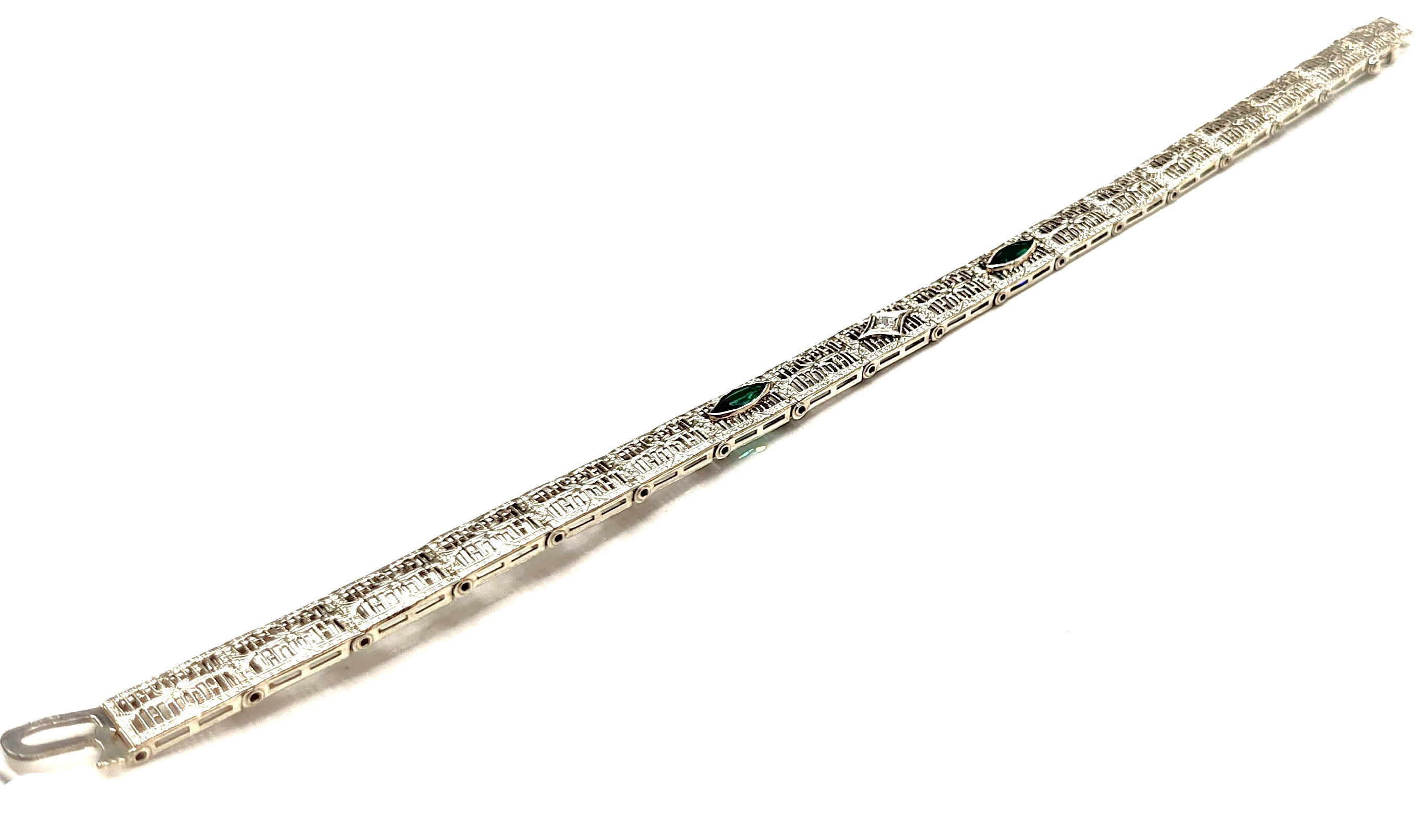 This lovely 14 karat white gold Edwardian-era filigree bracelet features a marquise-cut simulated emerald on each side of an approximate .03 carat round, faceted, G color, SI1 clarity diamond. Each of the hinged panel-links that do not have a gemstone has a flower design and is crafted with milgrain-edged white gold wire inside a rectangular etched frame. The bracelet is 7" long and 1/2" wide with a special clasp. (Insert the latch into the female end of the bracelet and deploy the folding safety clip that snaps on each side. When removing the bracelet, be sure to release the folding safety before attempting to remove the bracelet from the wrist).