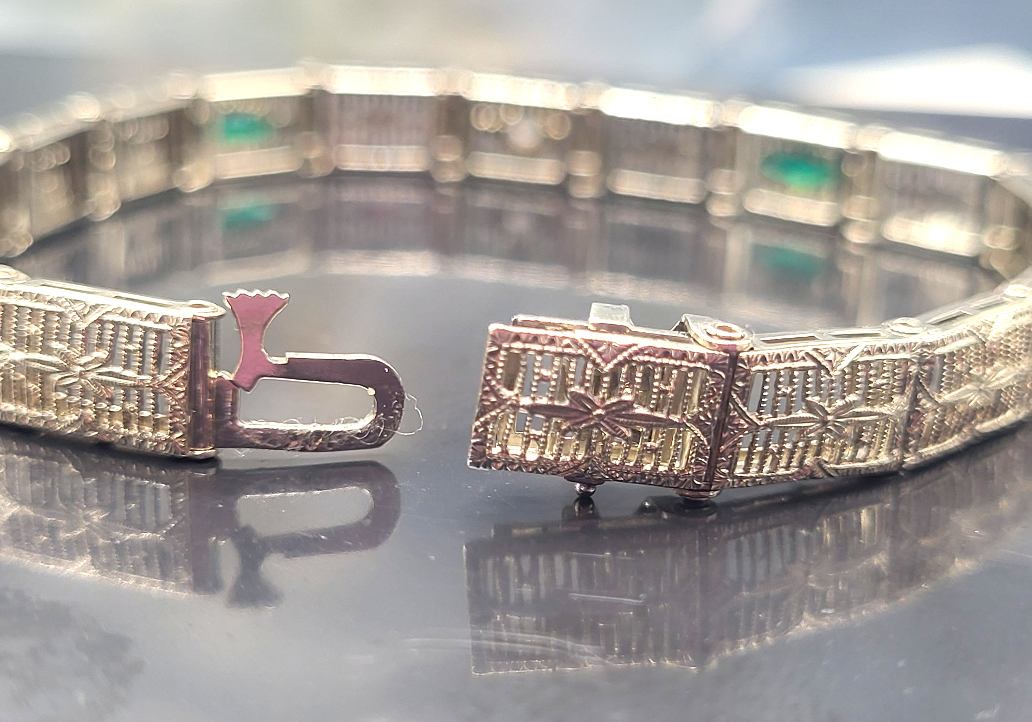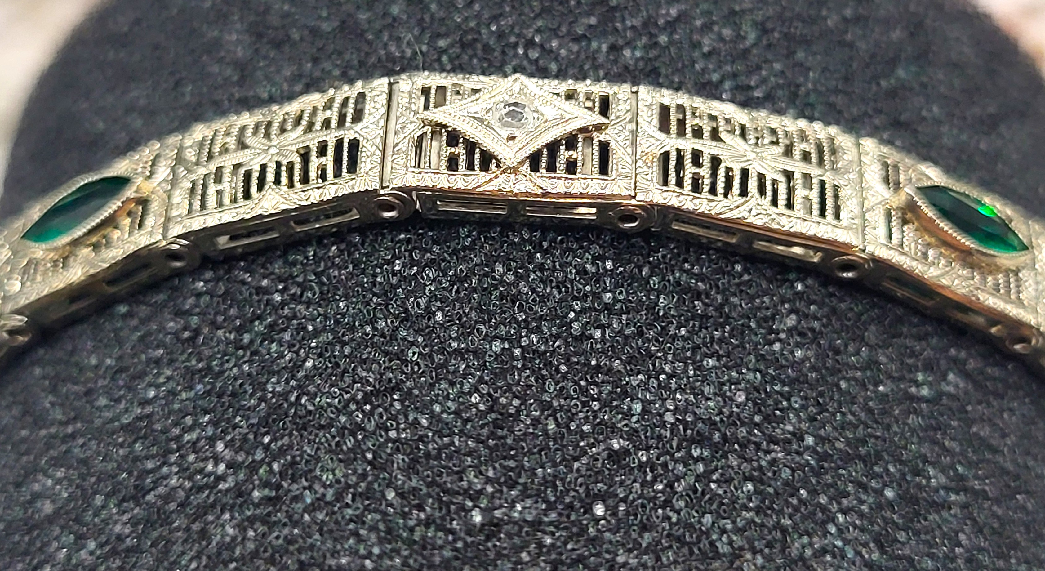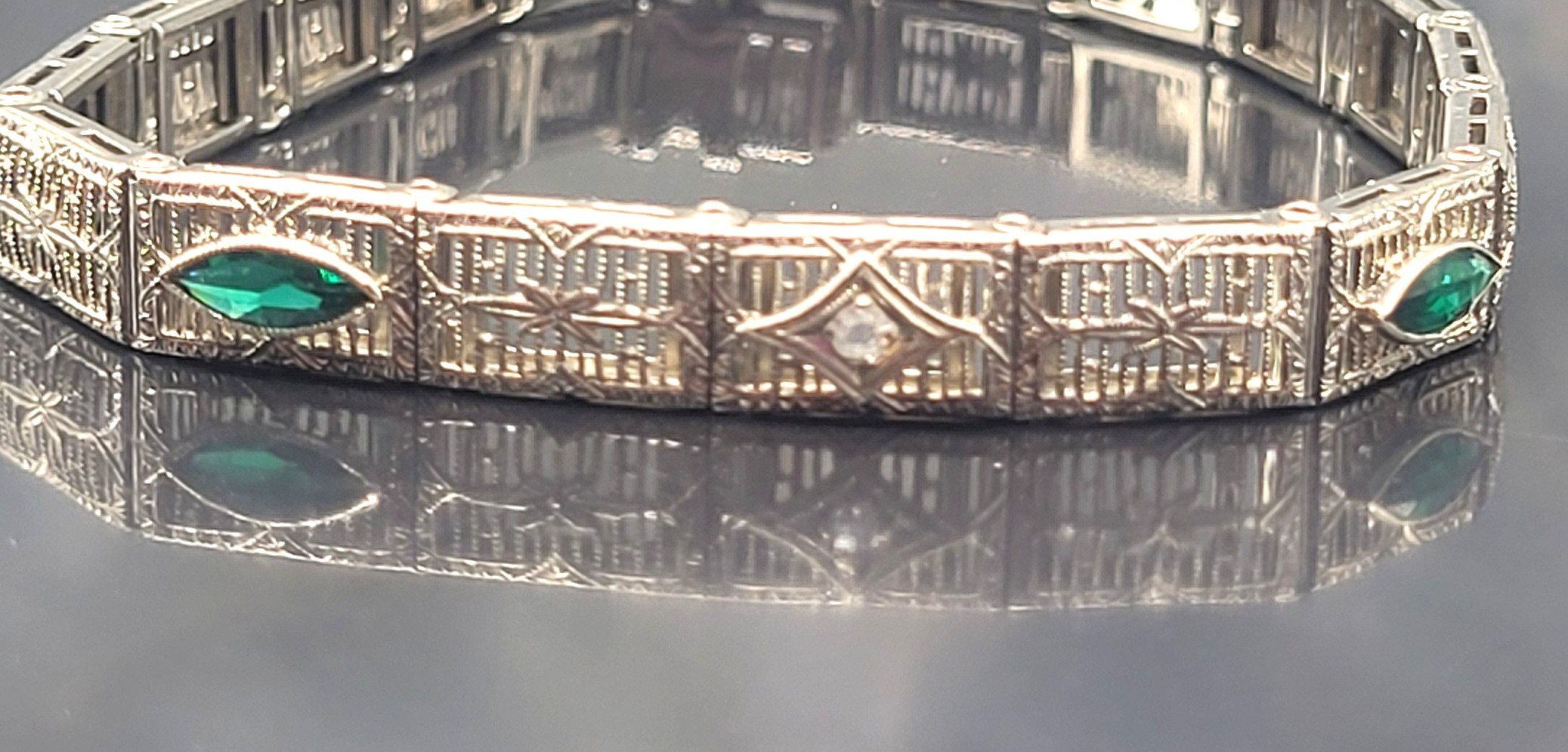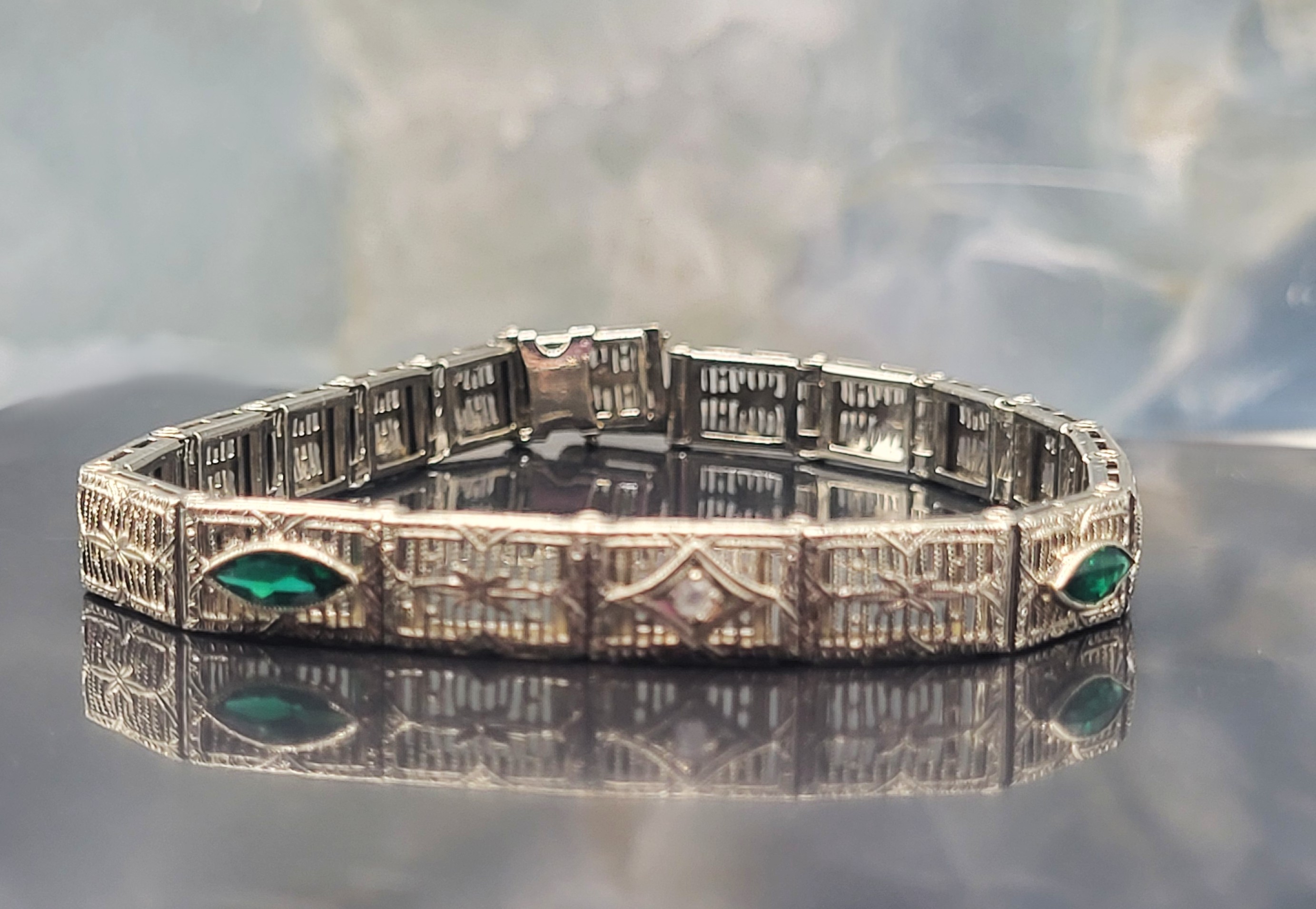 This lovely 14 karat white gold Edwardian-era filigree bracelet features a marquise-cut simulated emerald on each side of an approximate .03 carat round, faceted, G color, SI1 clarity diamond. Each of the hinged panel-links that do not have a gemstone has a flower design and is crafted with milgrain-edged white gold wire inside a rectangular etched frame. The bracelet is 7" long and 1/2" wide with a special clasp. (Insert the latch into the female end of the bracelet and deploy the folding safety clip that snaps on each side. When removing the bracelet, be sure to release the folding safety before attempting to remove the bracelet from the wrist).