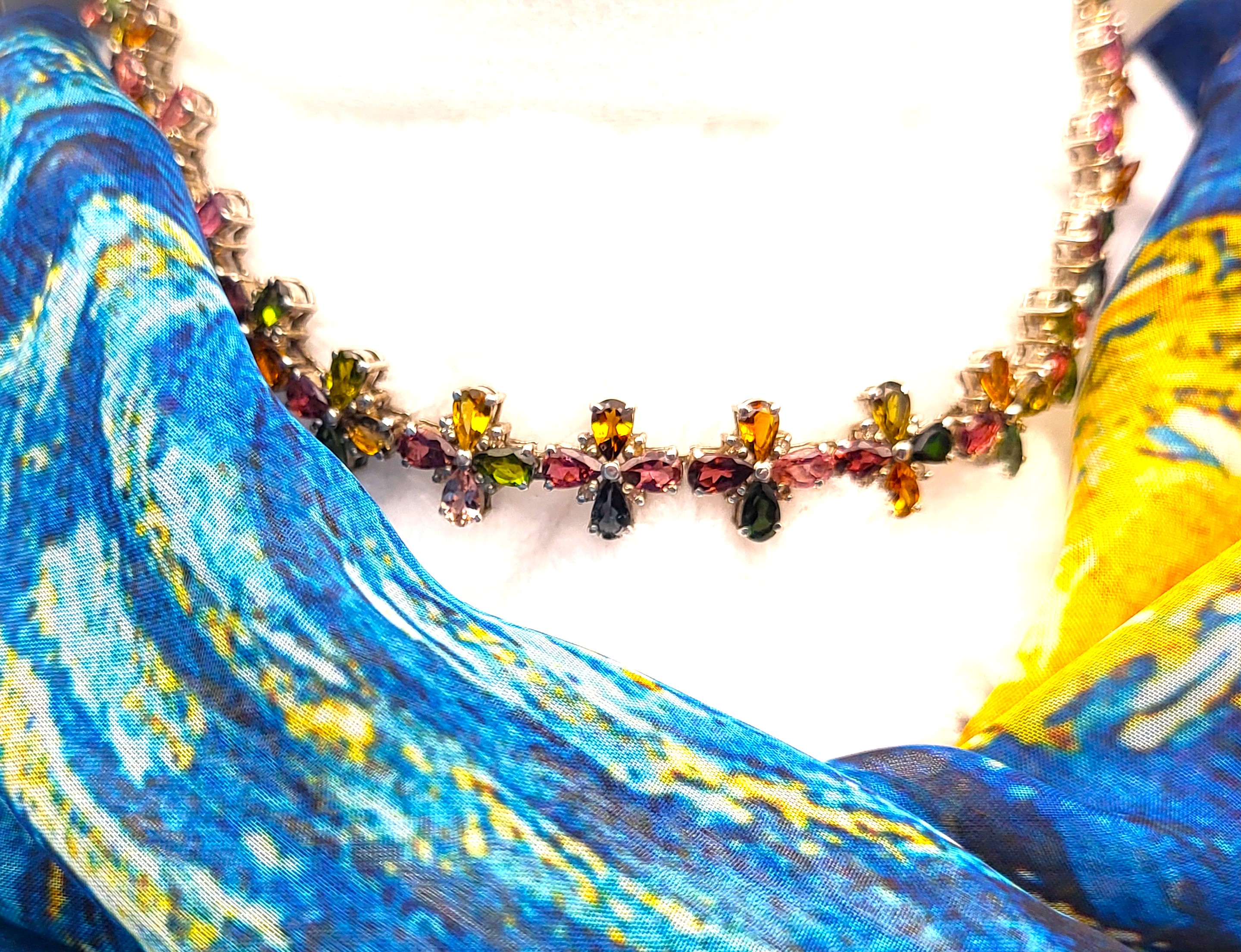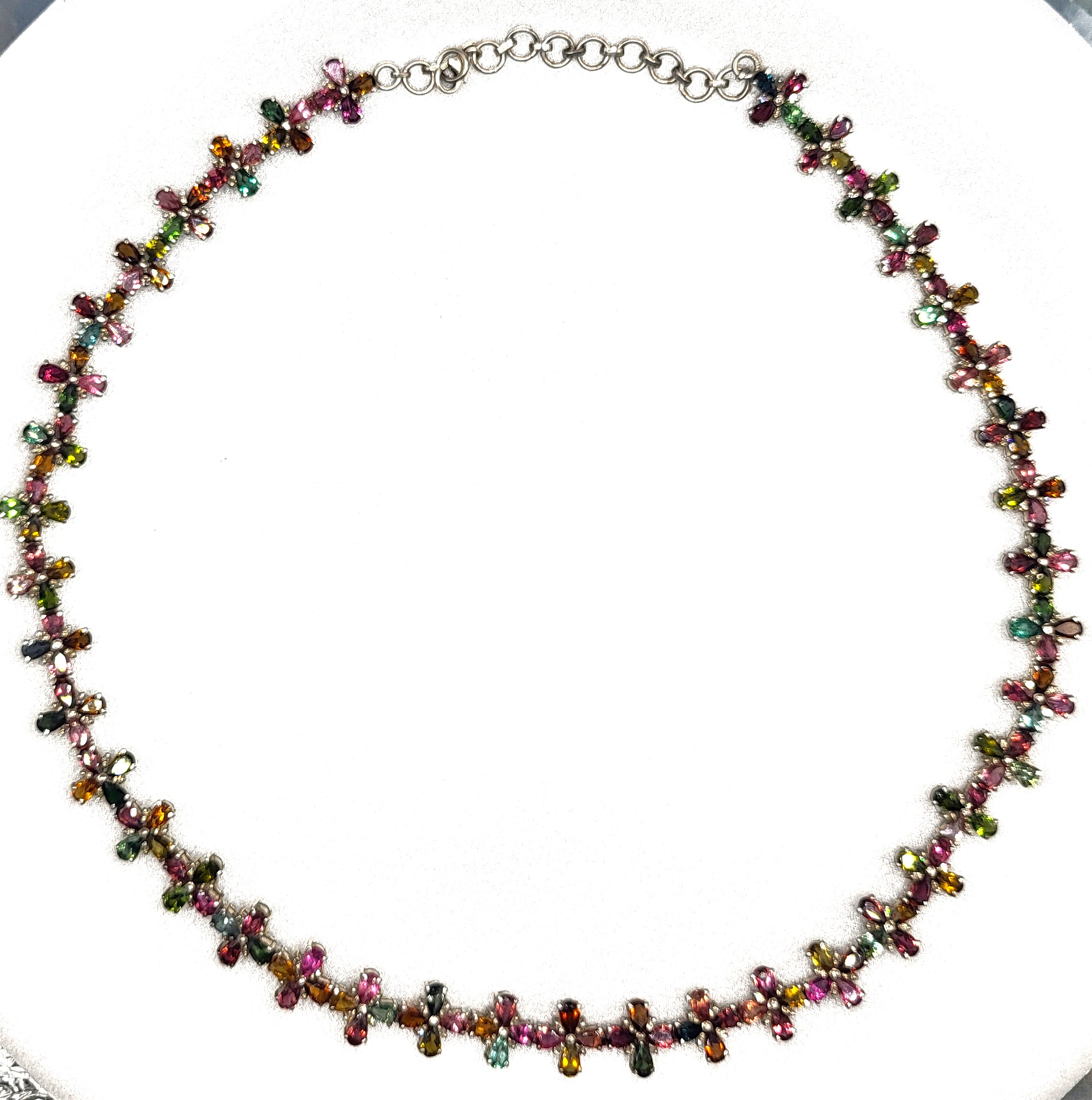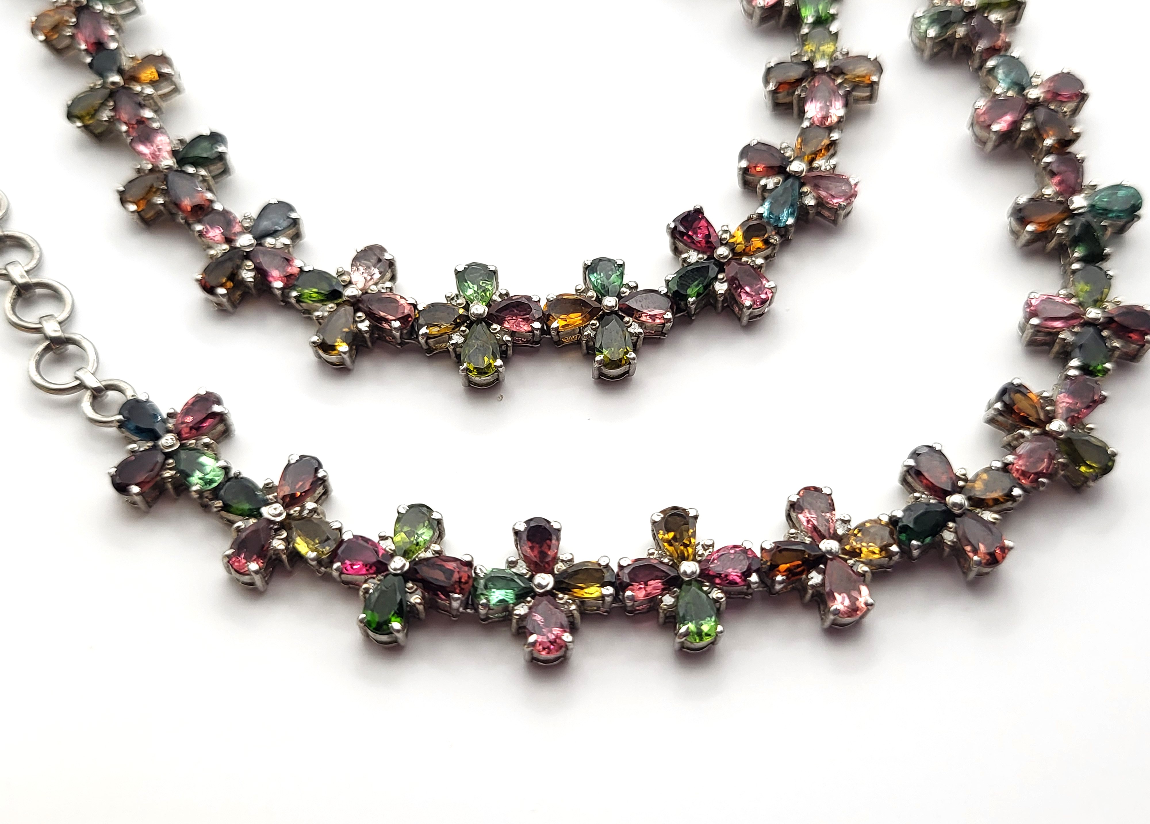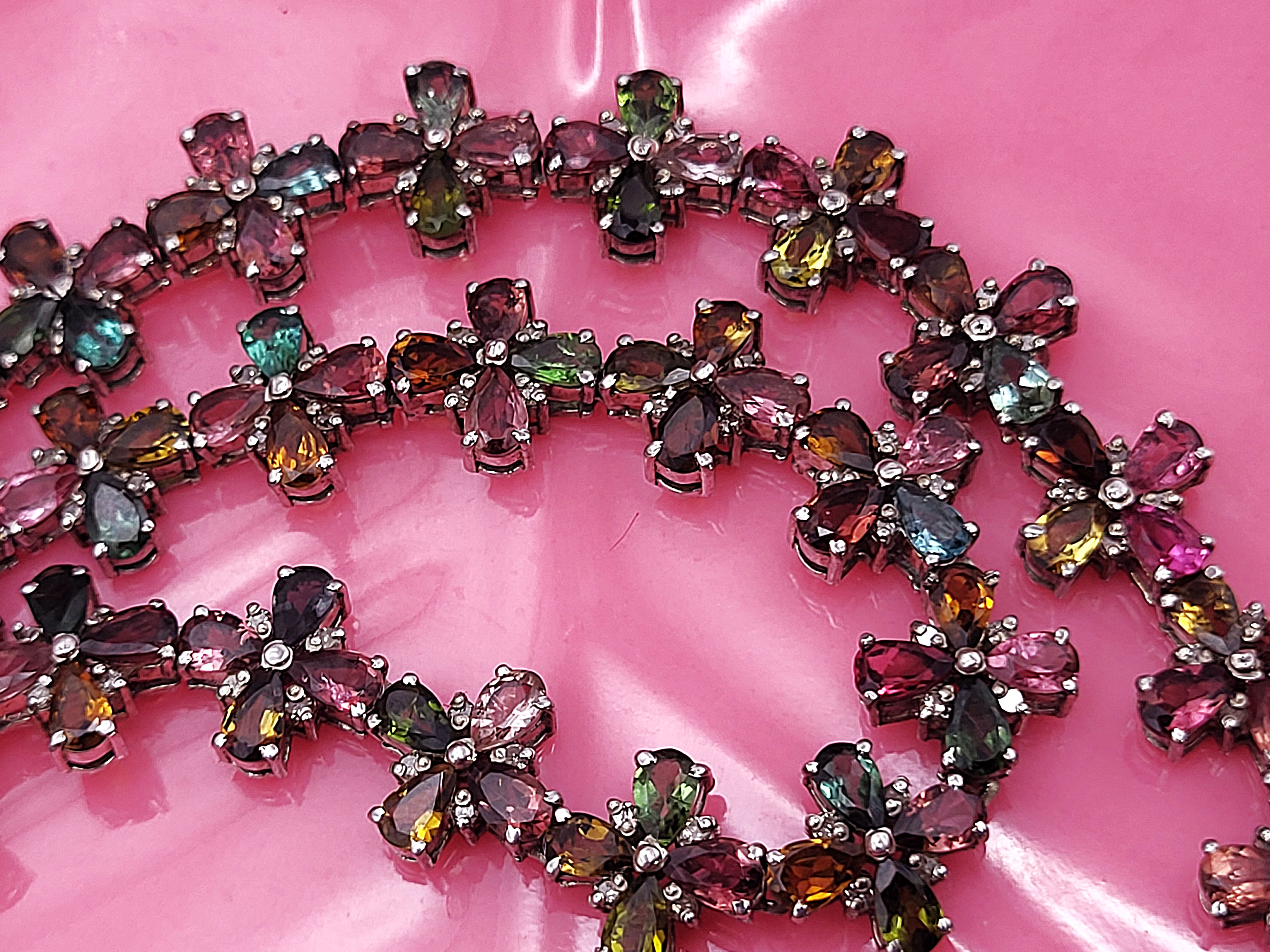 With an incredible range of colors and varieties, it is no wonder that tourmalines are becoming one of the most popular gemstones used by designers today. This incredible necklace is set with over 32.00 carats of pear-cut, prong-set, genuine tourmaline that are arranged in groups of four to resemble colorful flowers 1.92 carats total weight of round, faceted, earth-mined, H-I color, I1-I2 clarity diamonds scattered between the petals, like shiny drops of morning dew. The necklace is 19" to 20" long with the sterling silver extension chain and lobster clasp. Admin: E7159/8-hbh