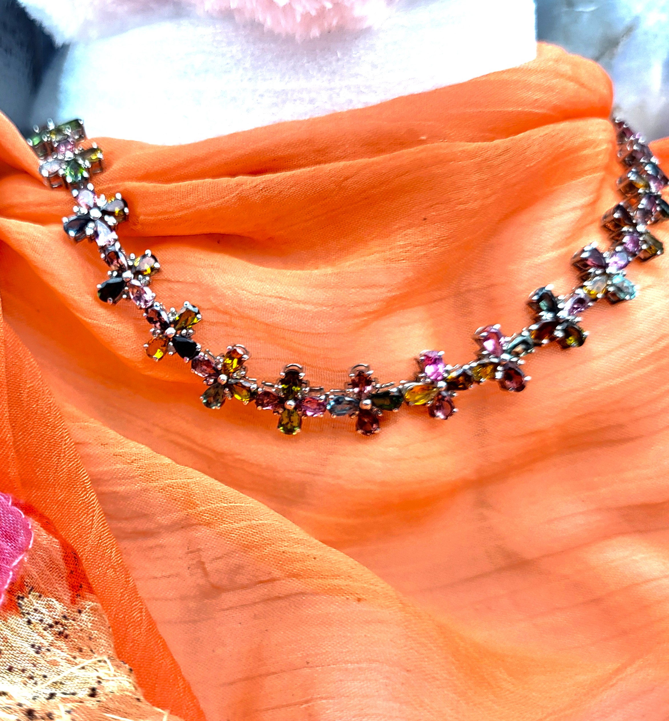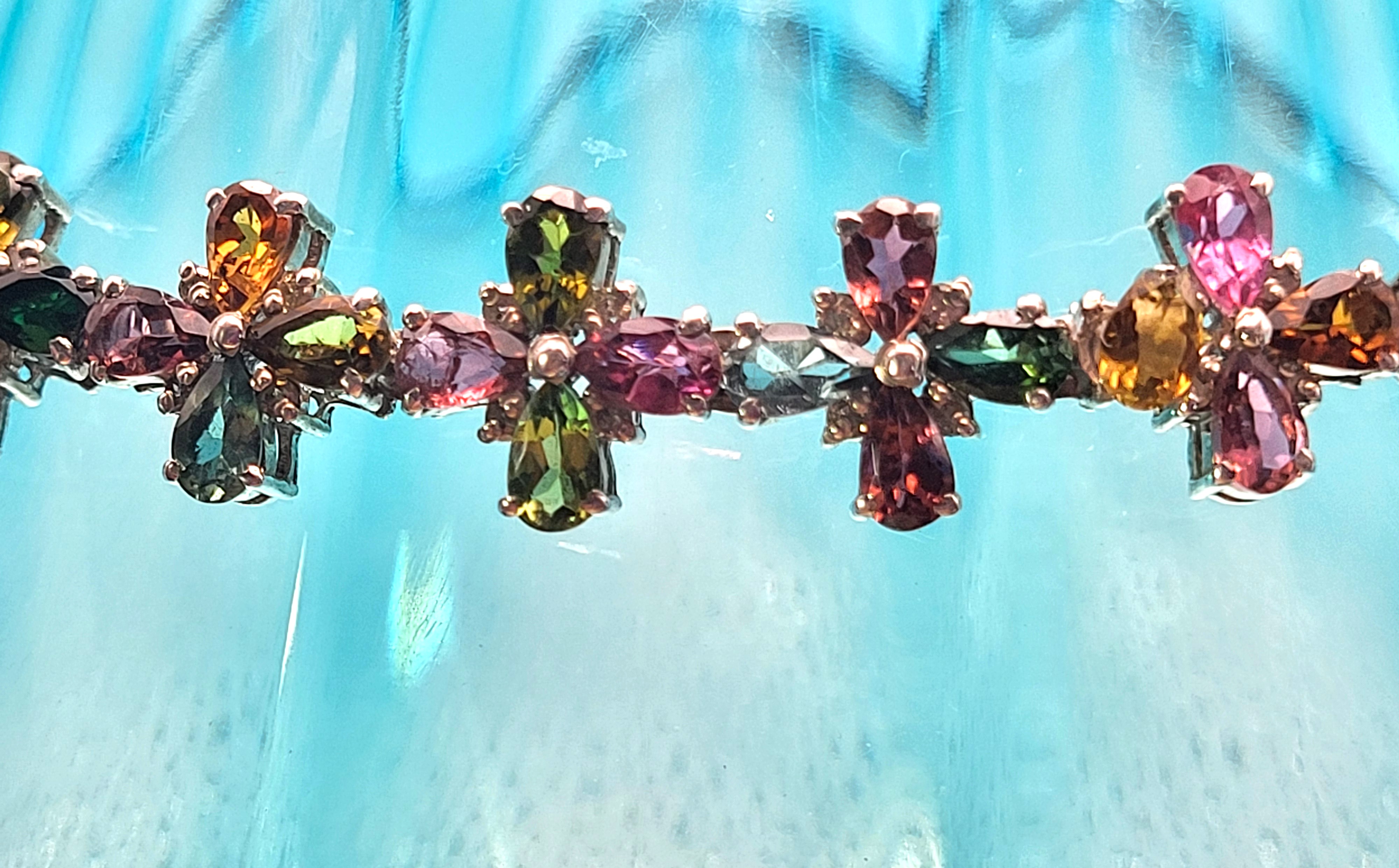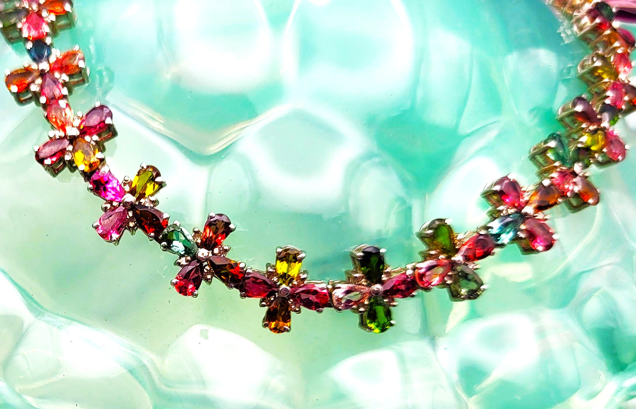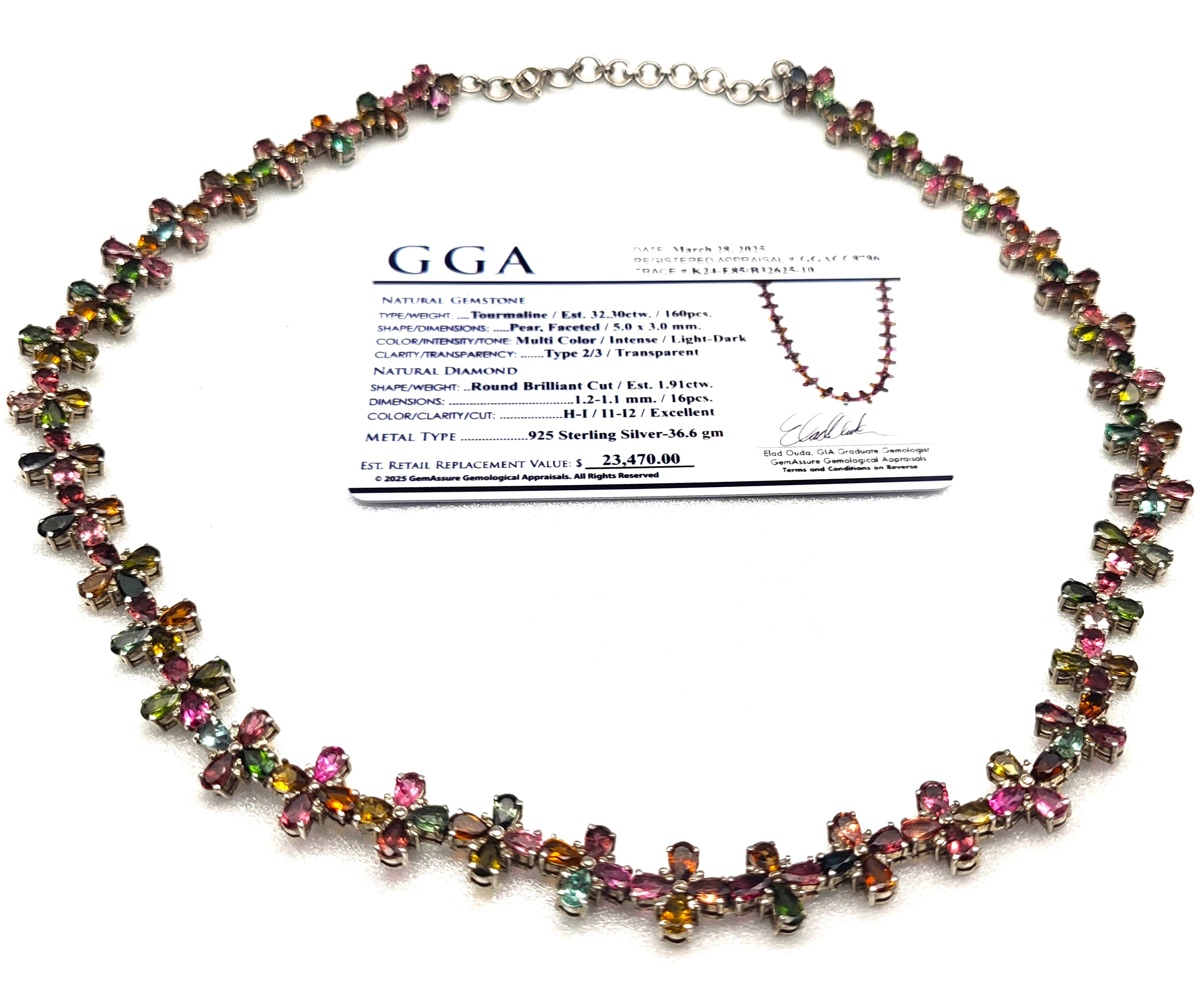 With an incredible range of colors and varieties, it is no wonder that tourmalines are becoming one of the most popular gemstones used by designers today. This incredible necklace is set with over 32.00 carats of pear-cut, prong-set, genuine tourmaline that are arranged in groups of four to resemble colorful flowers 1.92 carats total weight of round, faceted, earth-mined, H-I color, I1-I2 clarity diamonds scattered between the petals, like shiny drops of morning dew. The necklace is 19" to 20" long with the sterling silver extension chain and lobster clasp. Admin: E7159/8-hbh