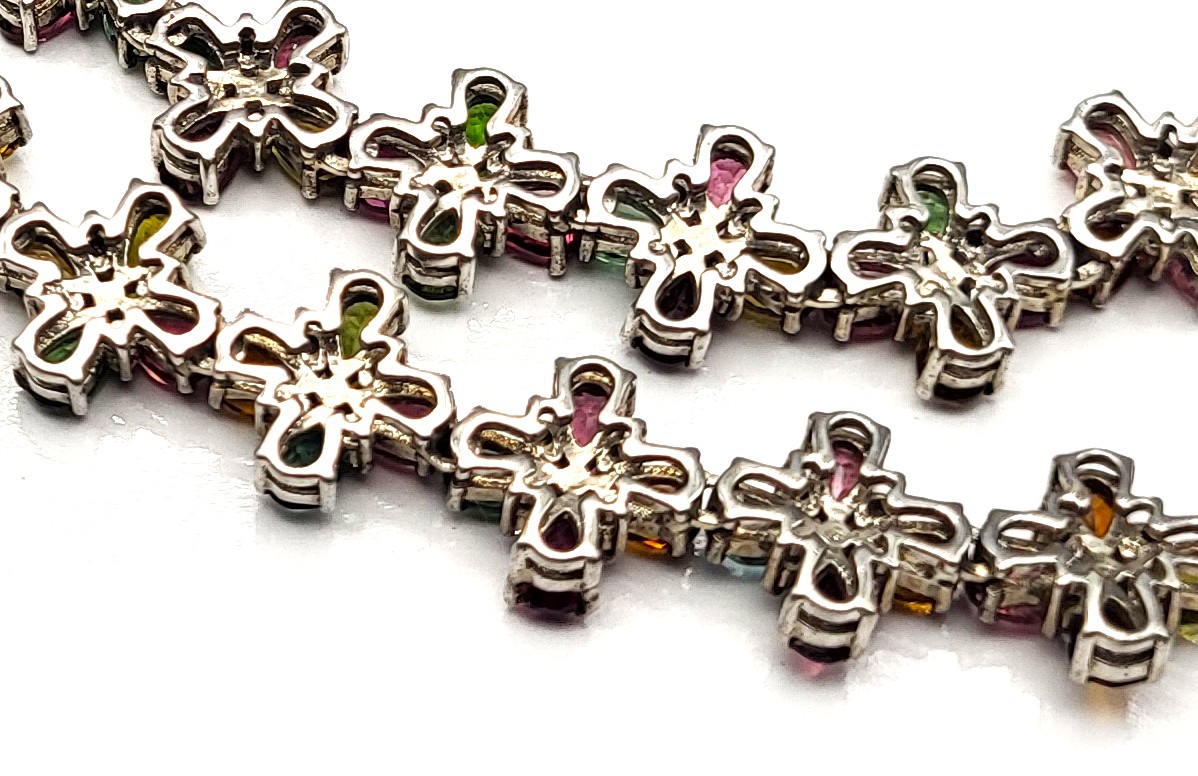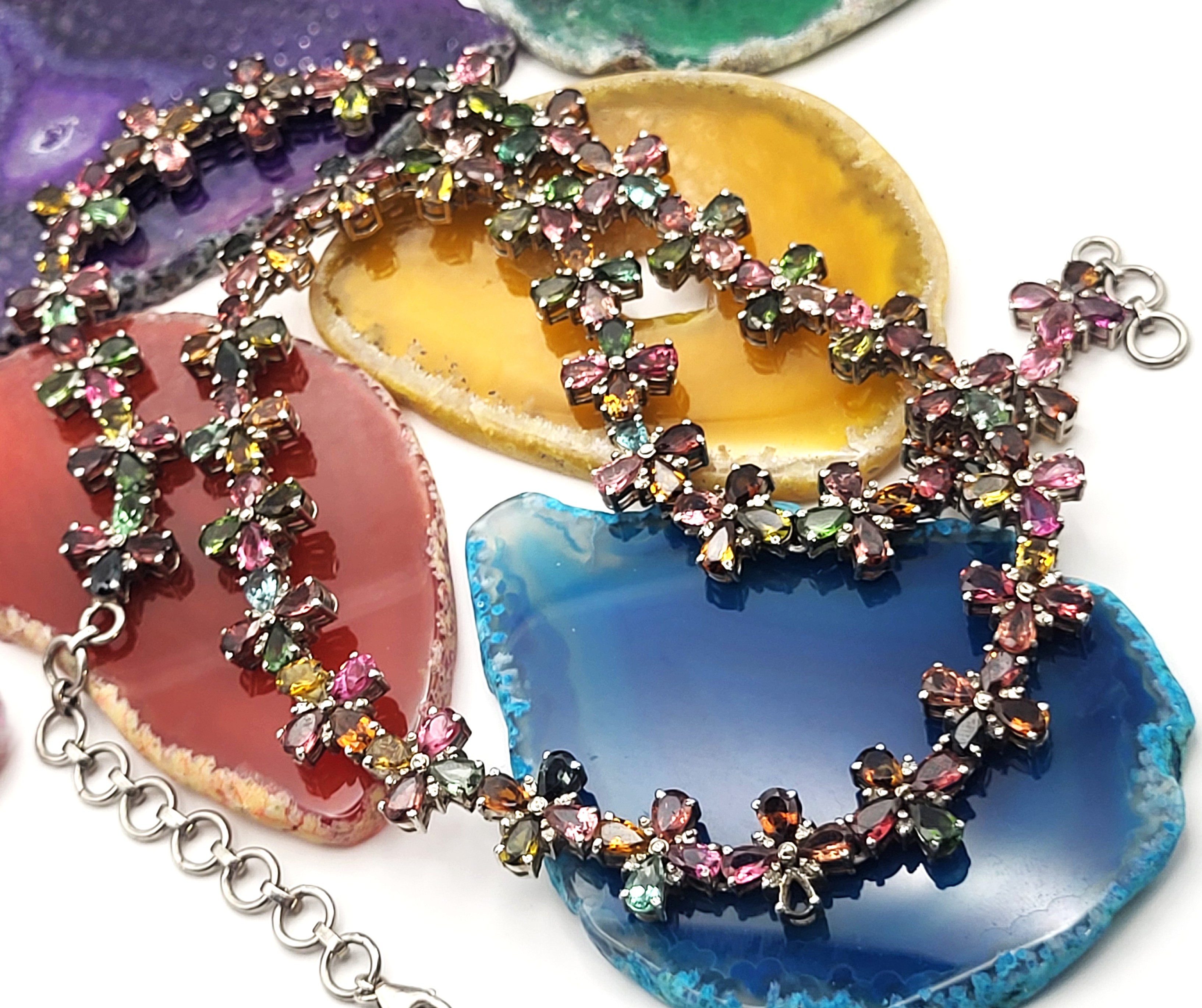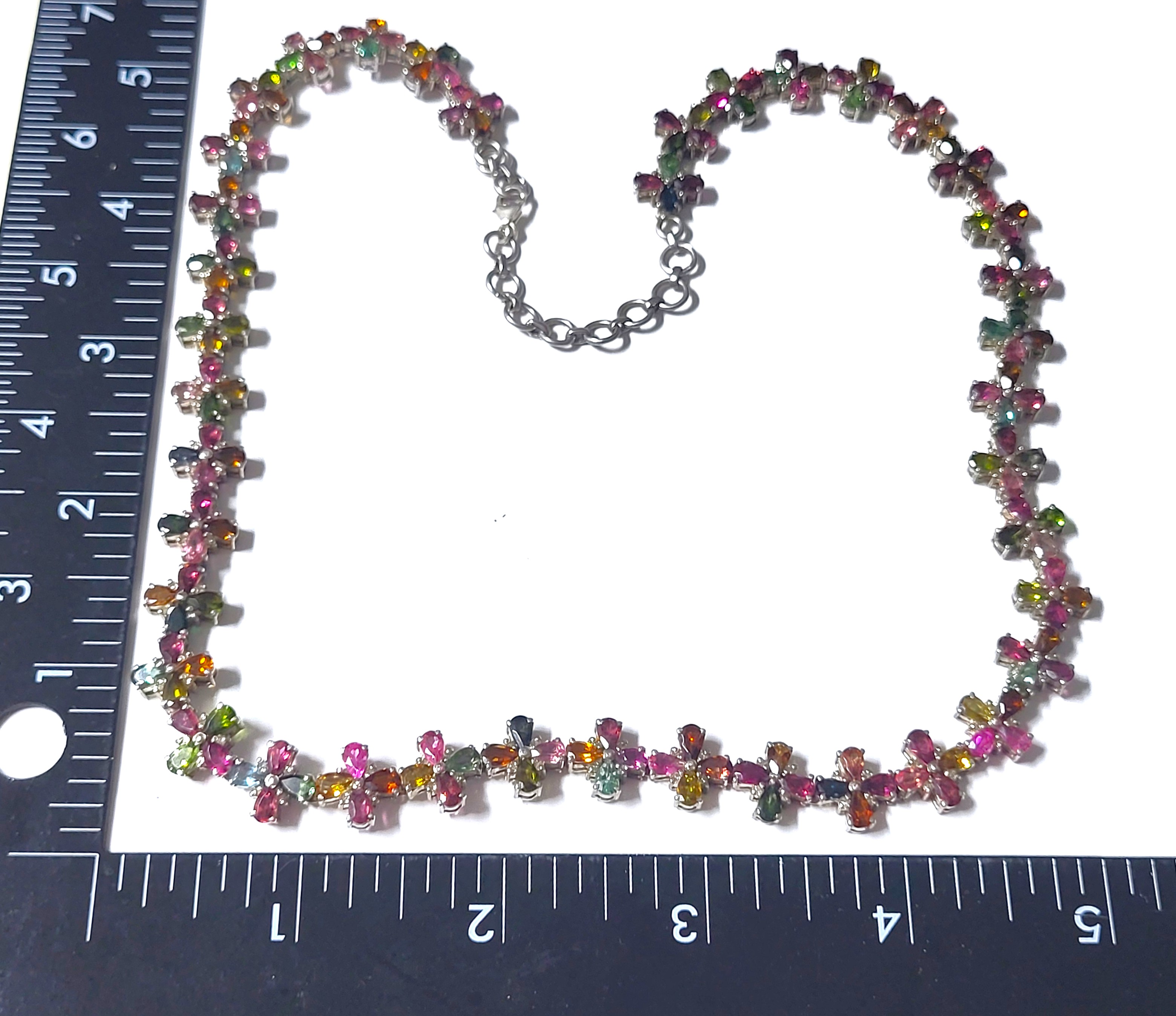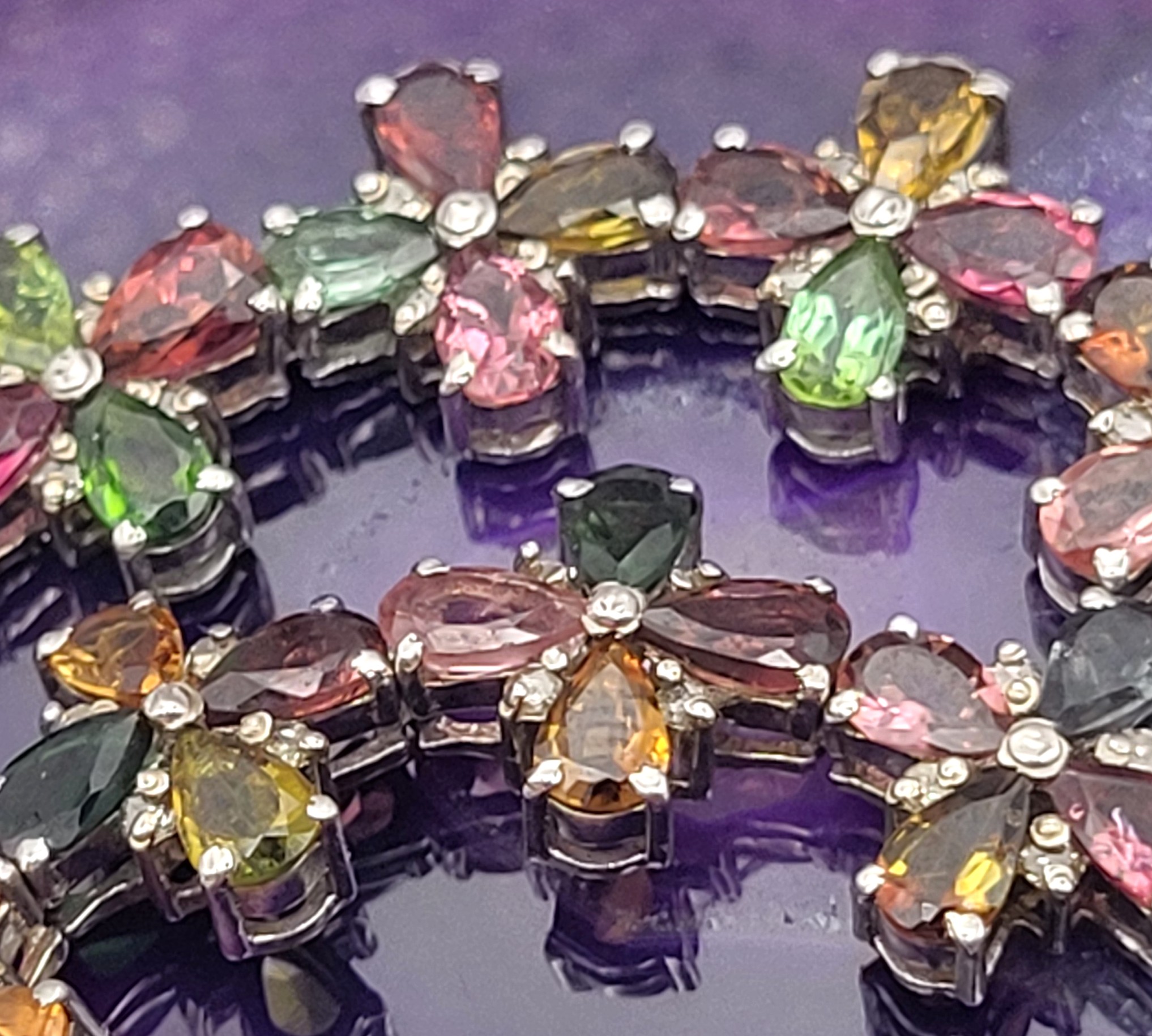 With an incredible range of colors and varieties, it is no wonder that tourmalines are becoming one of the most popular gemstones used by designers today. This incredible necklace is set with over 32.00 carats of pear-cut, prong-set, genuine tourmaline that are arranged in groups of four to resemble colorful flowers 1.92 carats total weight of round, faceted, earth-mined, H-I color, I1-I2 clarity diamonds scattered between the petals, like shiny drops of morning dew. The necklace is 19" to 20" long with the sterling silver extension chain and lobster clasp. Admin: E7159/8-hbh