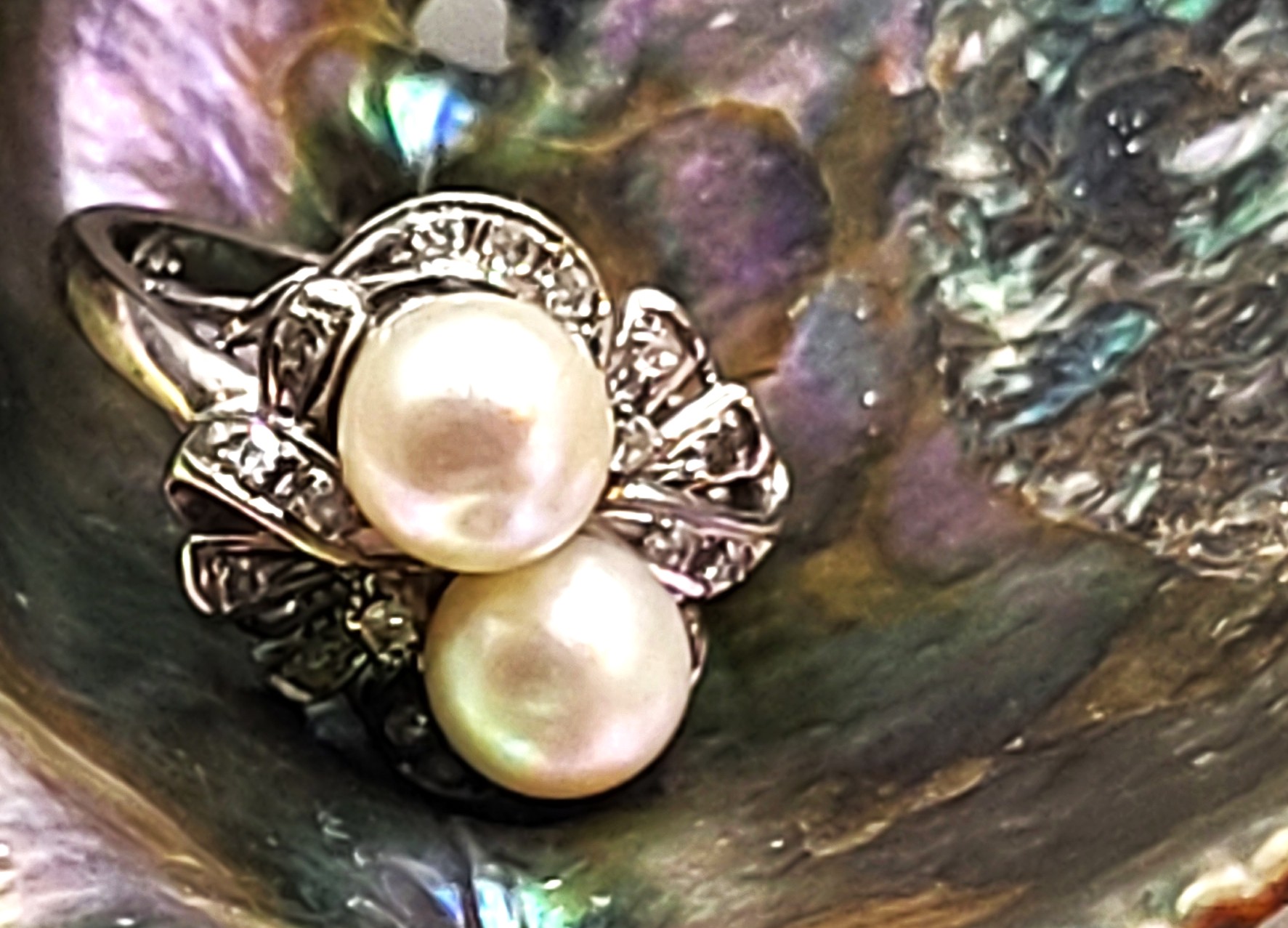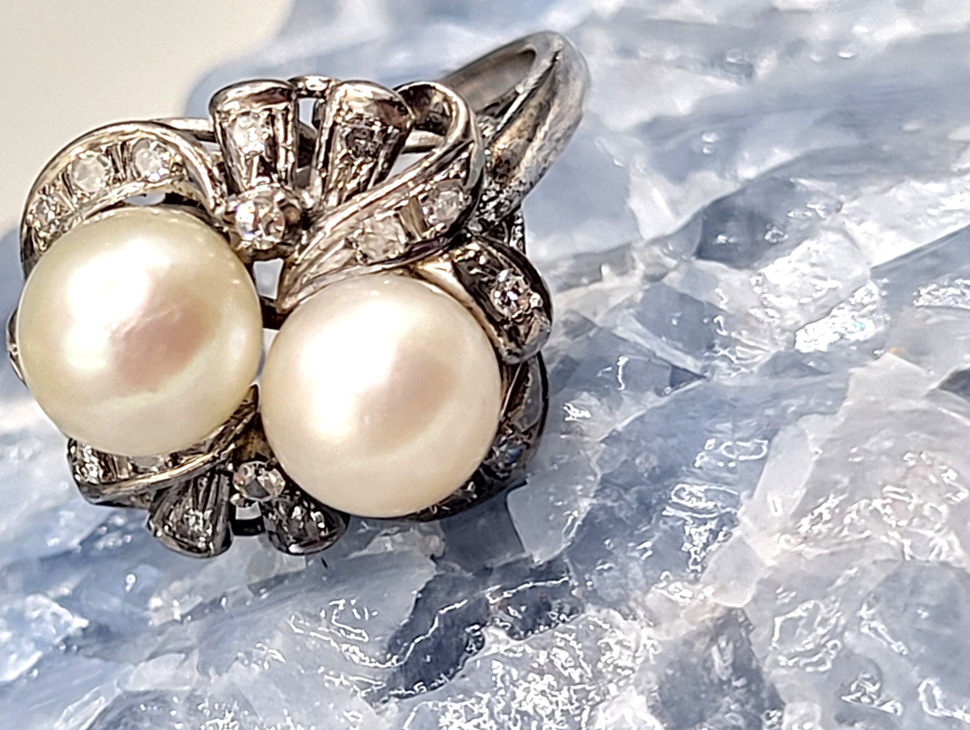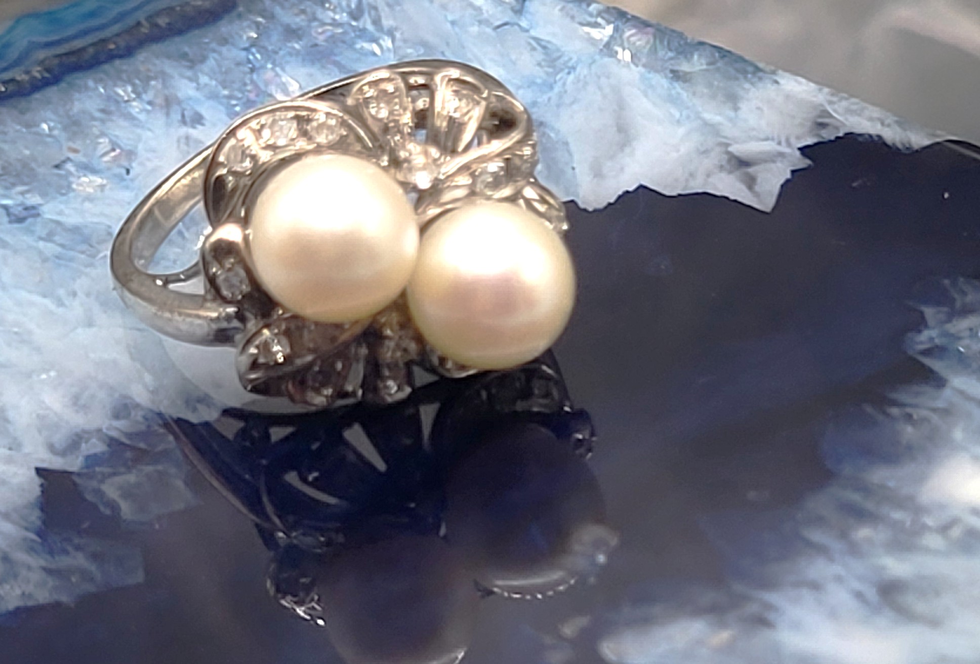 This 14 karat white gold ring portrays the Art-Deco style with intertwining ribbons set with approximately .15 carats of earth-mined, round, faceted, H-I color, SI2-I1 clarity diamonds that wind their way between approximate 7mm round, cultured pearls with a rose’ iridescence. The ring is US size 6 and can be sized, if needed. Please contact Bidfair Fine Jewelry for details.