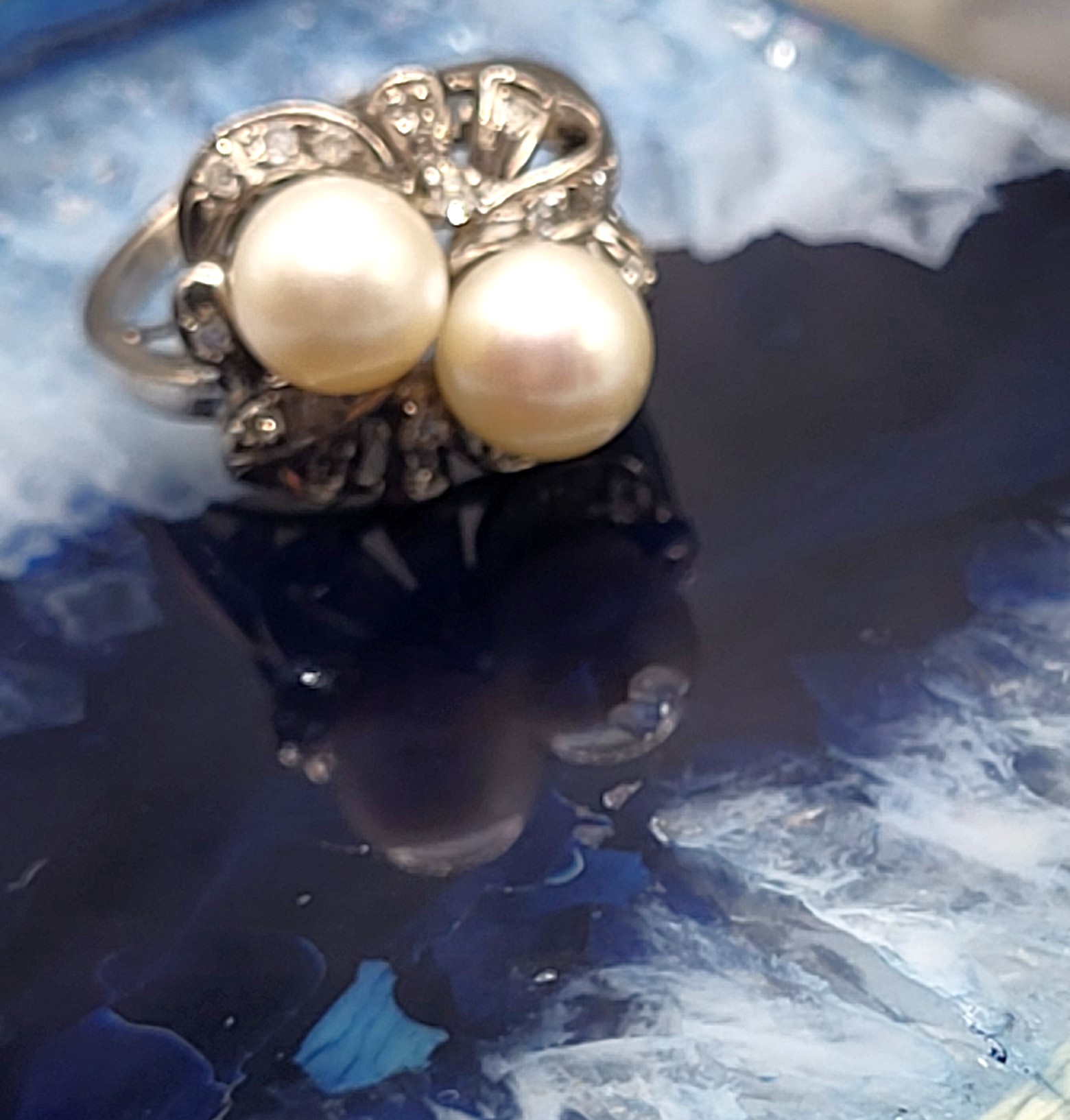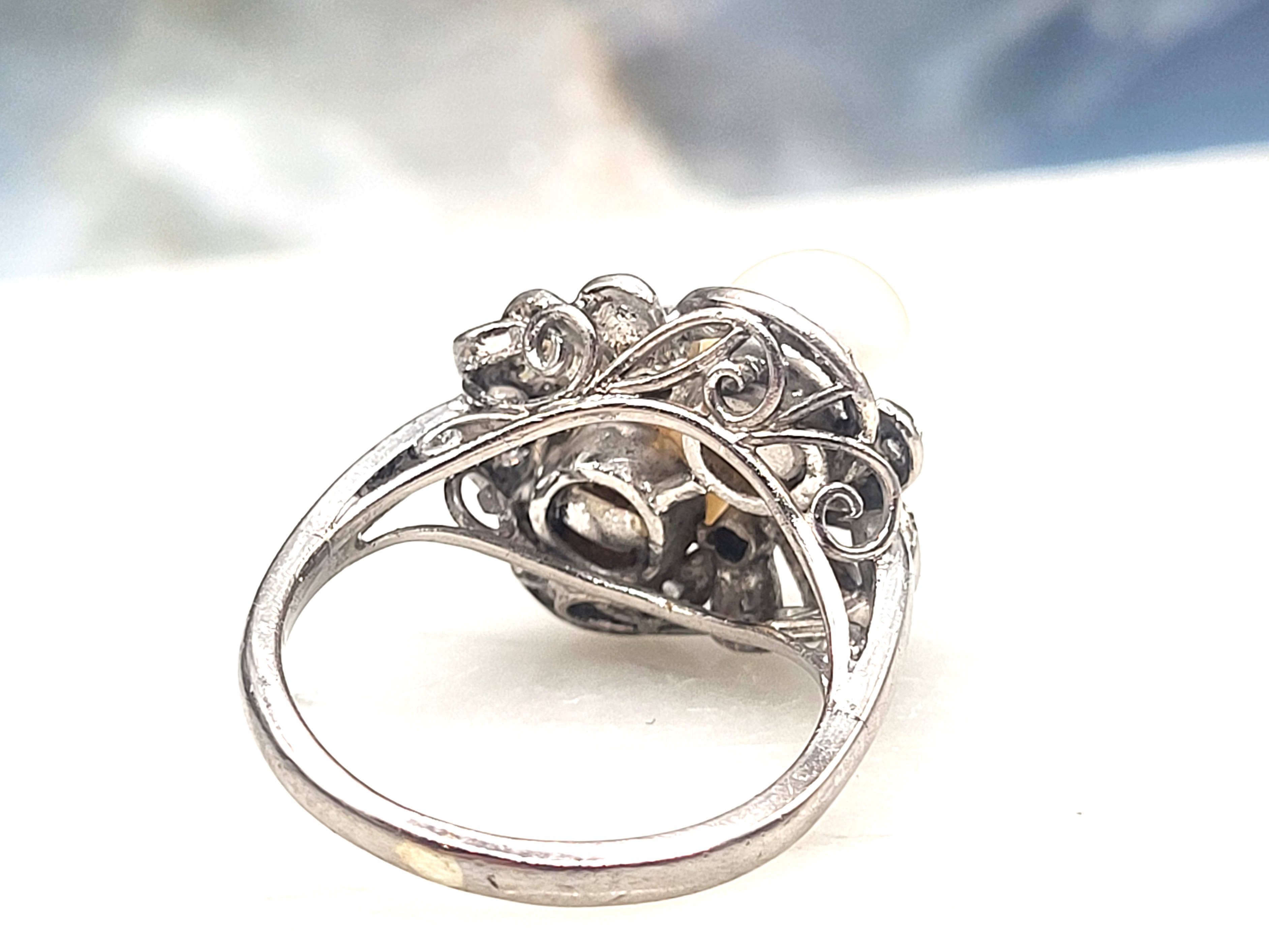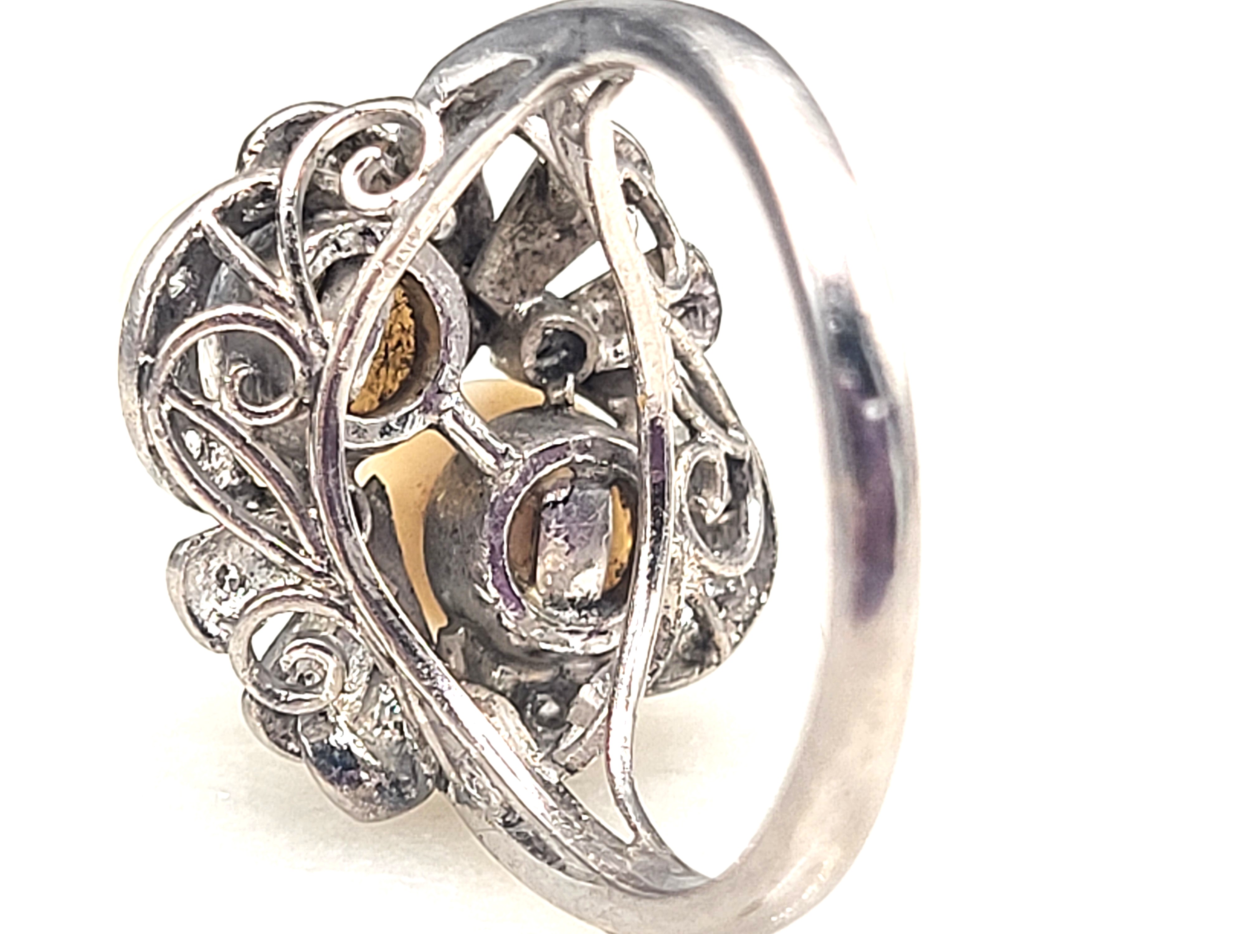 This 14 karat white gold ring portrays the Art-Deco style with intertwining ribbons set with approximately .15 carats of earth-mined, round, faceted, H-I color, SI2-I1 clarity diamonds that wind their way between approximate 7mm round, cultured pearls with a rose’ iridescence. The ring is US size 6 and can be sized, if needed. Please contact Bidfair Fine Jewelry for details.
