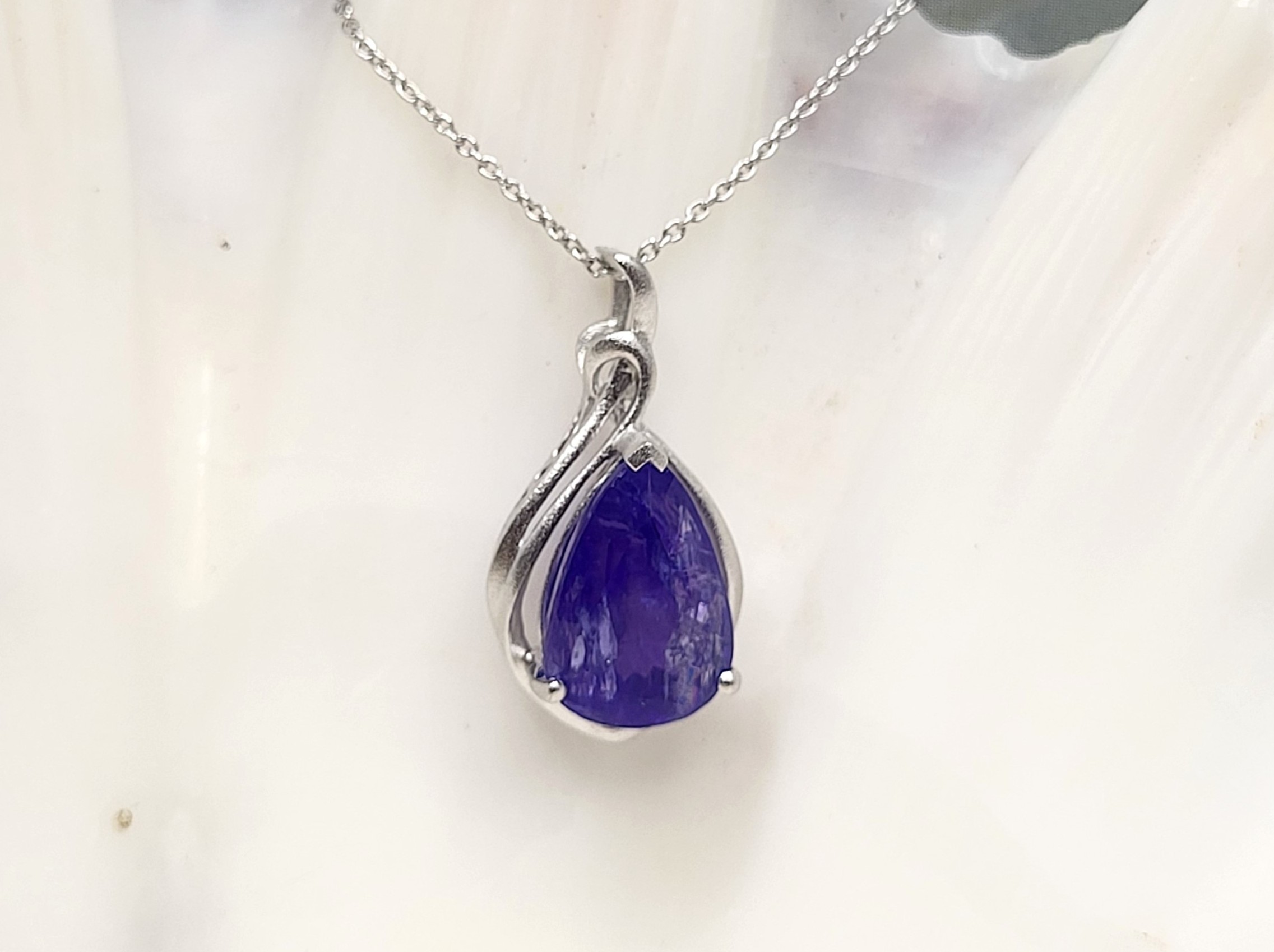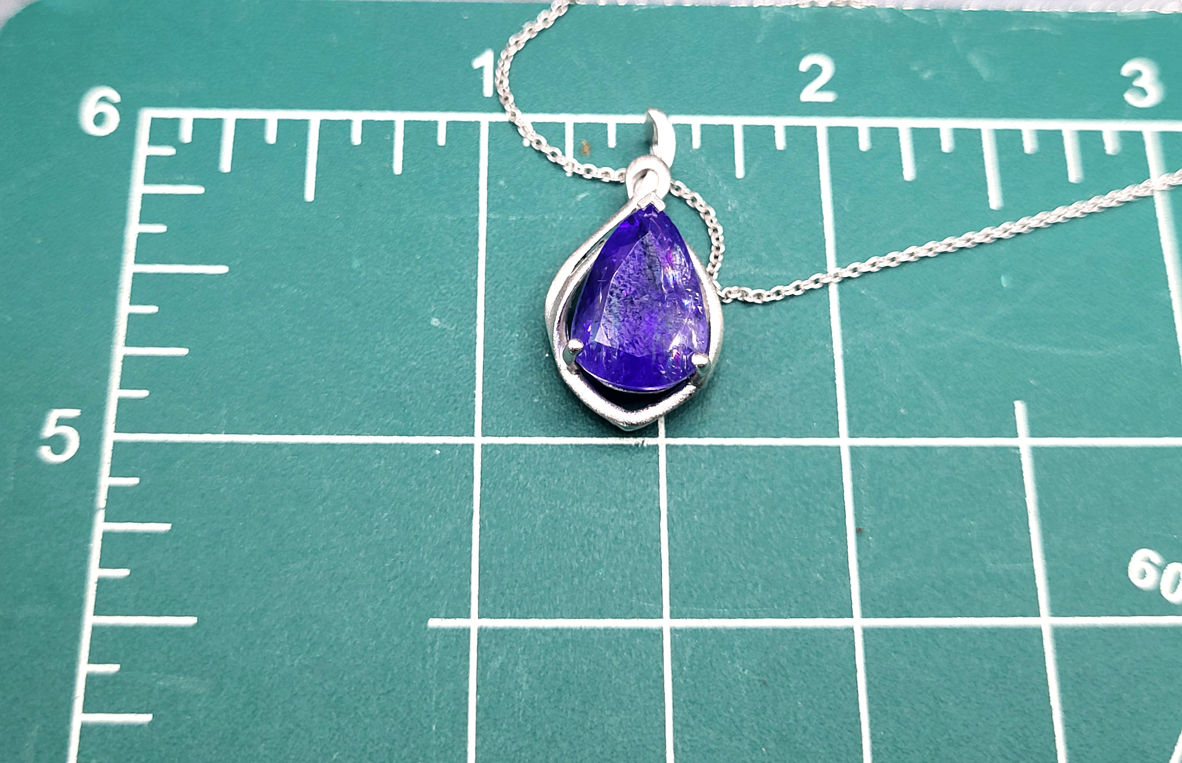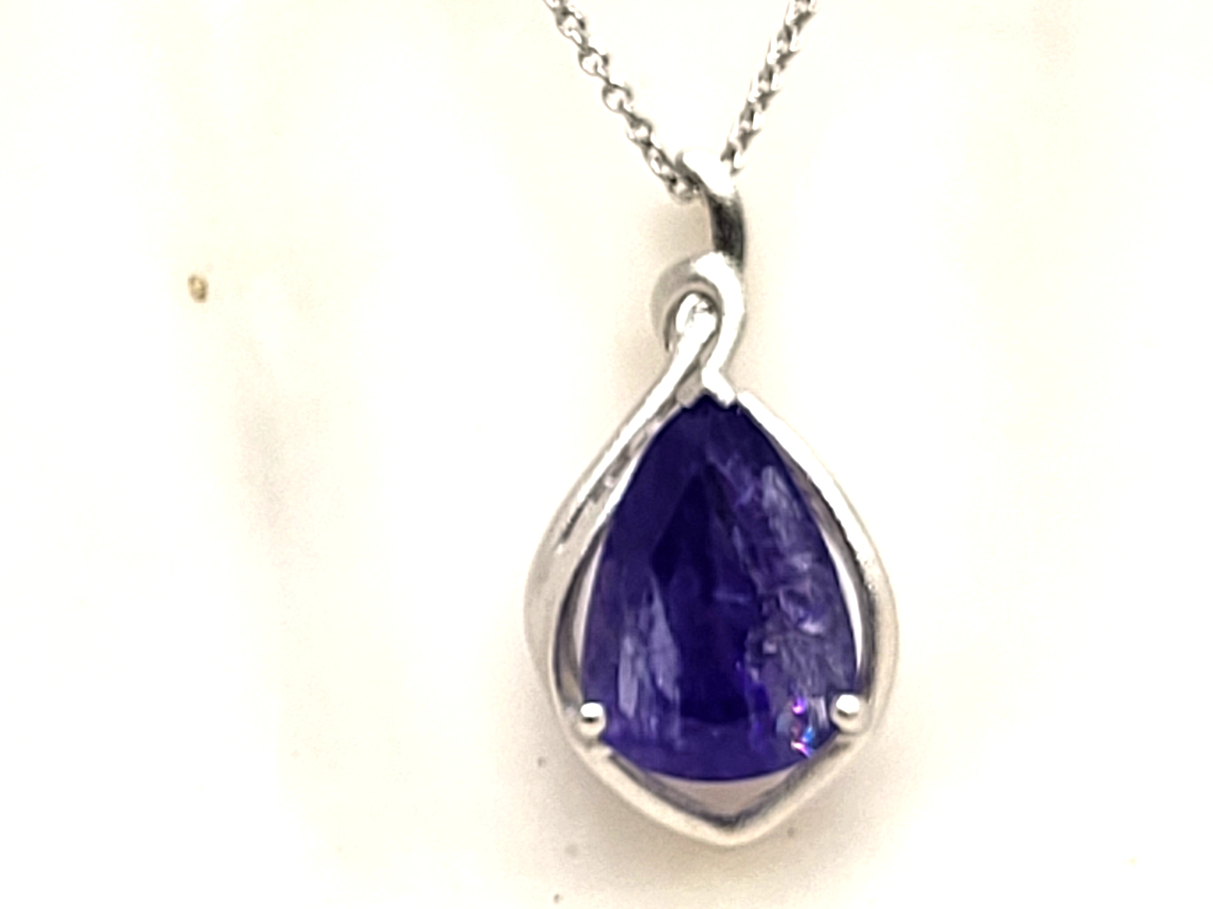 The bright and shiny sterling silver necklace features a 5.92 carat, pear-cut, genuine Tanzanite in a pendant with a swirled gallery and solid hidden bail. The pendant hangs from an 18" fine chain of sterling silver with a spring ring clasp. The bail has an opening that can accommodate approximately up to a 3mm wide chain.