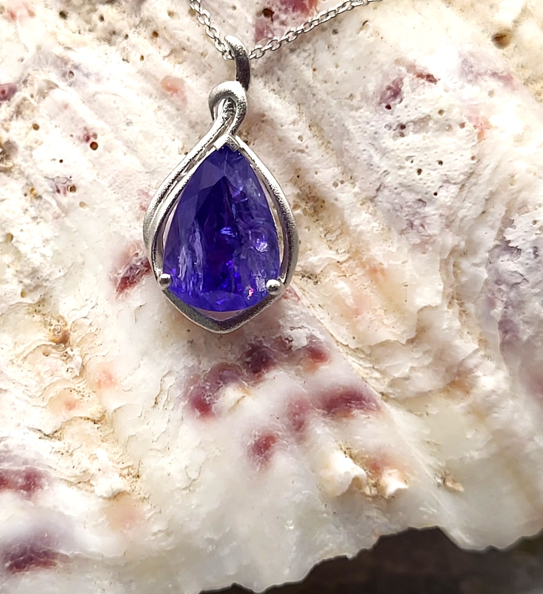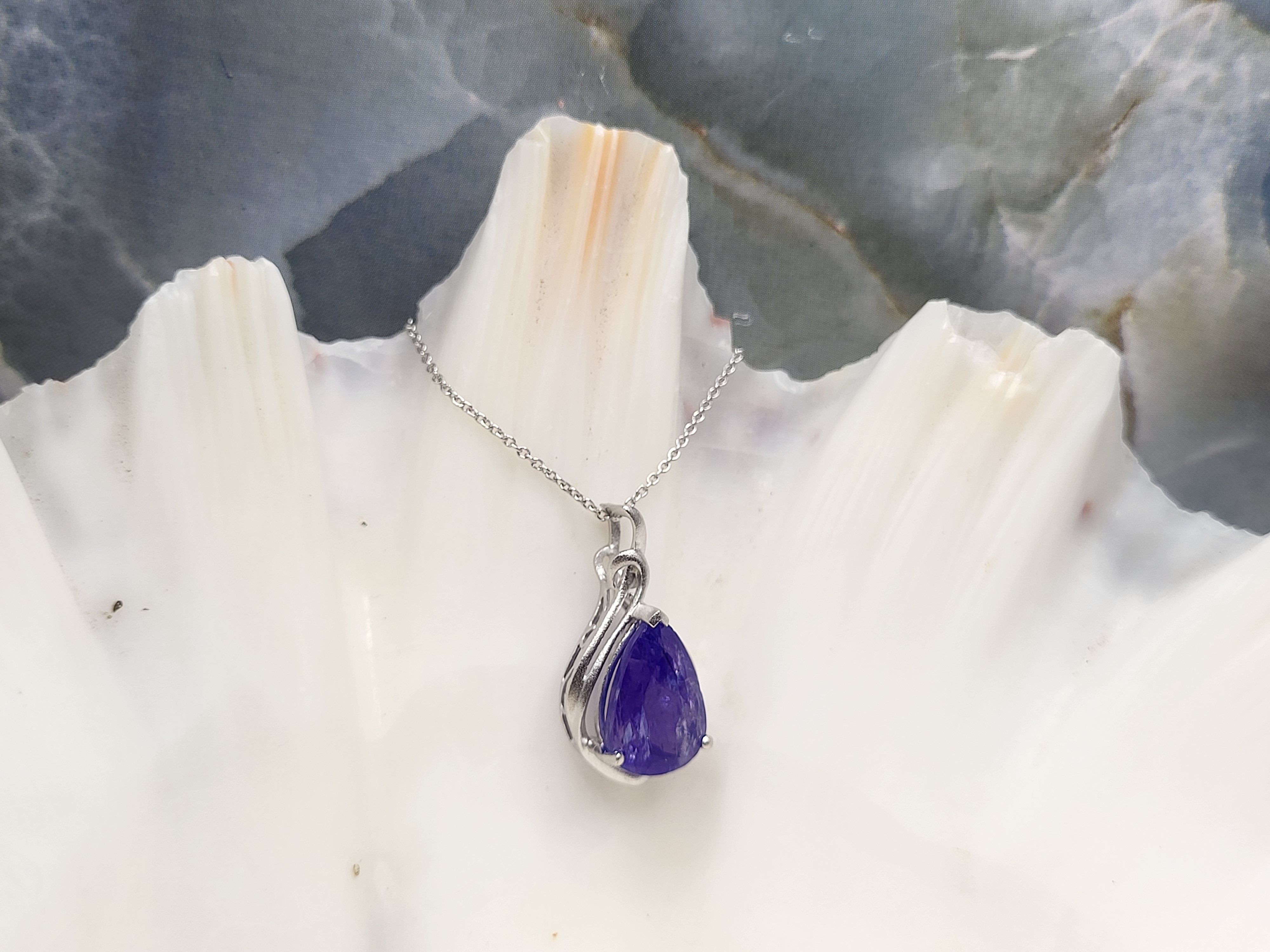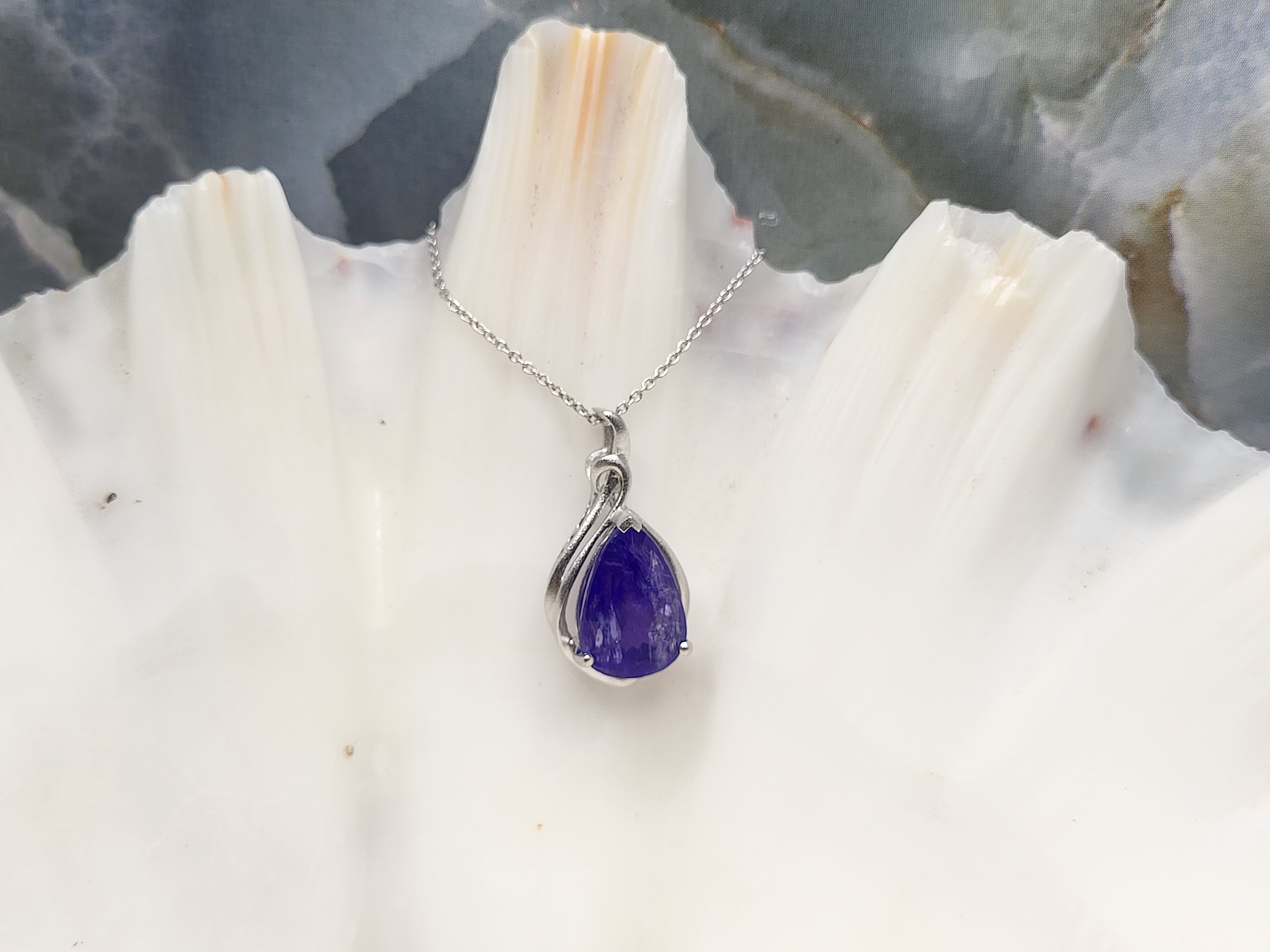 The bright and shiny sterling silver necklace features a 5.92 carat, pear-cut, genuine Tanzanite in a pendant with a swirled gallery and solid hidden bail. The pendant hangs from an 18" fine chain of sterling silver with a spring ring clasp. The bail has an opening that can accommodate approximately up to a 3mm wide chain.