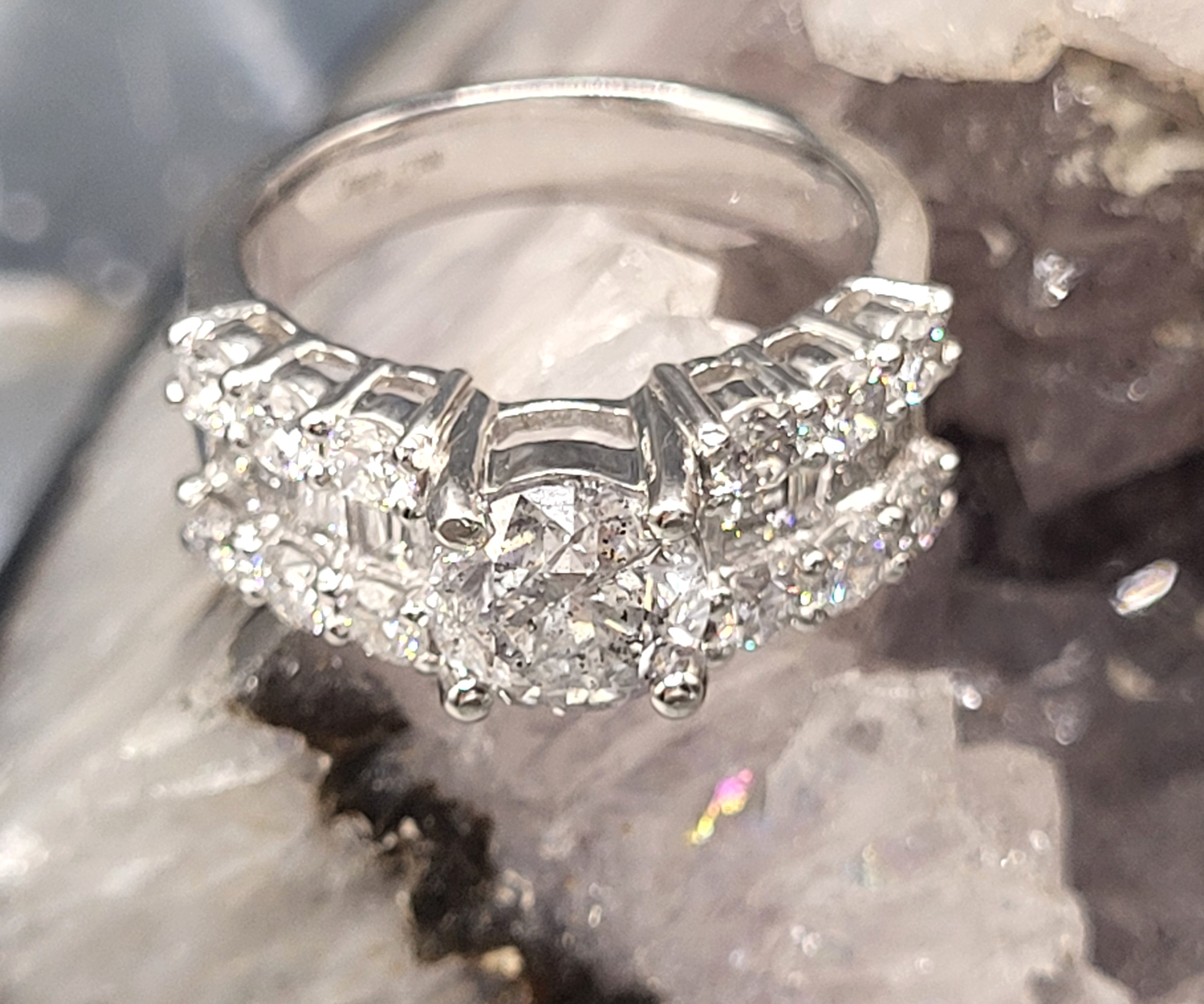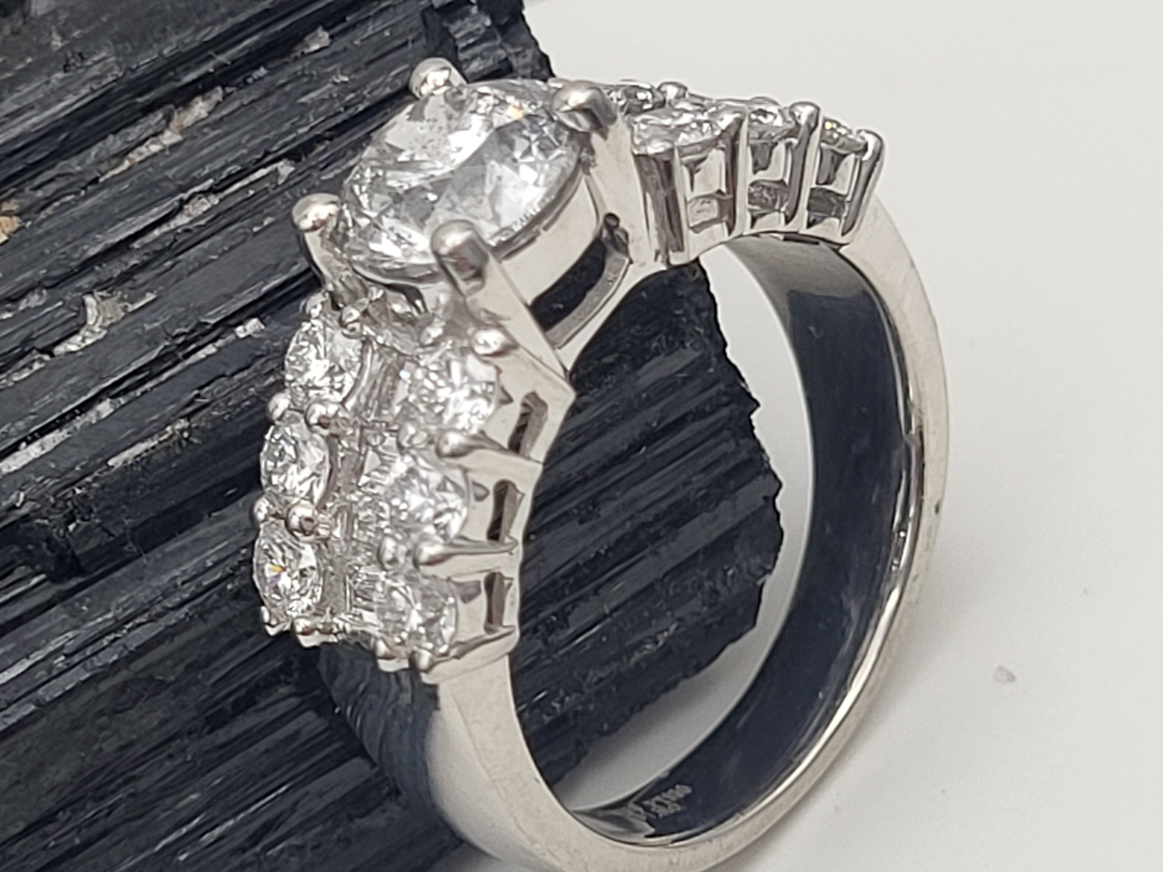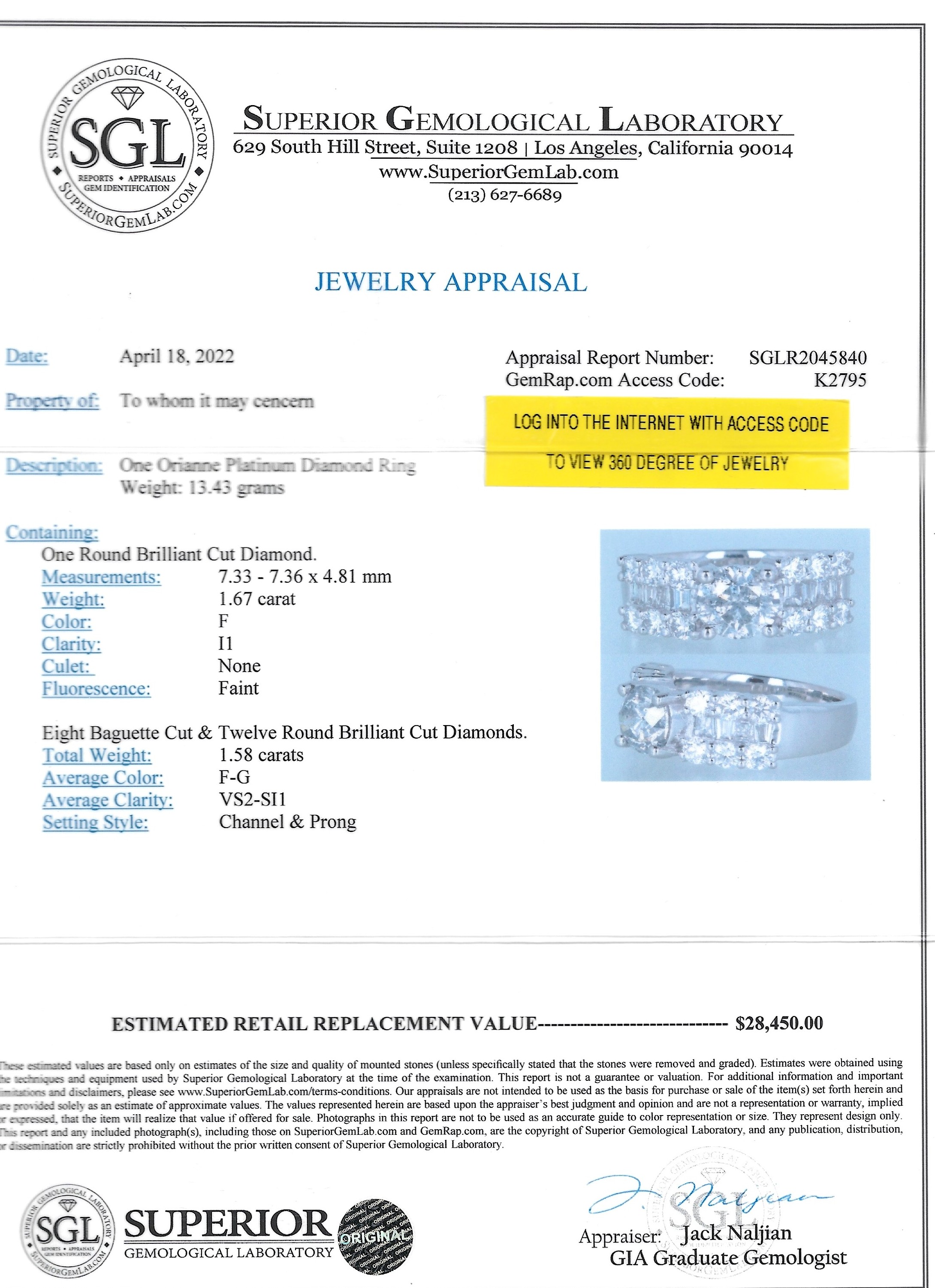 This ladies ring is cast in fine .950 platinum with 1.58 carats of round, brilliant-cut, and tapered baguette-cut, F-G color, VS2-SI1 clarity diamonds on the slightly pinched shoulders. The ring features a 1.67 carat round, brilliant-cut, F color, I1 clarity diamond in the center. The main diamond is well-set, with four platinum prongs and a strong gallery rail. This ring is US size 6.5 and may be sized for an additional charge, if desired. Please contact Bidfair Fine Jewery for more information. Admin: E7159