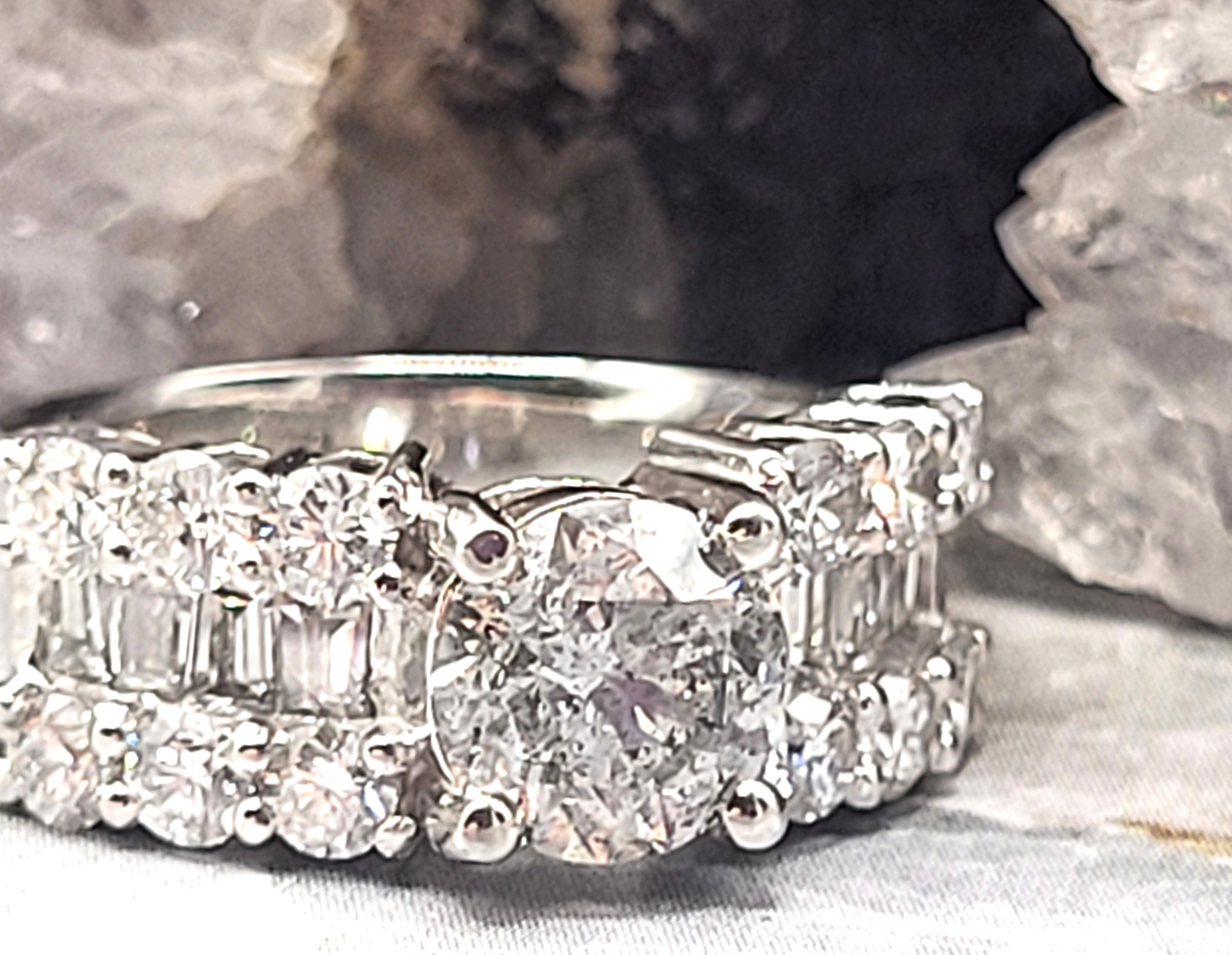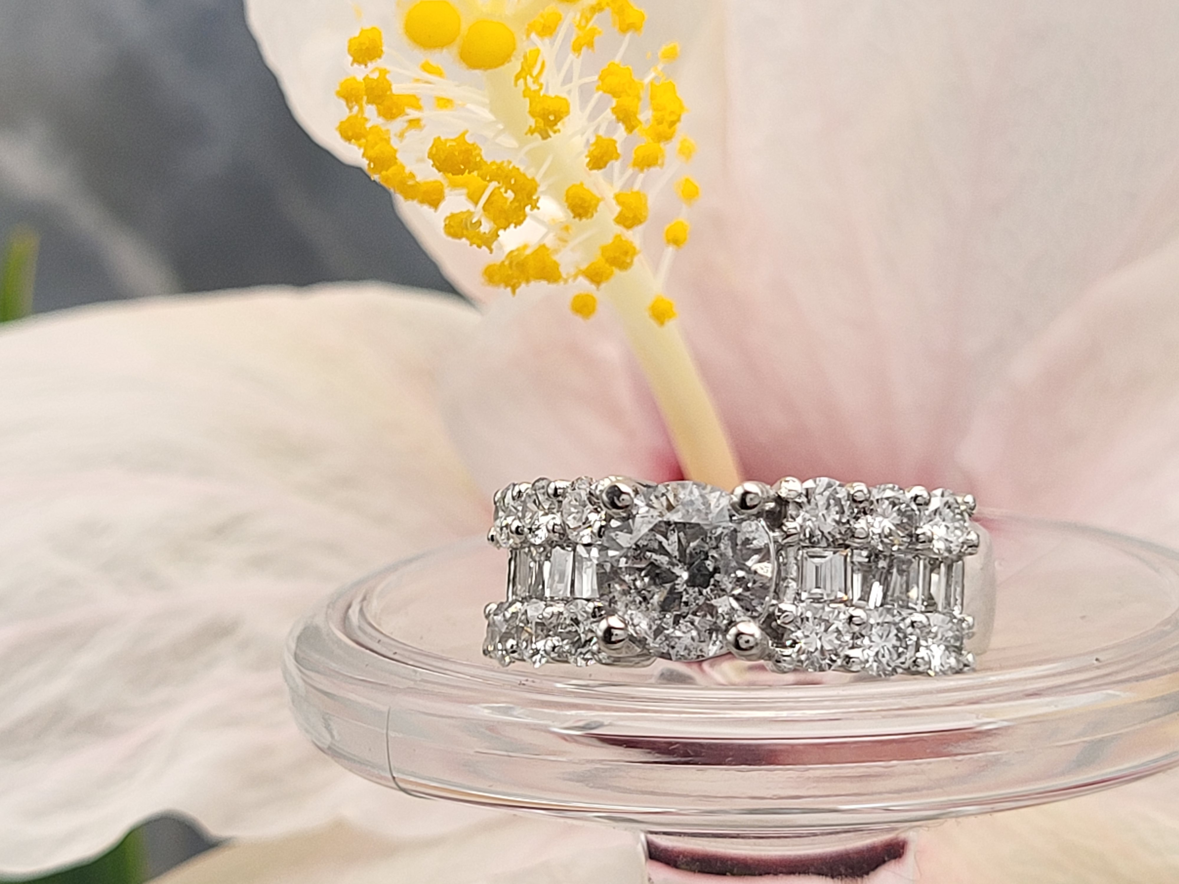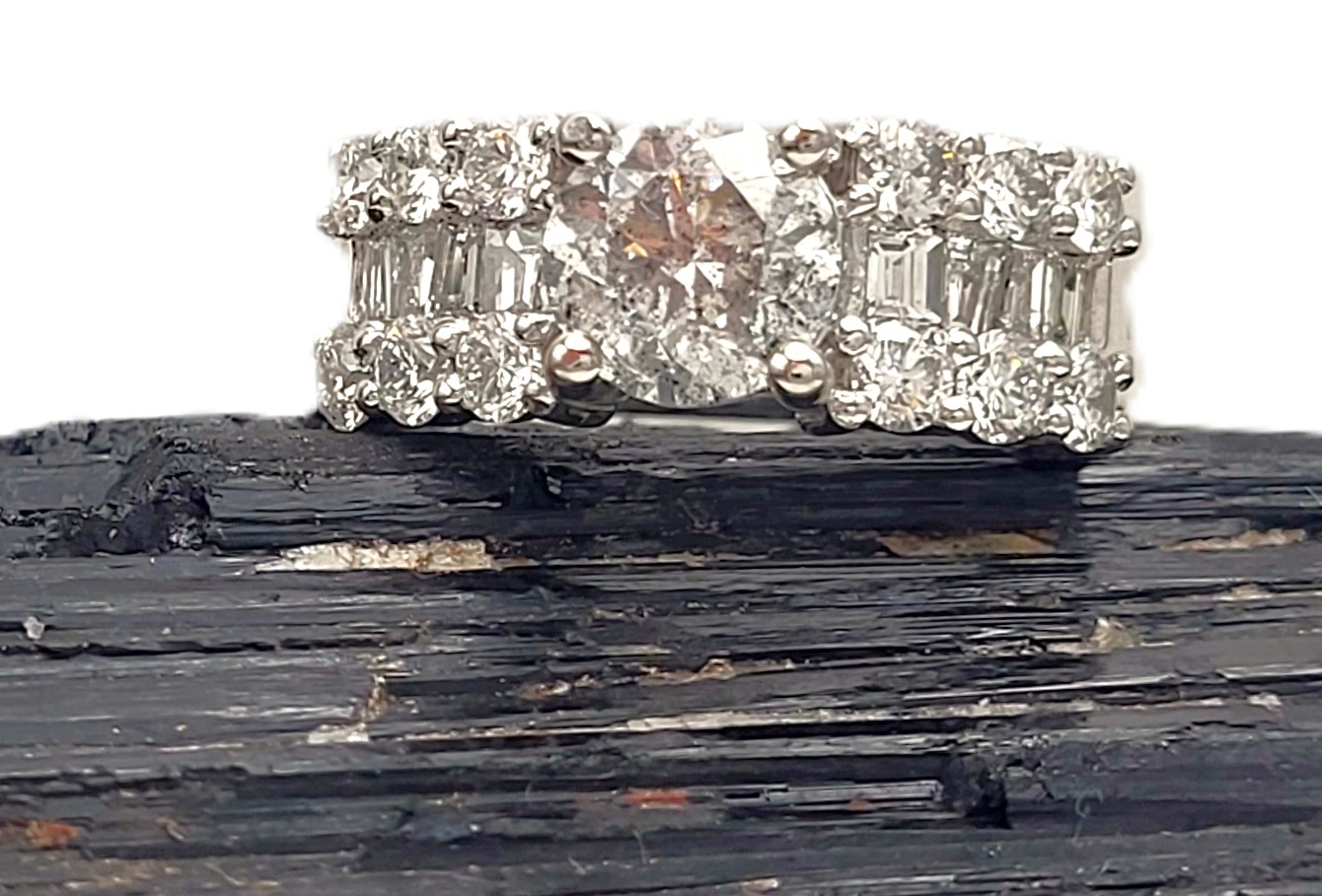 This ladies ring is cast in fine .950 platinum with 1.58 carats of round, brilliant-cut, and tapered baguette-cut, F-G color, VS2-SI1 clarity diamonds on the slightly pinched shoulders. The ring features a 1.67 carat round, brilliant-cut, F color, I1 clarity diamond in the center. The main diamond is well-set, with four platinum prongs and a strong gallery rail. This ring is US size 6.5 and may be sized for an additional charge, if desired. Please contact Bidfair Fine Jewery for more information. Admin: E7159