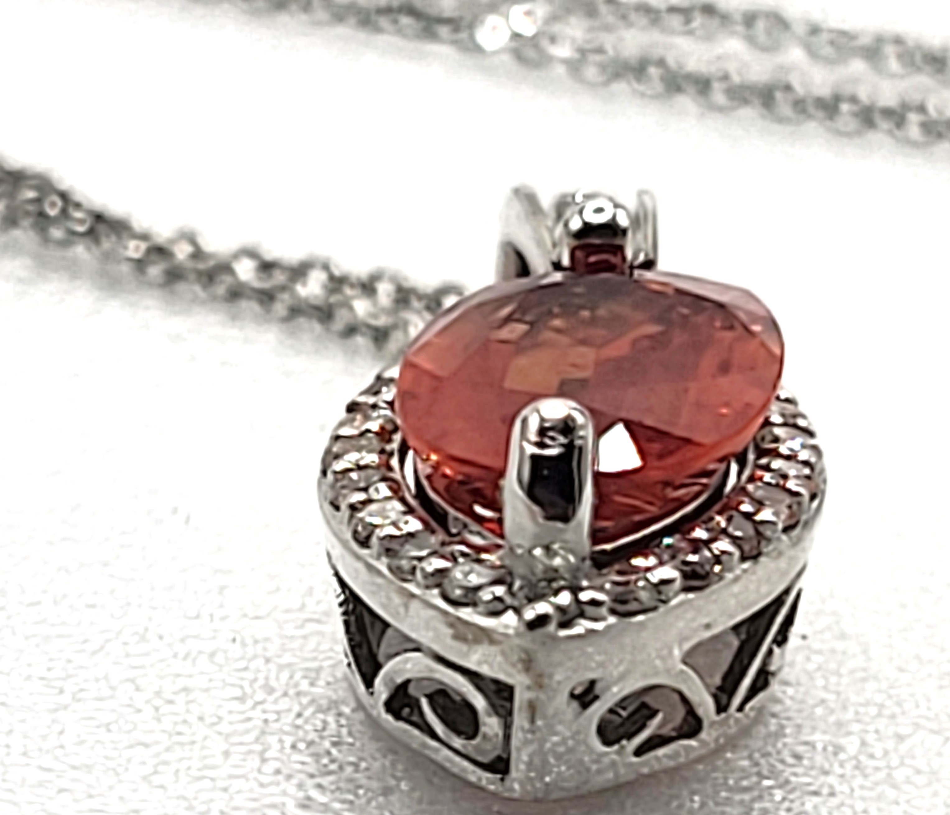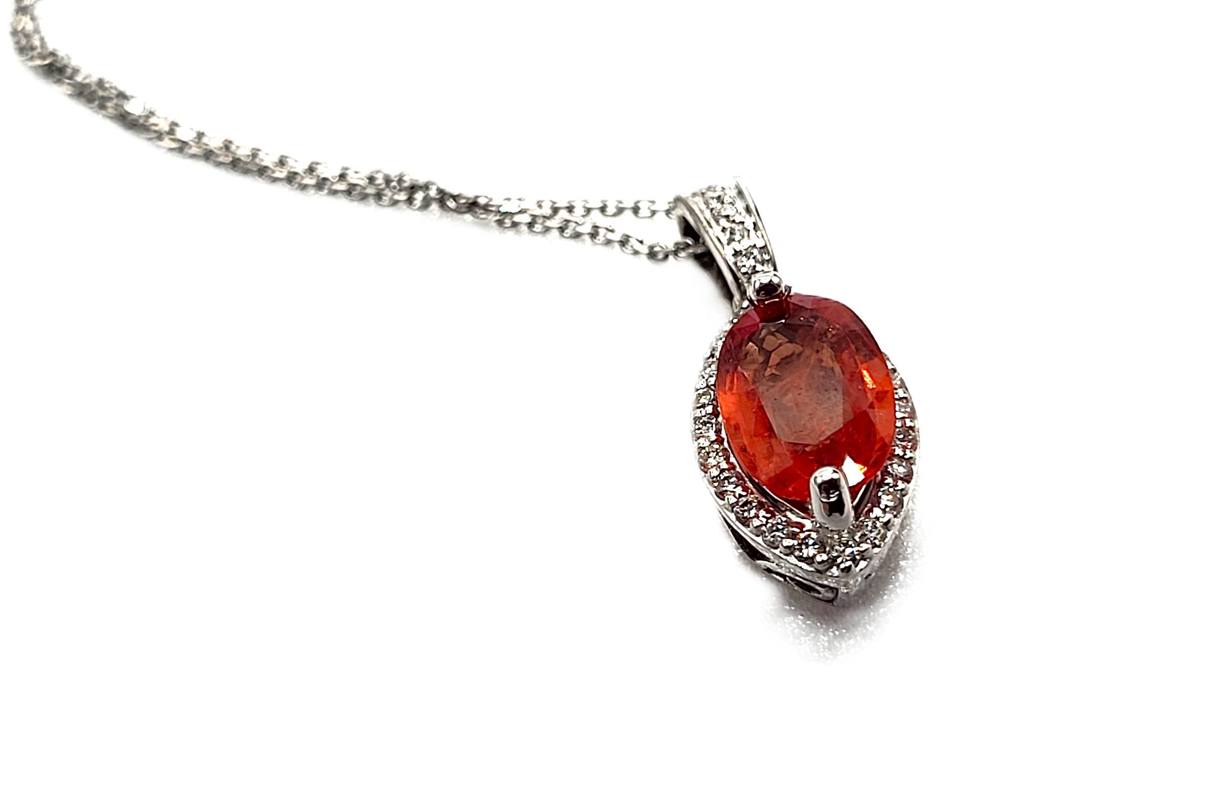 A 1.39 carat oval-cut, genuine orange sapphire is prong-set in a navette-shaped 14 karat white god pendant with .15 carats total weight round, brilliant-cut, I color, I1-I2 clarity diamonds in the floating halo and bail. The pendant has a ribbed back gallery for better balance and hangs from an 18" fine link chain with spring ring. Admin: e7159/6-nhg