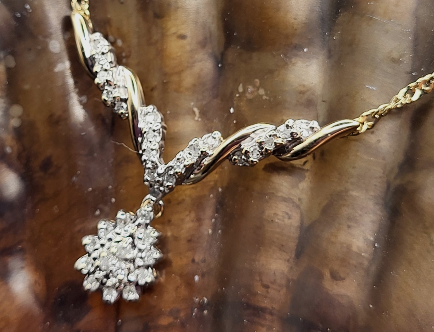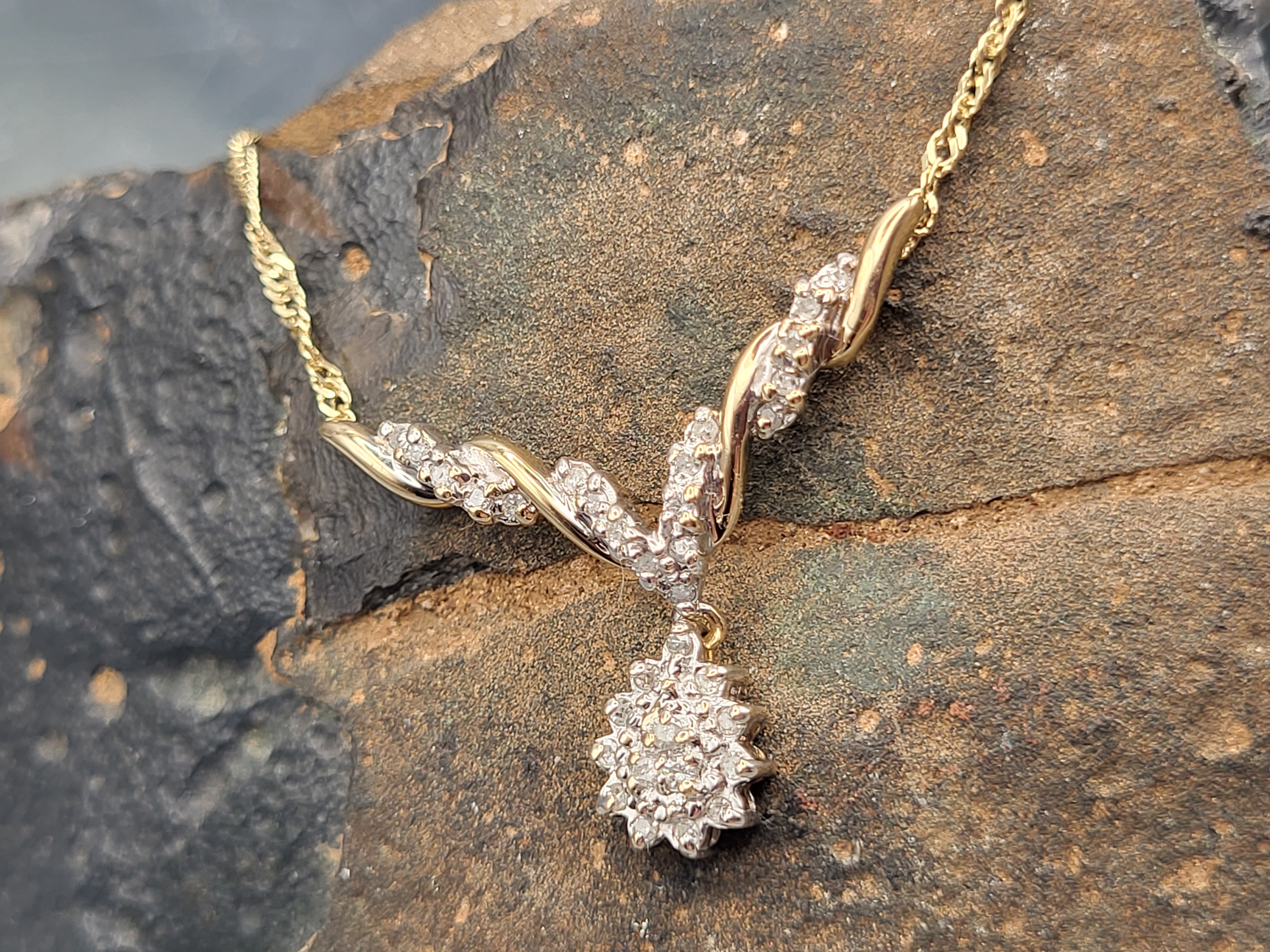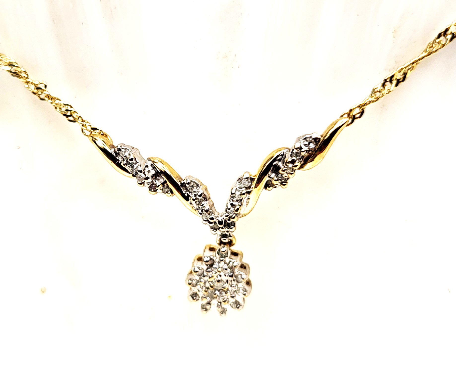 This vintage 10 karat yellow gold necklace gleams with gracefulness, as it features .25 carats of round, faceted, I color, I2 clarity, genuine, Earth-mined diamonds that are prong-set on tendril-like ribbons that spiral their way along the chevron and wind themselves into the teardrop festoon. The diamond chevron and drop hang from a sparkling 10 karat yellow gold Singapore chain. The necklace is 17.5" long with an additional 1/2" drop and closes with a lobster clasp. The drop bears the Andin International hallmark, model number of the design, and the diamond karat weight. The necklace is circa 1989-1990.