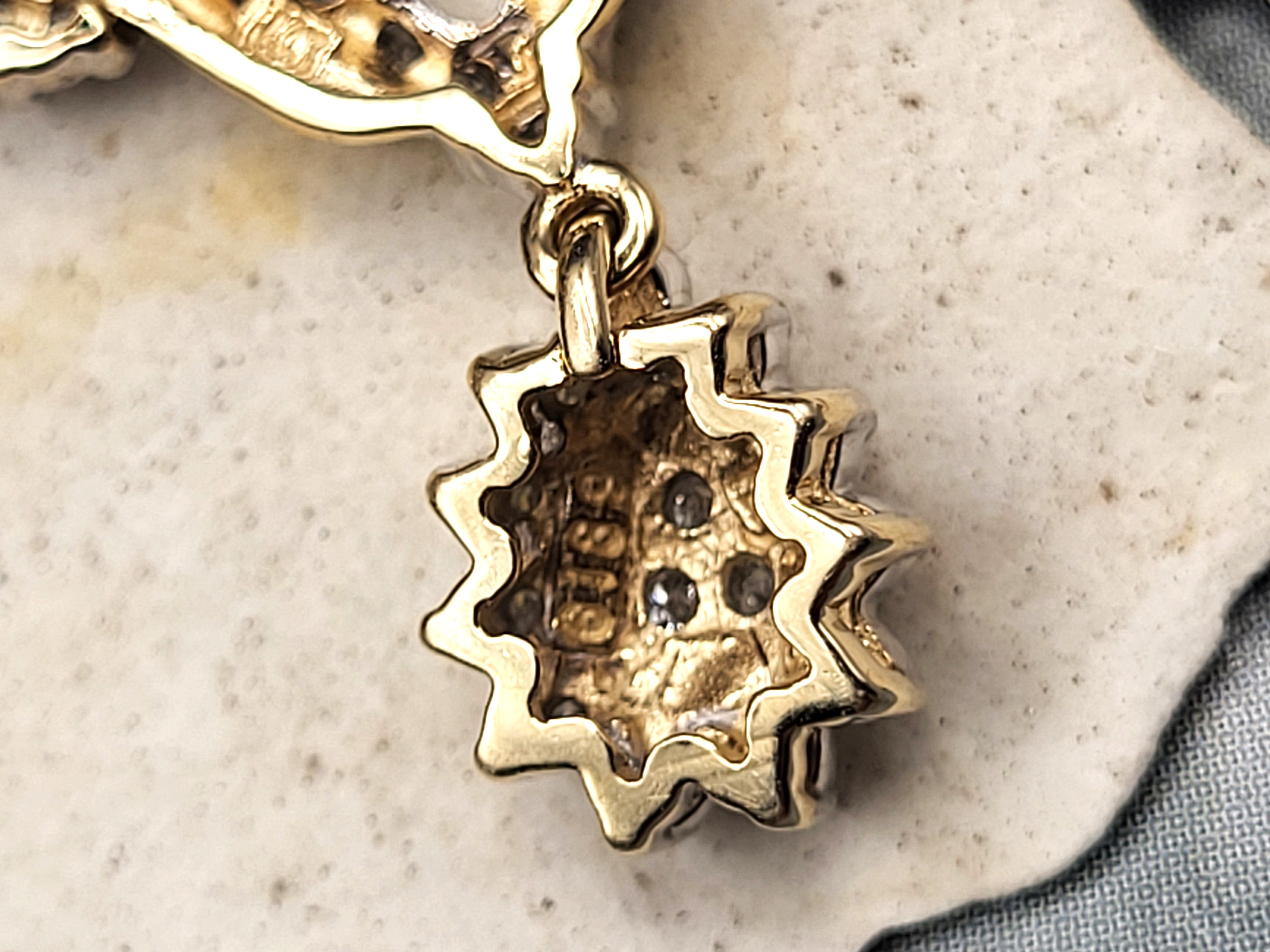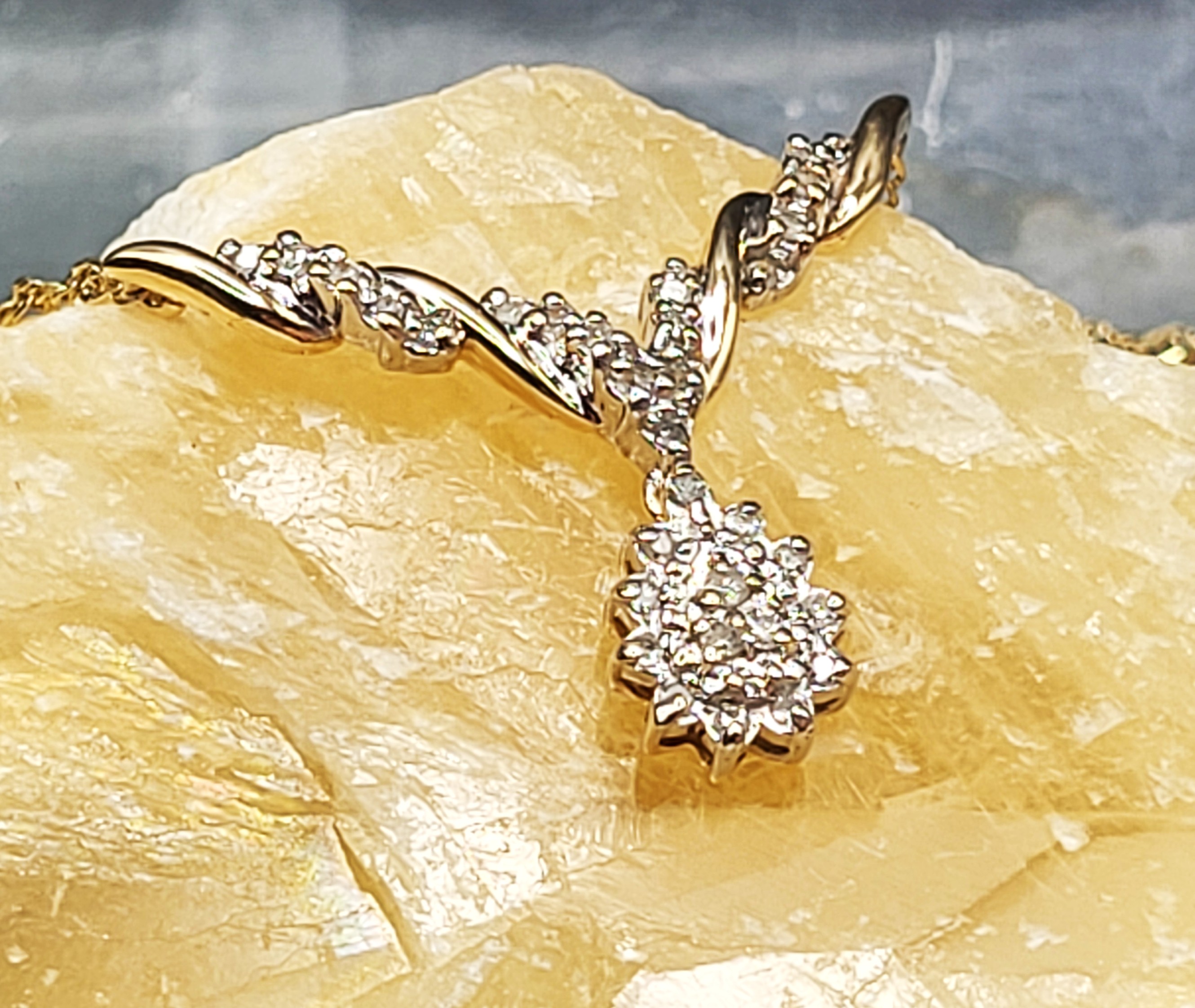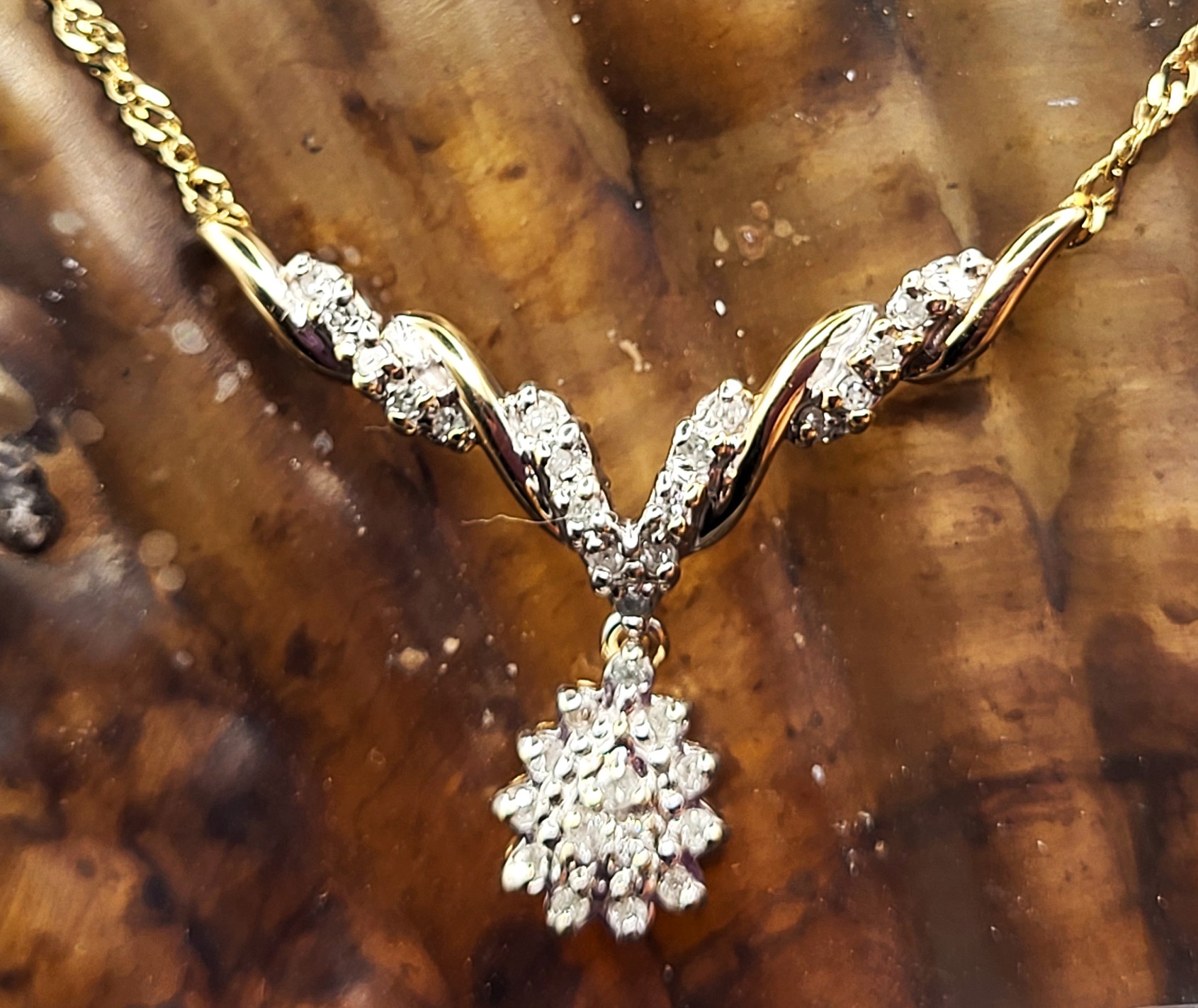 This vintage 10 karat yellow gold necklace gleams with gracefulness, as it features .25 carats of round, faceted, I color, I2 clarity, genuine, Earth-mined diamonds that are prong-set on tendril-like ribbons that spiral their way along the chevron and wind themselves into the teardrop festoon. The diamond chevron and drop hang from a sparkling 10 karat yellow gold Singapore chain. The necklace is 17.5" long with an additional 1/2" drop and closes with a lobster clasp. The drop bears the Andin International hallmark, model number of the design, and the diamond karat weight. The necklace is circa 1989-1990.