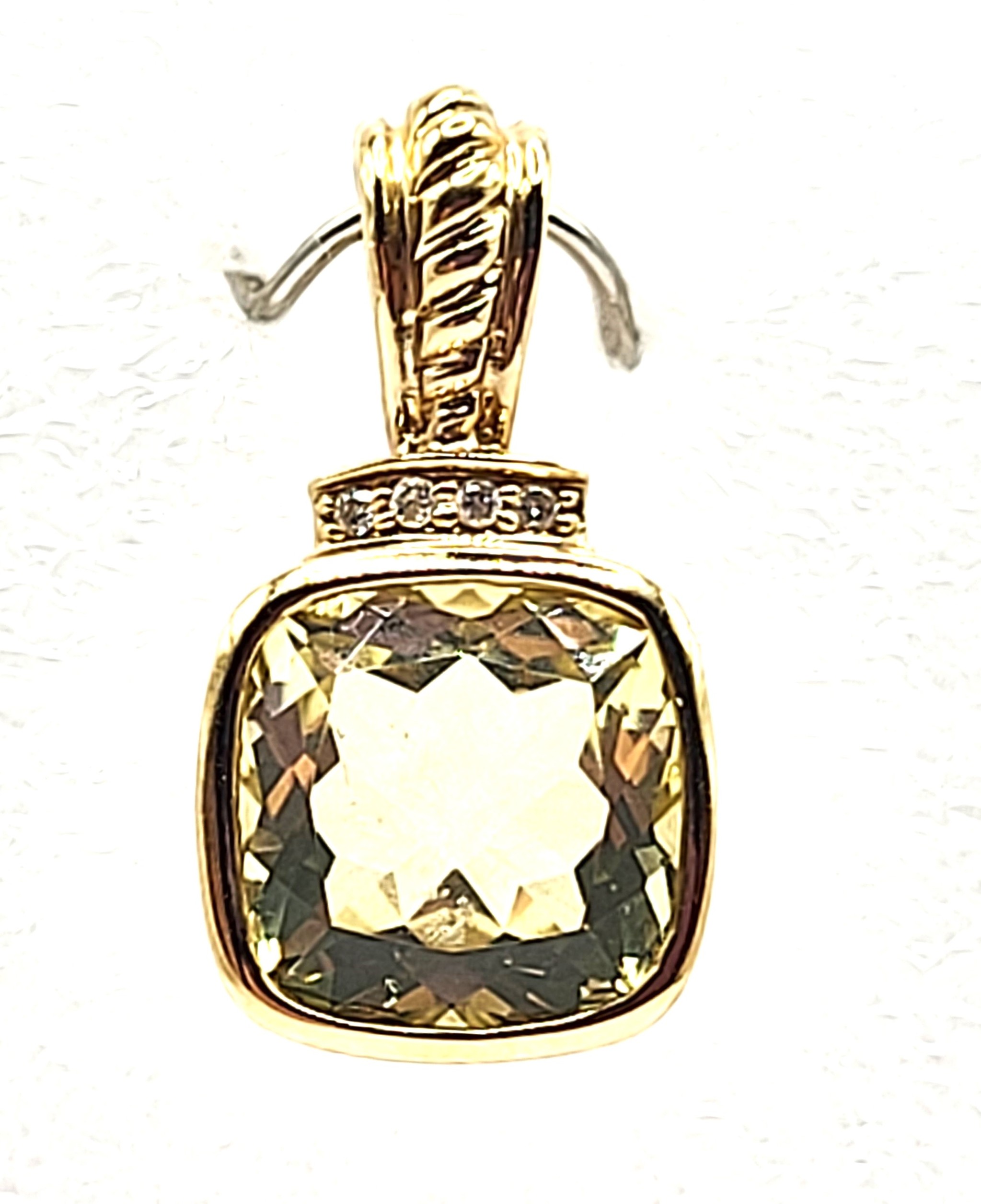 This is a 14 karat yellow gold pendant that features an amazing 3.36 carat cushion-cut, bezel-set lemon quartz and .02 carats total weight of round, brilliant-cut, H color, SI2-I1 clarity diamonds for accent along the topl The pendant has a solid bail with gold beads that can accommodate an approximate 2.5mm wide chain.