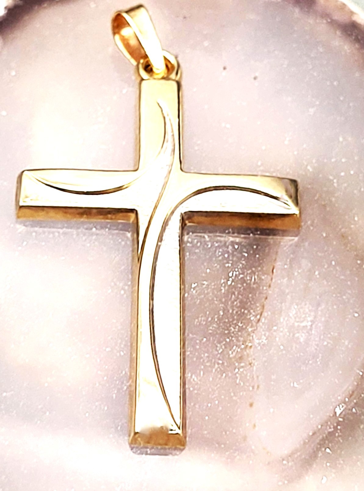This 14 karat two-tone gold cross is modestly-sized, yet so attractive with the raised, swirled, bypass representation of the crucifix. The swirled design joins smooth, polished yellow gold with finely textured white gold. The cross is approximately 1.5" x .75" and has a solid bail that can accommodate an approximate 2.75mm chain. The pendant is stamped with the gold quality and hallmark on the back. Admin: TV4/og