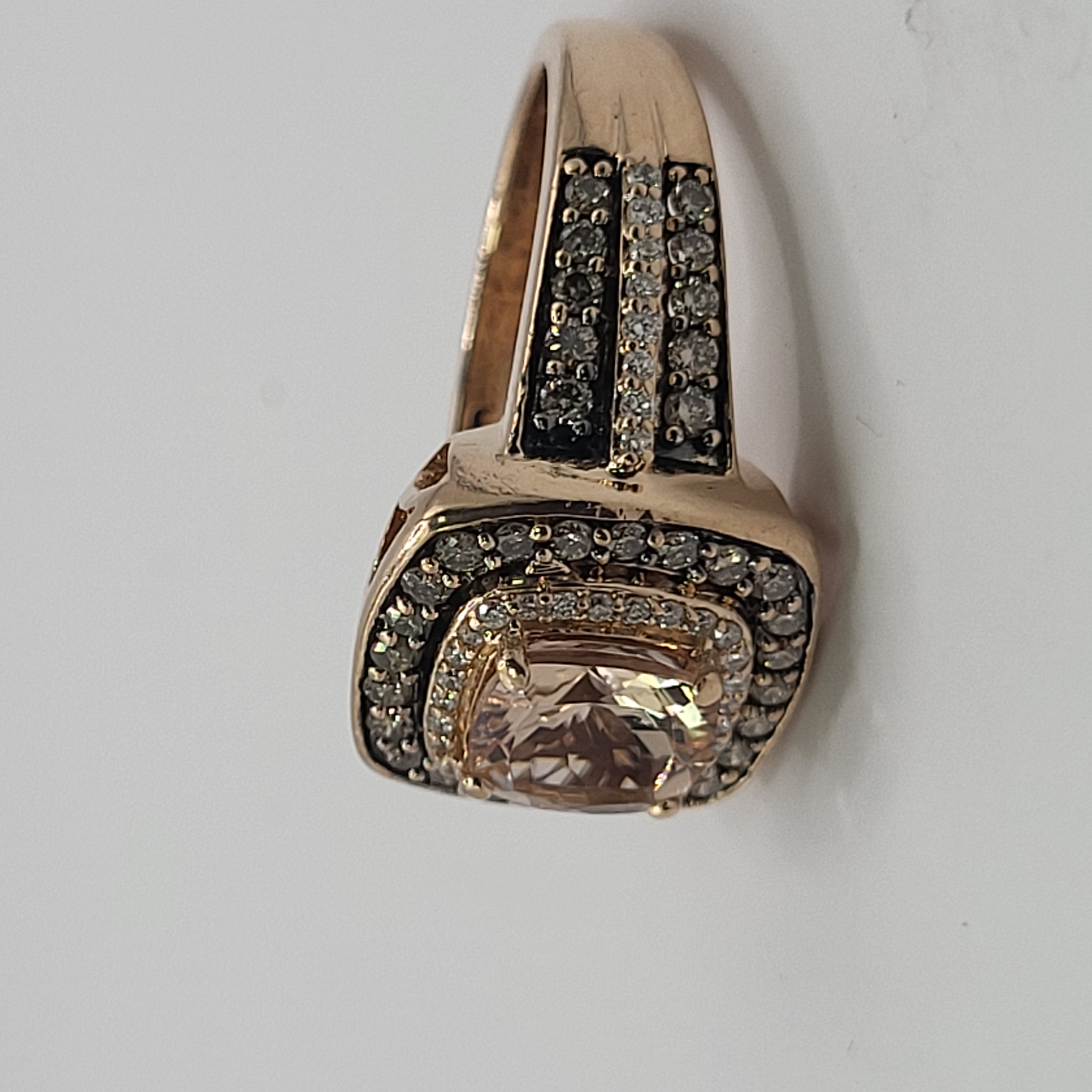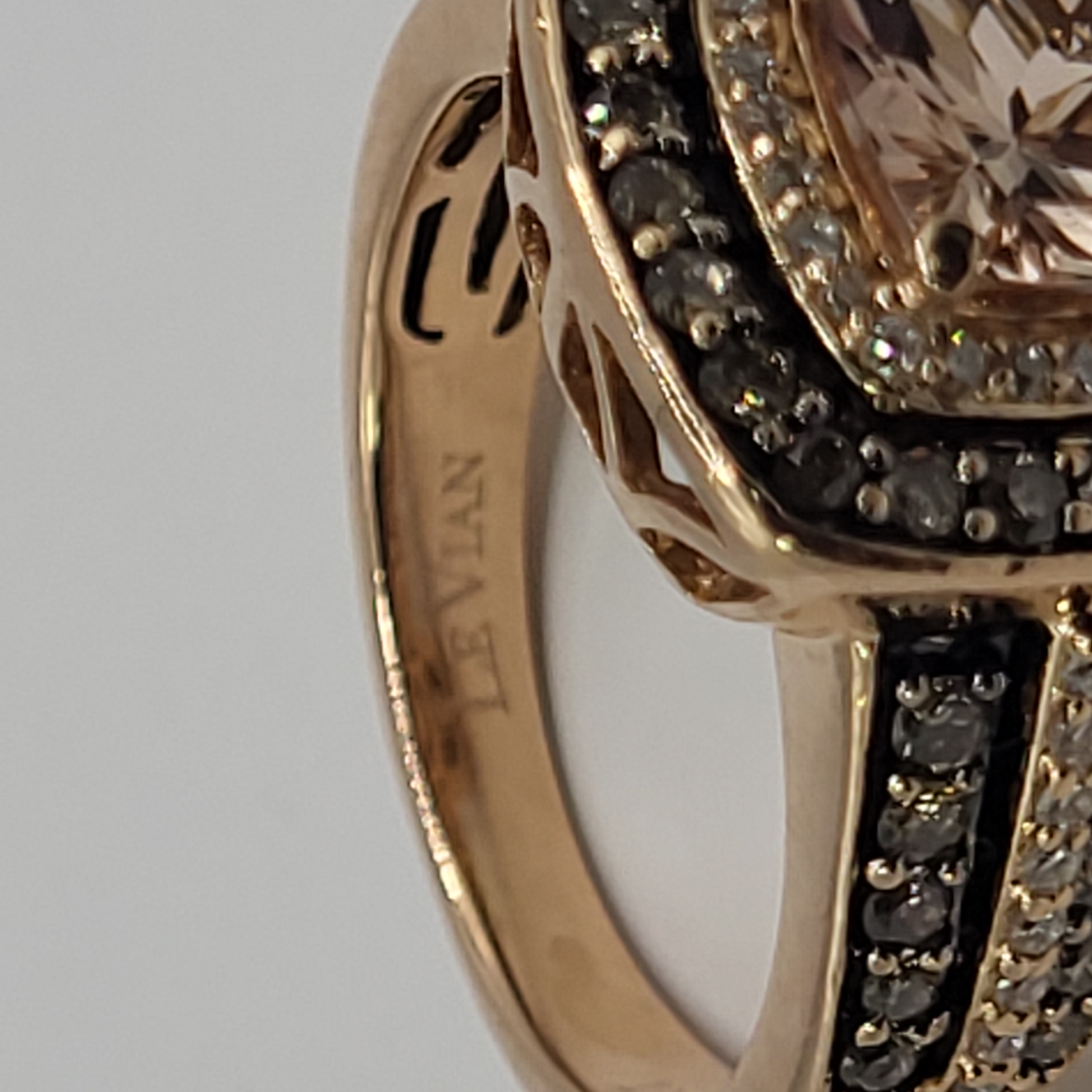 This 14 karat rose gold ring bears the LeVian hallmark and features an approximate 2.00 carat cushion-cut Morganite. The ensemble of color and quality crafted style make this one of the most iconic of the LeVian designs. The ring has a wide, cushion-shaped frame and wide, tiered shoulders, set with approximately 1.00 carats total weight of SI clarity chocolate and vanilla diamonds There is a supportive under gallery and raised trussed gallery. This ring is a US size 7 and can be sized for an additional charge. Please contact Bidfair Fine Jewelry for sizing details. Rest assured, the master jeweler Bidfair Fine Jewelry partners with for sizing will NOT destroy the hallmark. Are you considering having this ring appraised? If you are the winning bidder and desire an appraisal, an independent GIA graduate gemologist is offering the service for a very low additional fee. Please contact Bidfair Fine Jewelry for more information on appraisals. Admin:33110/16irt