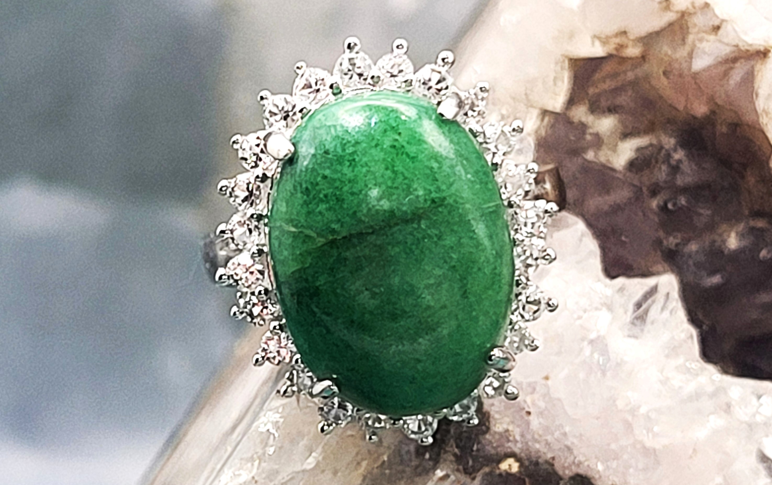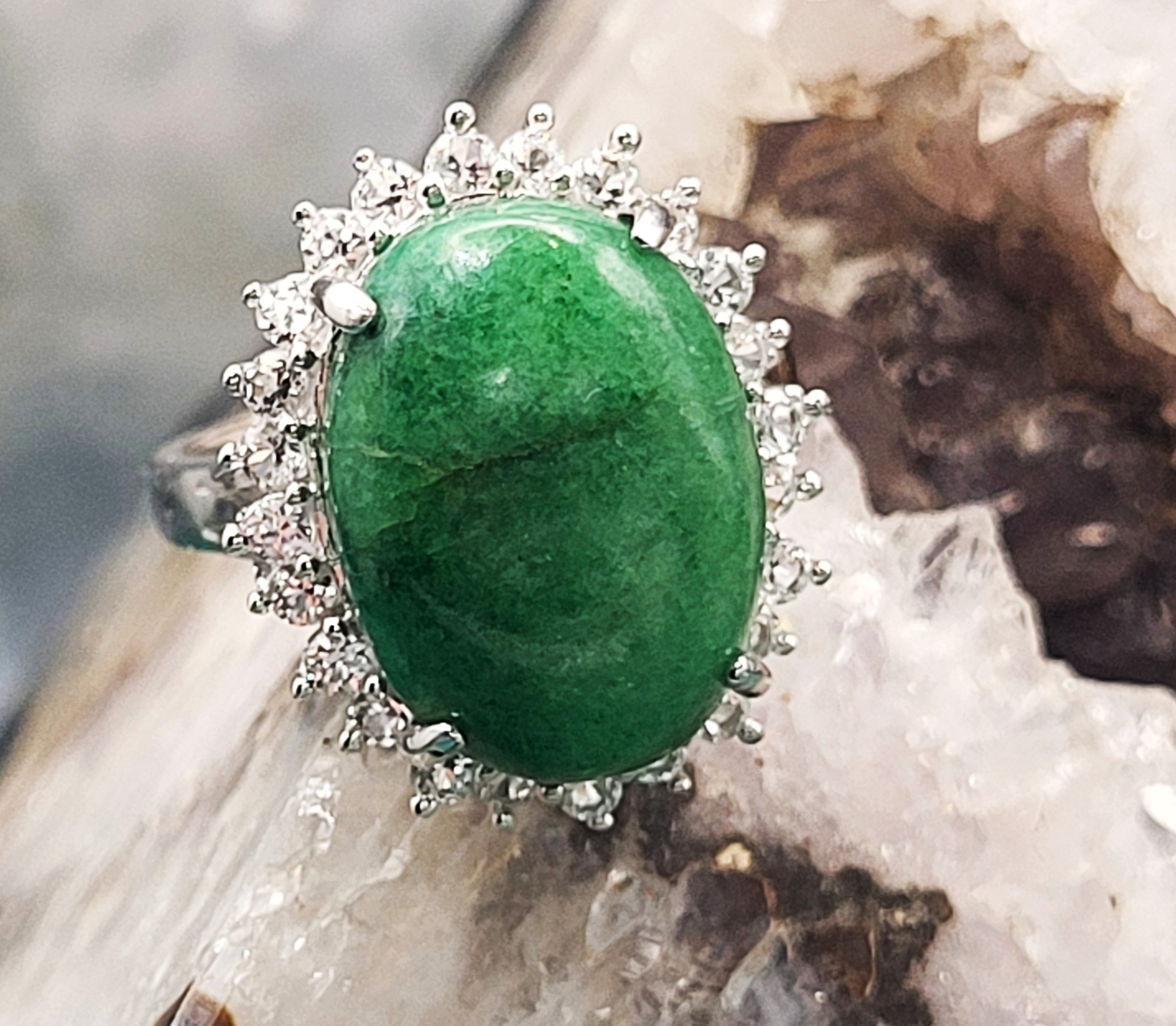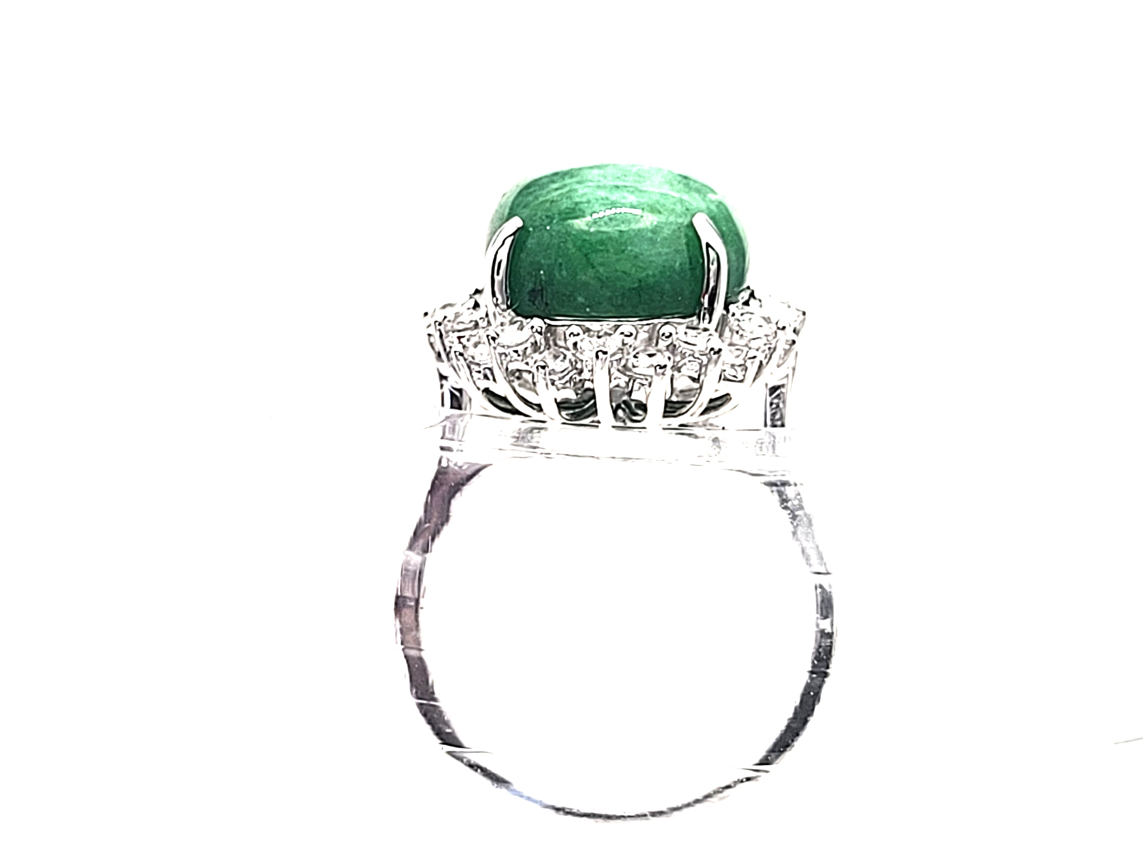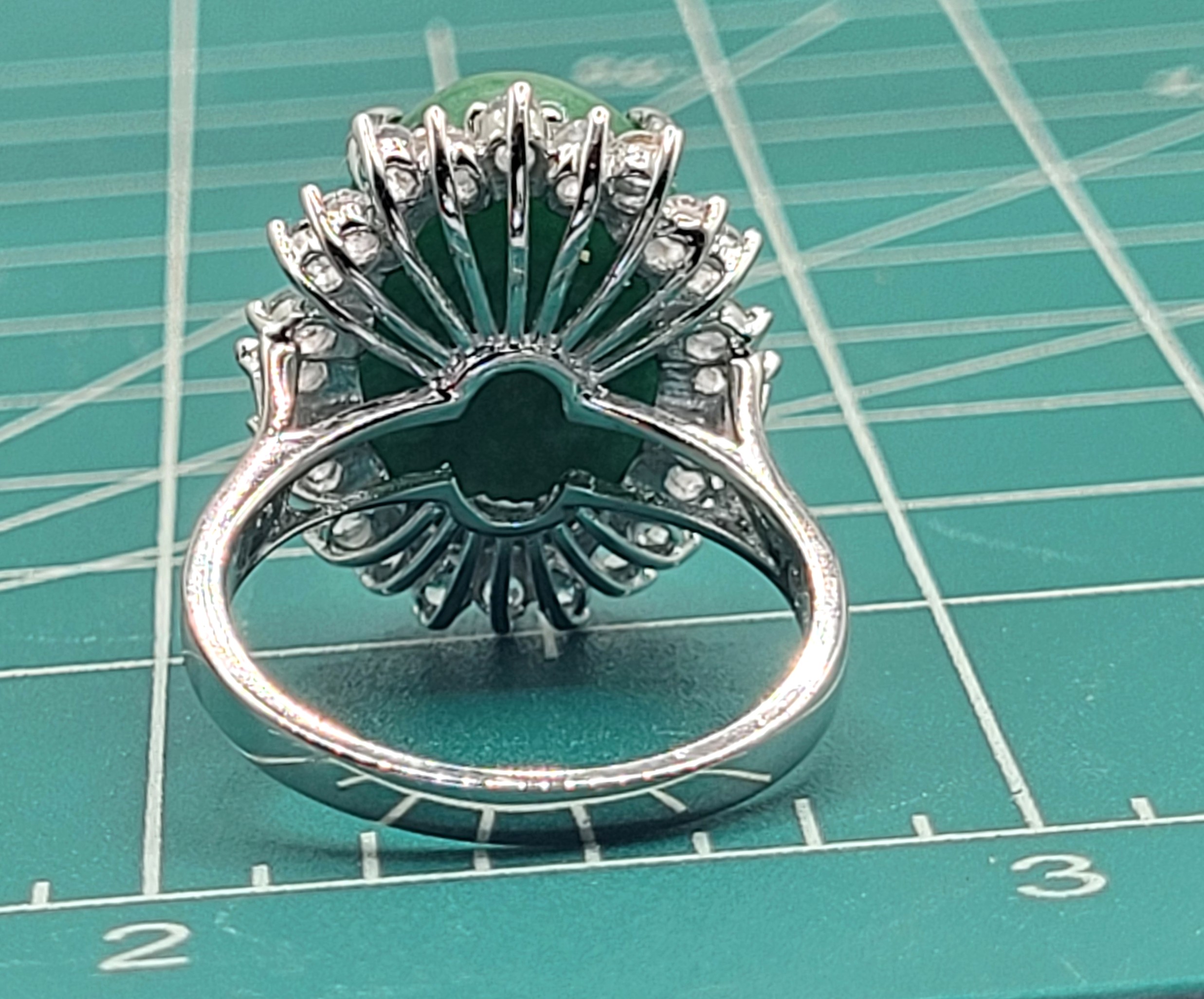 This sterling silver ladies’ ring sure does make a statement with its 11.00 carat, cabochon polished, claw-prong set green bery gemstone and 1.00 carats total weight of faceted and polished natural white sapphires. It is US size 7 and can be sized by any professional jeweler. Admin: E/