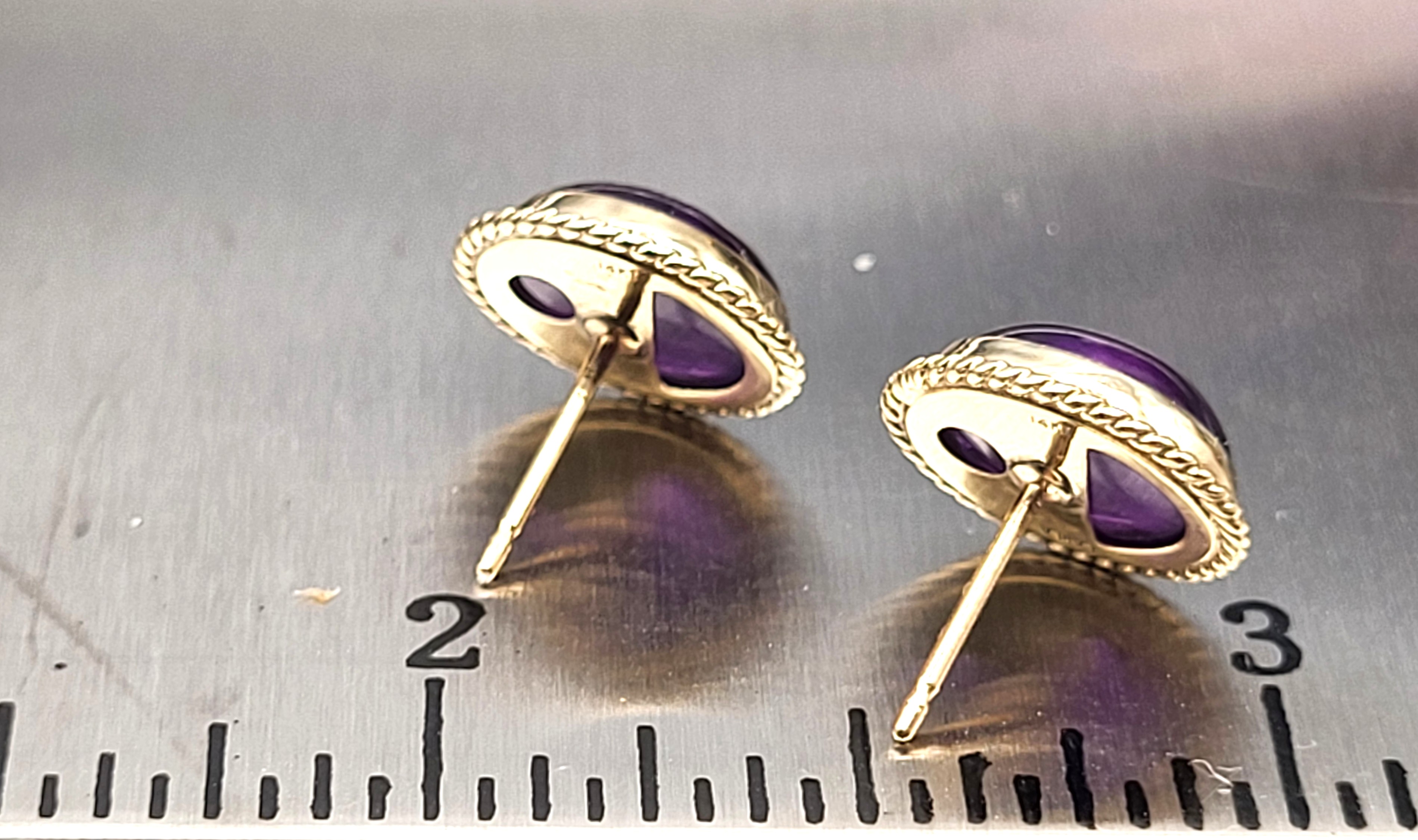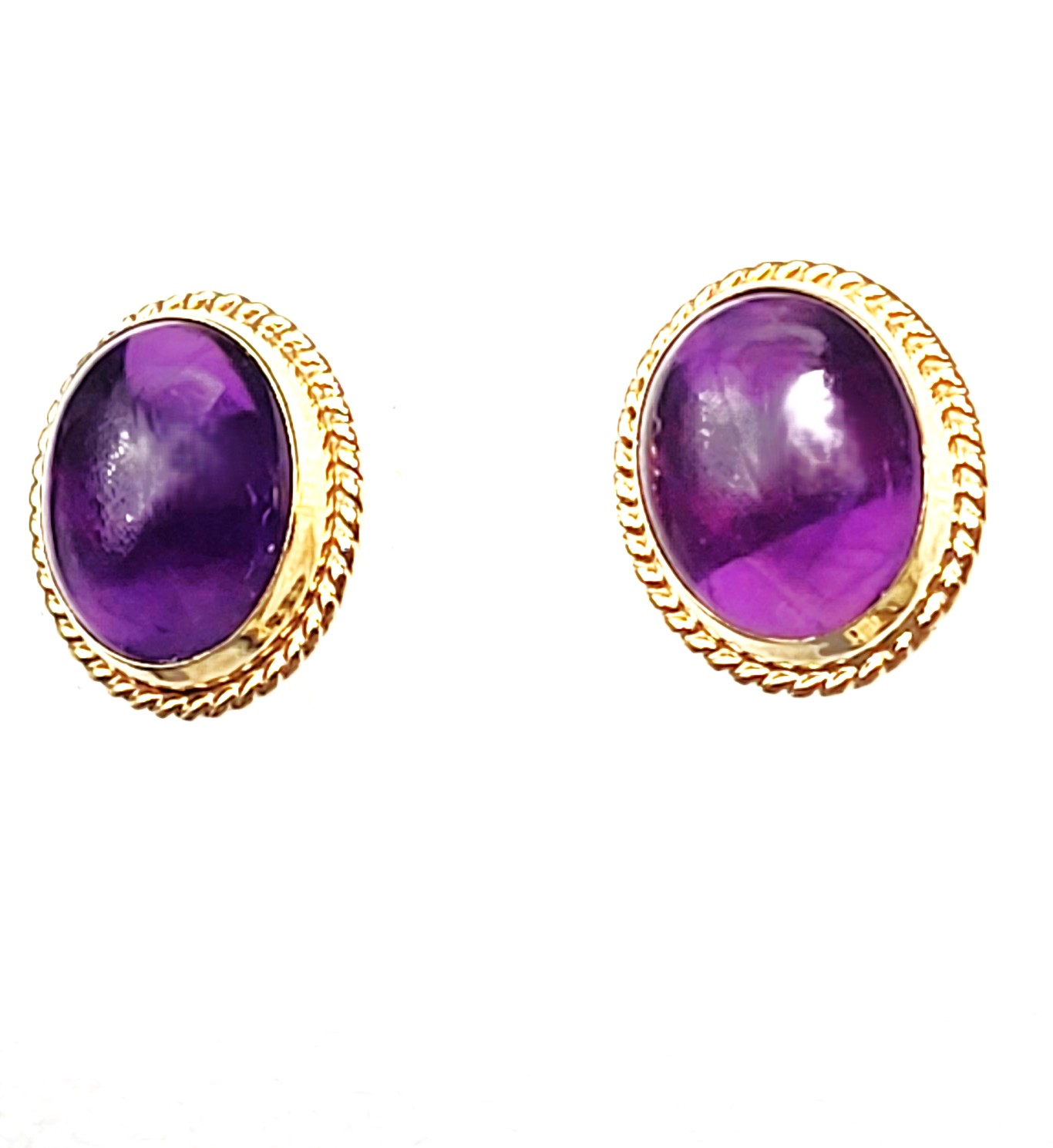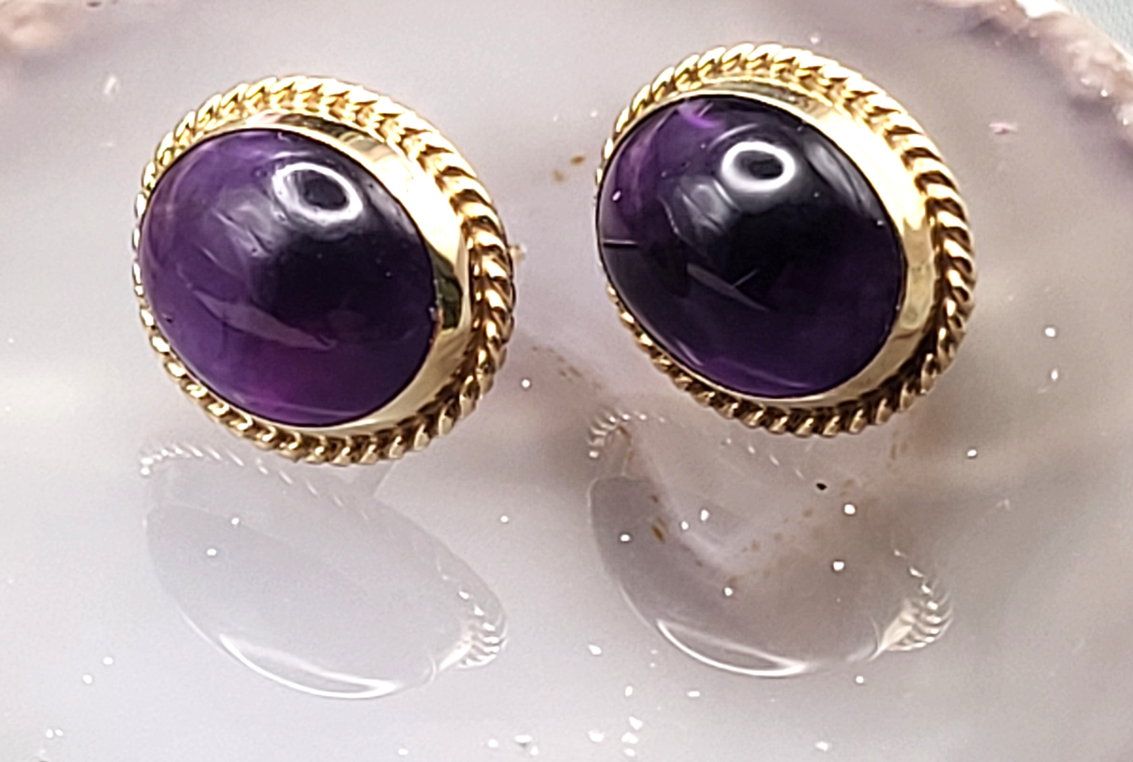 This pair of 14 karat yellow gold earrings features approximately 5.00 carats total weight of polished, oval cabochon, genuine amethysts bezel set with a twisted rope frame. The earrings are approximately 1/2" x 3/8" and attach to the earlobe with posts and friction backs.