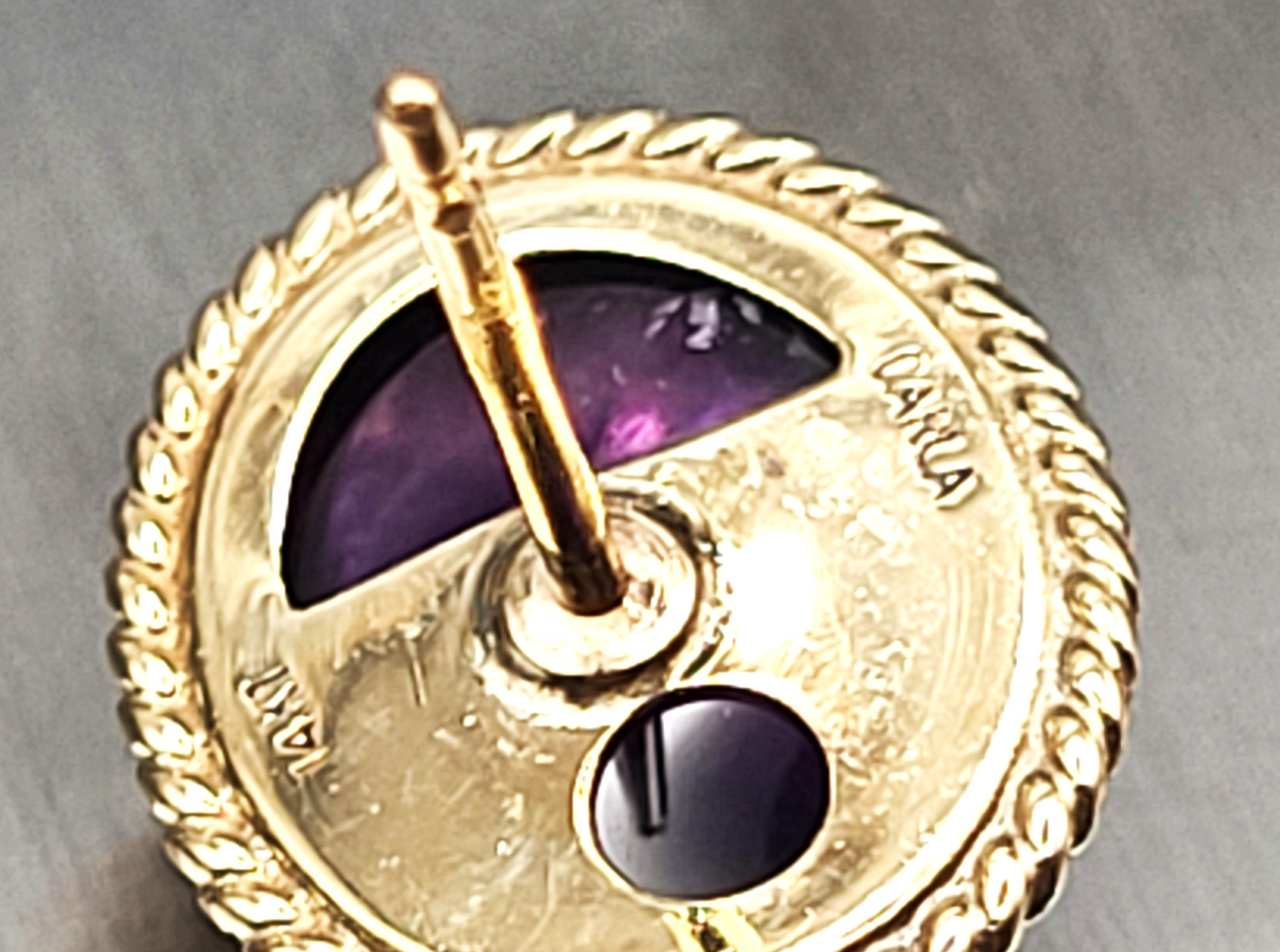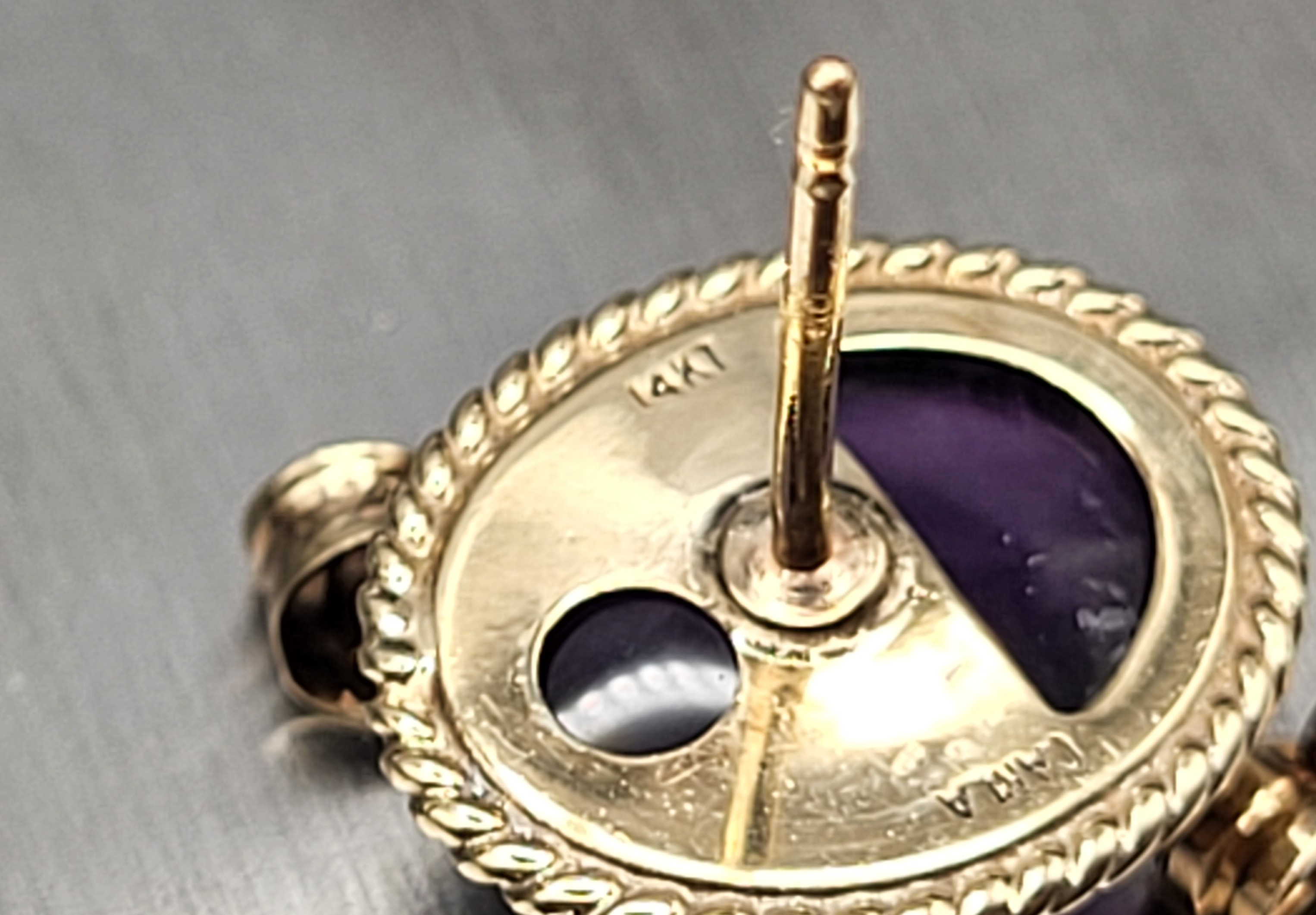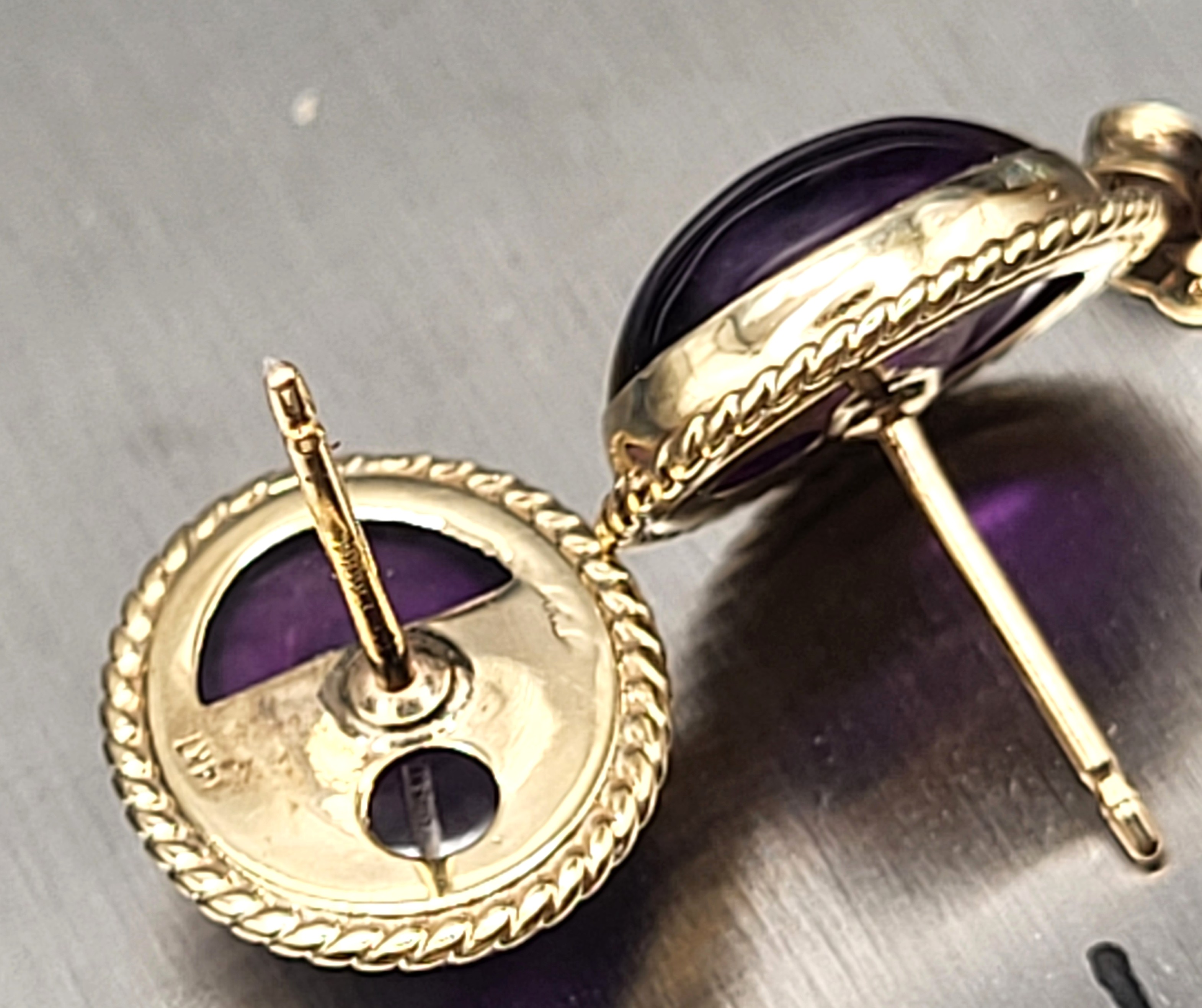 This pair of 14 karat yellow gold earrings features approximately 5.00 carats total weight of polished, oval cabochon, genuine amethysts bezel set with a twisted rope frame. The earrings are approximately 1/2" x 3/8" and attach to the earlobe with posts and friction backs.