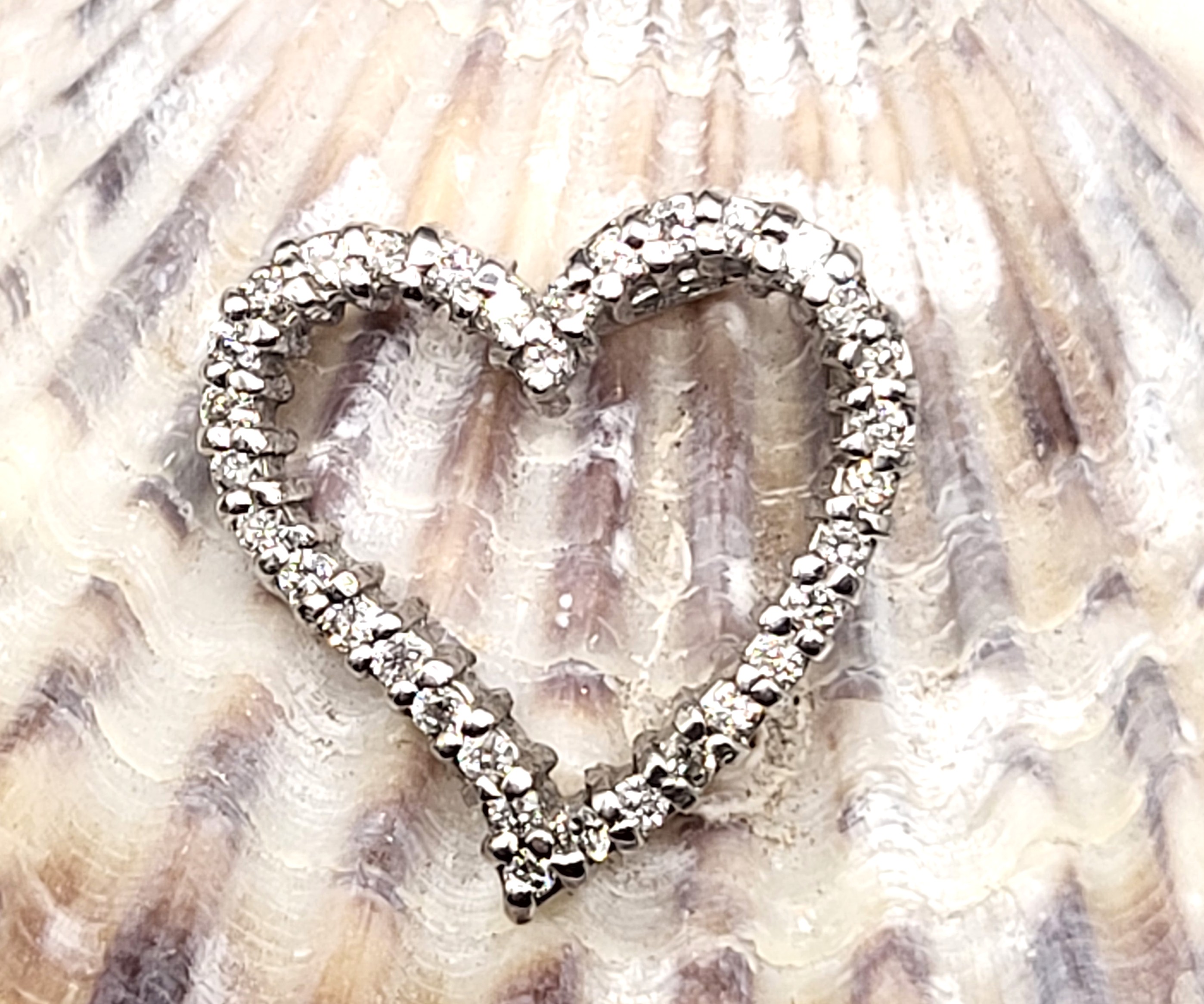 This is a 14 karat white gold heart-shaped pendant, set with .66 carats of round, brilliant-cut, I color, SI2-I1 clarity diamonds and two hidden bails that can accommodate an approximate 2.75mm wide chain. The heart is approximately 3/4" in diameter and has a curved sway and open center. This is a pendant only and does NOT include a chain. Admin: G11241/16ett