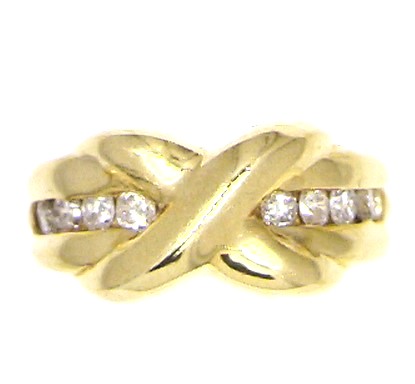 This 14 karat yellow gold ring is set with .54 carats total weight round, brilliant-cut, H color, SI2-I1 clarity, earth-mined diamonds. The "kiss" in the center of the channel-set diamonds is like a strong embrace that bonds each side together, as one. The ring is approximately 9.75mm at the top and tapers to approximately 3.8mm shank. It is US size 6.5 and can be sized for an additional charge. Please contact Bidfair Fine Jewelry for sizing details. Admin: G11241/1grt