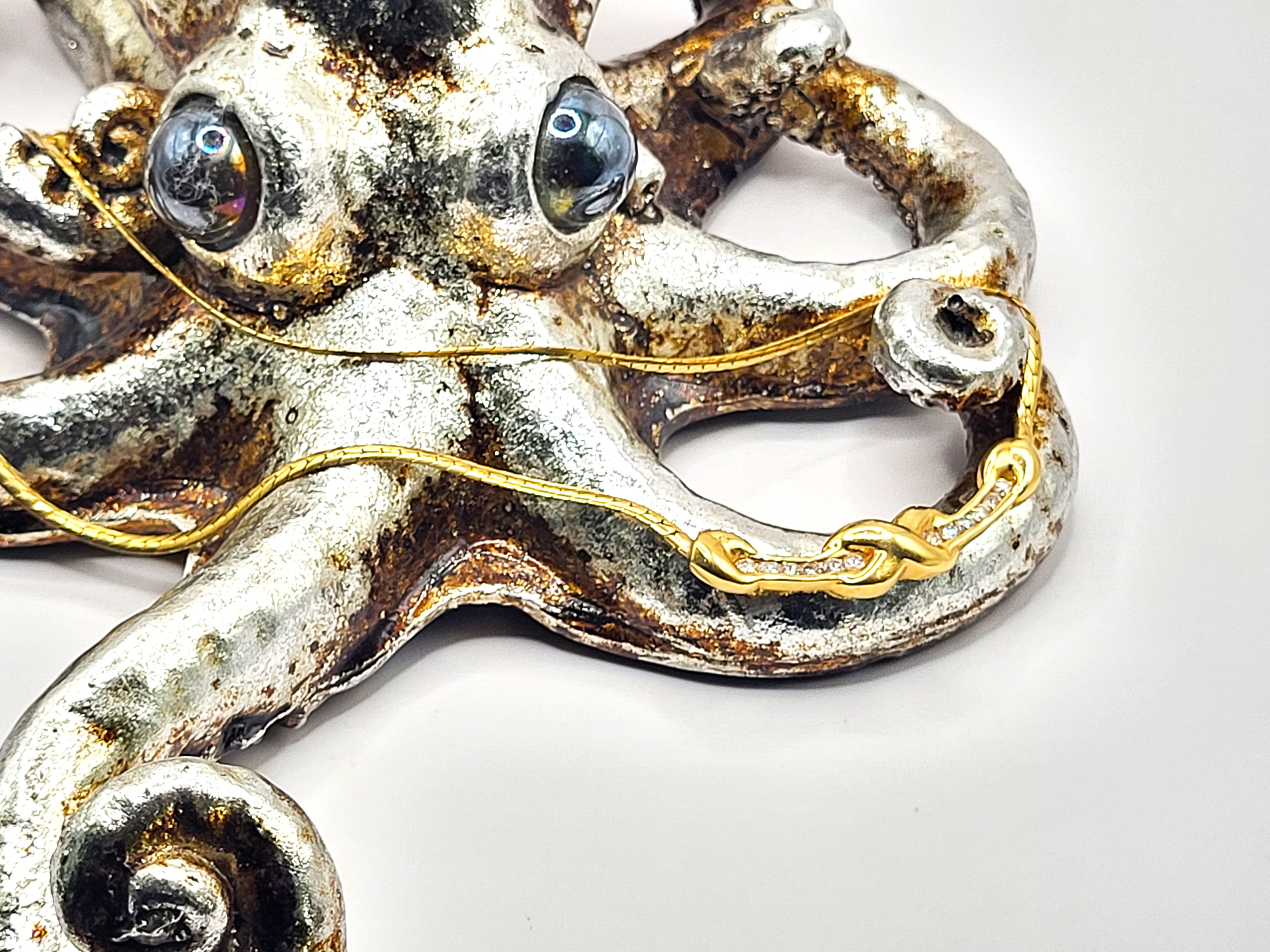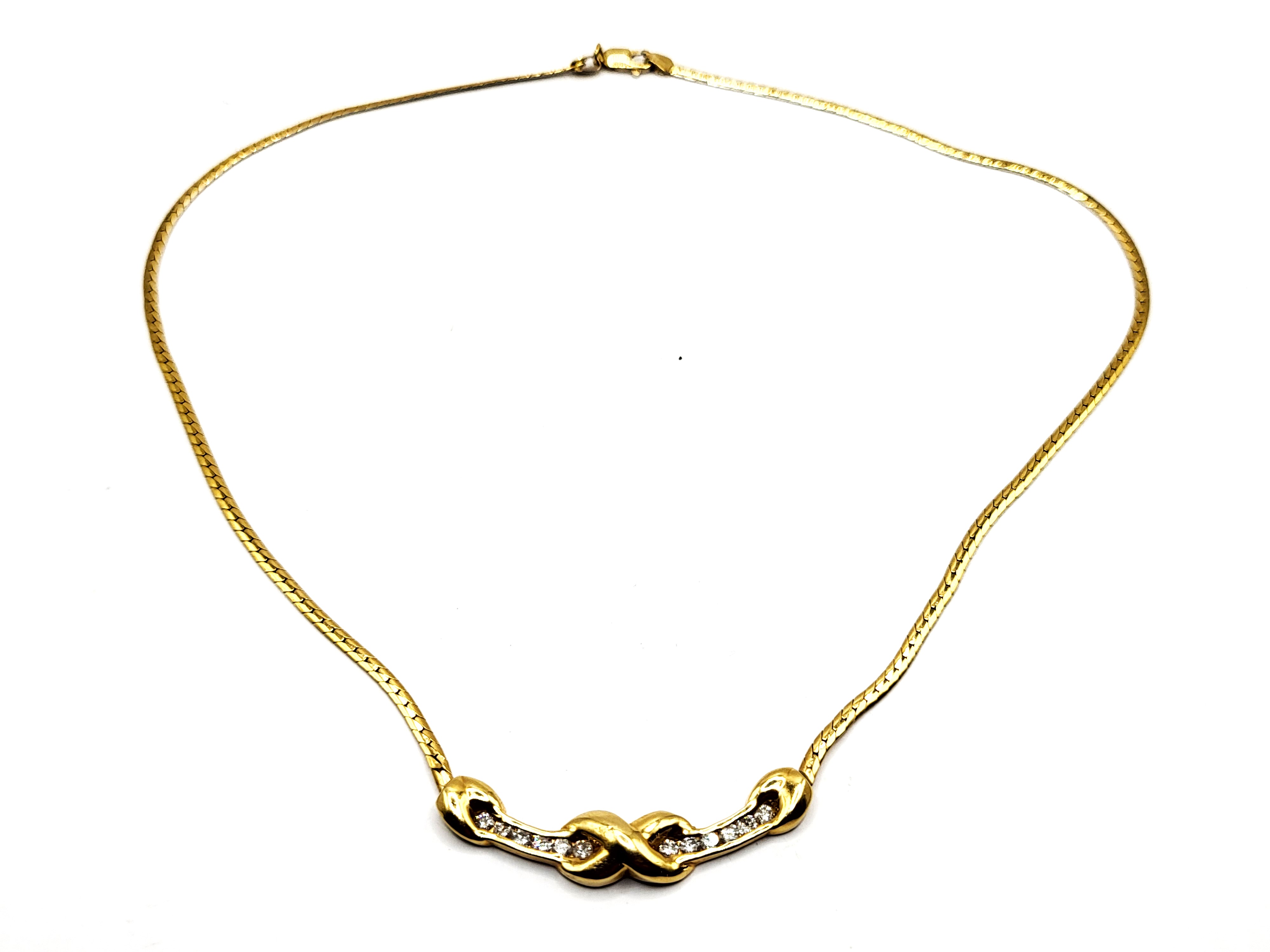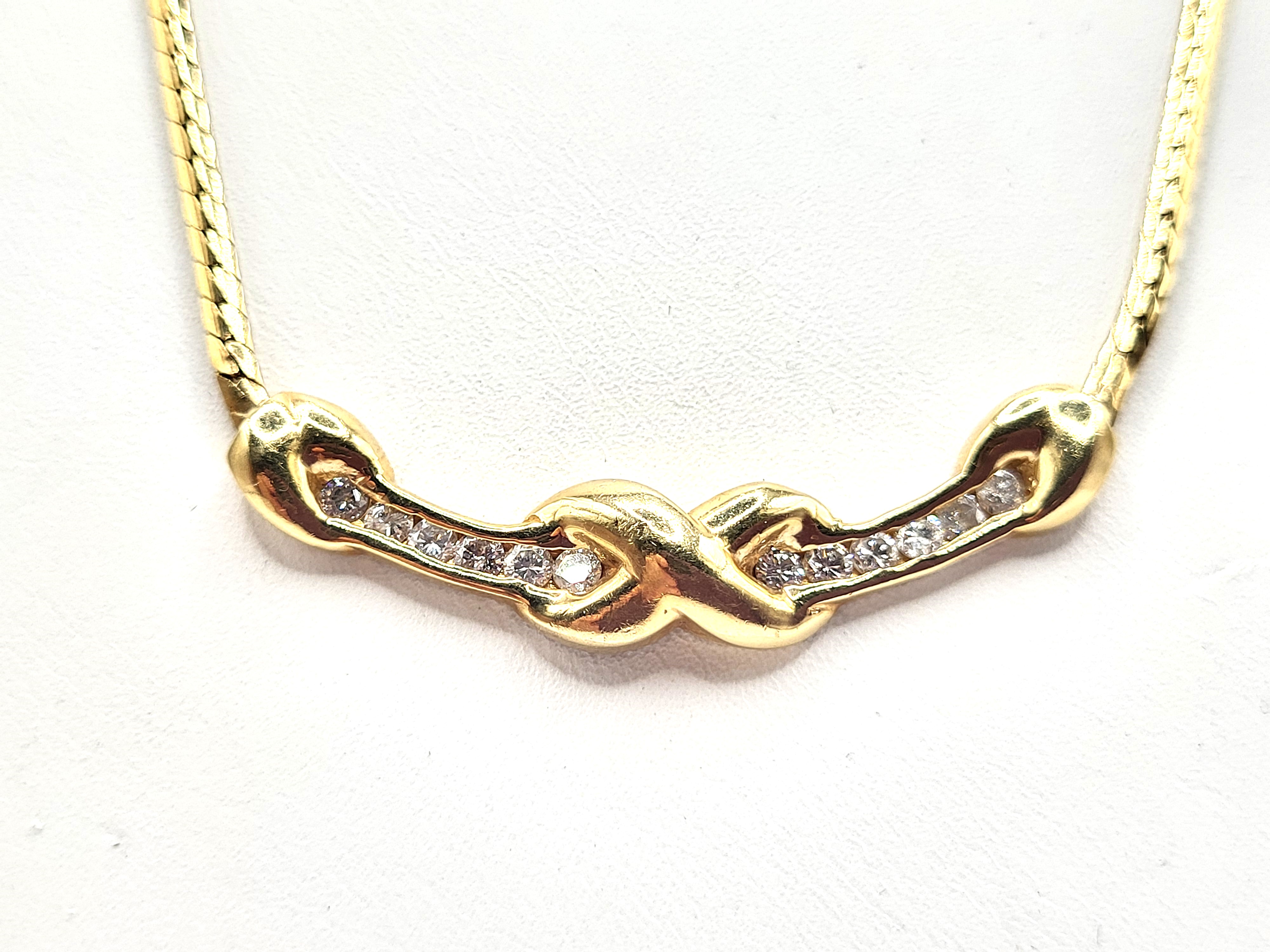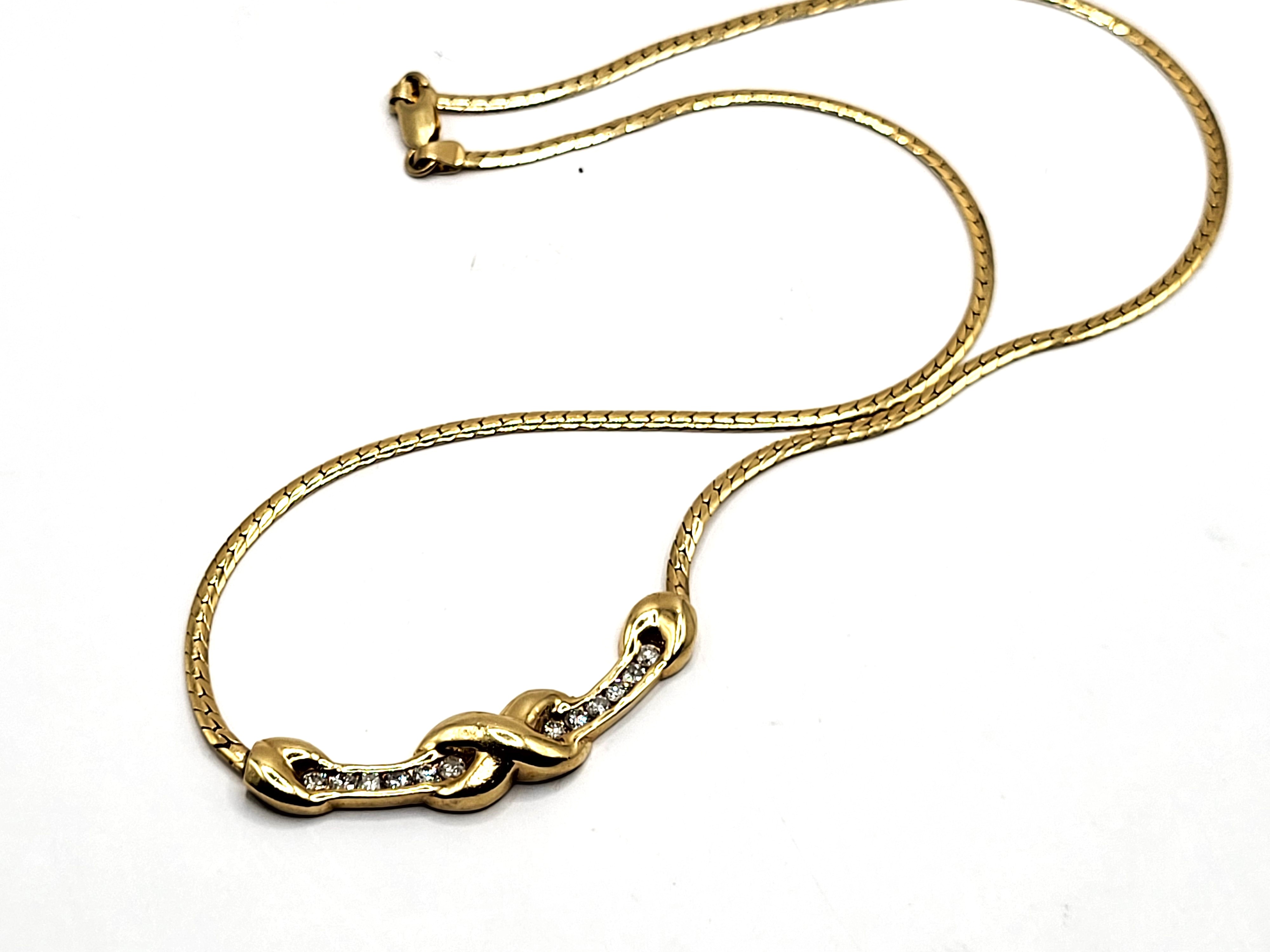 This is a very elegant 14 karat yellow gold necklace that features .66 carats total weight round, brilliant-cut, G-H color, SI2-I1 clarity diamonds along the curved bar with the "X" kiss. The bar is stationary on the flat cobra chain. The entire necklace is 17" long with a spring ring. Admin: G11241/12tit