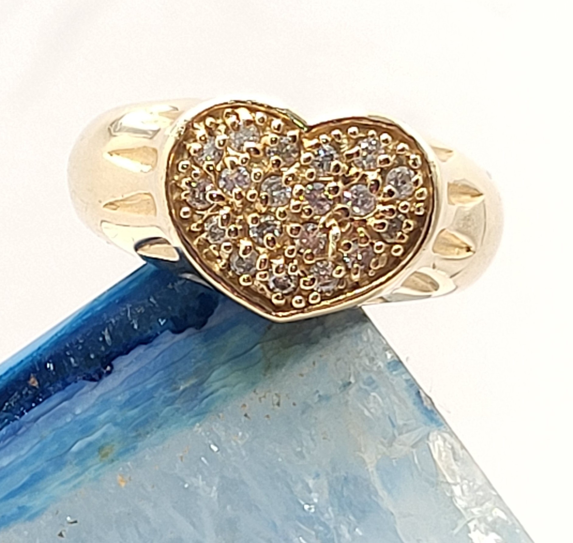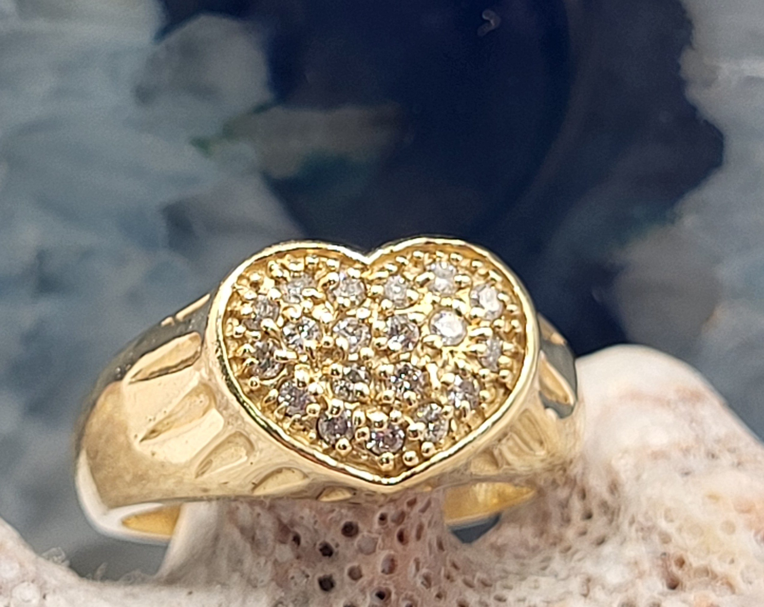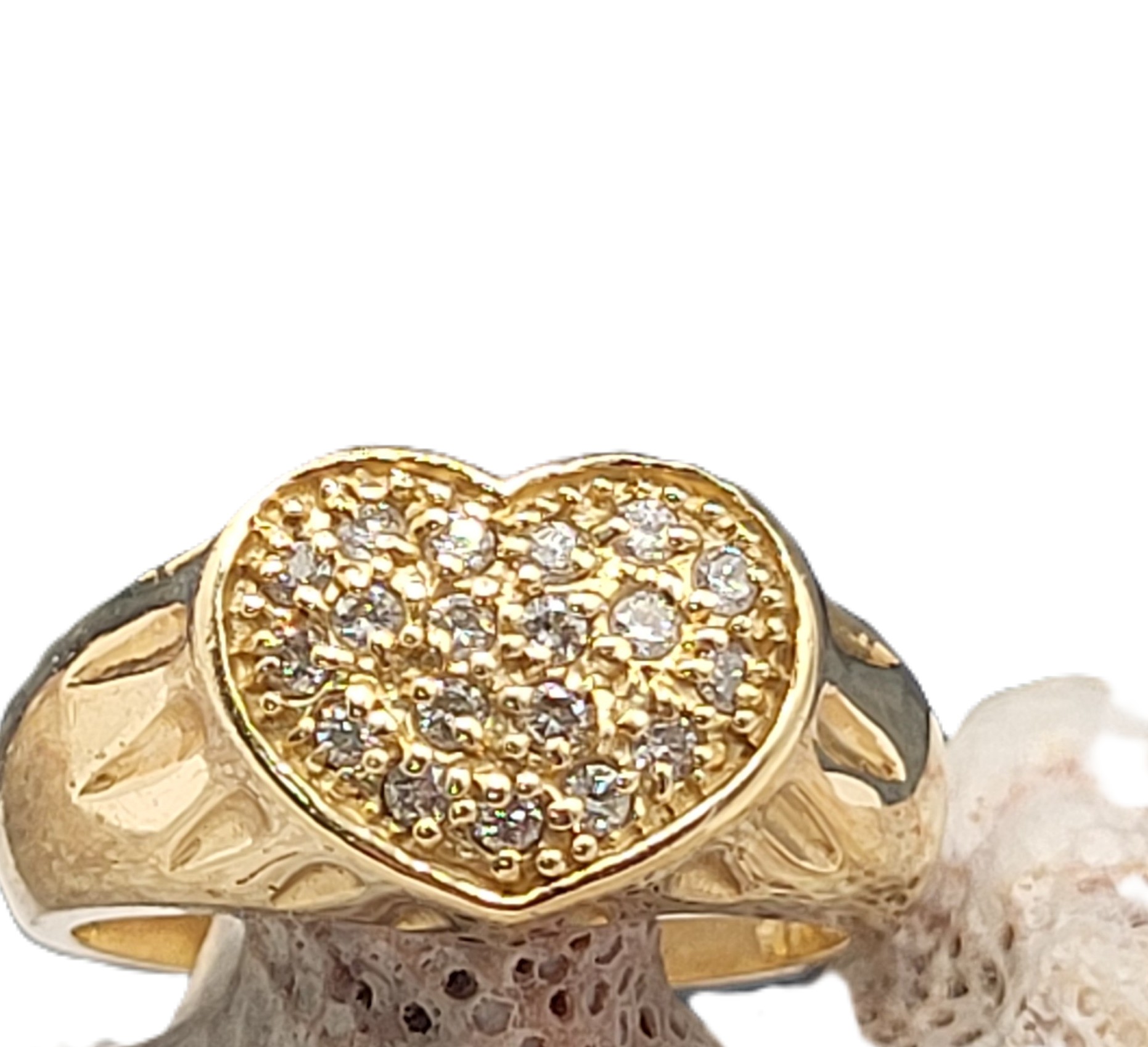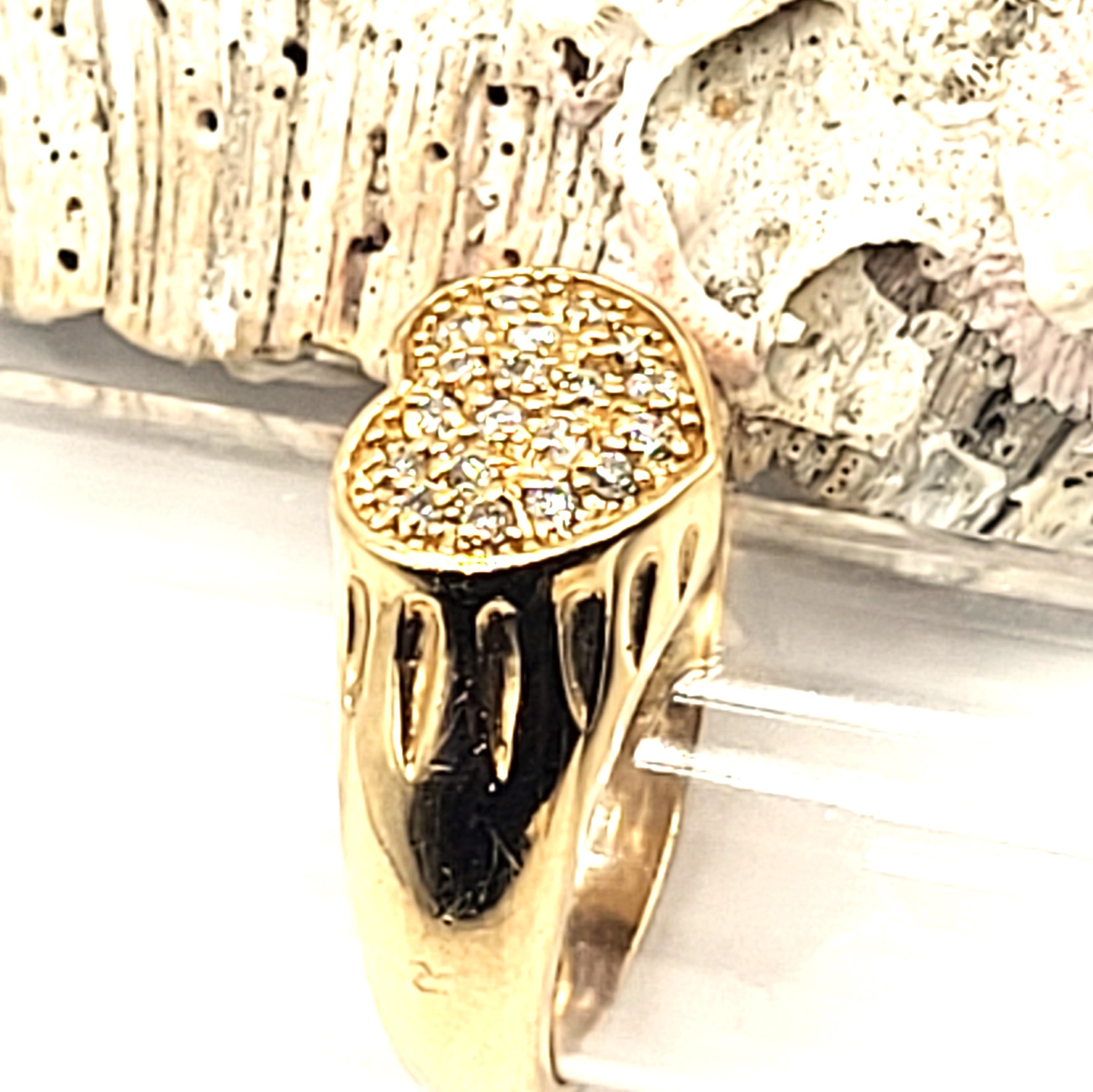 This is a 14 karat yellow gold ring that features a flat-surfaced heart that is lifted from the polished shank using Belcher-like textured ridges and covered with .25 carats total weight round, brilliant-cut, H color, SI2-I1 clarity pave’ set diamonds. The ring is US size 6.75 and can be sized for an additional charge. Please contact Bidfair Fine Jewelry for sizing details. Admin: G11241/24net