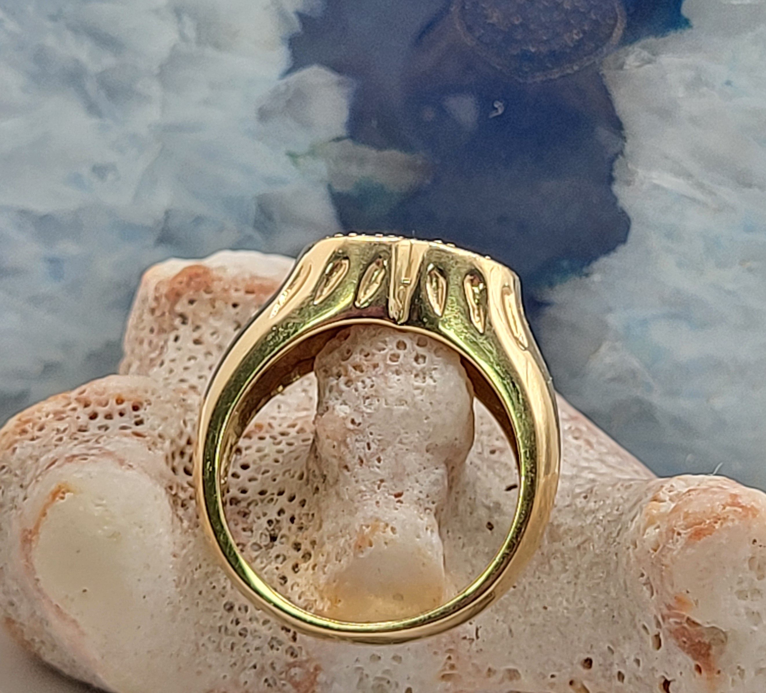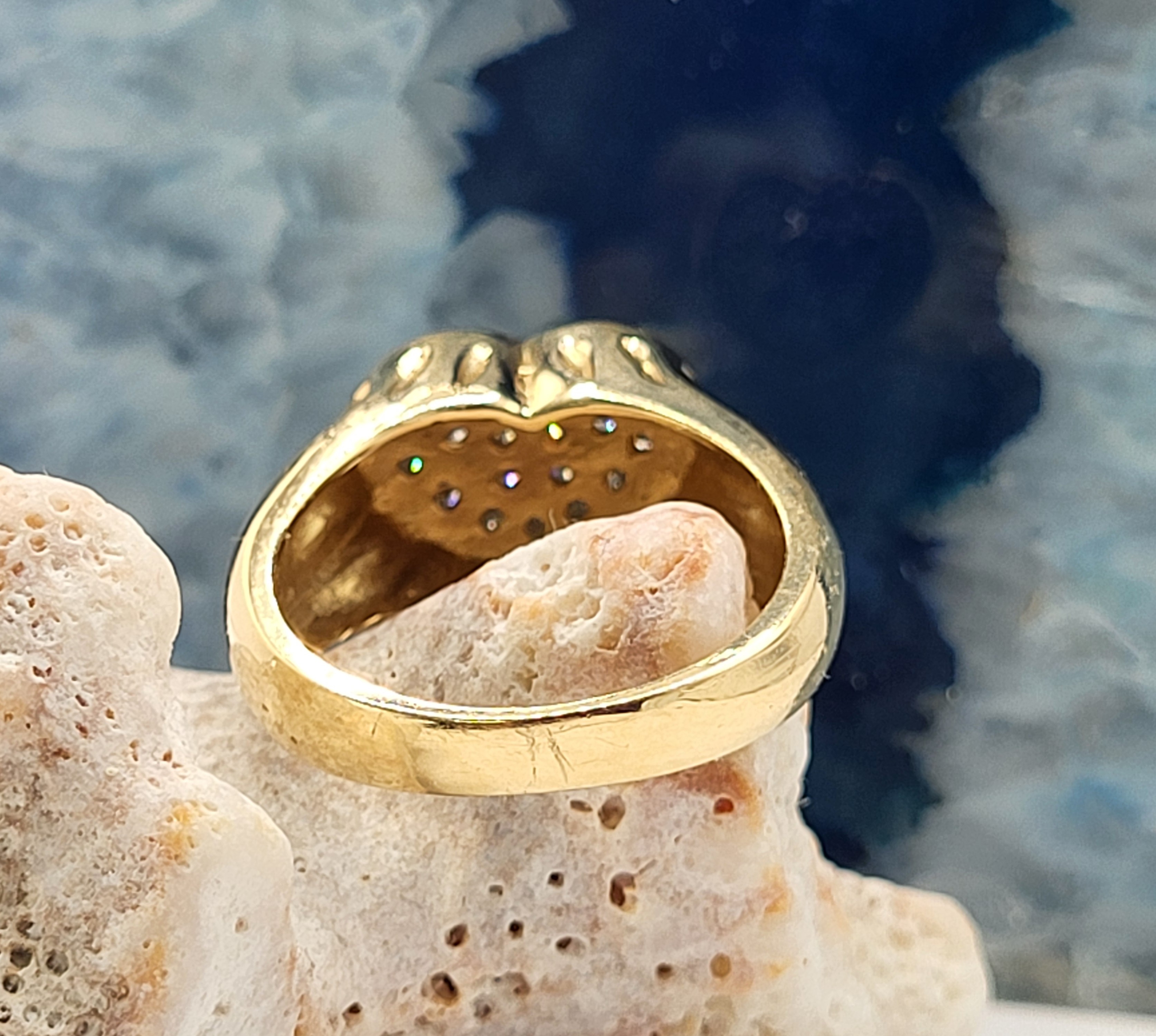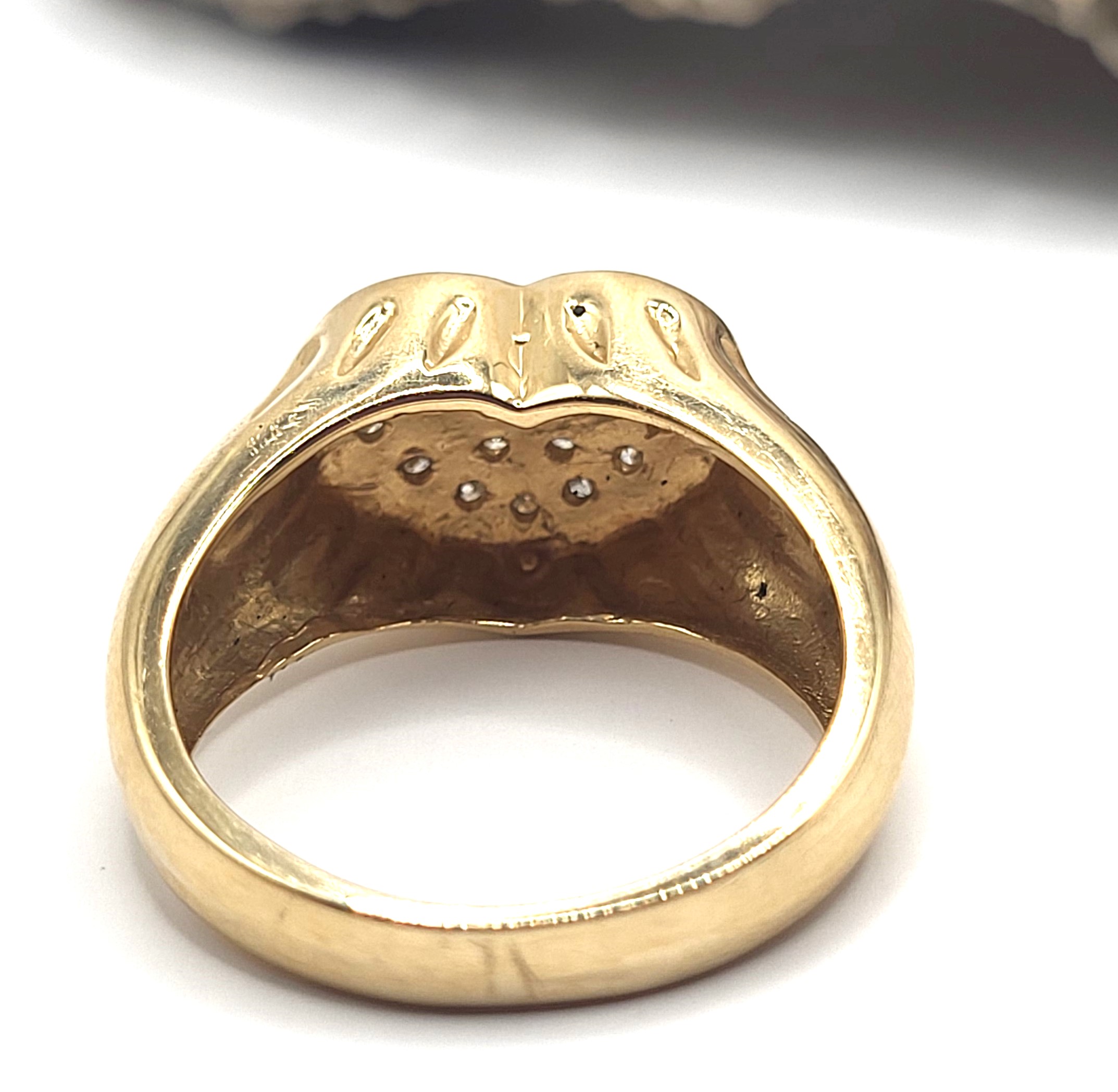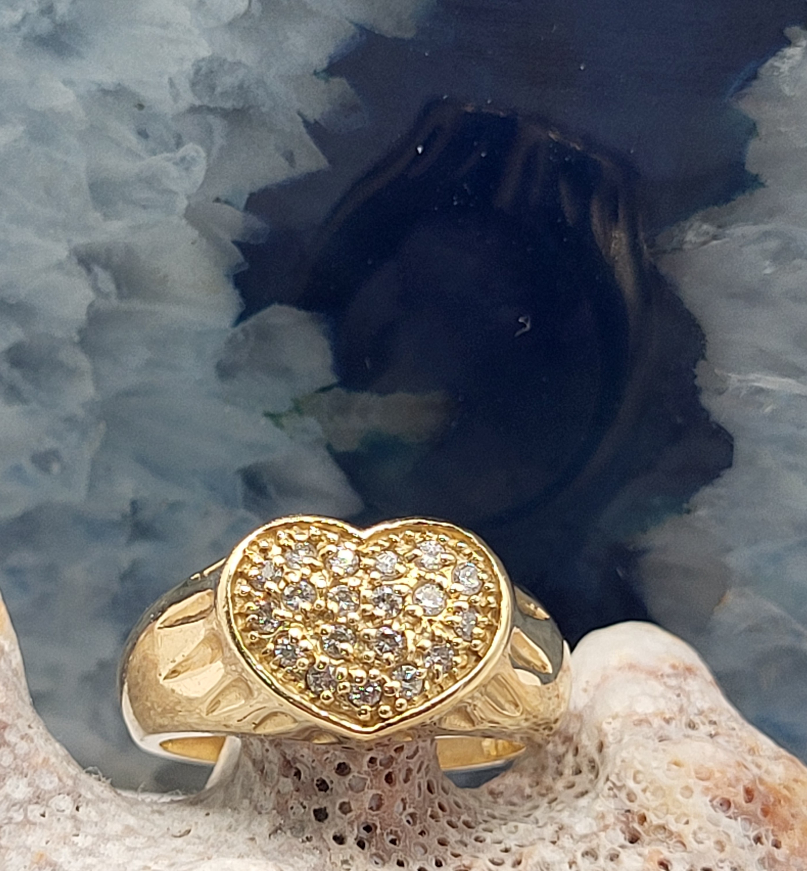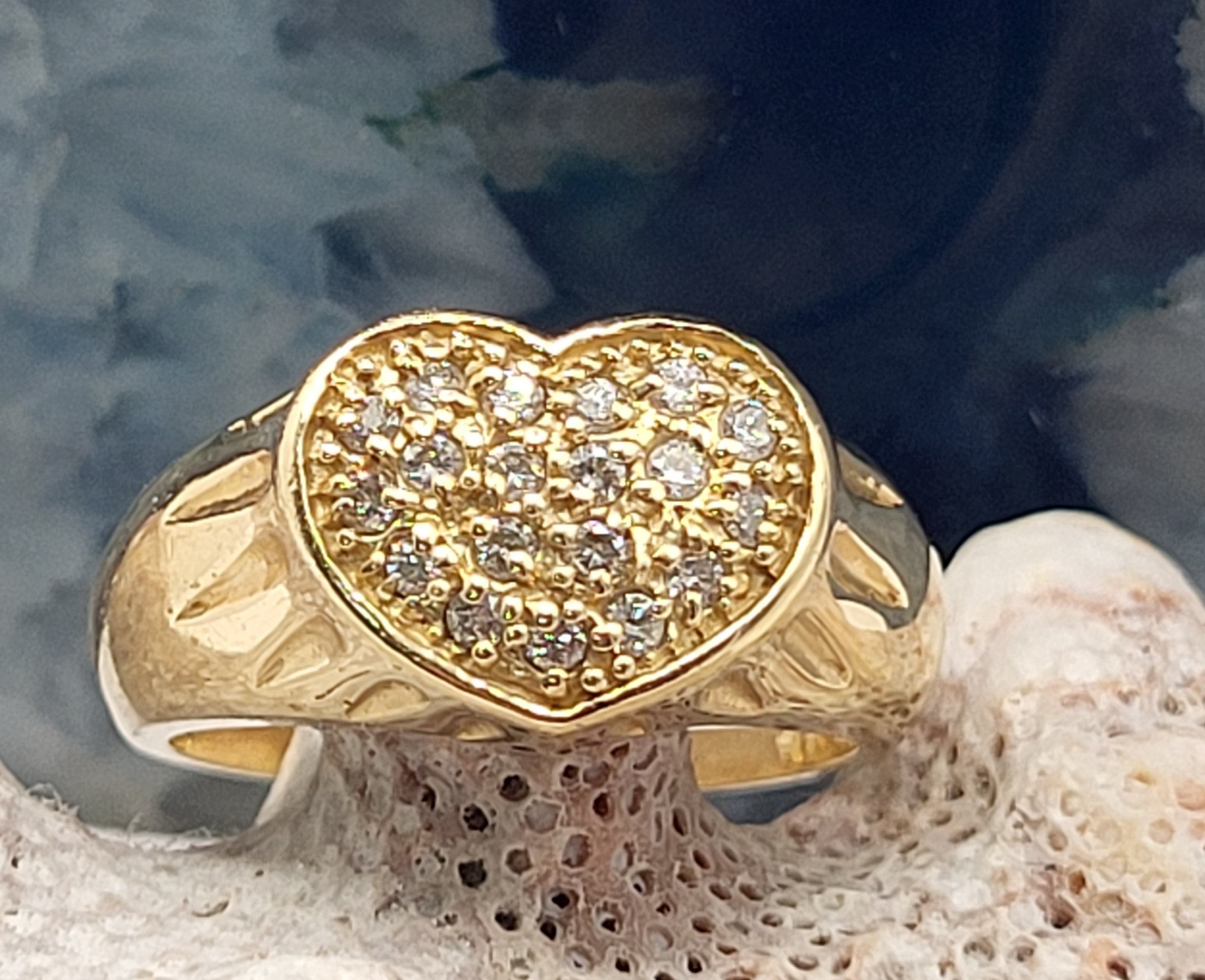 This is a 14 karat yellow gold ring that features a flat-surfaced heart that is lifted from the polished shank using Belcher-like textured ridges and covered with .25 carats total weight round, brilliant-cut, H color, SI2-I1 clarity pave’ set diamonds. The ring is US size 6.75 and can be sized for an additional charge. Please contact Bidfair Fine Jewelry for sizing details. Admin: G11241/24net