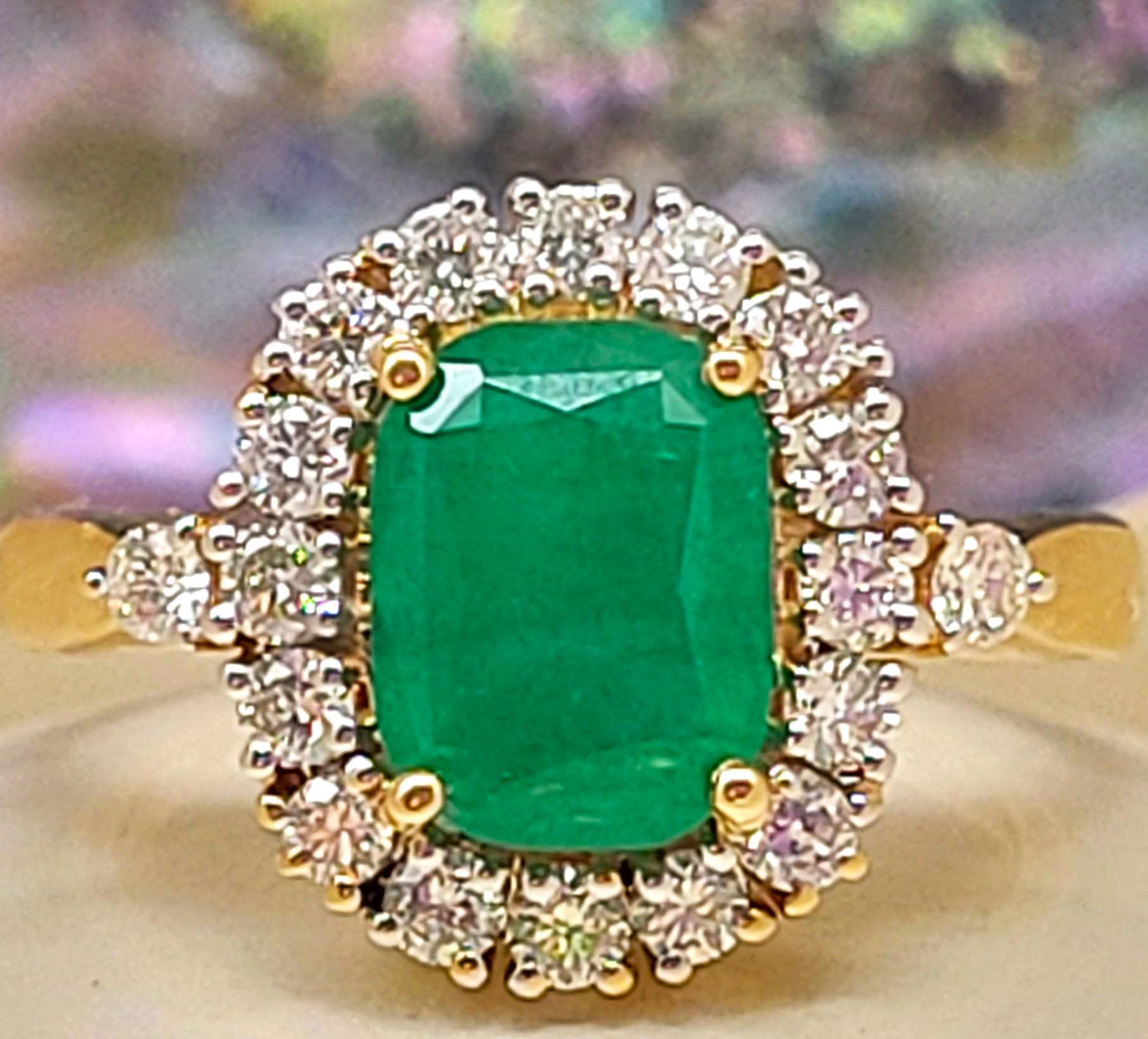 This 14 karat yellow gold ring features a The 1.85 carat, cushion-cut, genuine Zambian emerald featured in the 14 karat yellow gold ring has such a vivid shamrock green color, that the .54 carats of round, brilliant-cut, H-I color, SI2 clarity diamonds in the surrounding halo look like dew on a lush green meadow, glistening in the morning sun. "Double" or "split" prongs secure the emerald inside the halo, while low-profile cathedral shoulders taper to an approximate 2.5mm shank. This ring is US size 8. See sizing details below and other important information.